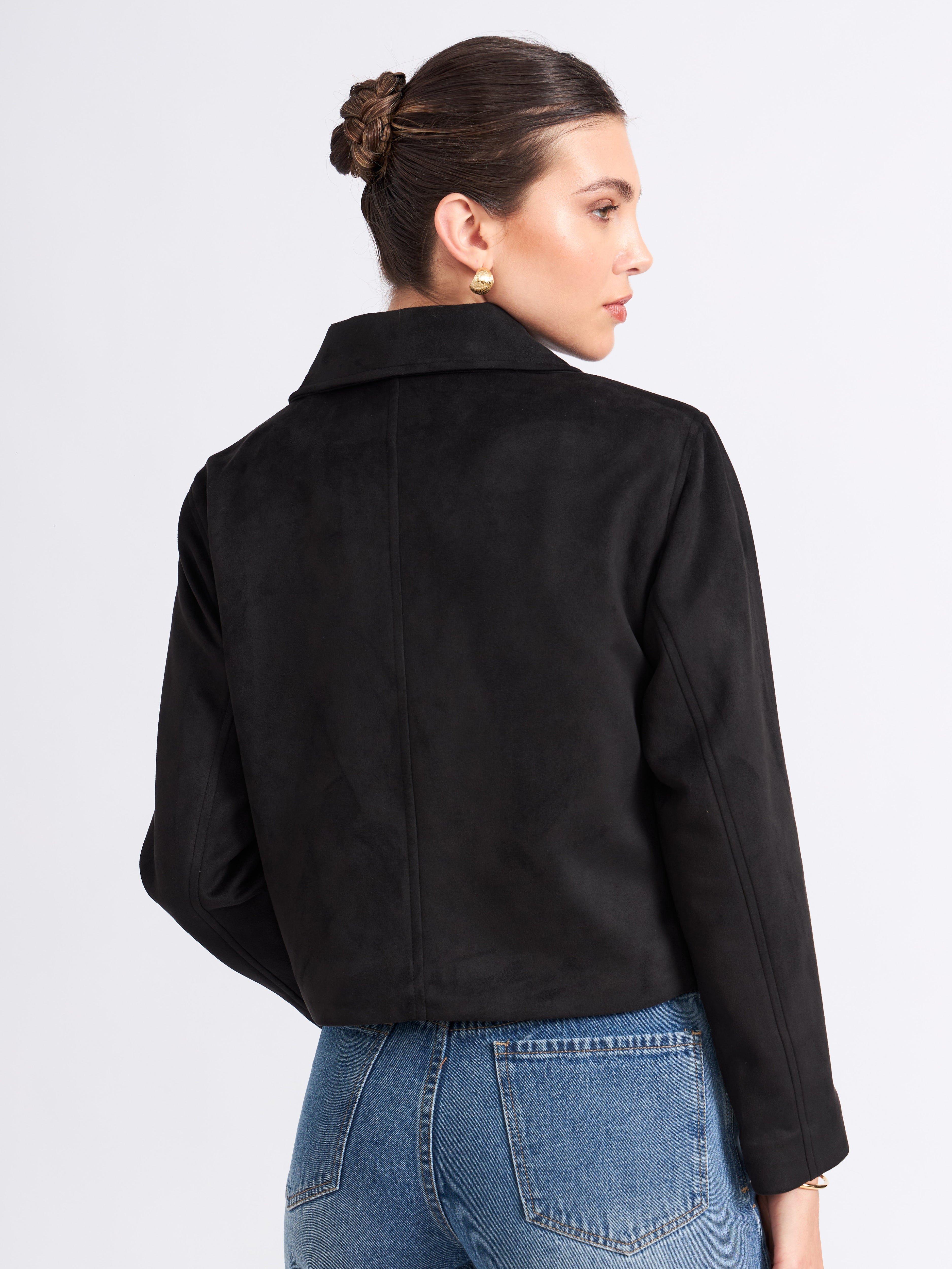 Chaqueta boxy de piel con corte estructurado. Presenta un cuello camisero con un cierre frontal y bolsillos con solapa a los lados, agregando funcionalidad y un acabado sofisticado. La prenda es versátil y atemporal, ideal para complementar looks formales o casuales con un toque refinado.