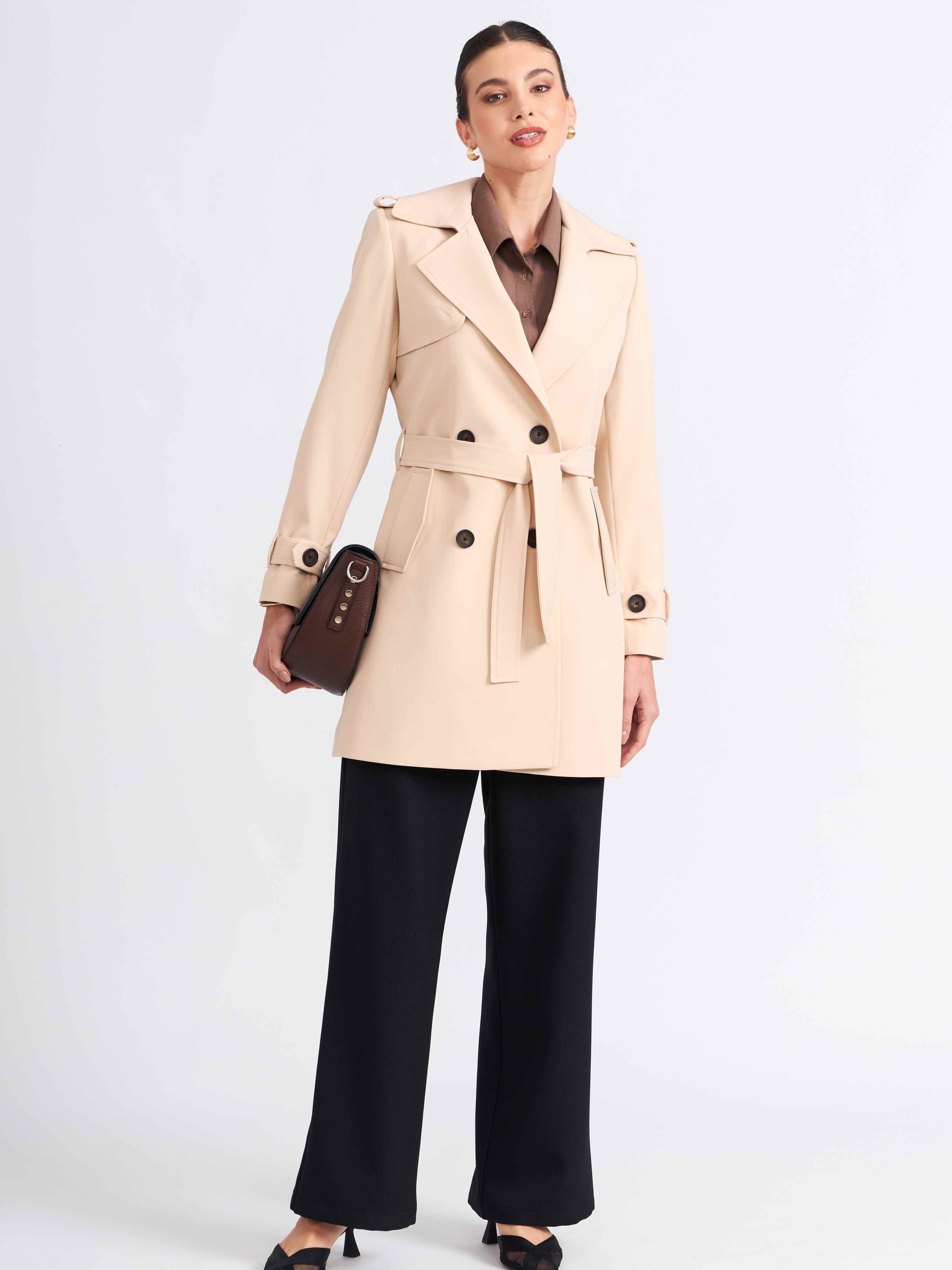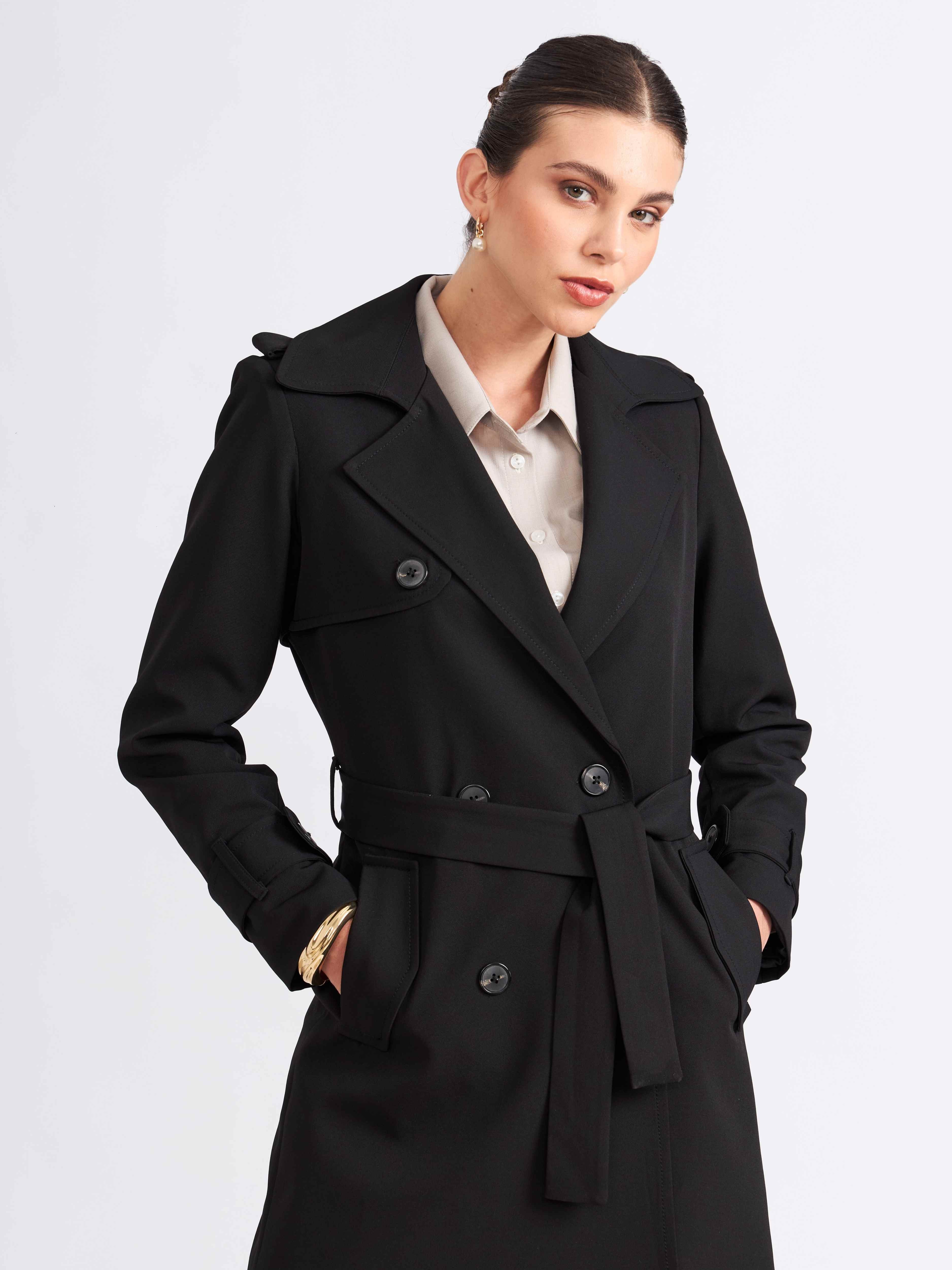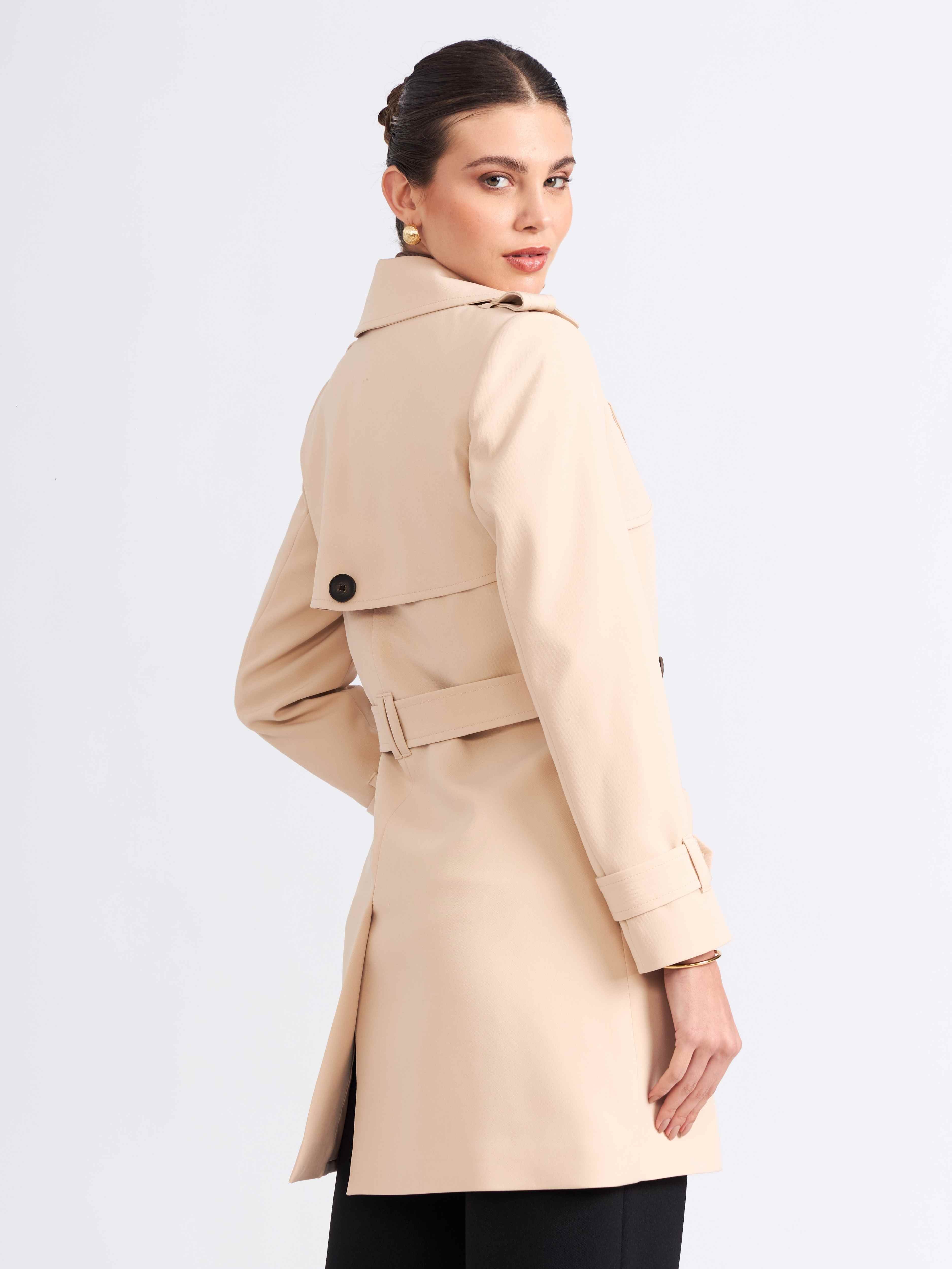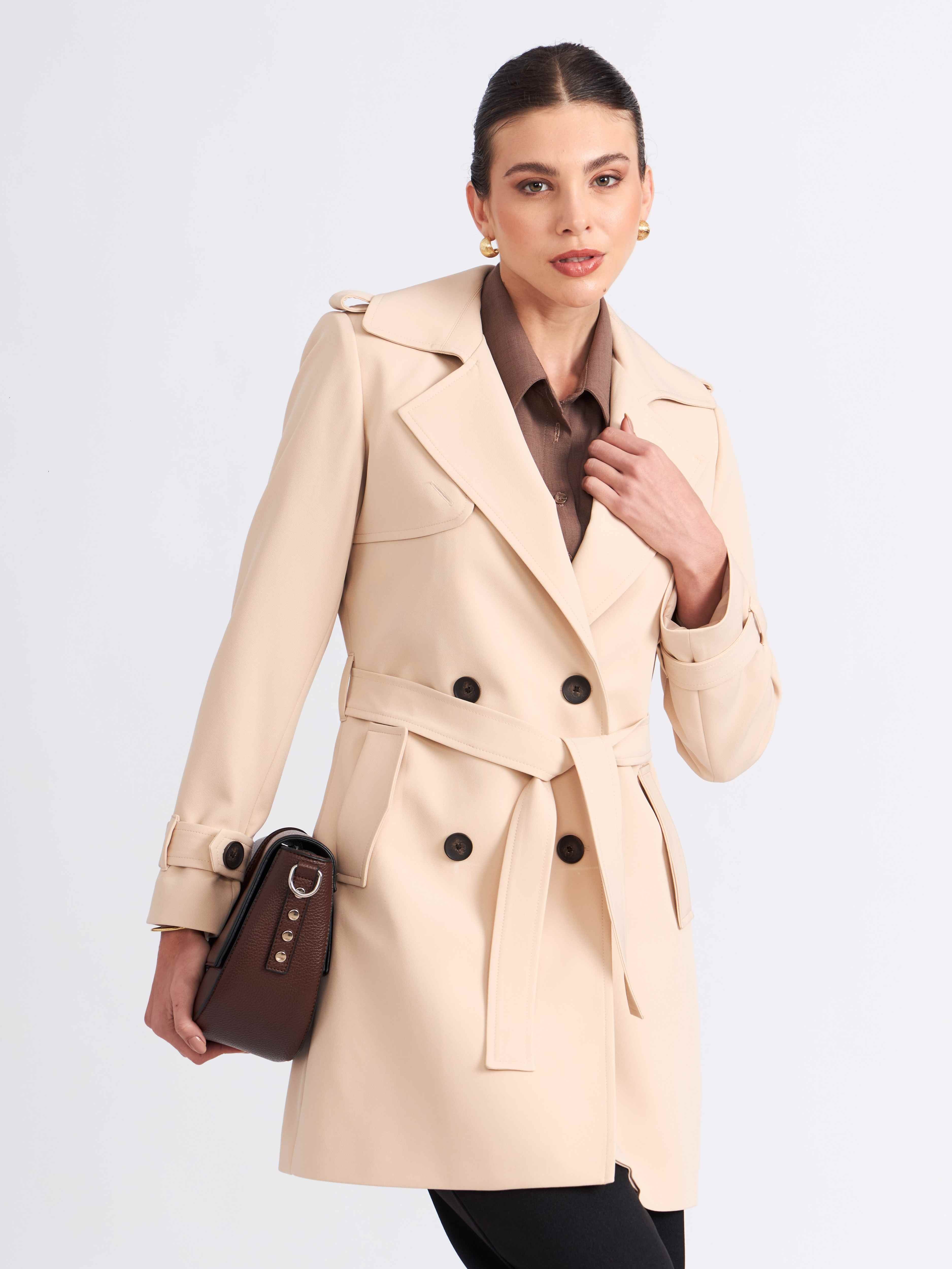 Gabardina de doble botonadura con cuello, solapas y botones. Única solapa fontral decorativa. Cinturón ancho extraíble para anudar y bolsillos delanteros.
