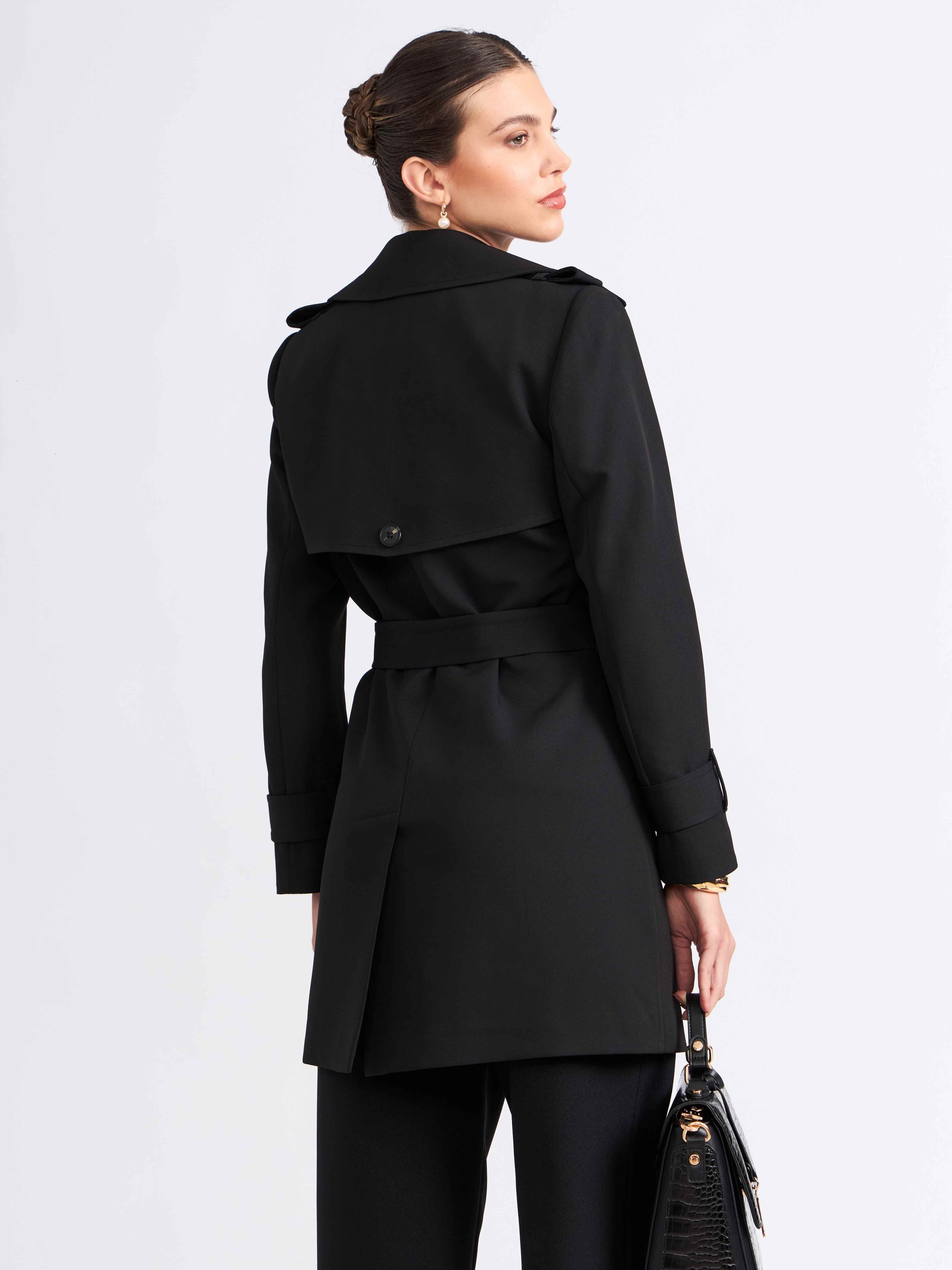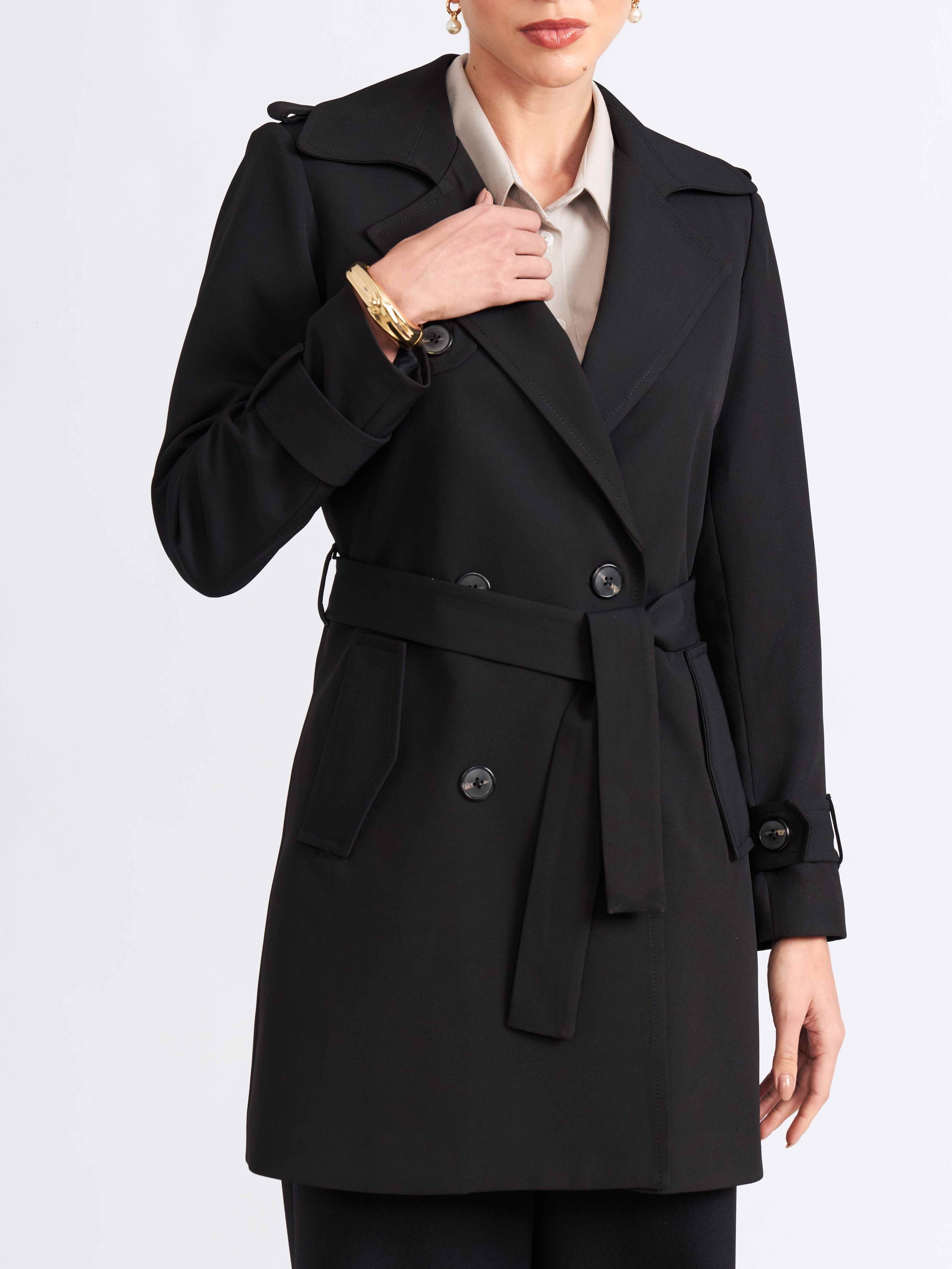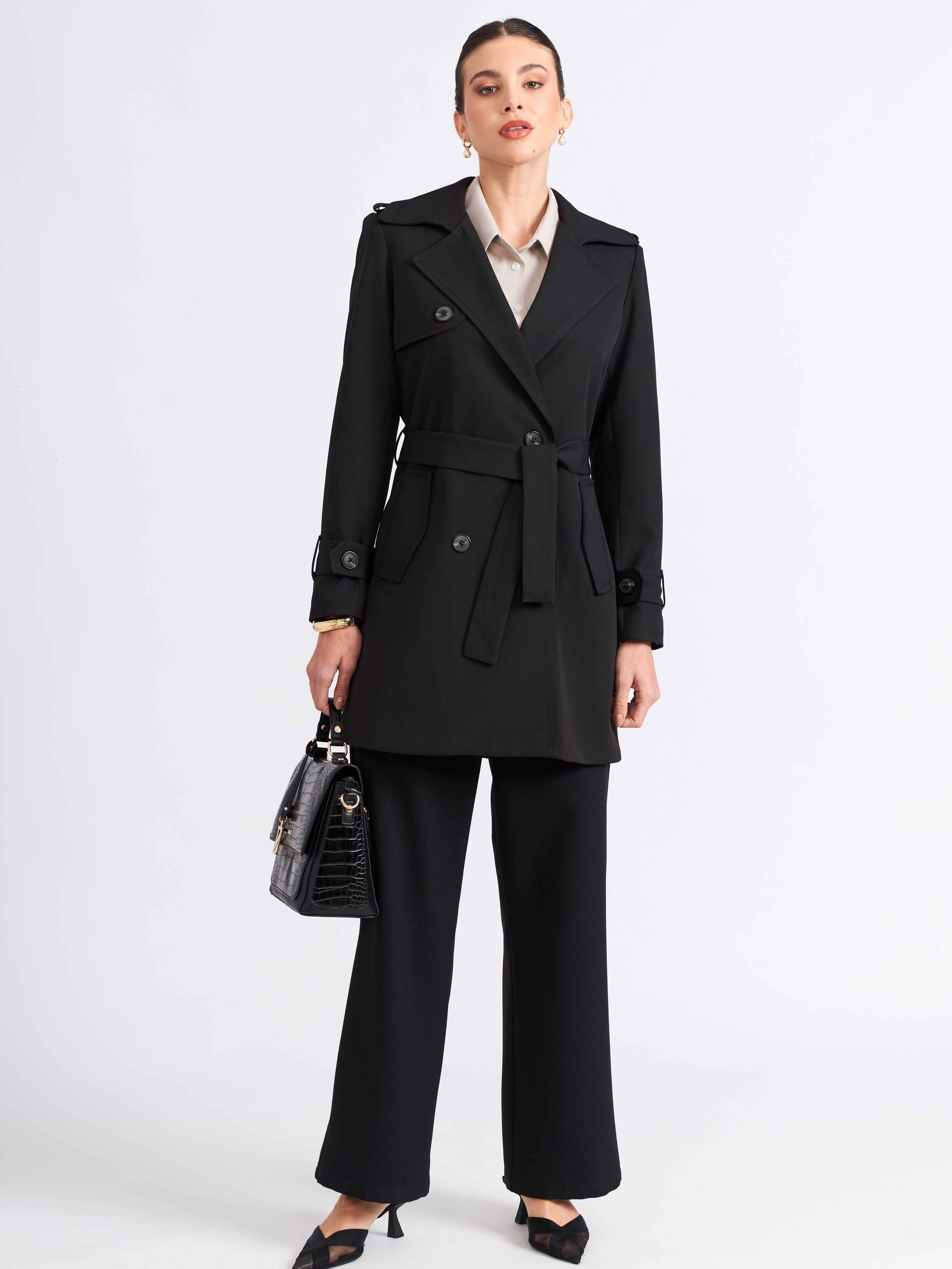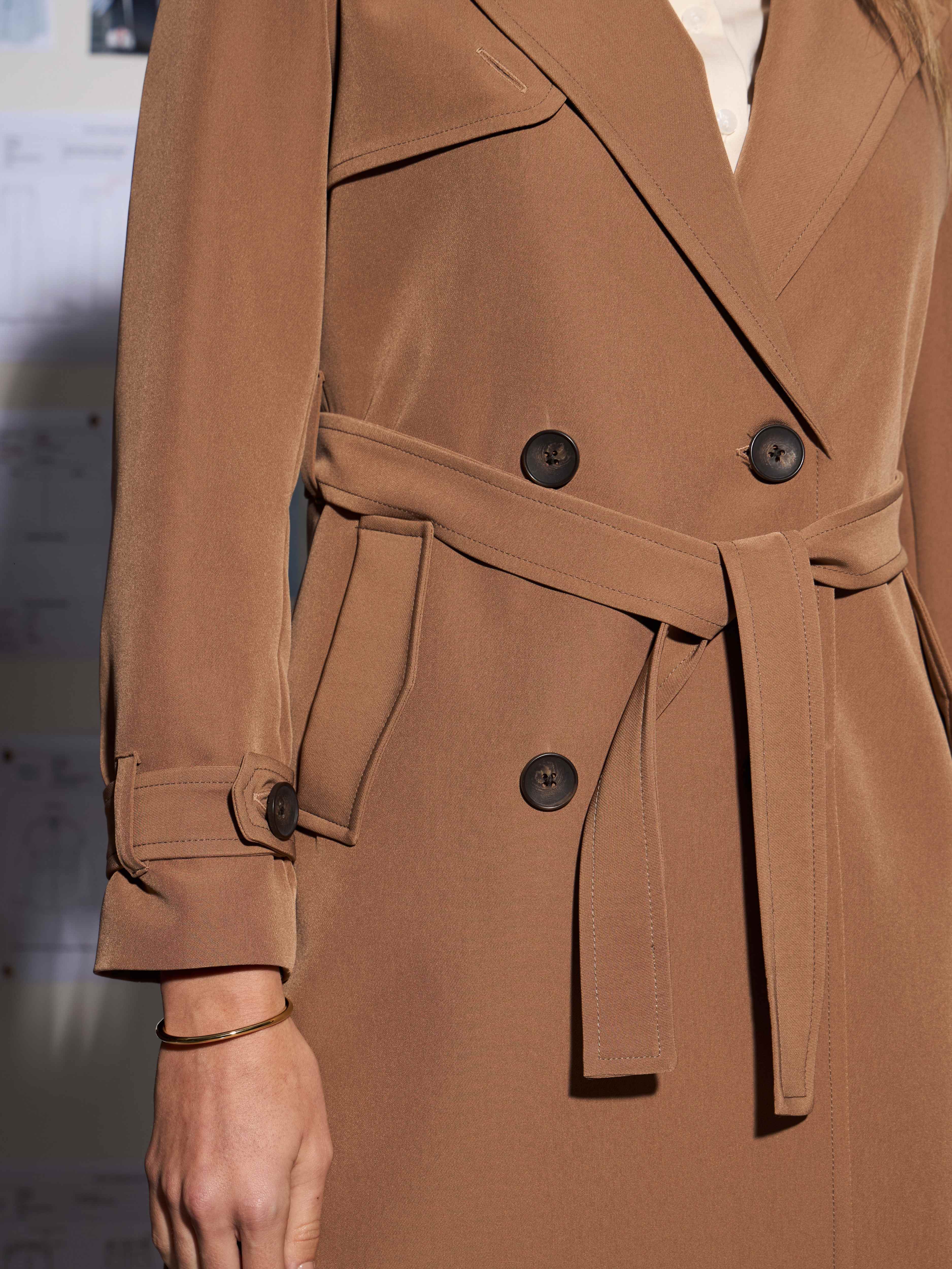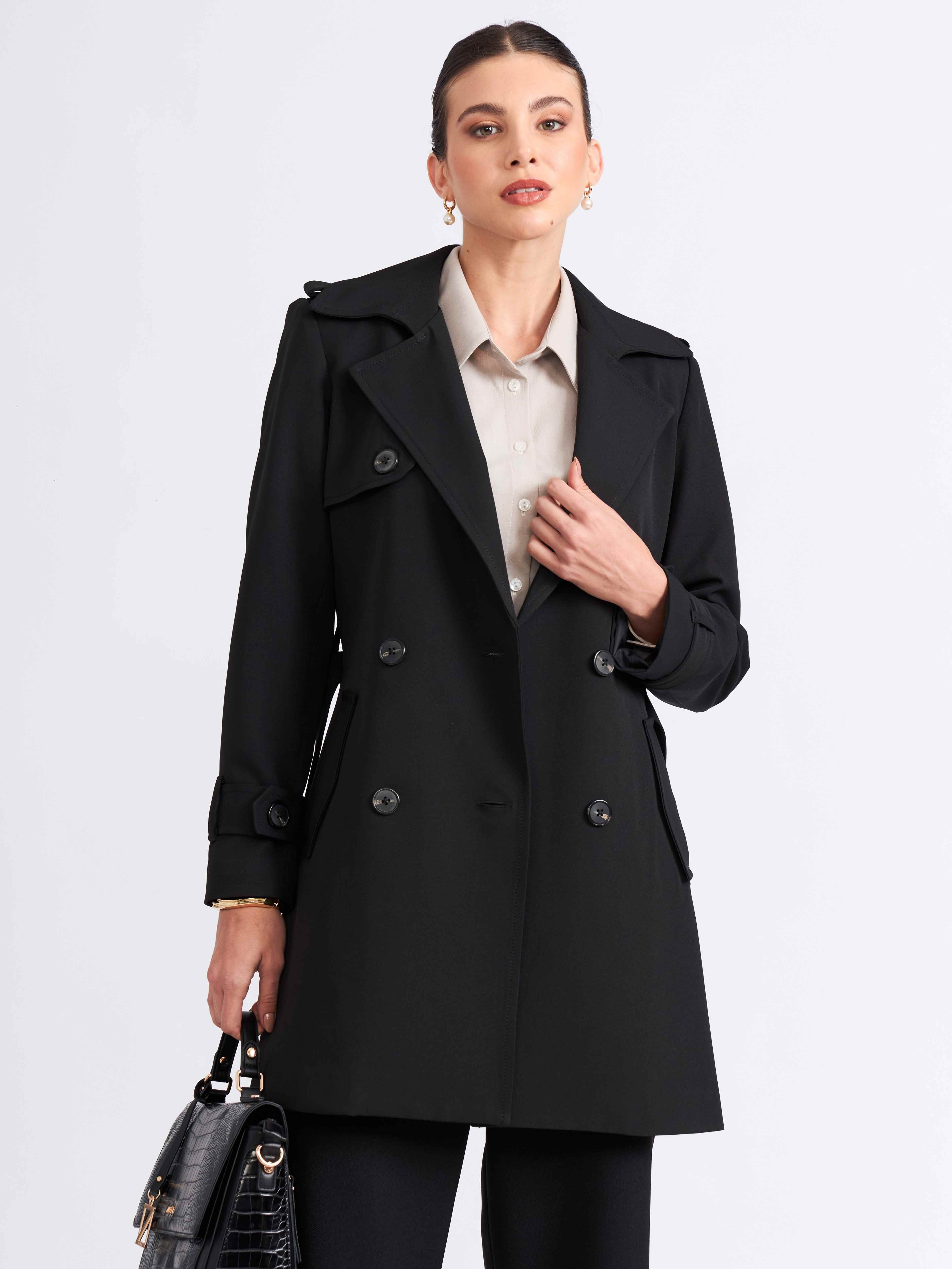 Gabardina de doble botonadura con cuello, solapas y botones. Única solapa fontral decorativa. Cinturón ancho extraíble para anudar y bolsillos delanteros.