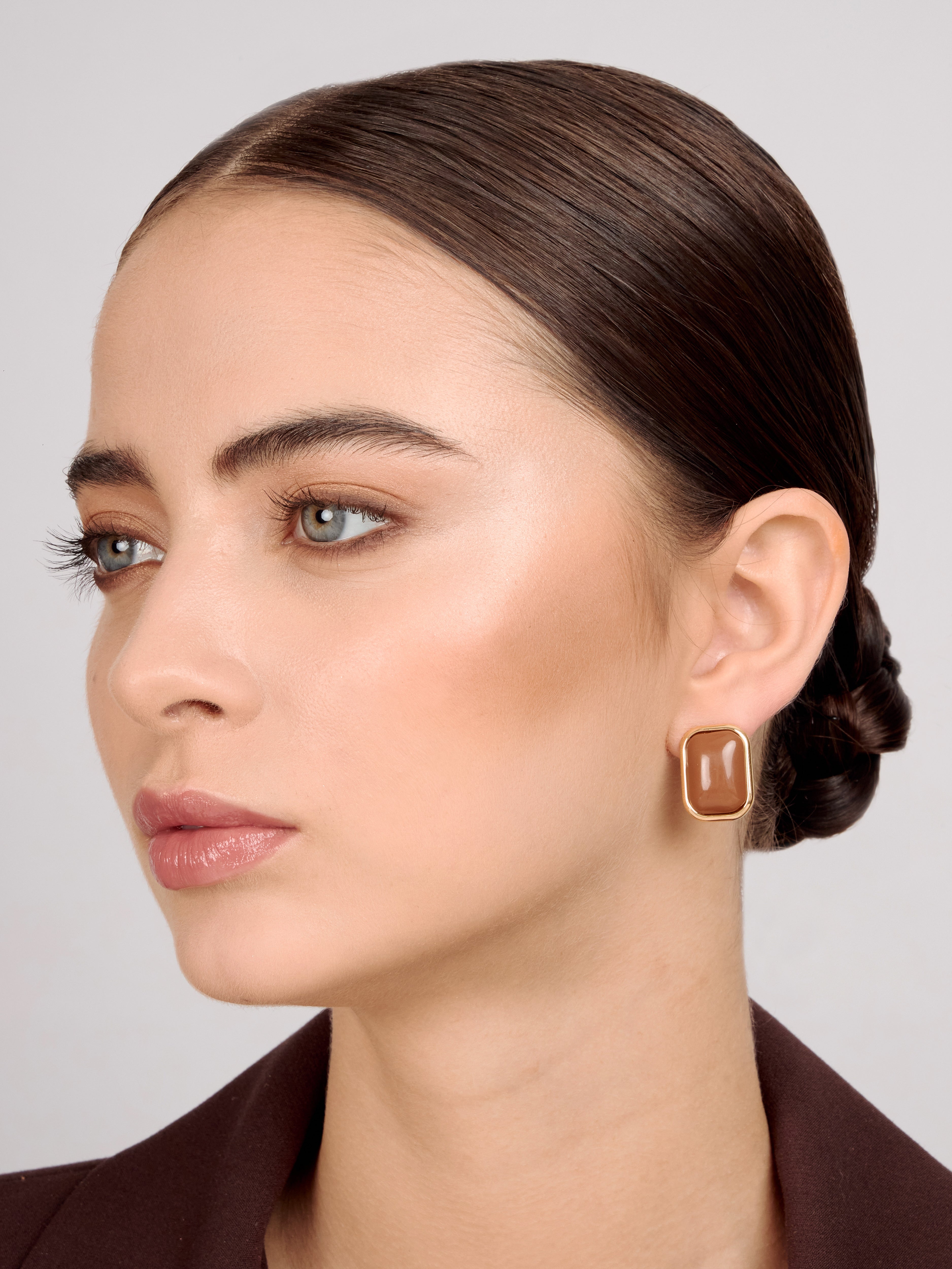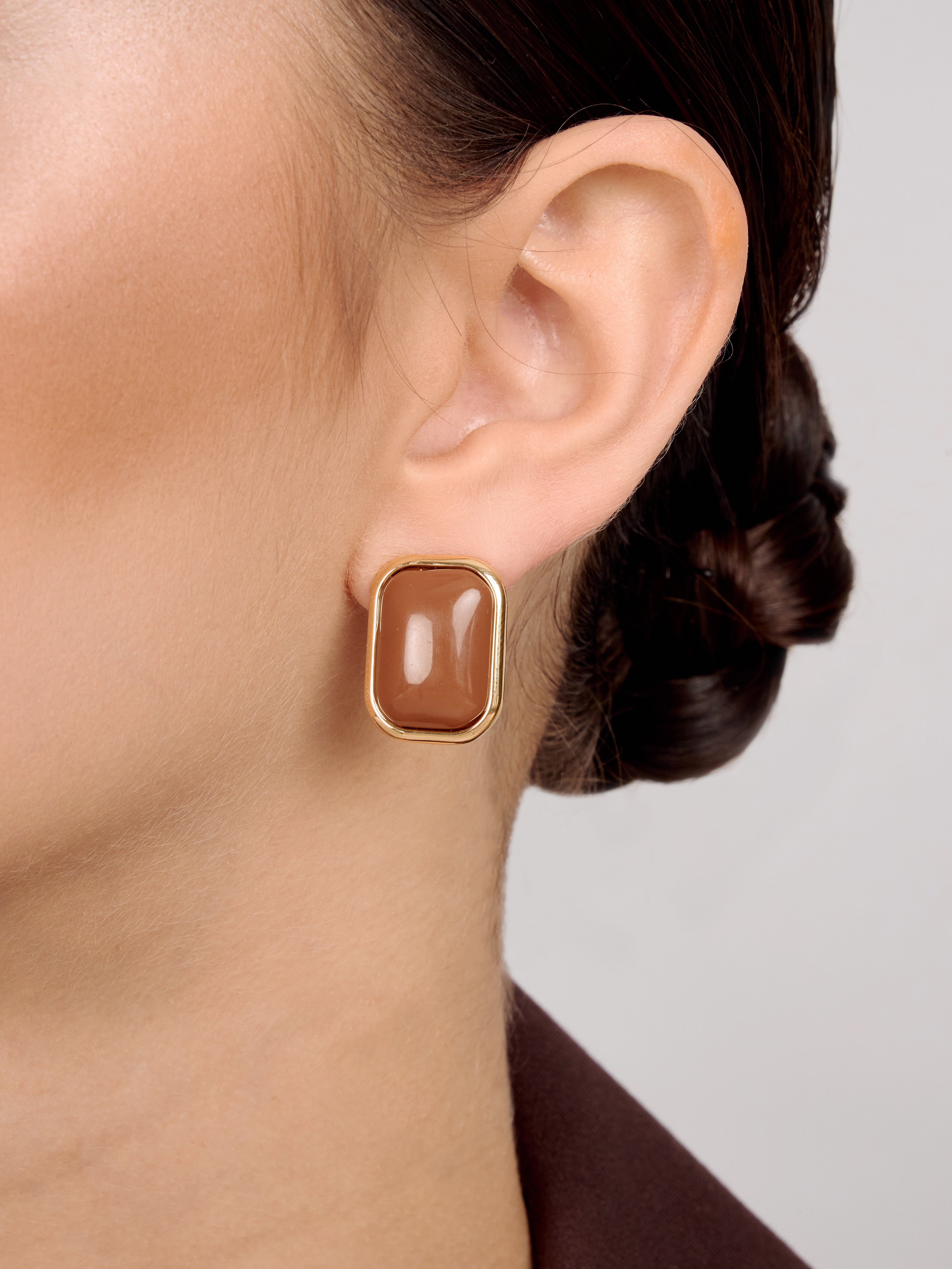 Aretes geométricos en forma rectangular con centro mocha y borde dorado. Sofisticados y versátiles, ideales para estilos clásicos y modernos.