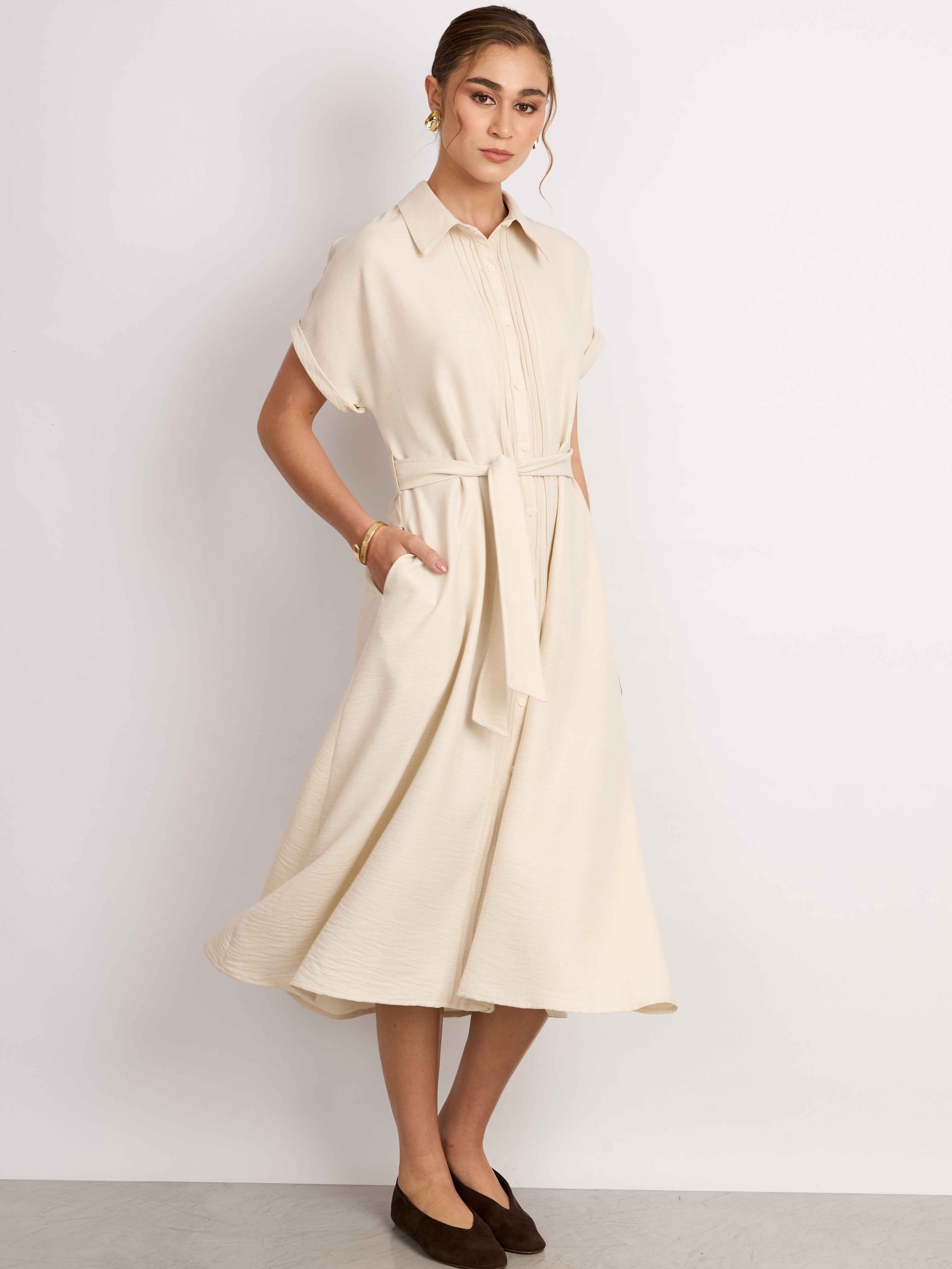 Vestido largo con cuello camisero y manga corta con acabado doblado. Cuenta con plisados y botones en la pechera. Lleva cinturón a la cintura. Fresco y casual para cualquier ocasión.