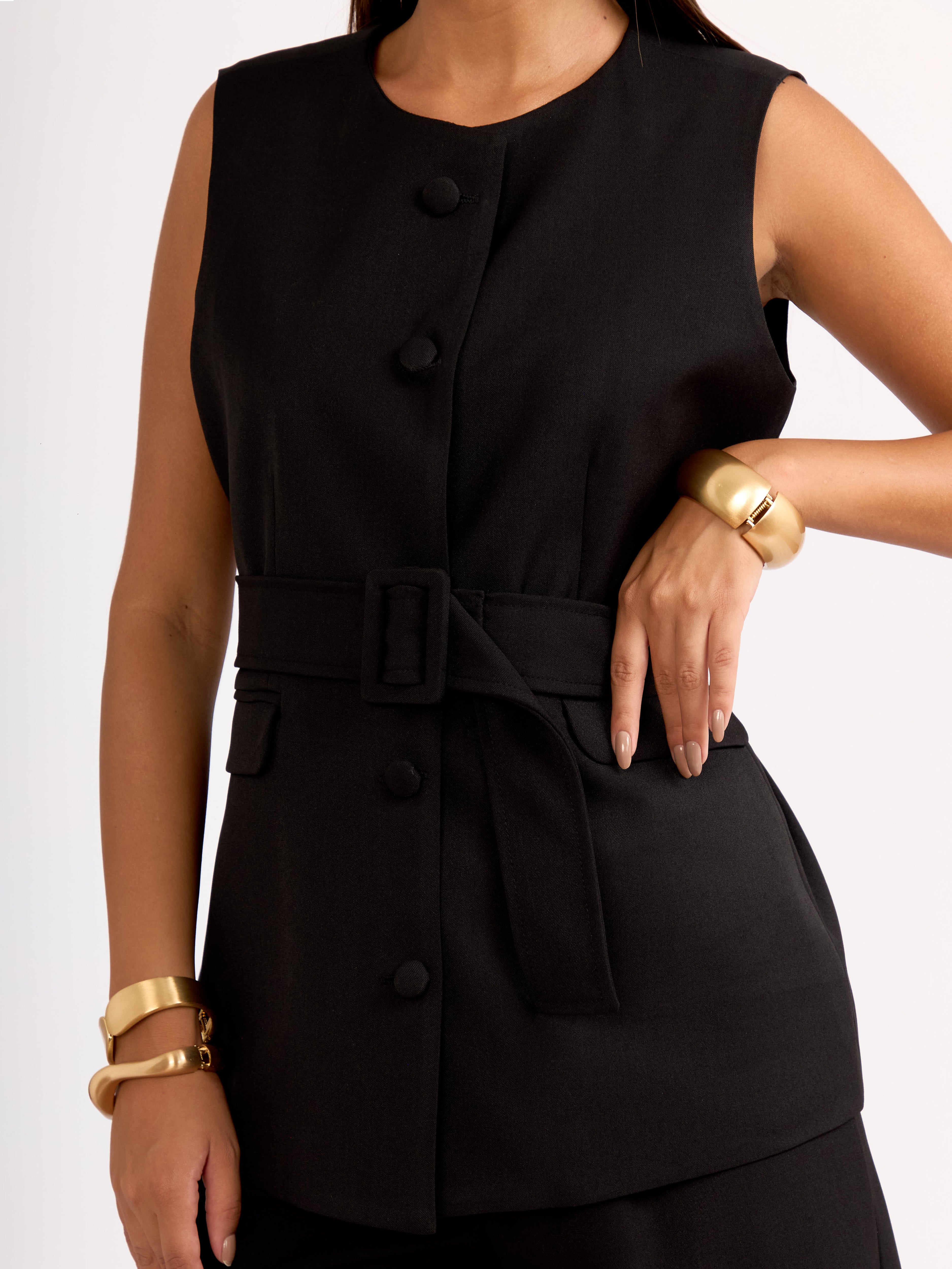 Chaleco con cuello redondo, incluye bolsillos con tapeta y botones forrados que añaden un toque refinado. Con cinturón ancho en la cintura que permite un ajuste personalizado.
