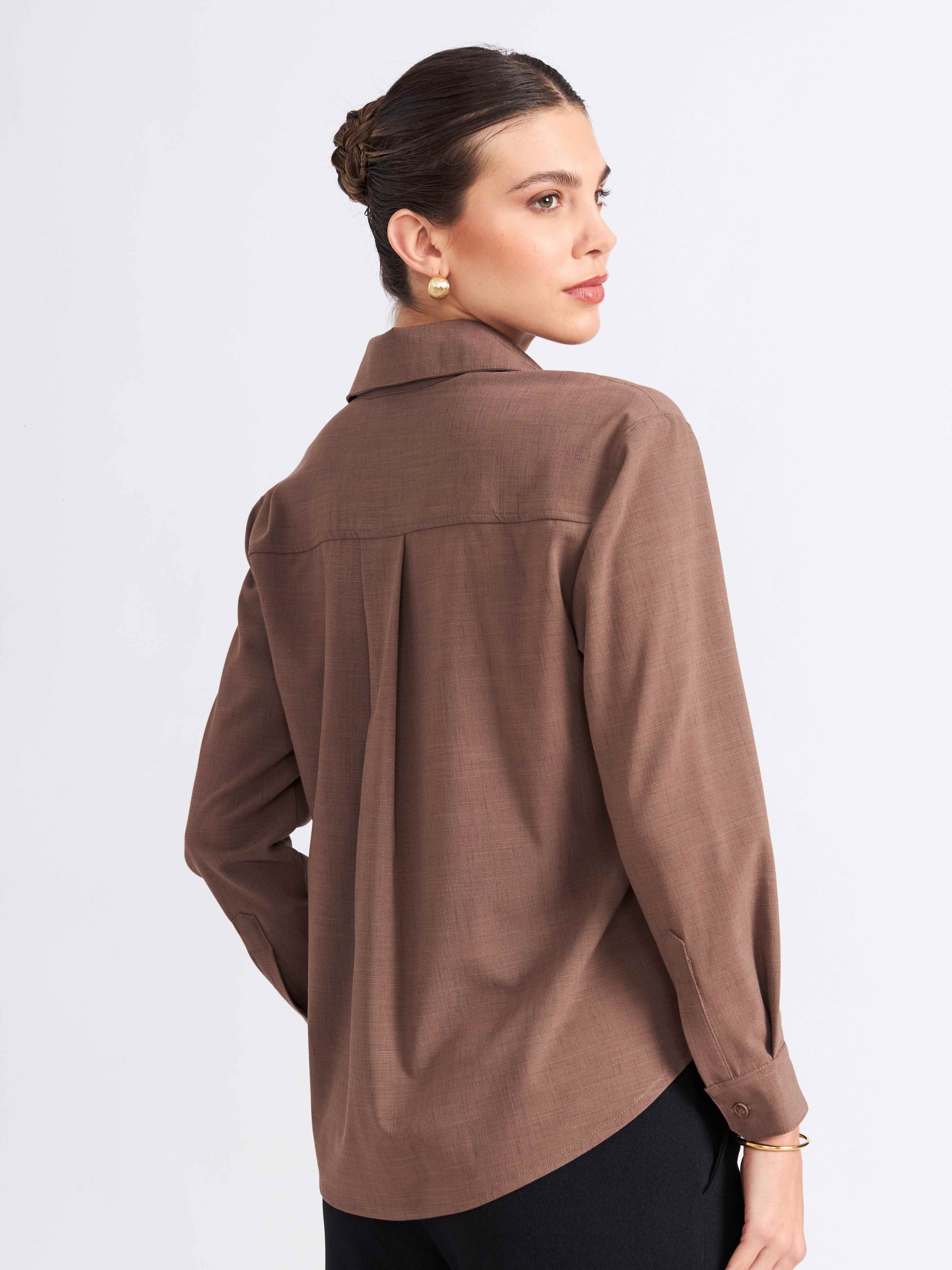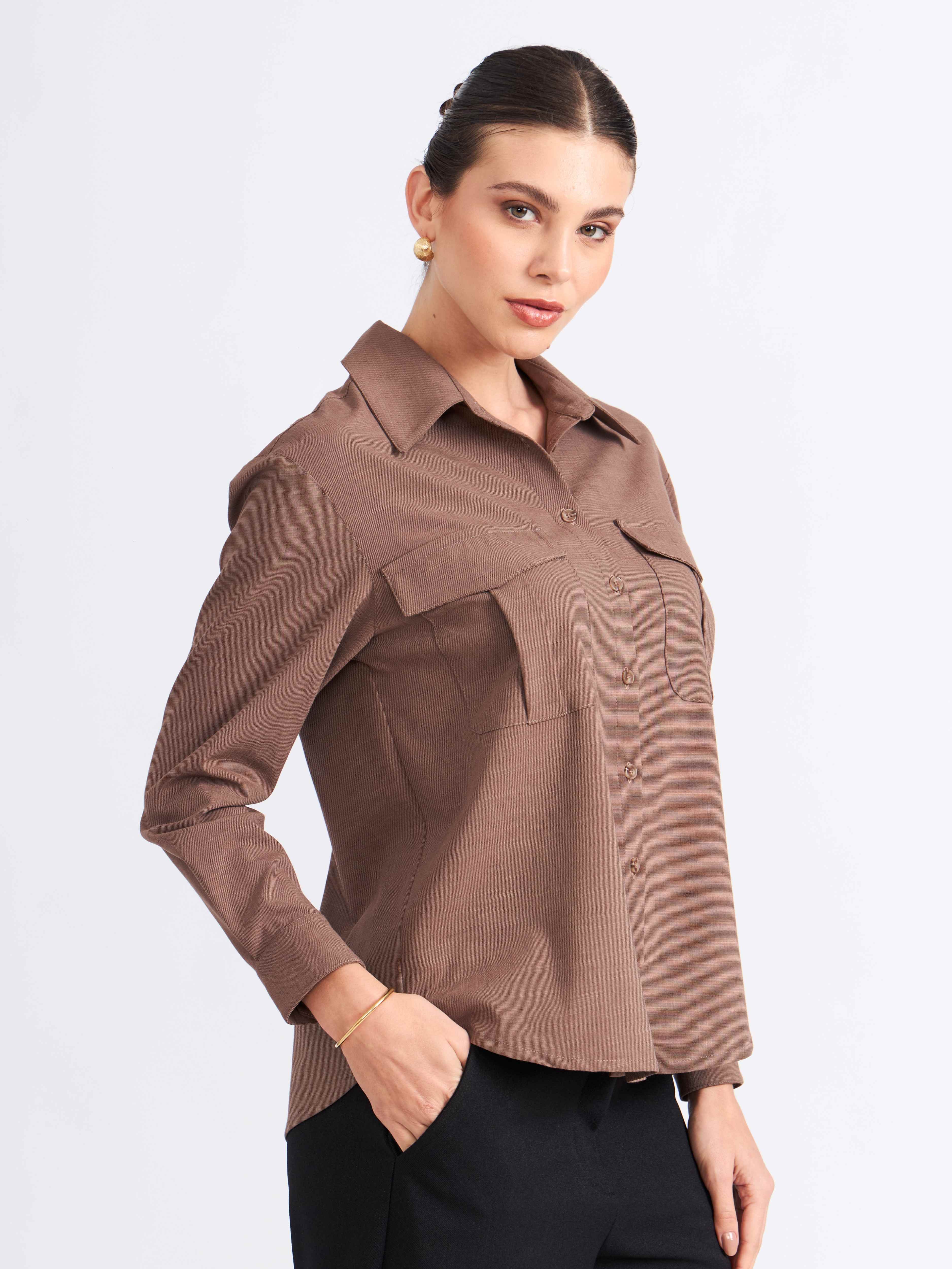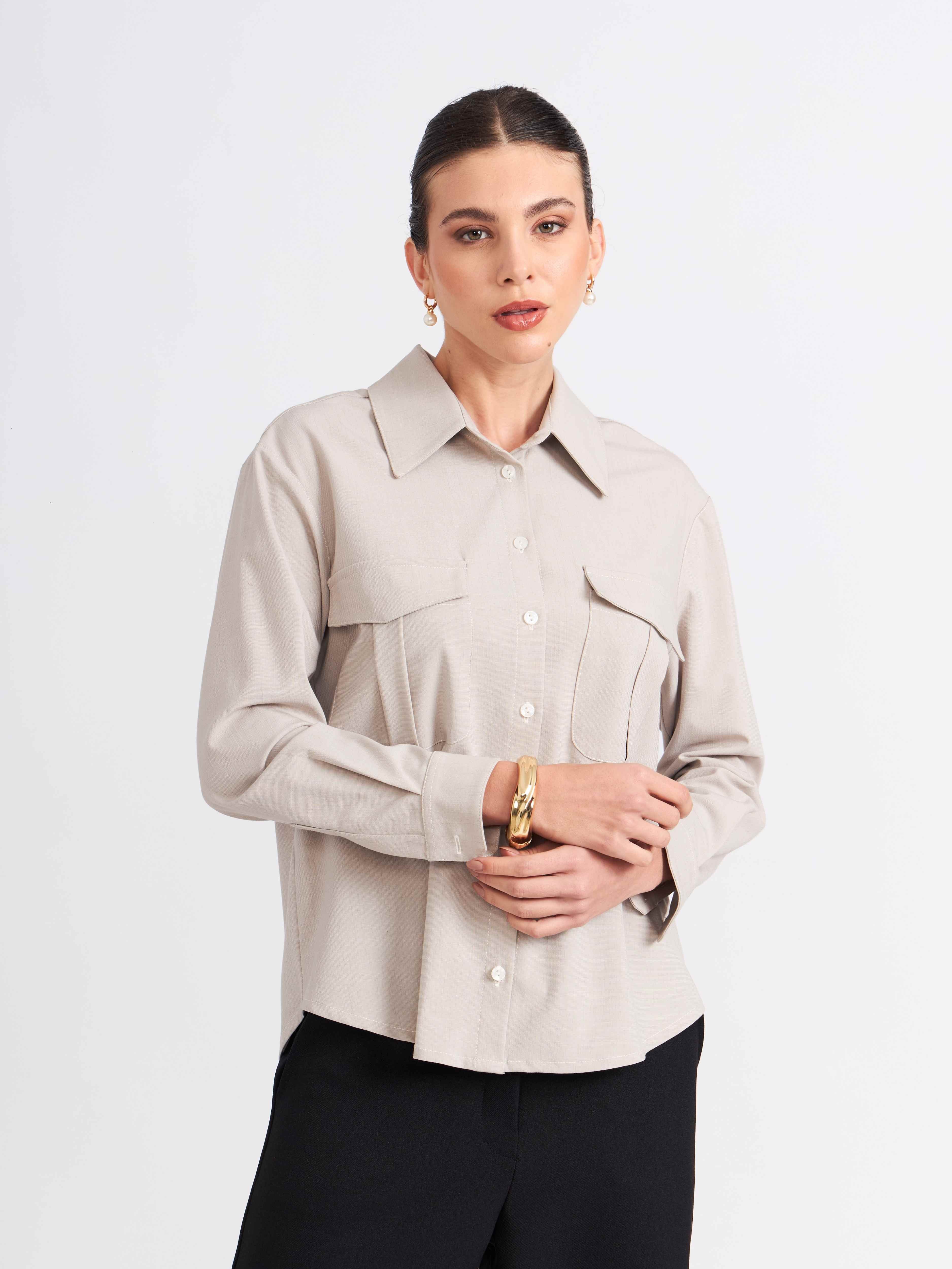 Camisa de cuello solapa y manga larga. Bolsillos de plastrón con solapa en delantero. Cierre frontal con botones.