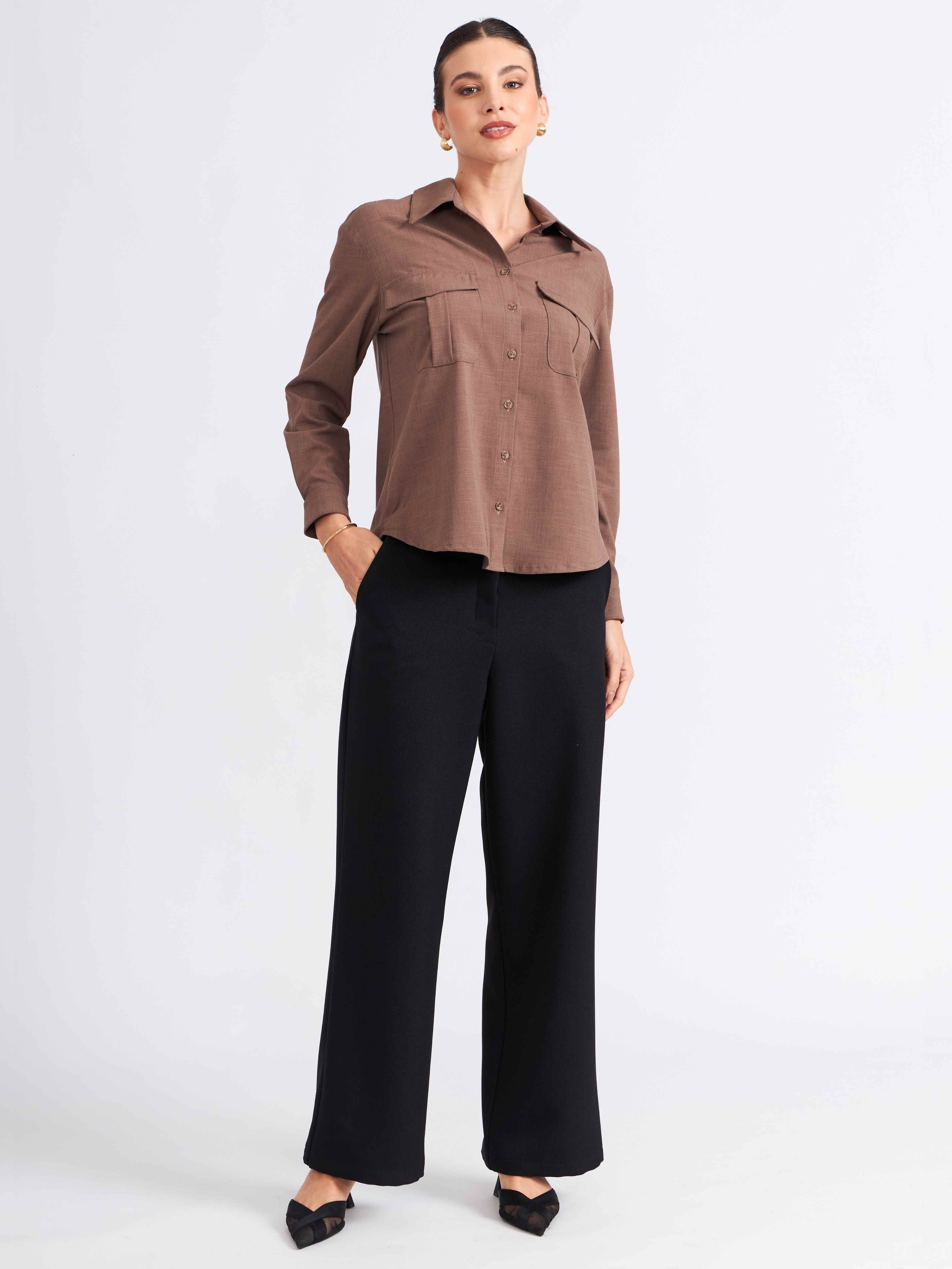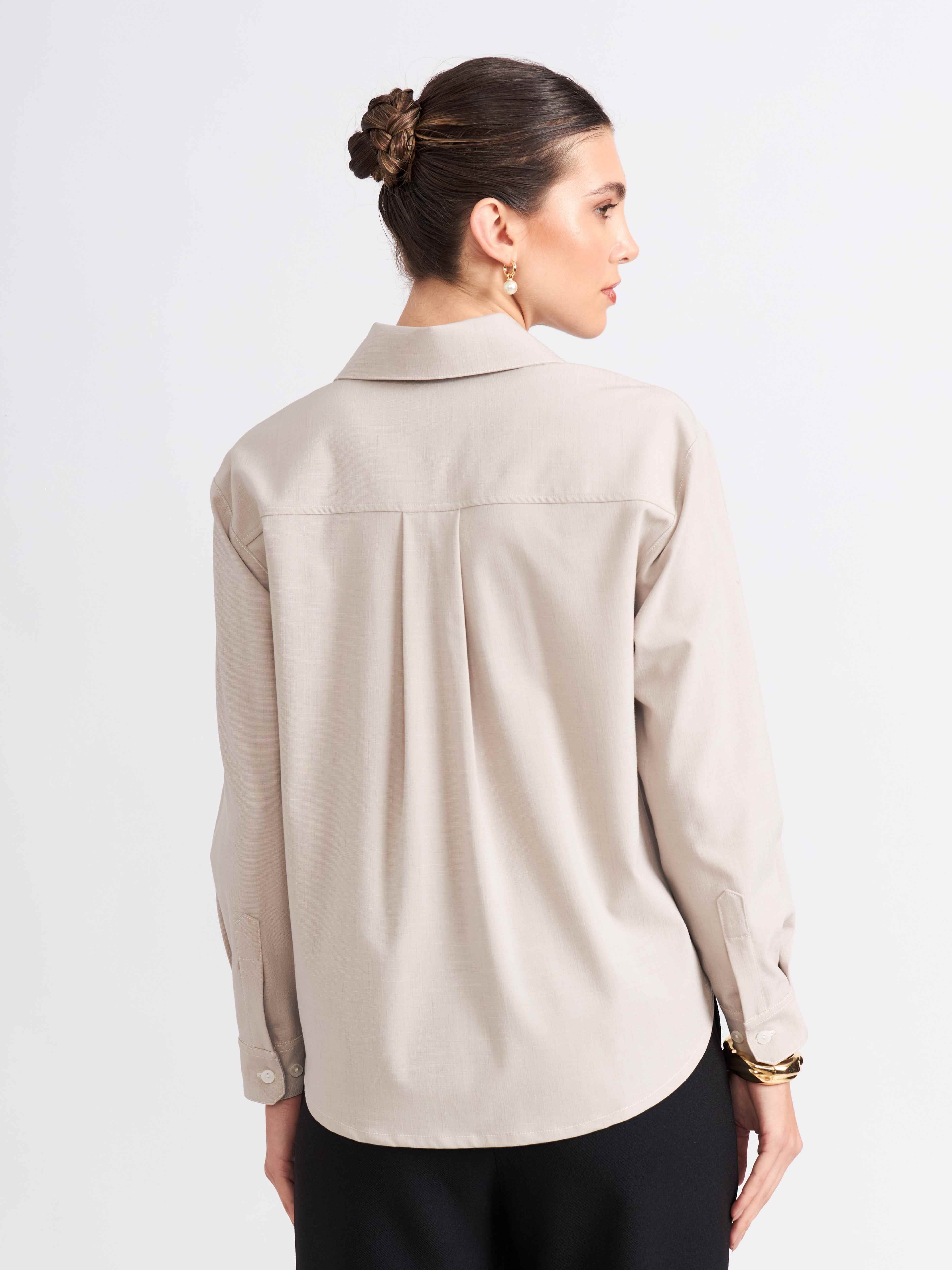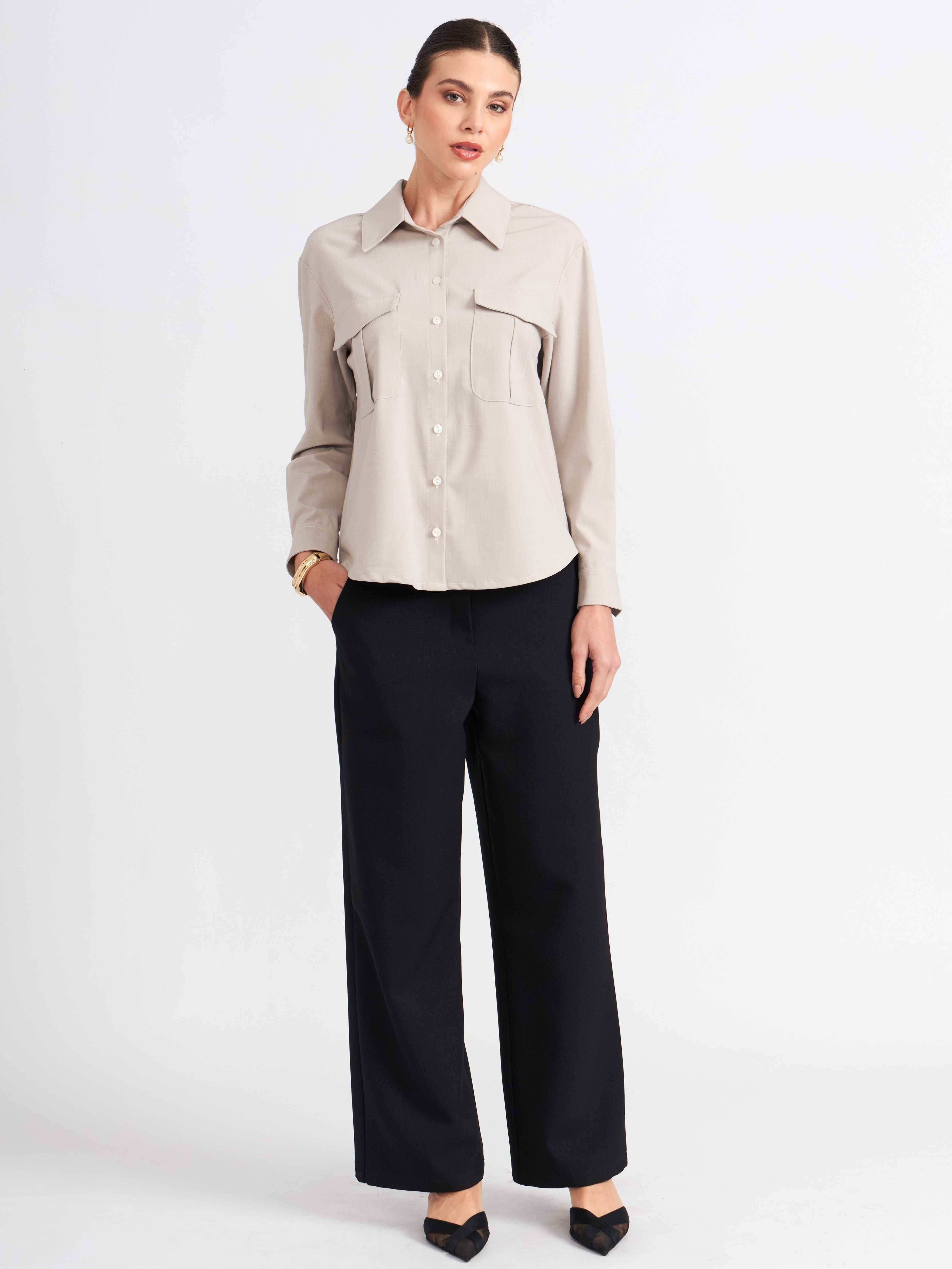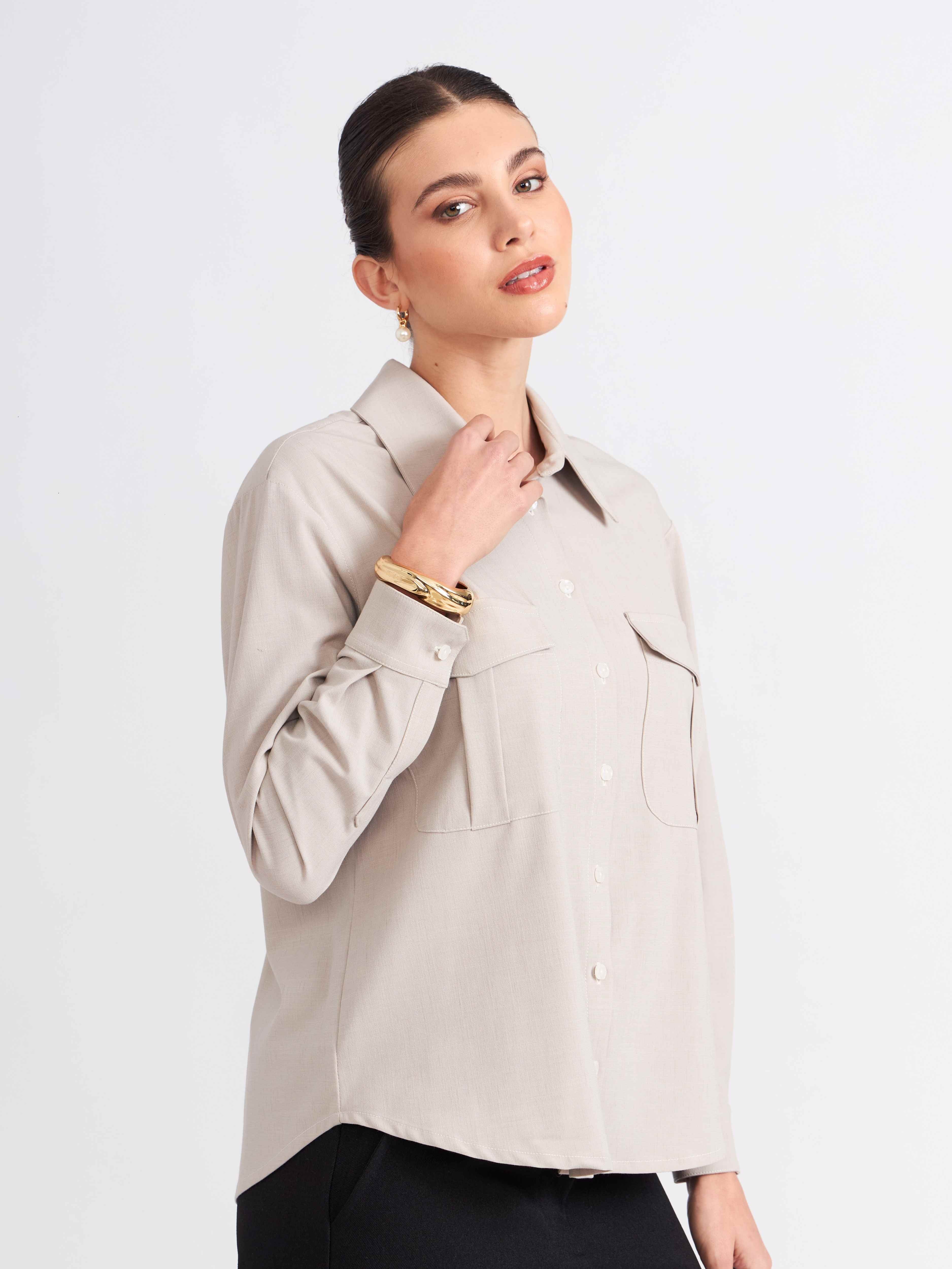 Camisa de cuello solapa y manga larga. Bolsillos de plastrón con solapa en delantero. Cierre frontal con botones.
