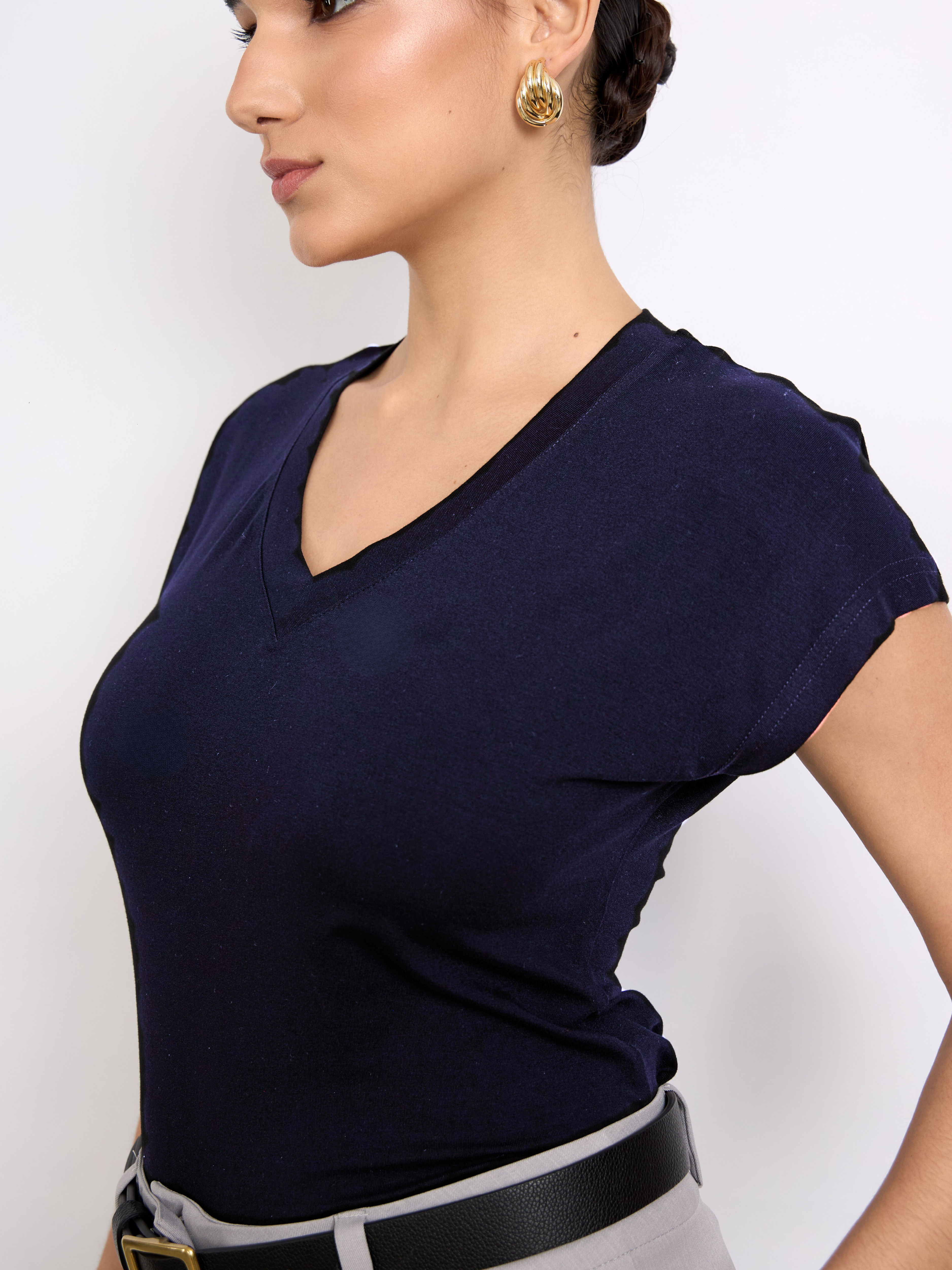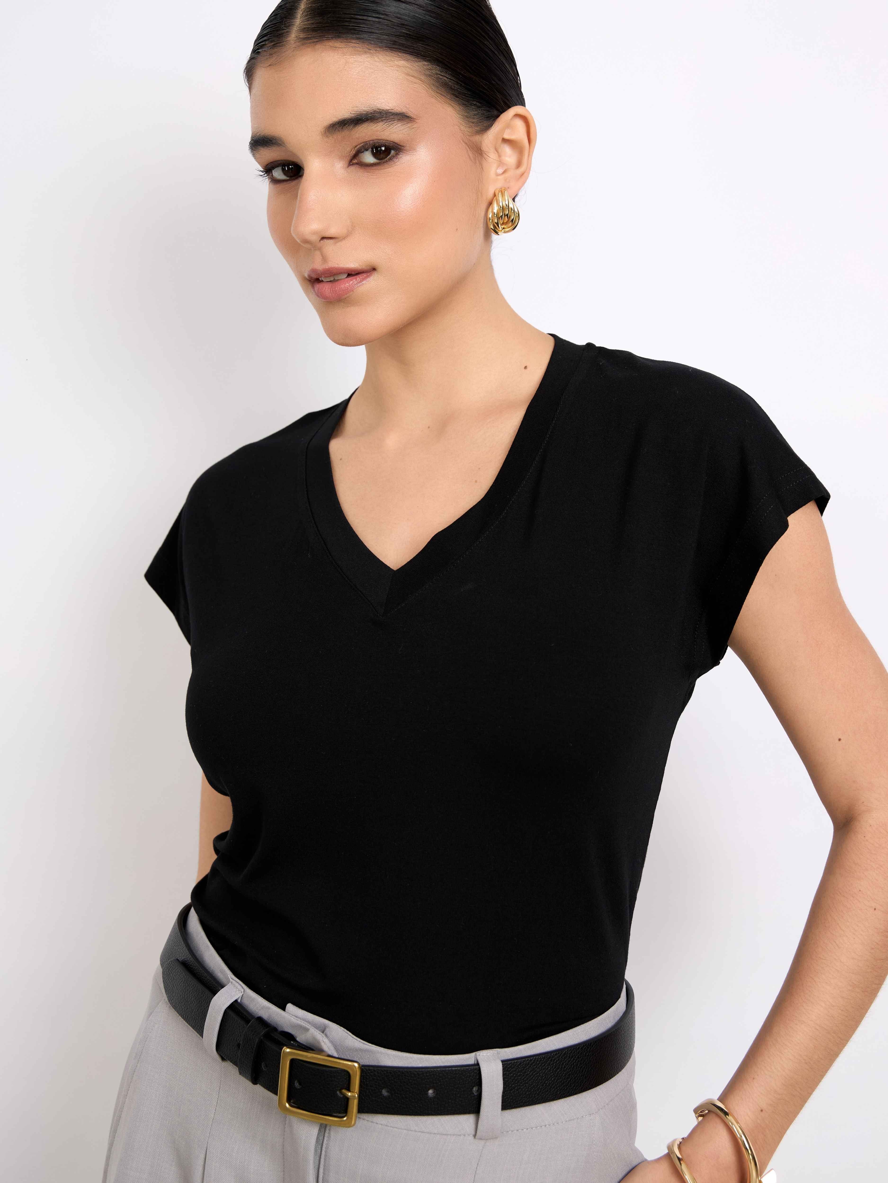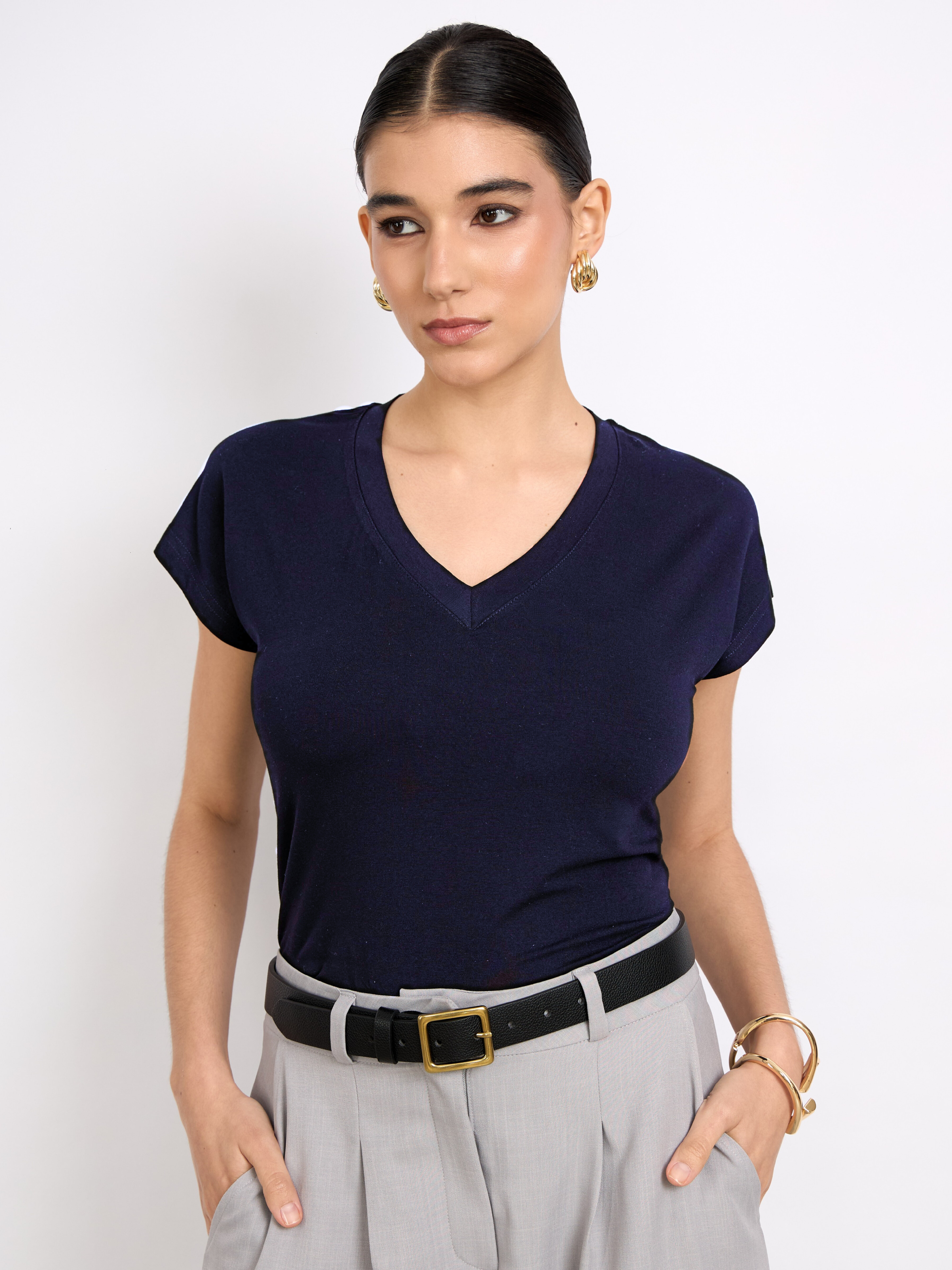 Polo básico de línea recta con una sutil curvatura, escote en V amplio y fit ligeramente suelto. Una pieza esencial y versátil para cualquier temporada del año.