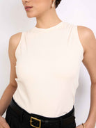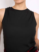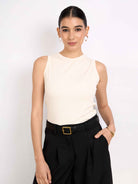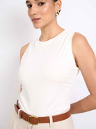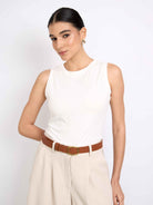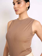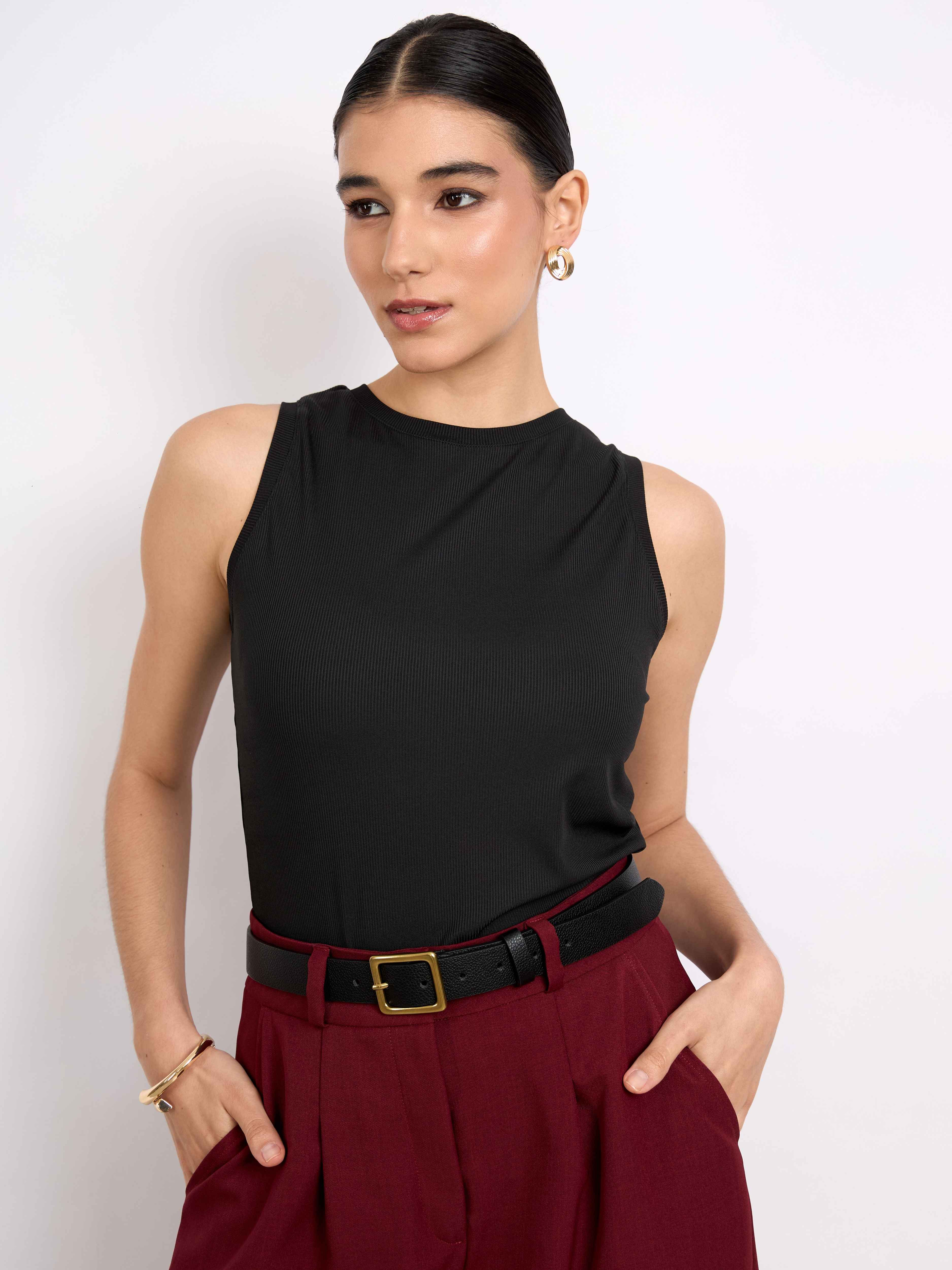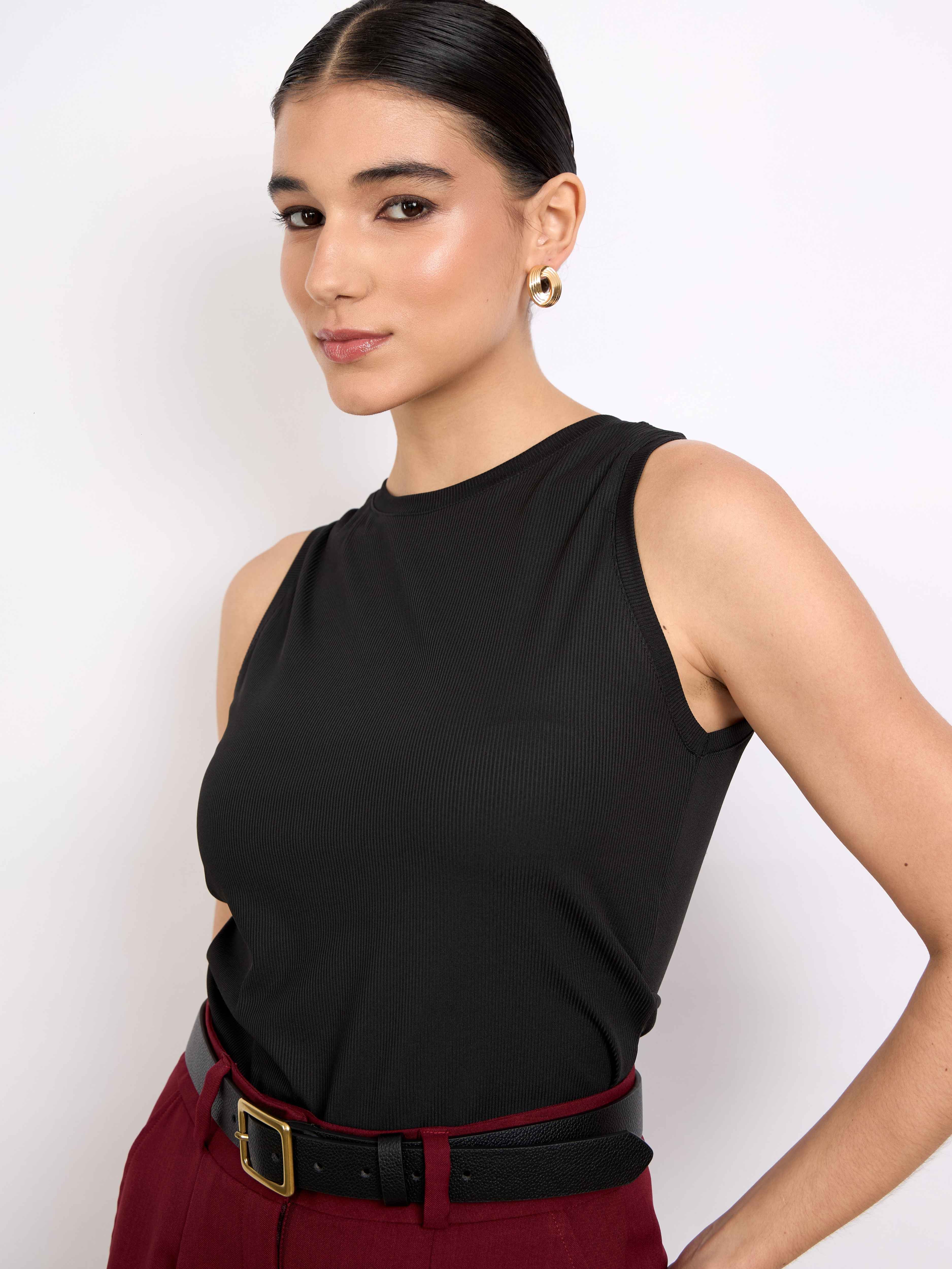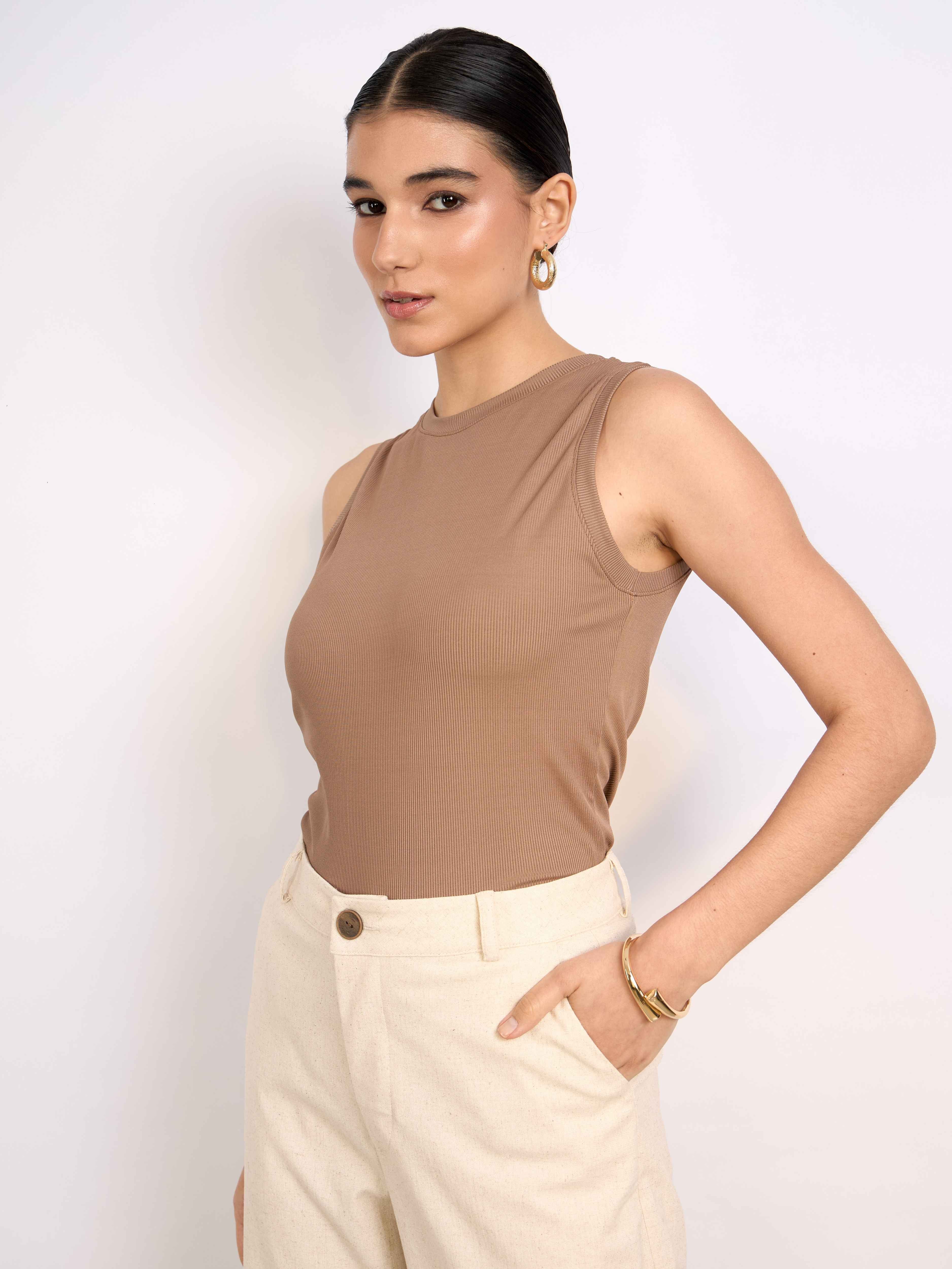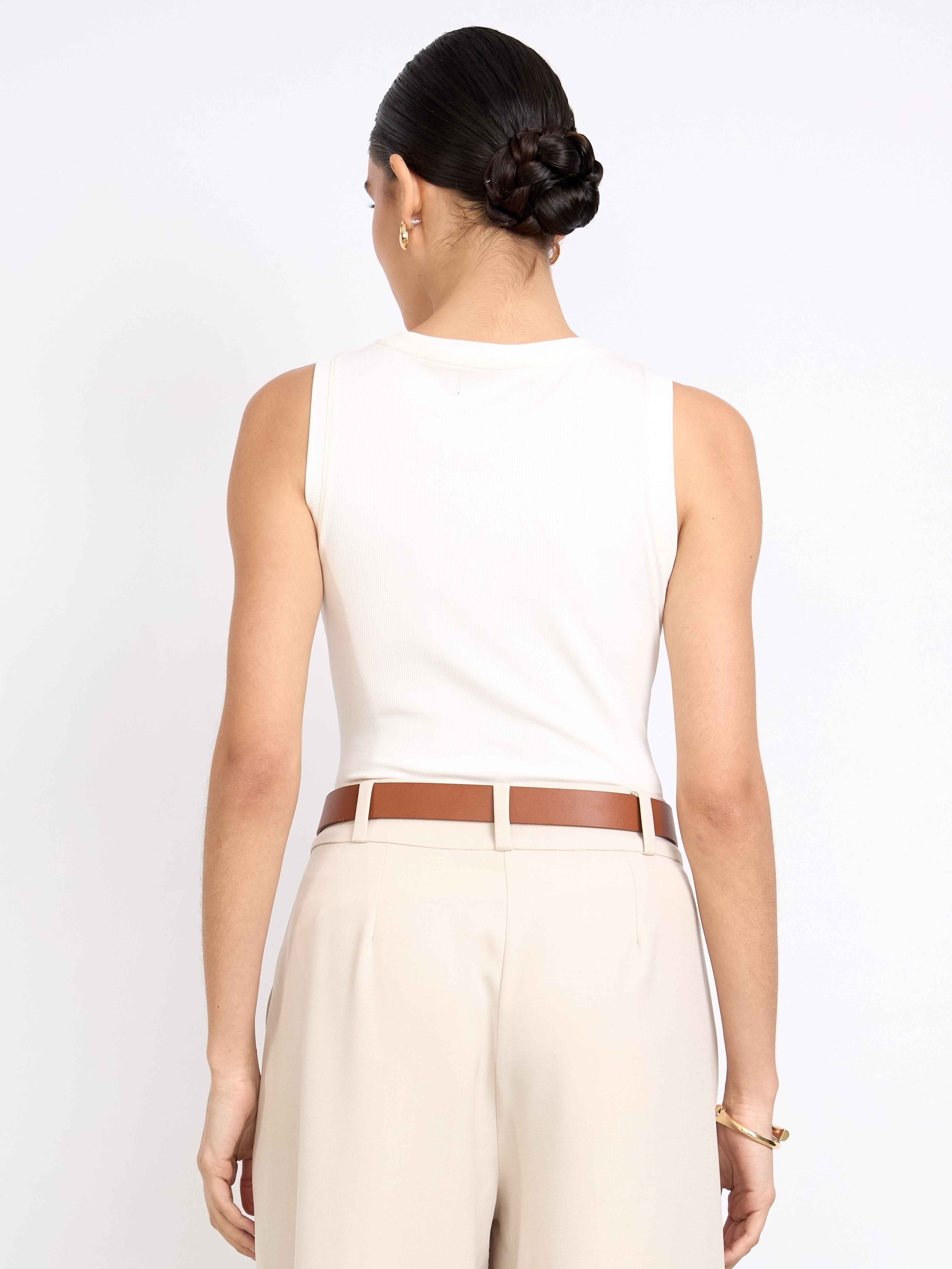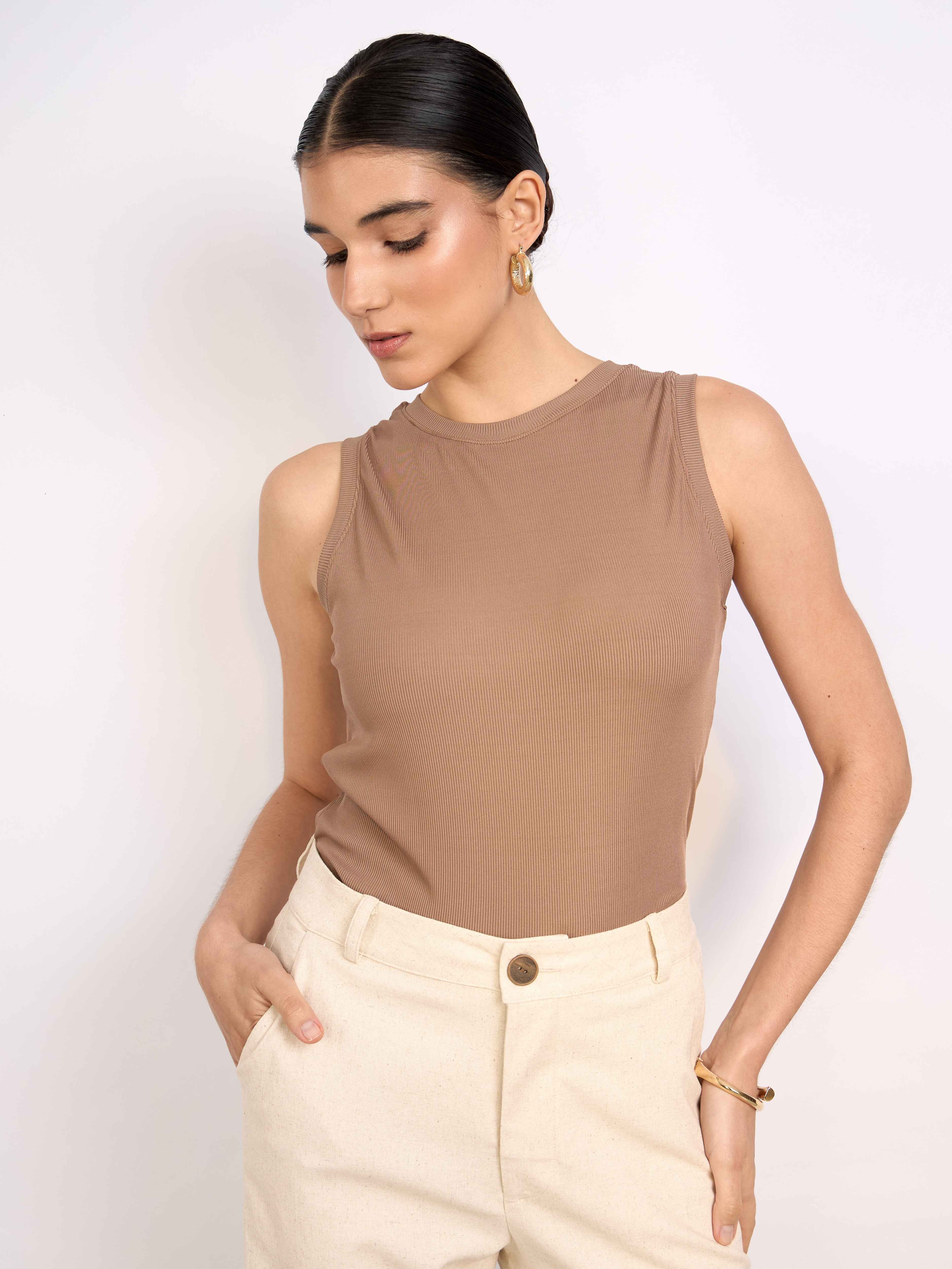 Top sin mangas con cuello redondo acabado con rib. Fit ligero y largo hasta la primera cadera. Versátil y cómodo.