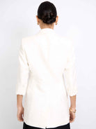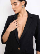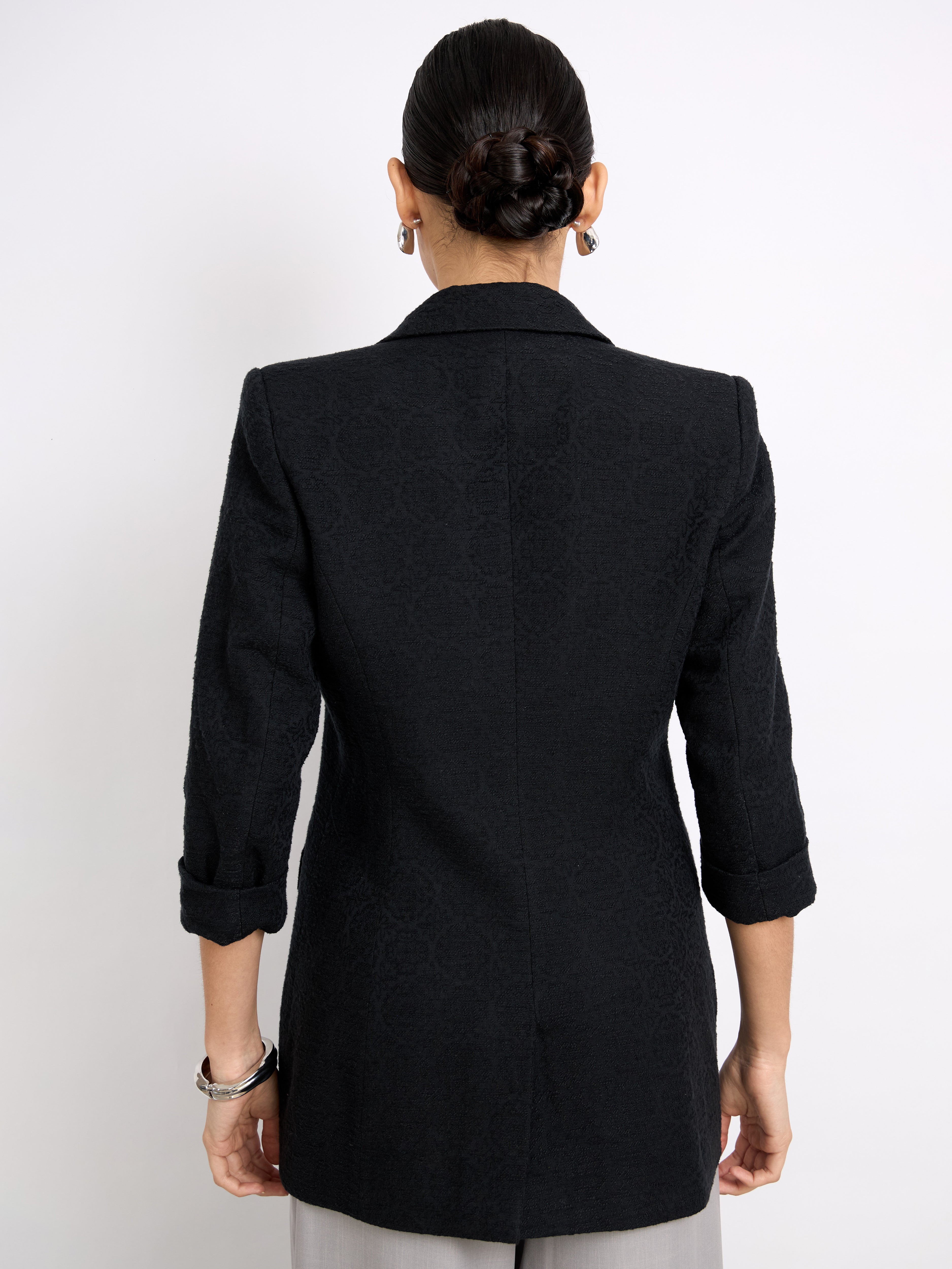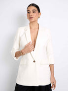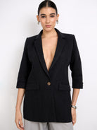 Blazer de manga 3/4, fit holgado, hombros estructurados, cuello con solapa y cruce simple. Lleva un botón y una abertura en la parte baja de la espalda. Un estilo elegante y sofisticado.