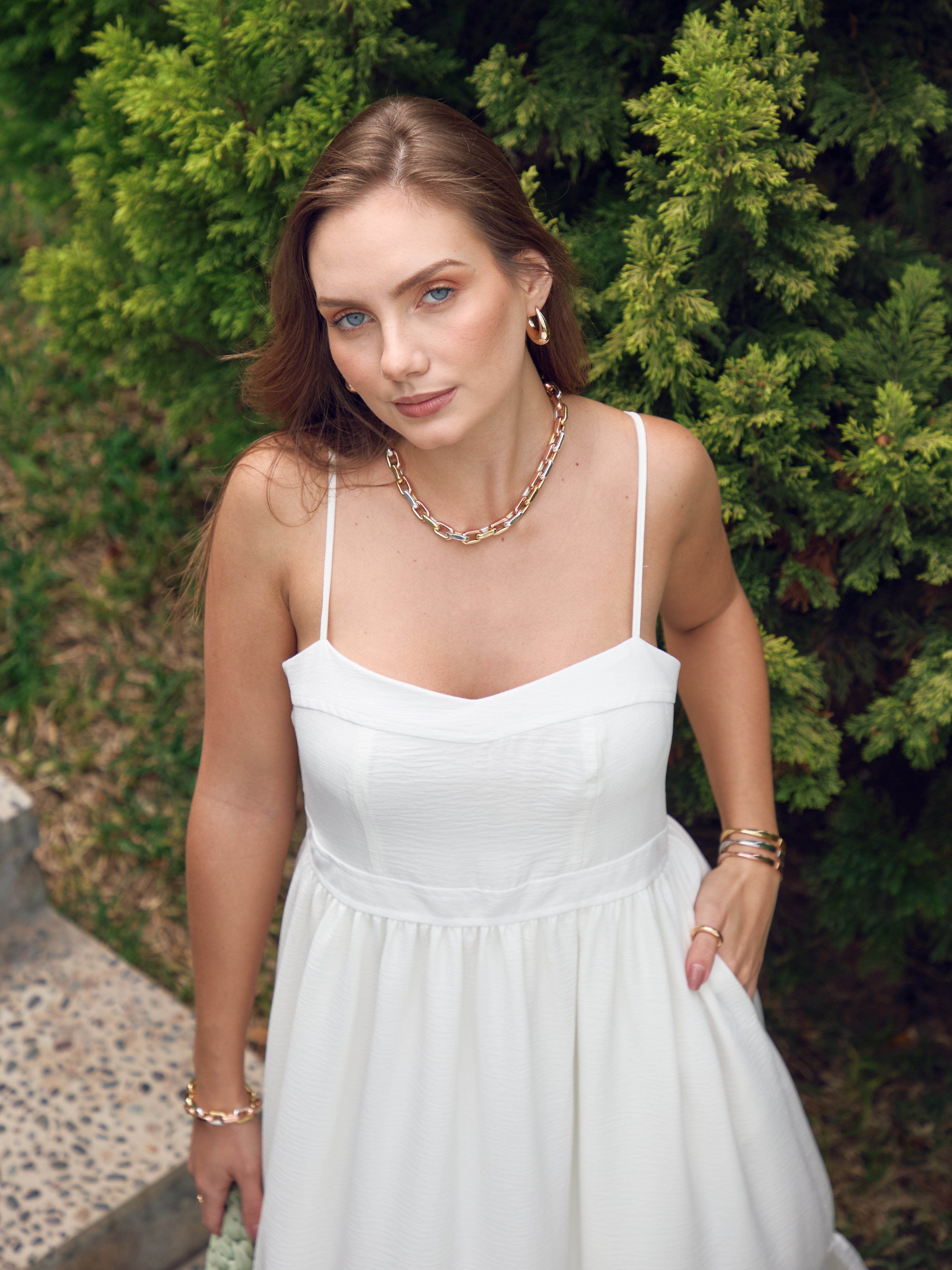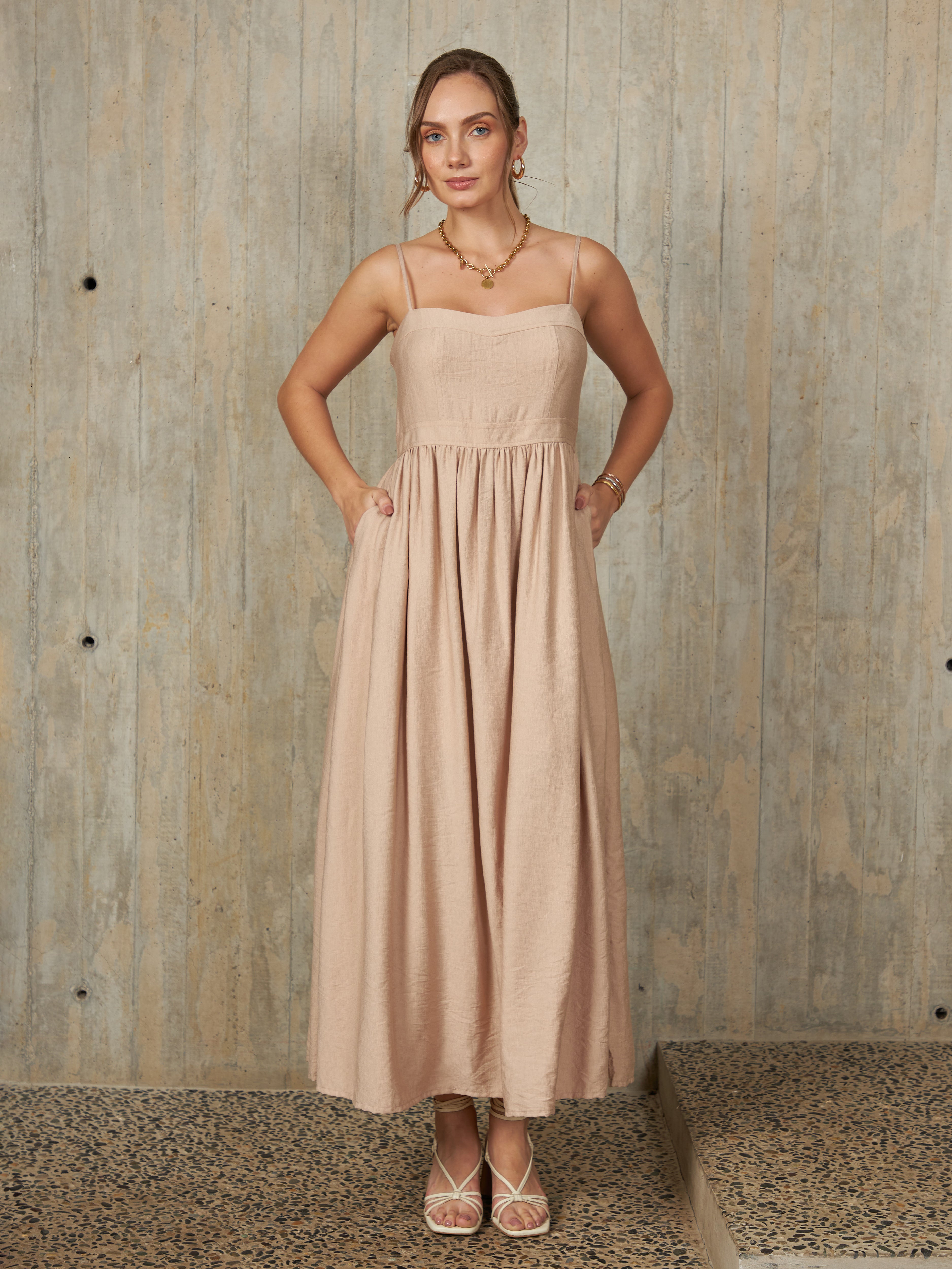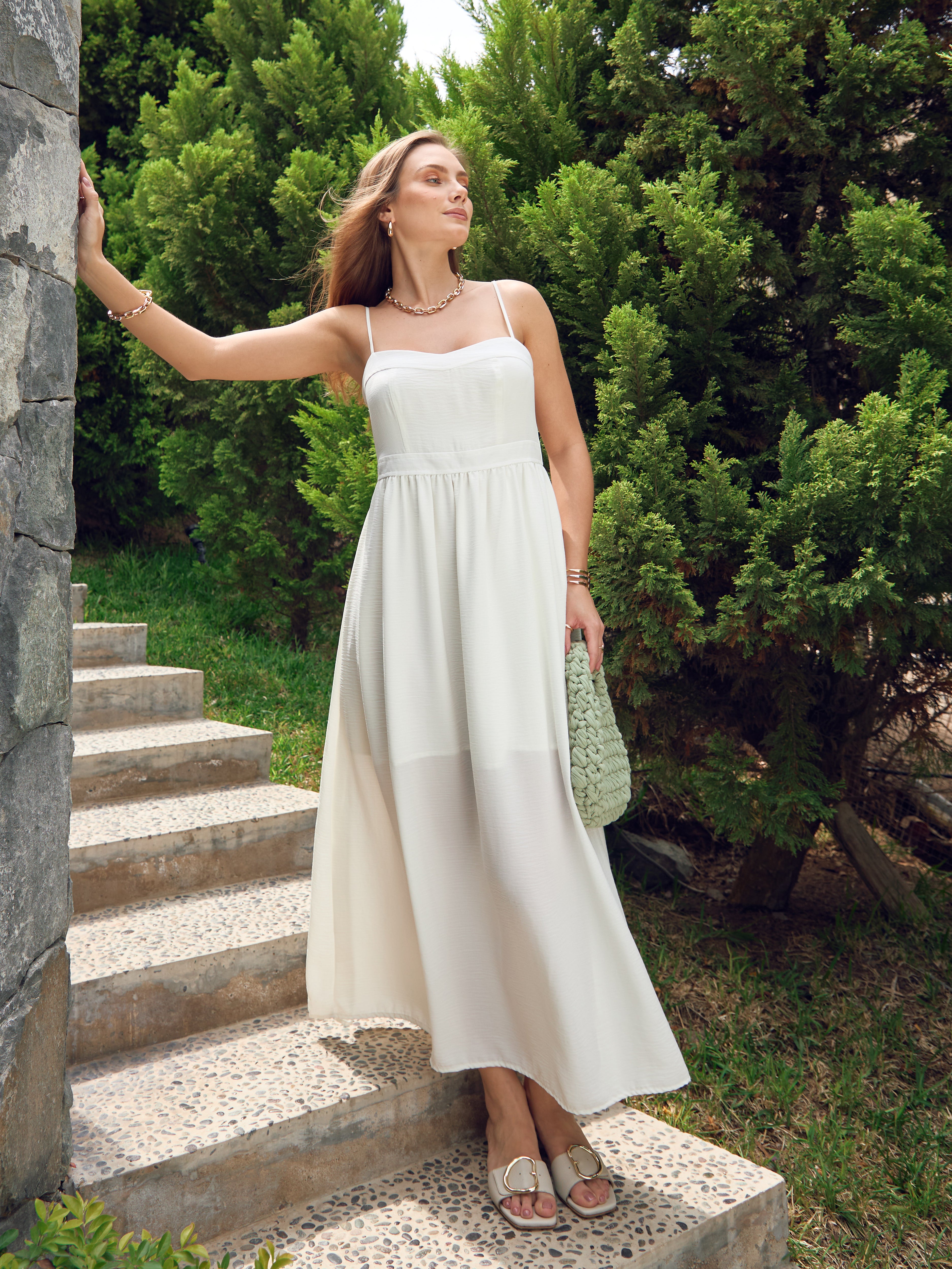 Vestido con tirantes ajustables y corte amplio estilo princesa. Con un ajuste en la cintura y cierre invisible en la espalda para un ajuste perfecto.