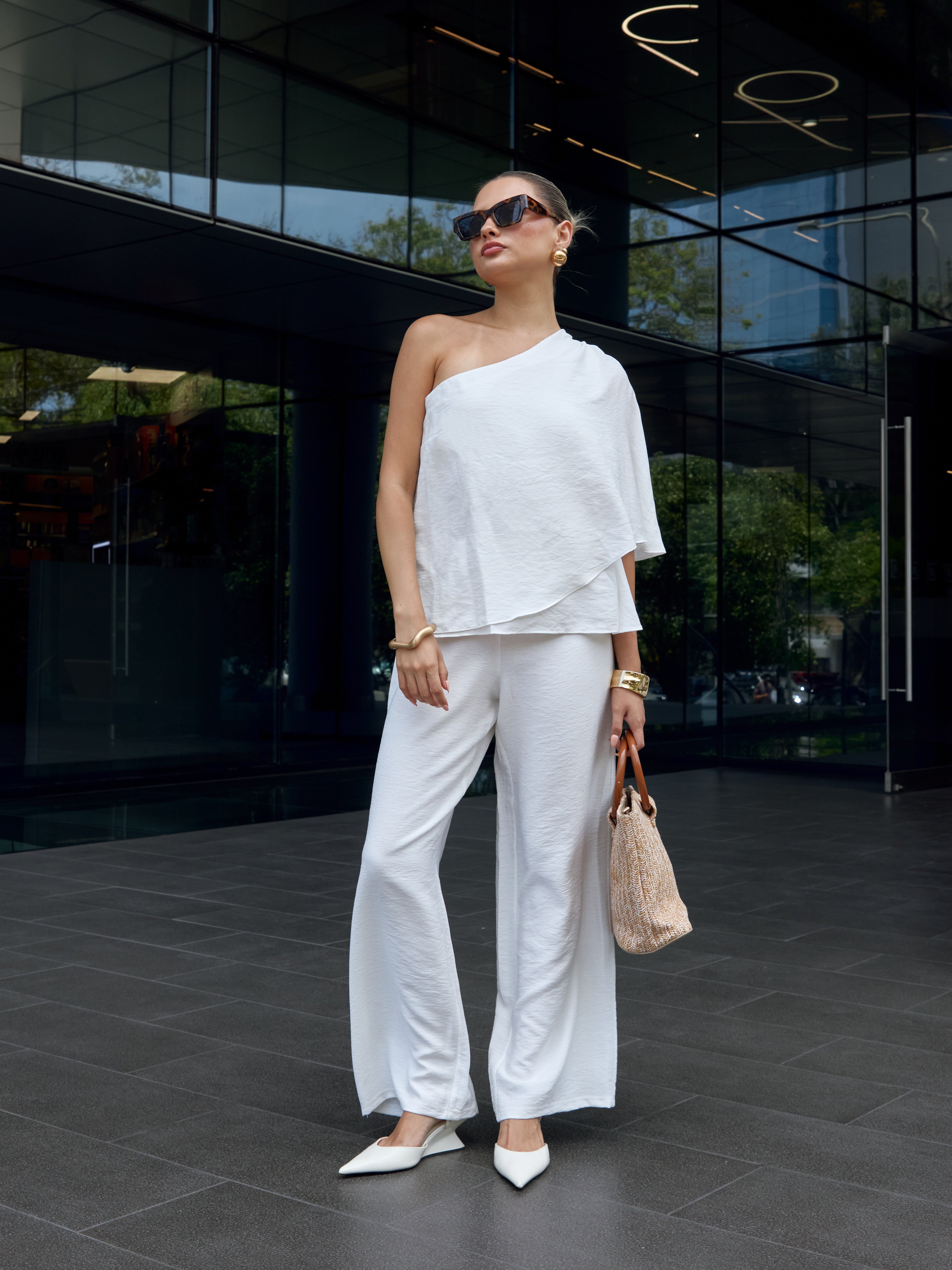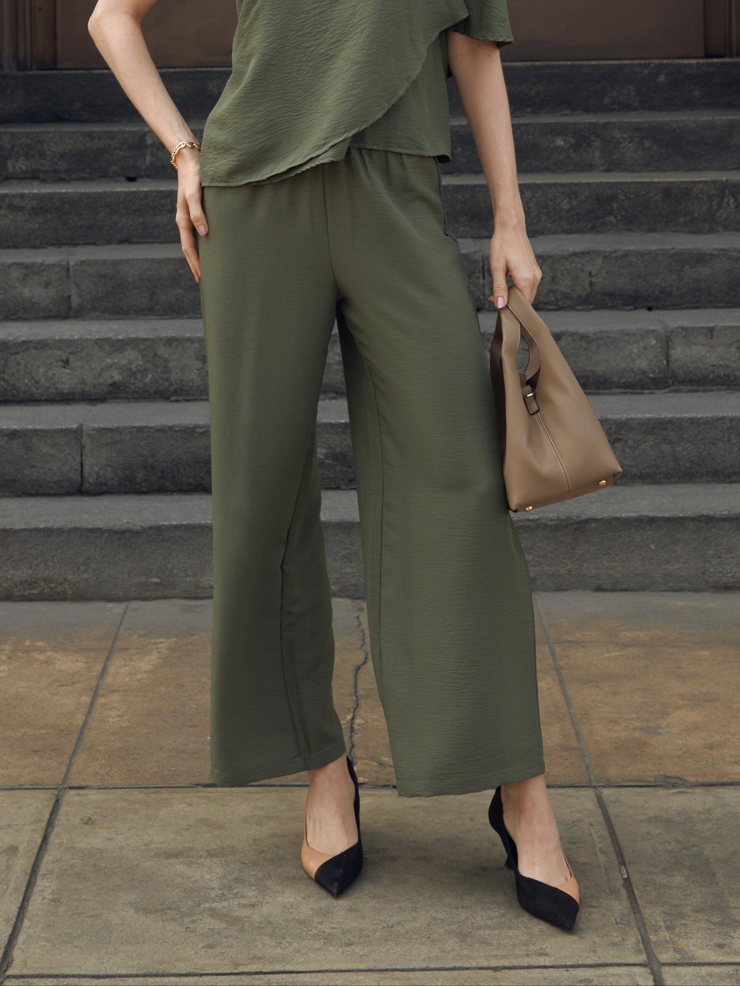 Pantalón recto con diseño relajado y sofisticado. Incorpora elásticos en la cintura para un ajuste cómodo y versátil, ideal para un look fresco y elegante.