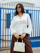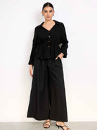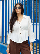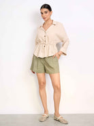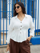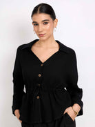 Blusa kimono de manga larga y ancha, con una silueta amplia. Lleva fruncidos en el contorno de la cintura, botones en el delantero y un cordón central que permite ajustar el fruncido. Súper versátil y atemporal.