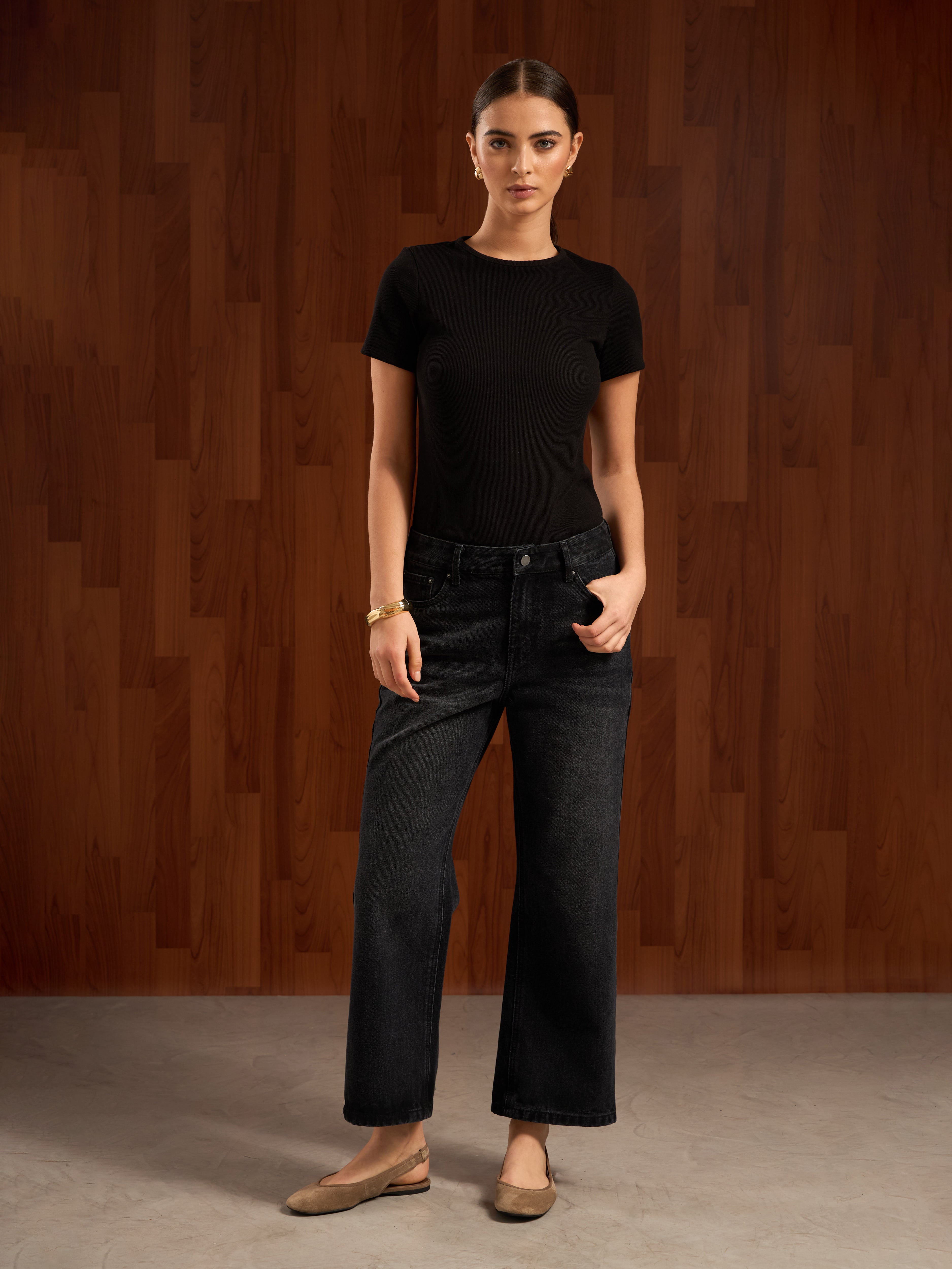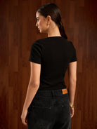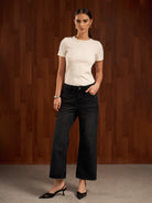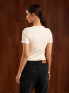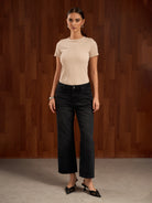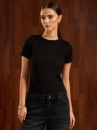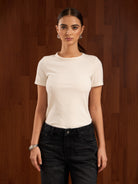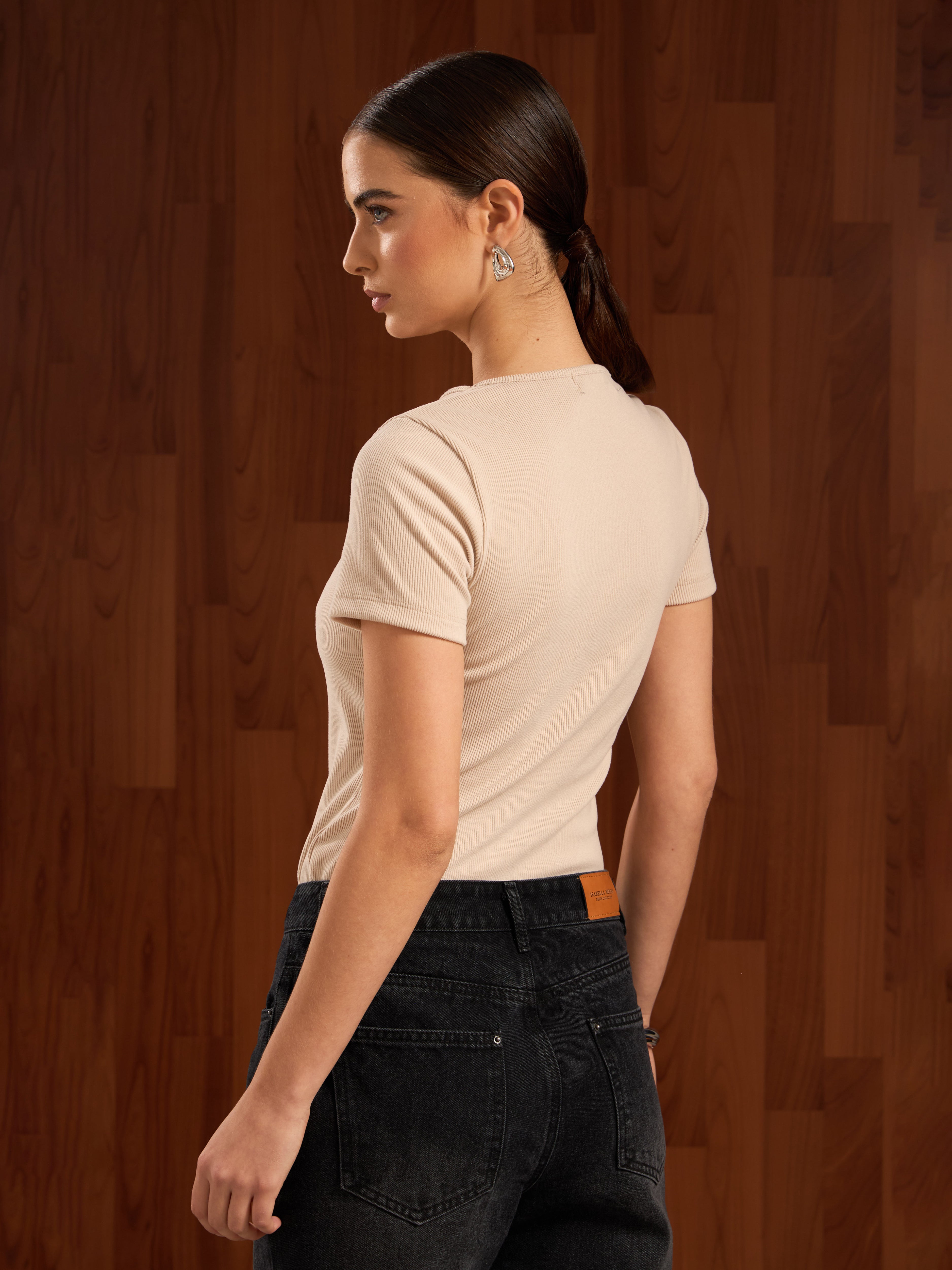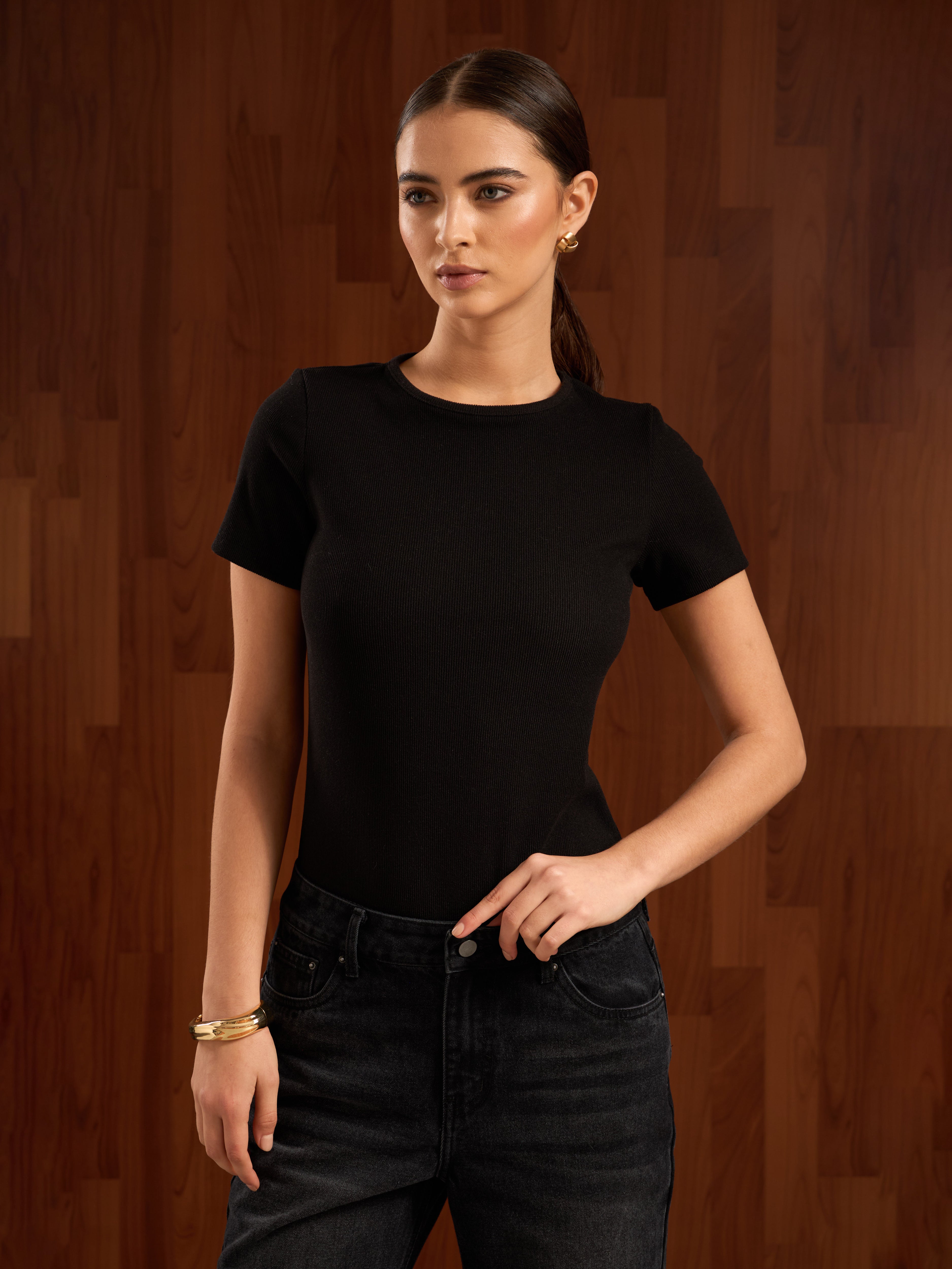 Top básico de manga corta con cuello redondo que aporta una silueta sofisticada. El tejido cuenta con una textura delicada y elegante que se amolda al cuerpo, perfecta para looks versátiles.