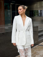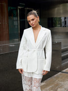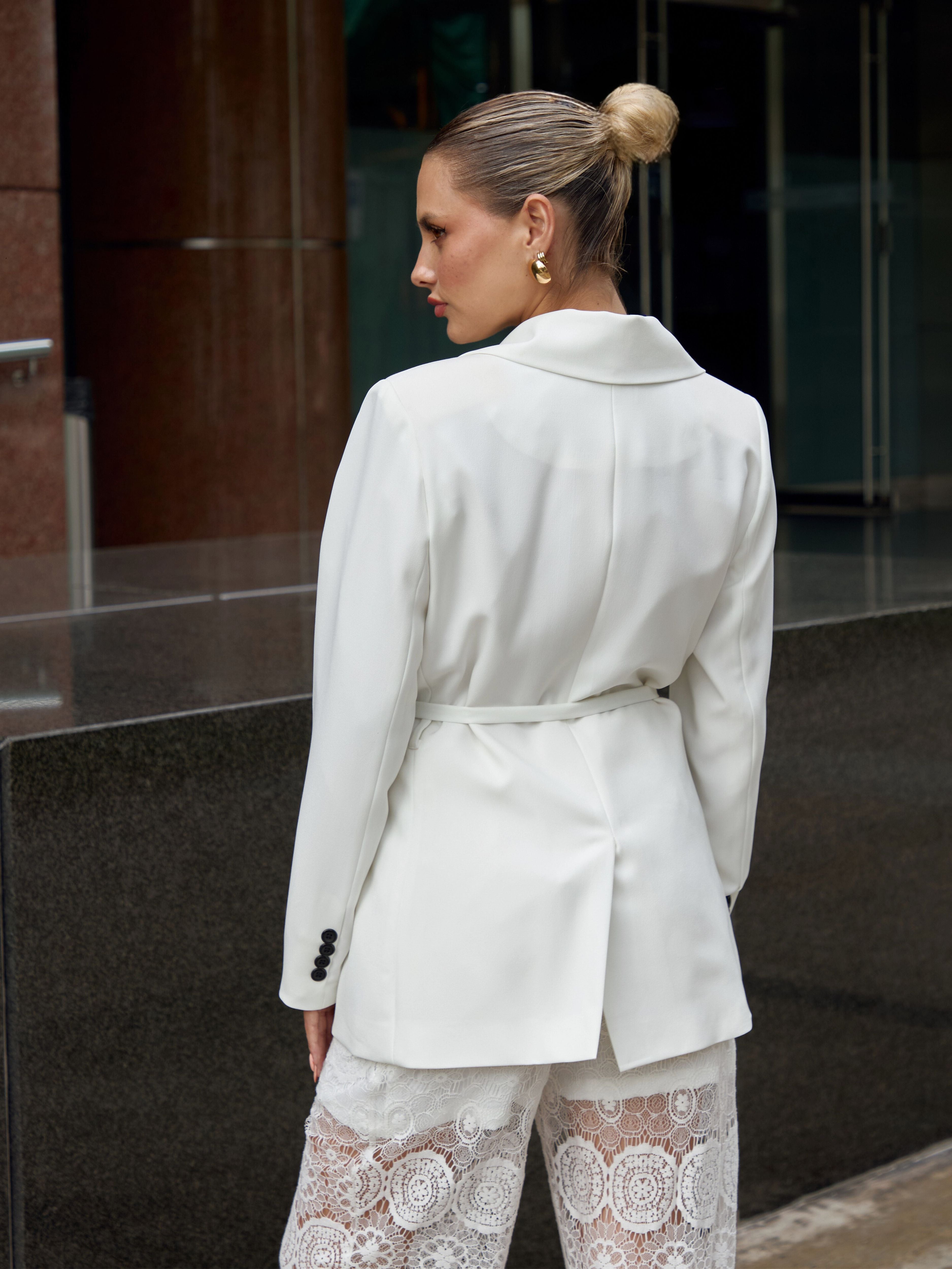 Blazer clásico de manga larga con escote largo, diseñado con un corte semi-fit que realza la figura de manera elegante. Su cierre con un cinturón delicado permite ajustar la prenda a tu medida.