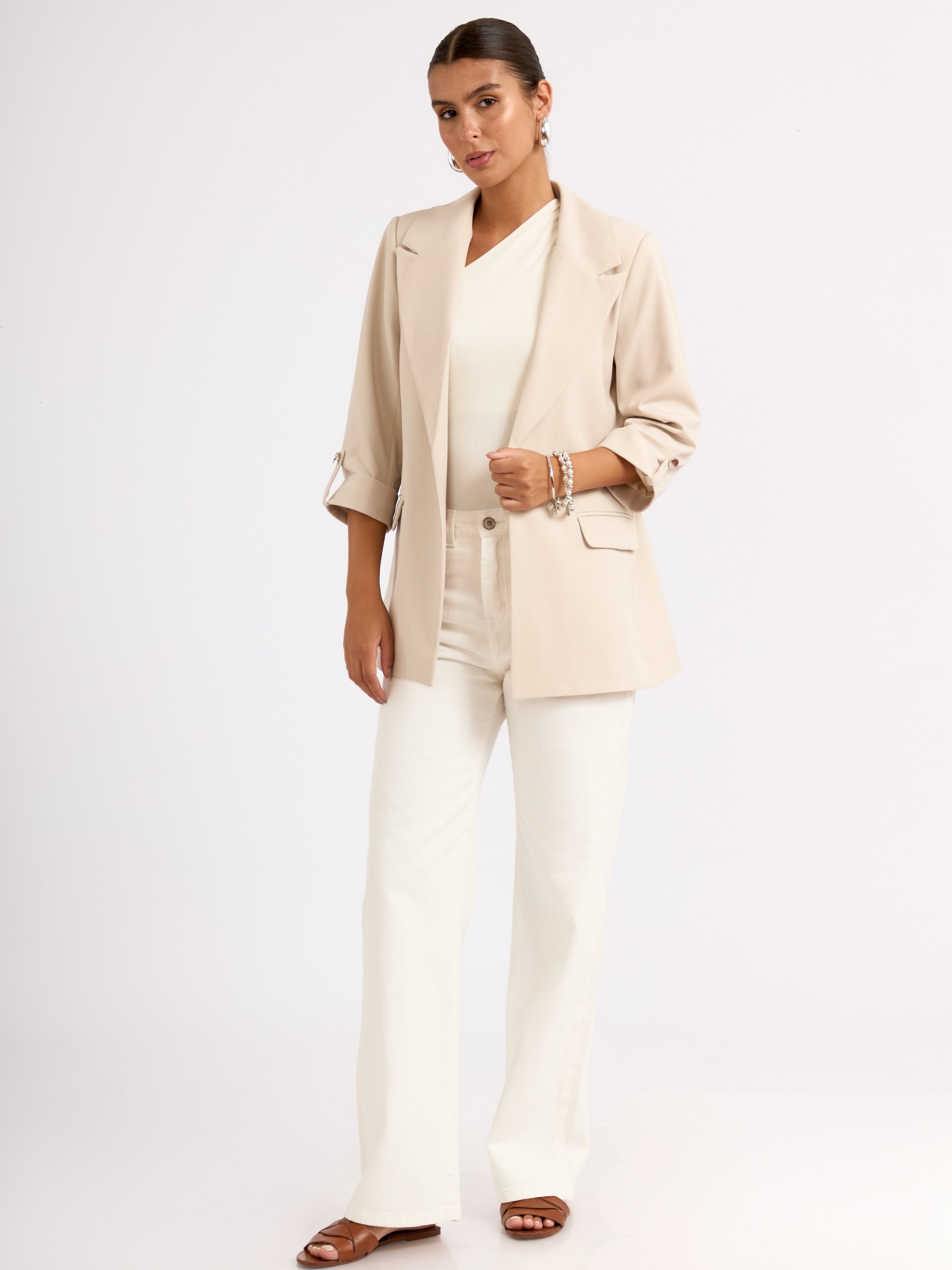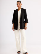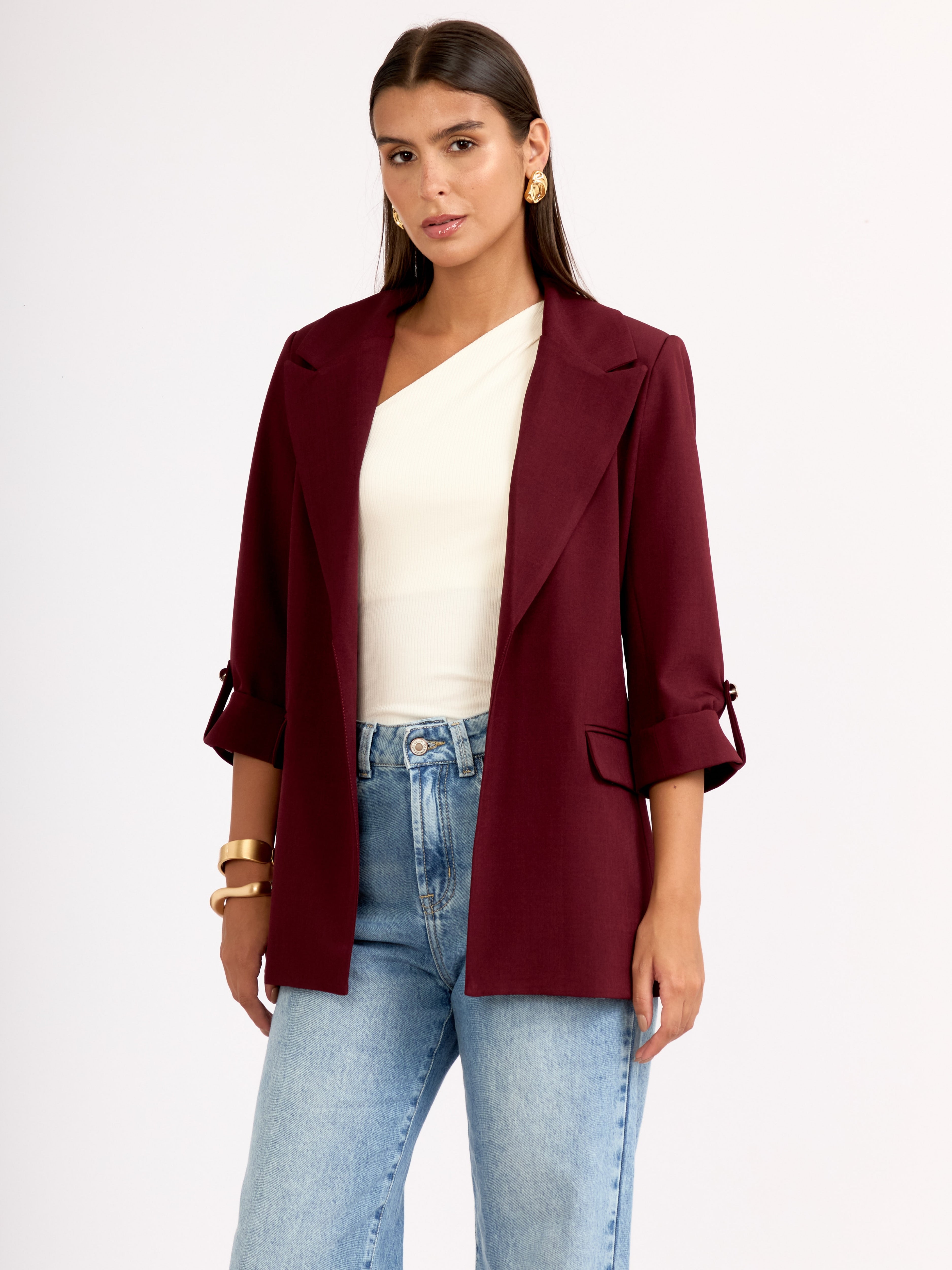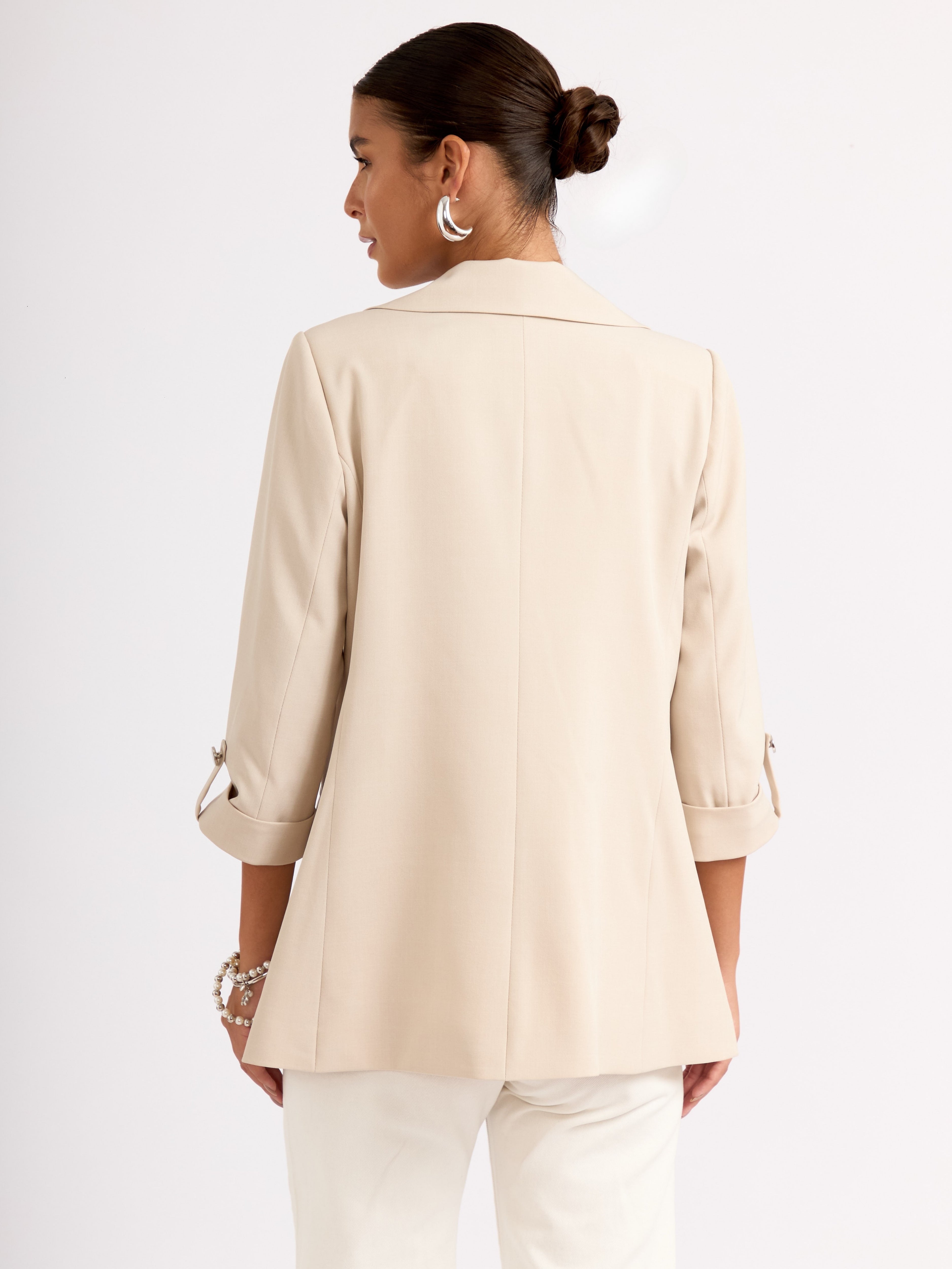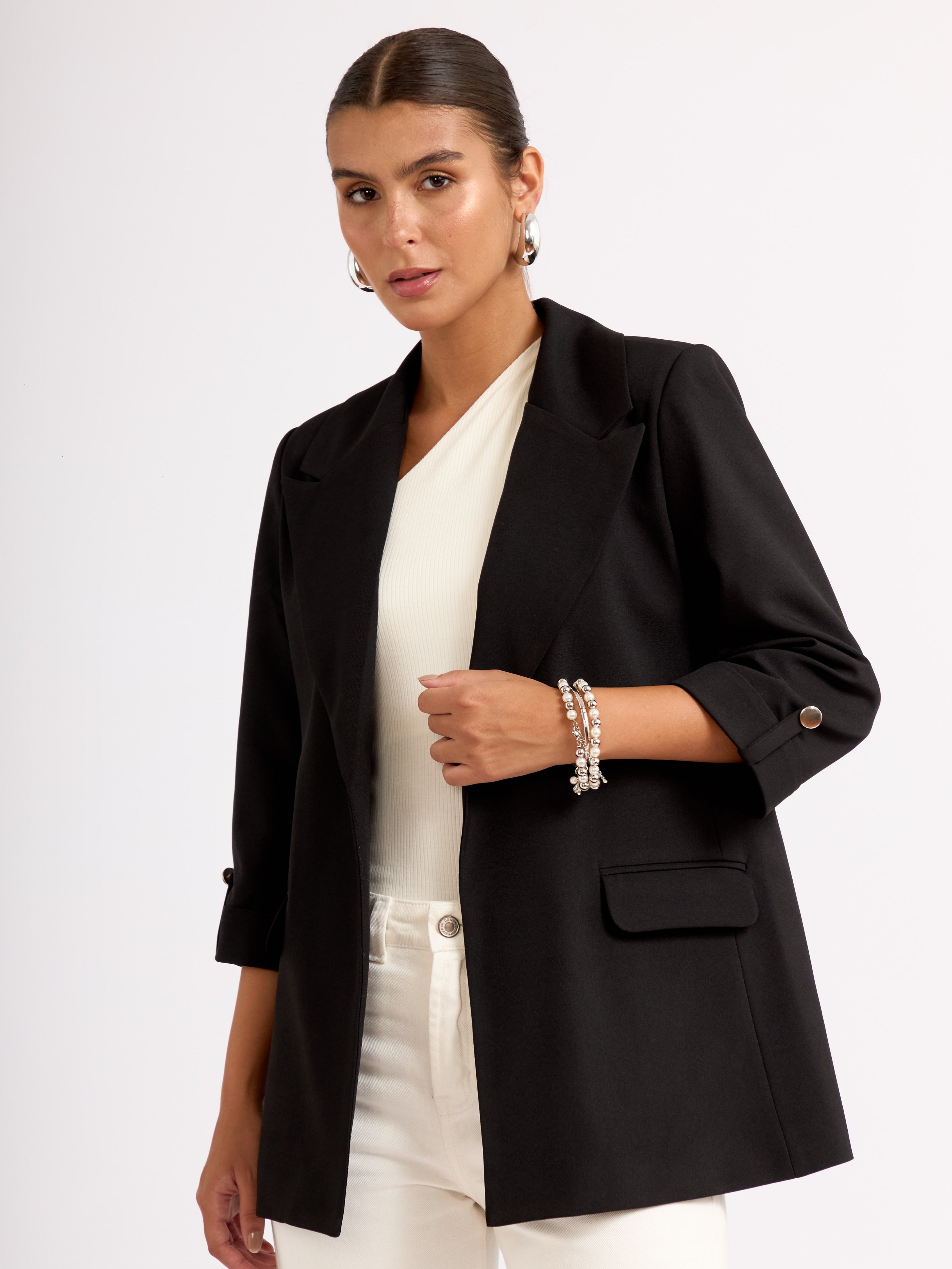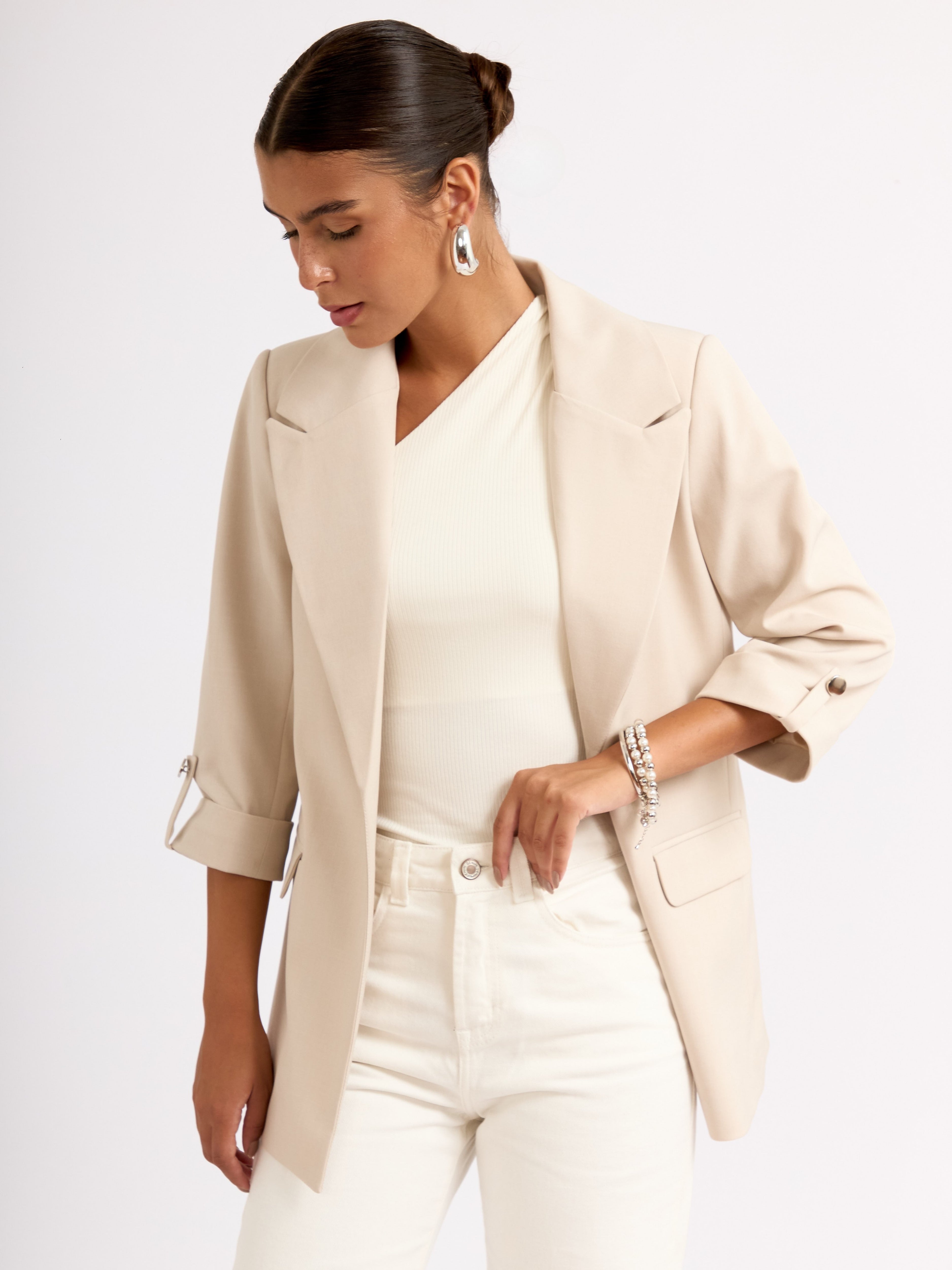 Blazer corte fit, con un diseño elegante que se ajusta perfectamente al cuerpo. Presenta bolsillos con tapa y solapa baja y mangas 3/4 con ajuste de botón que le dan un estilo único y refinado.