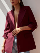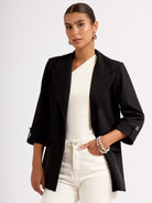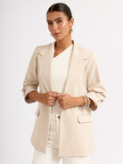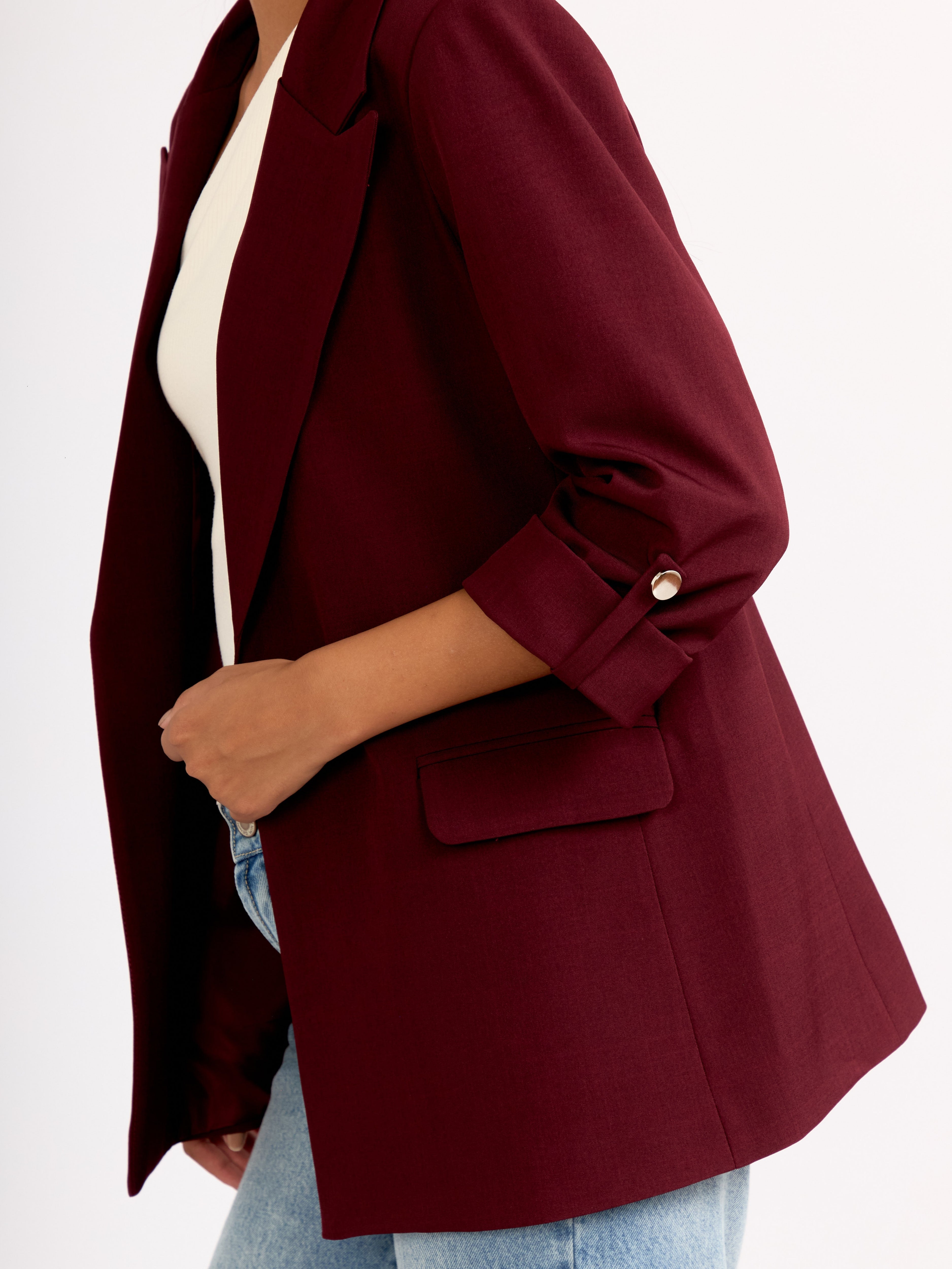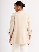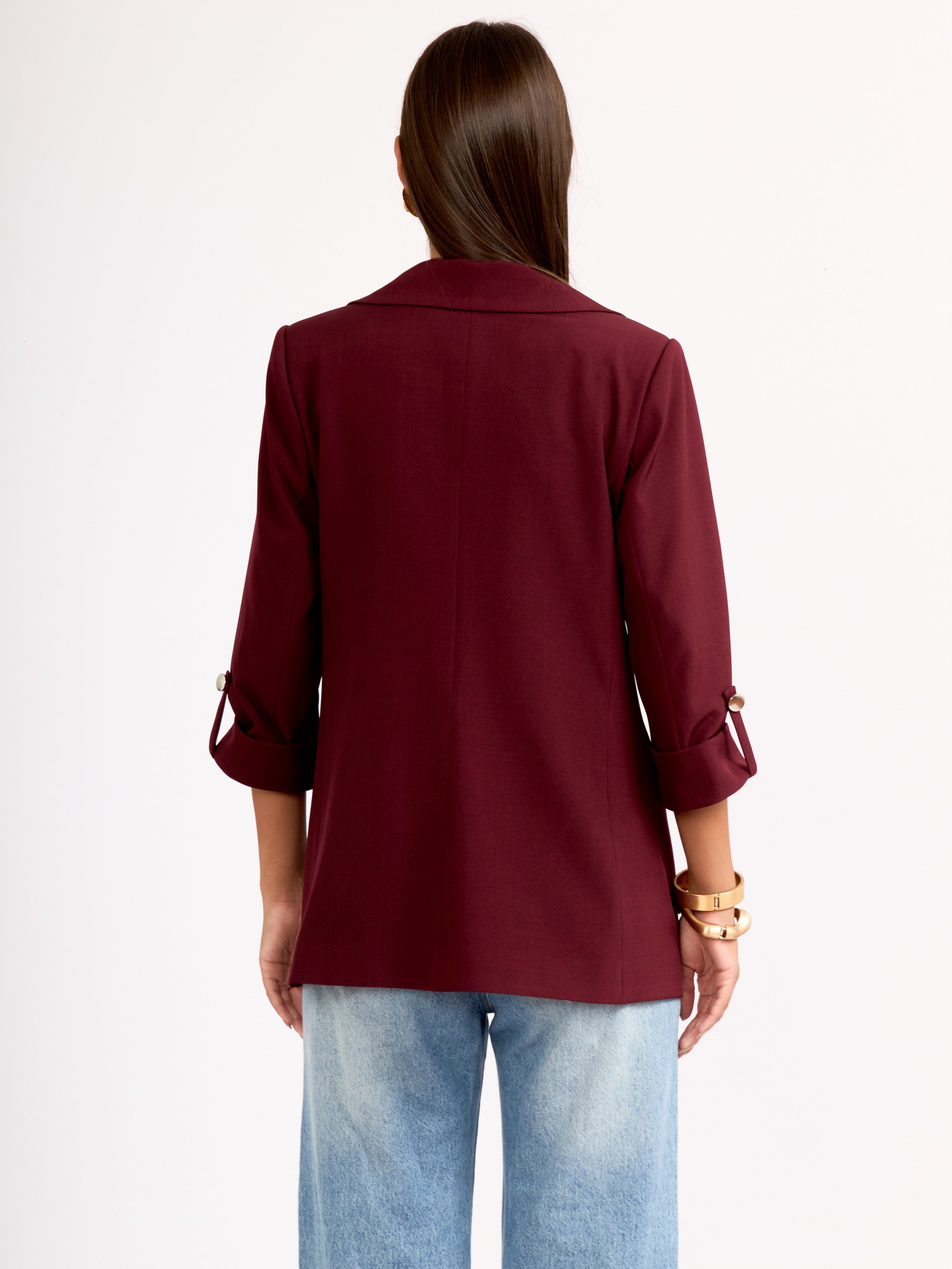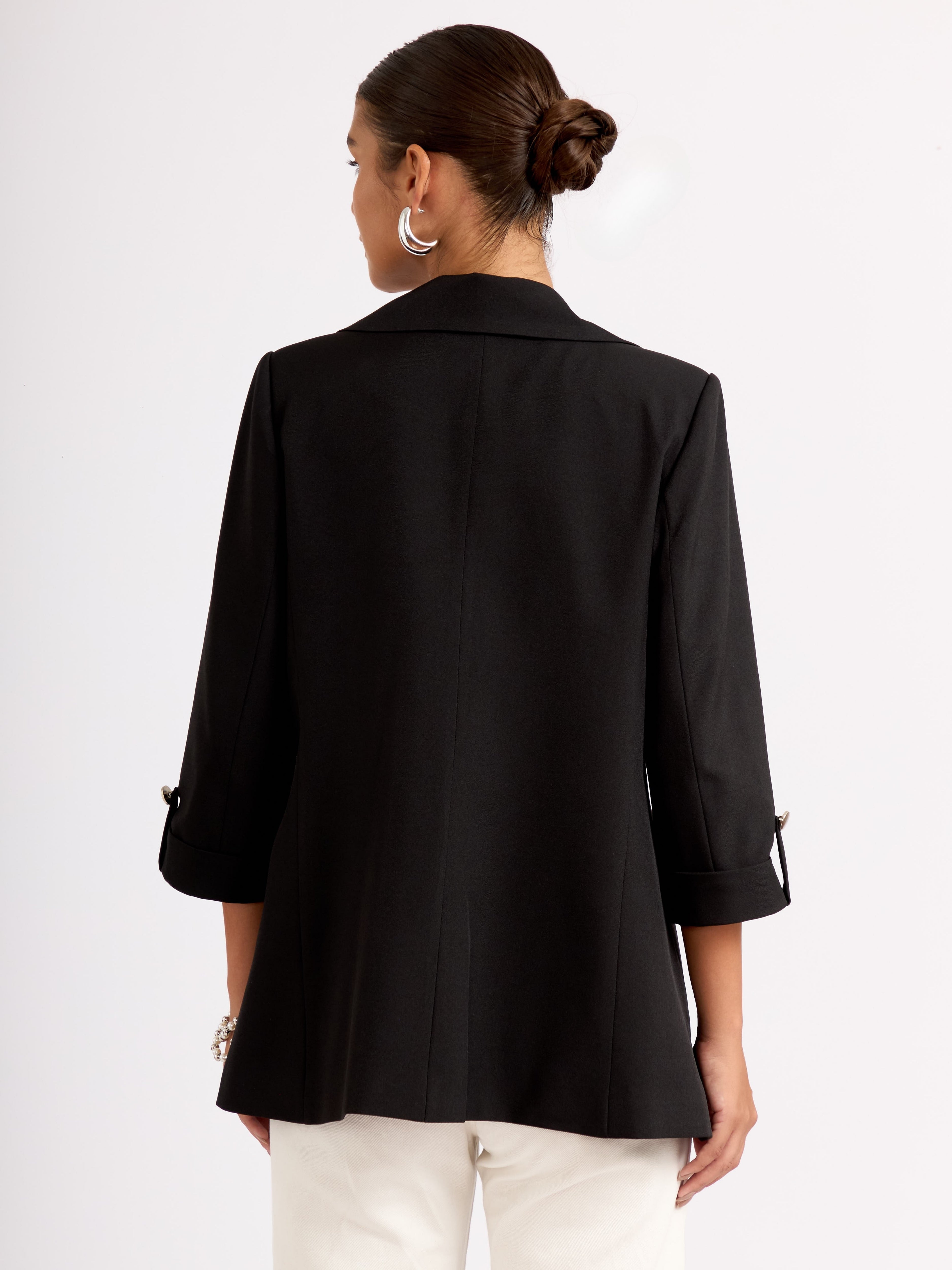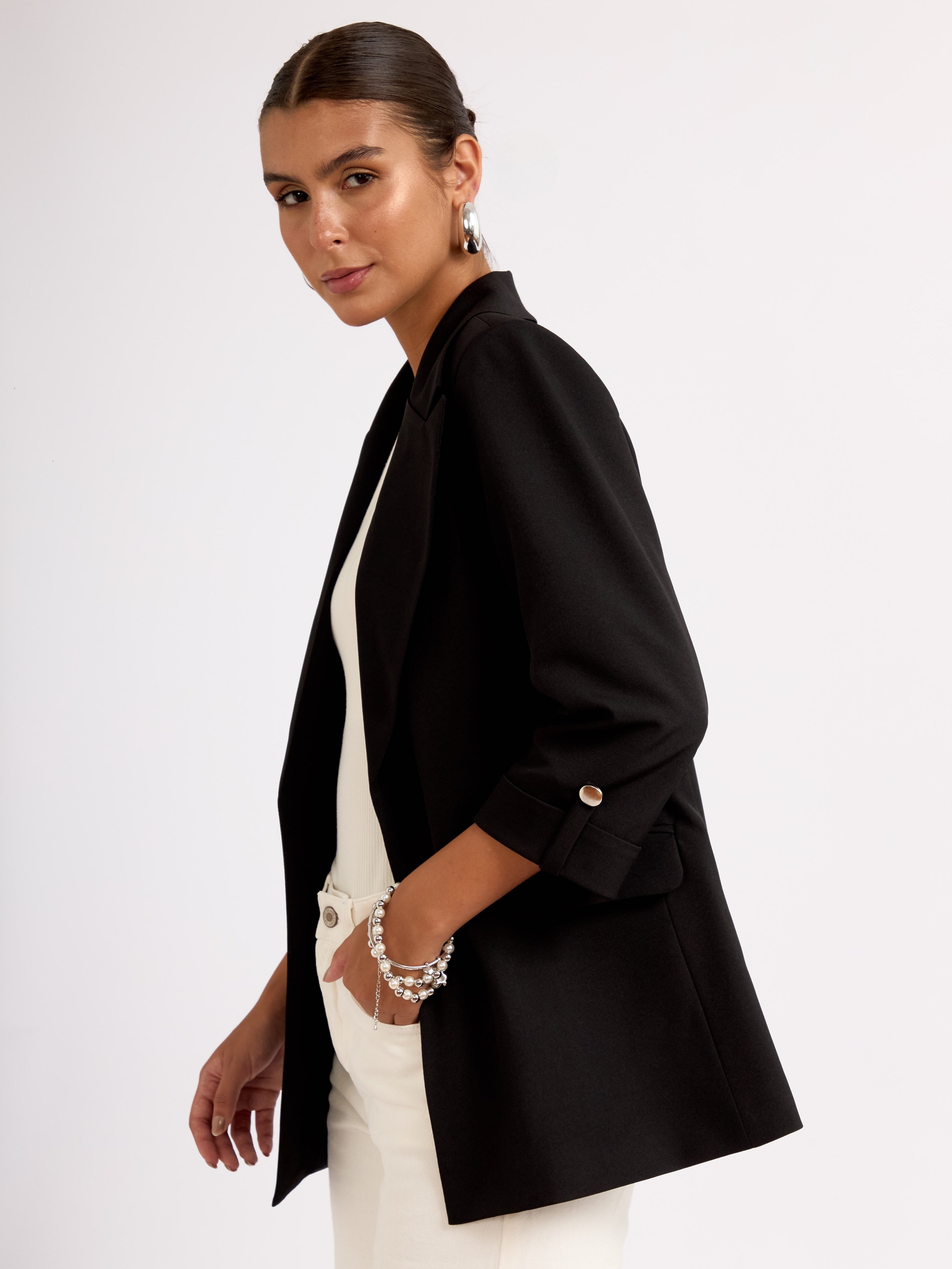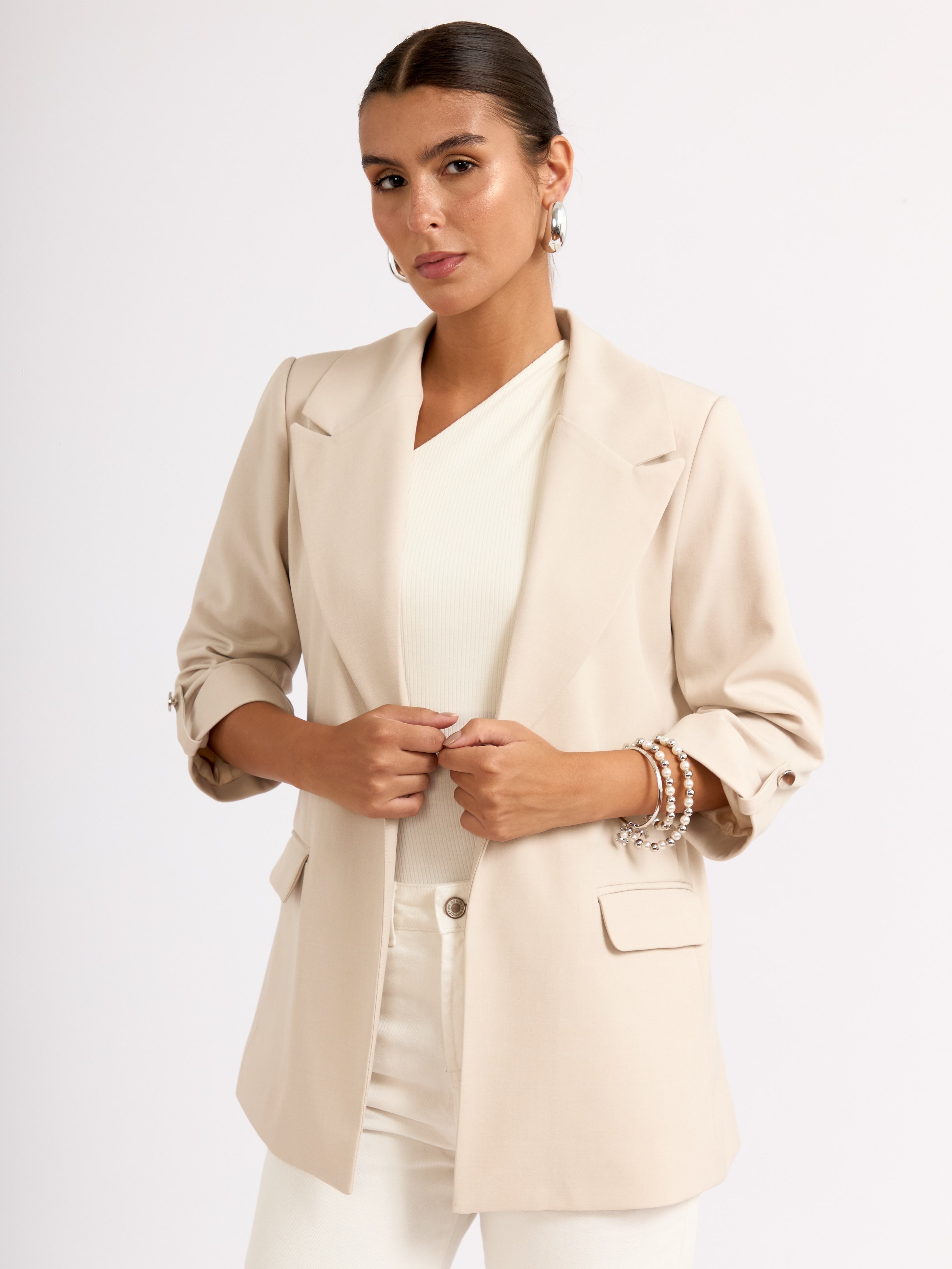 Blazer corte fit, con un diseño elegante que se ajusta perfectamente al cuerpo. Presenta bolsillos con tapa y solapa baja y mangas 3/4 con ajuste de botón que le dan un estilo único y refinado.