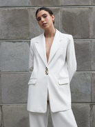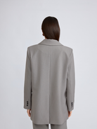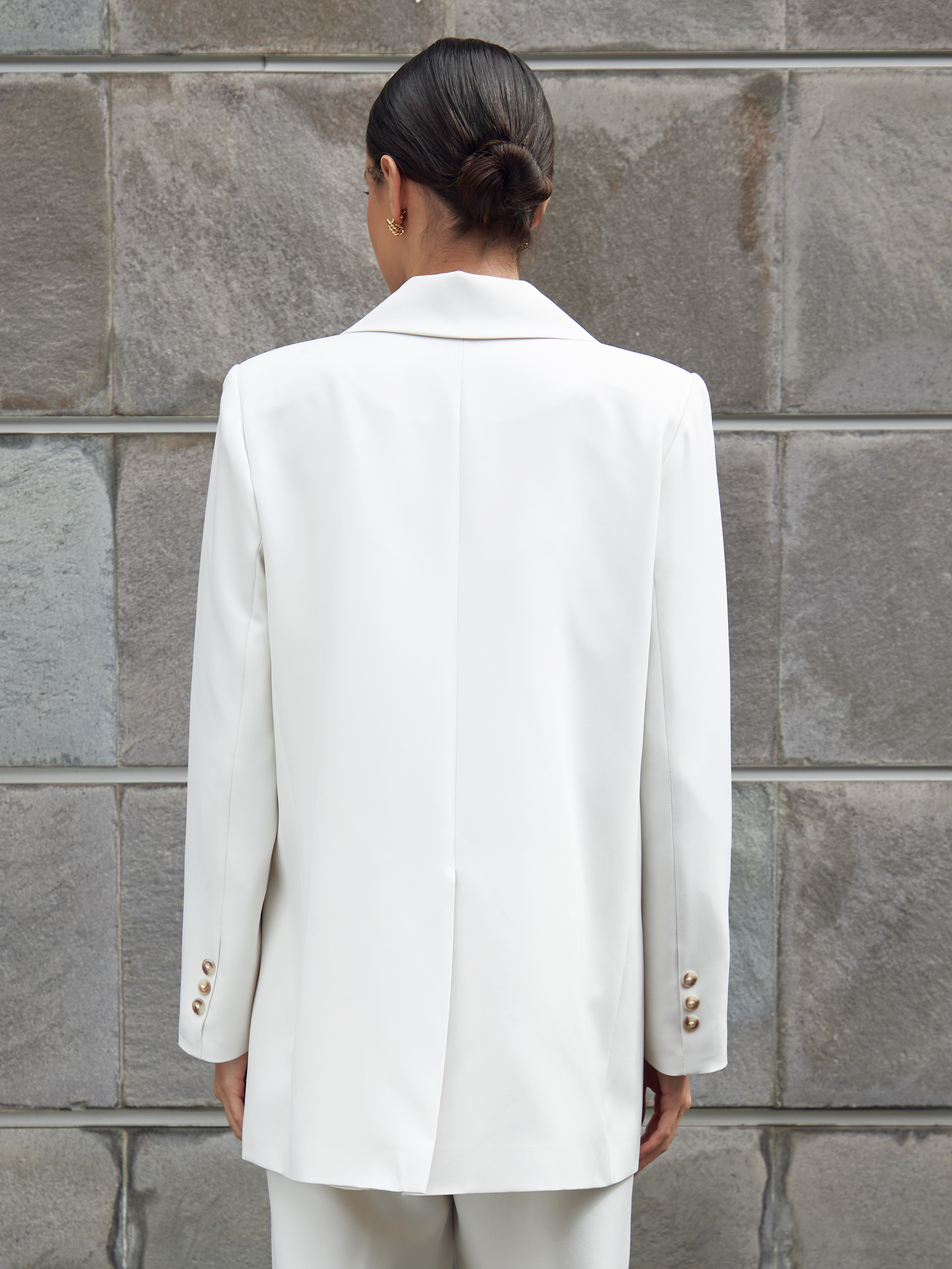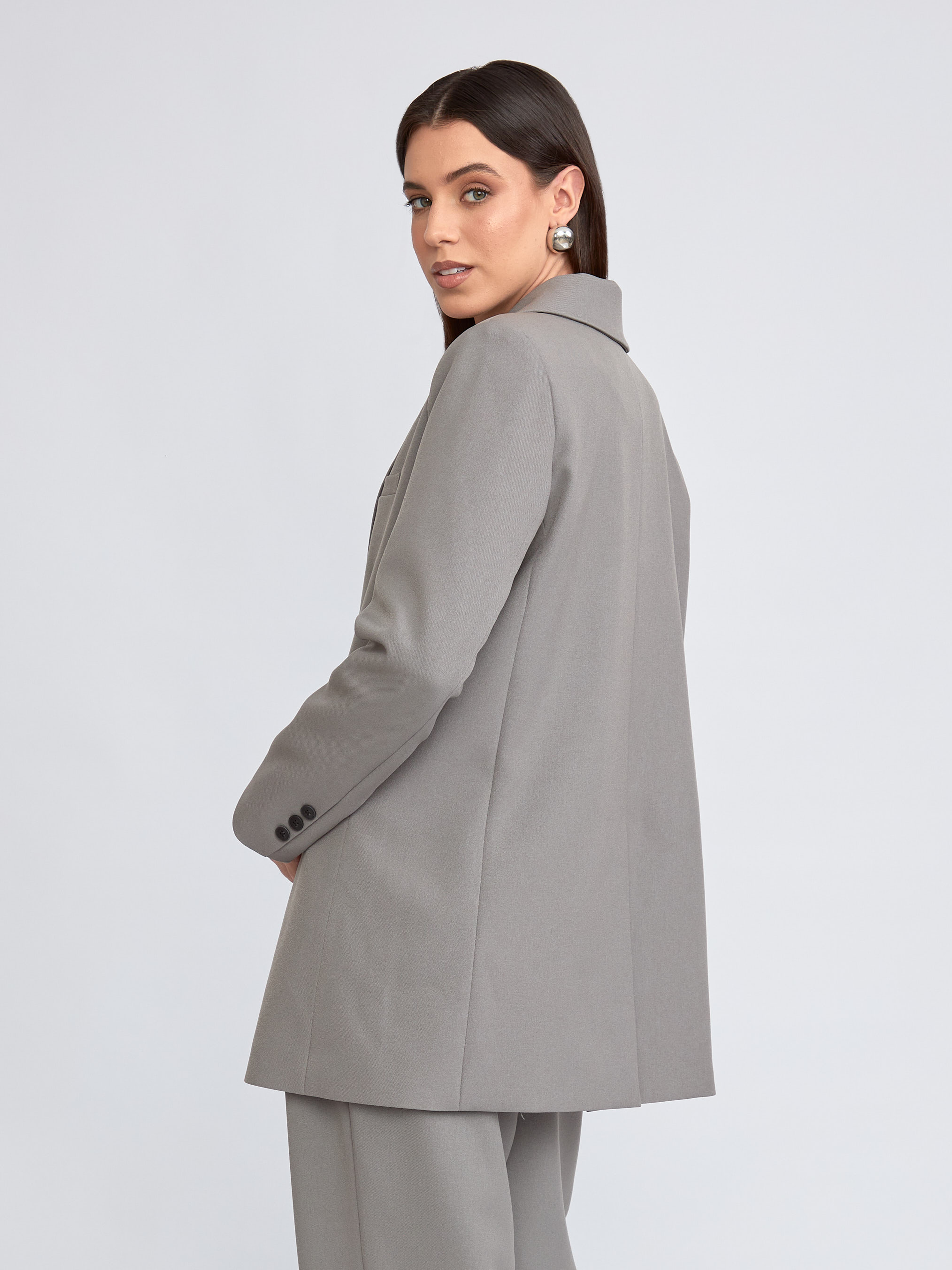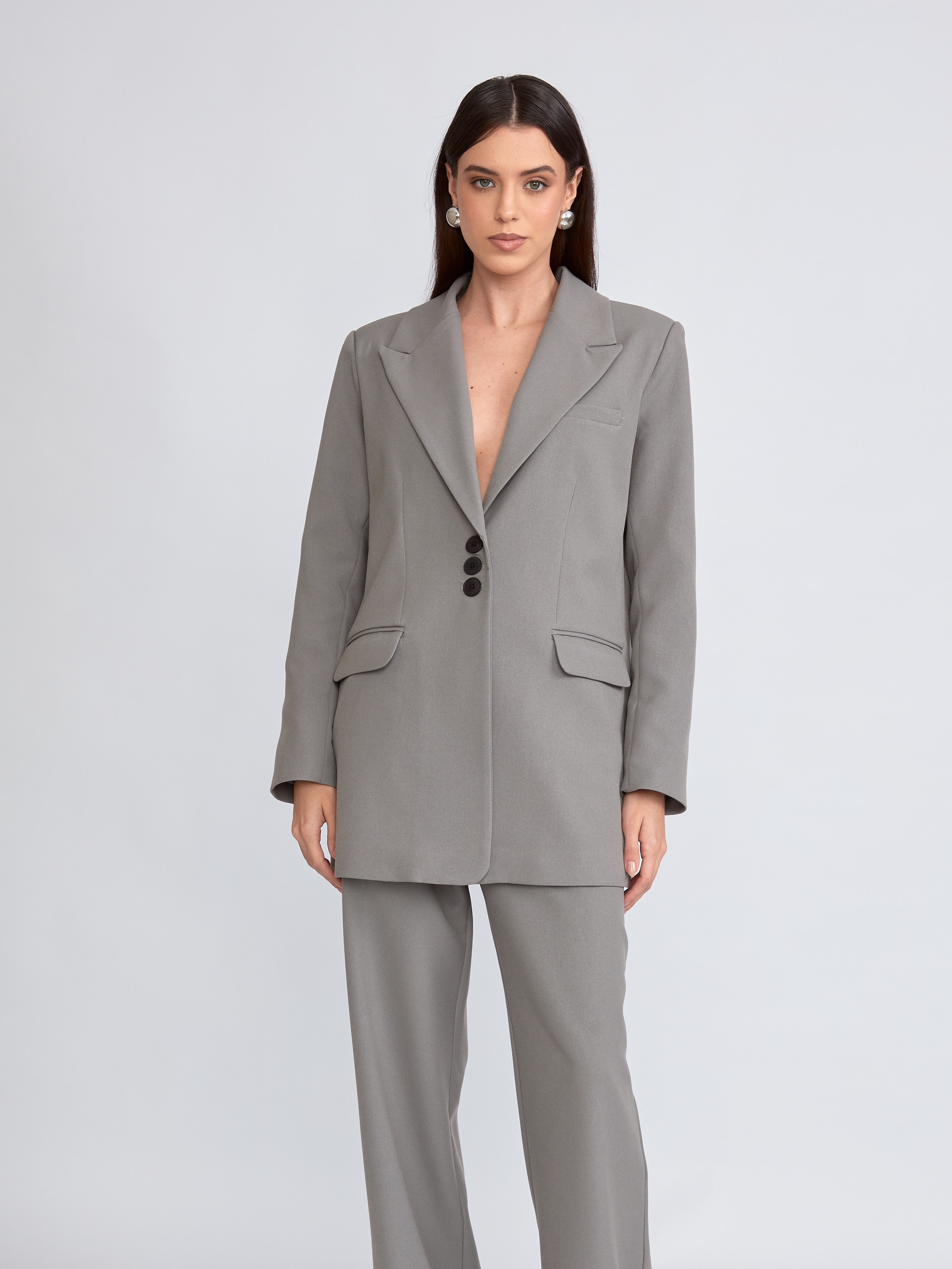 Blazer oversize con solapas y tres botones delanteros. Bolsillos con solapas adelante, botones decorativos en los puños. Abertura detrás. Con forro.