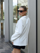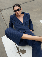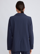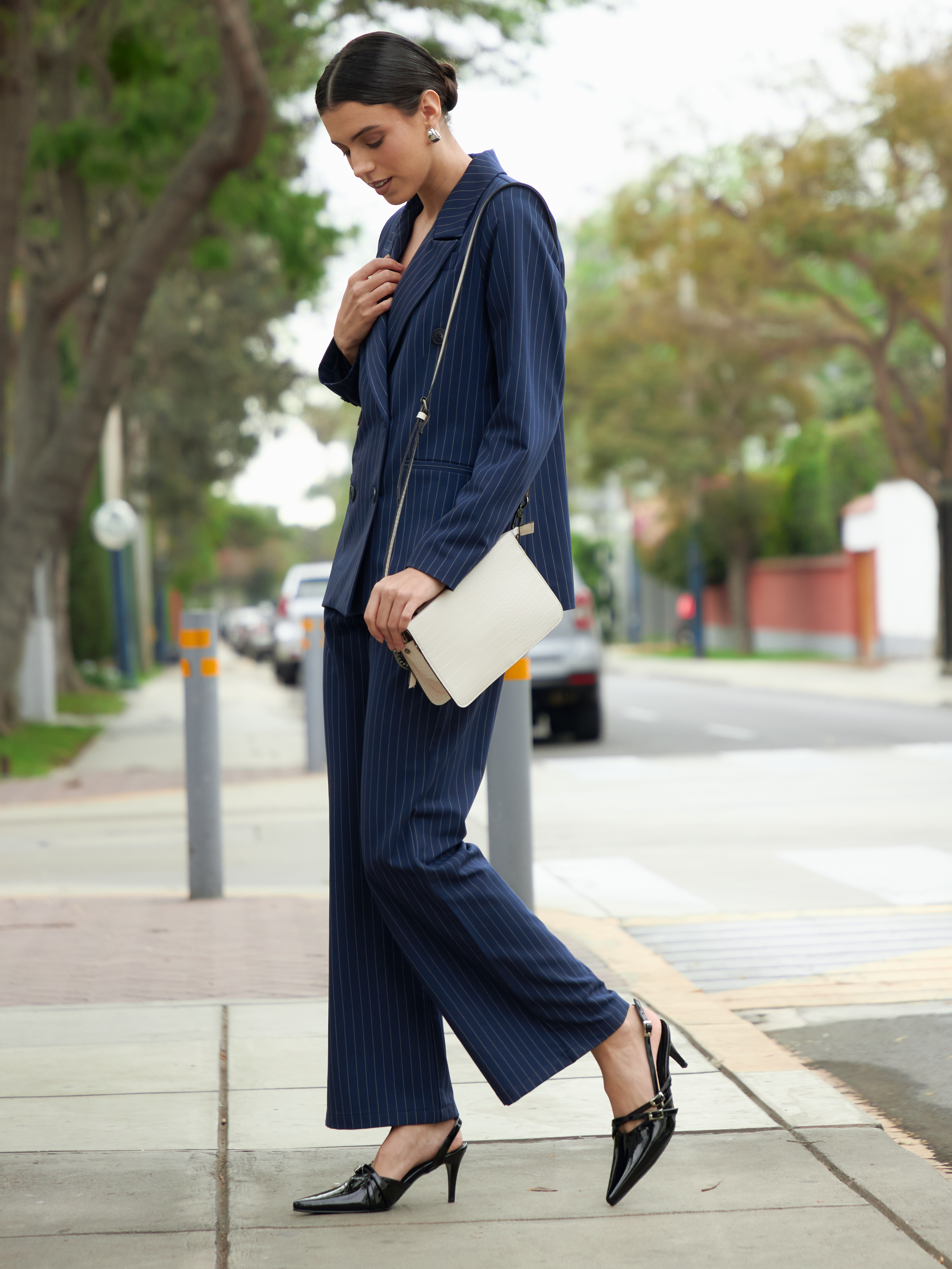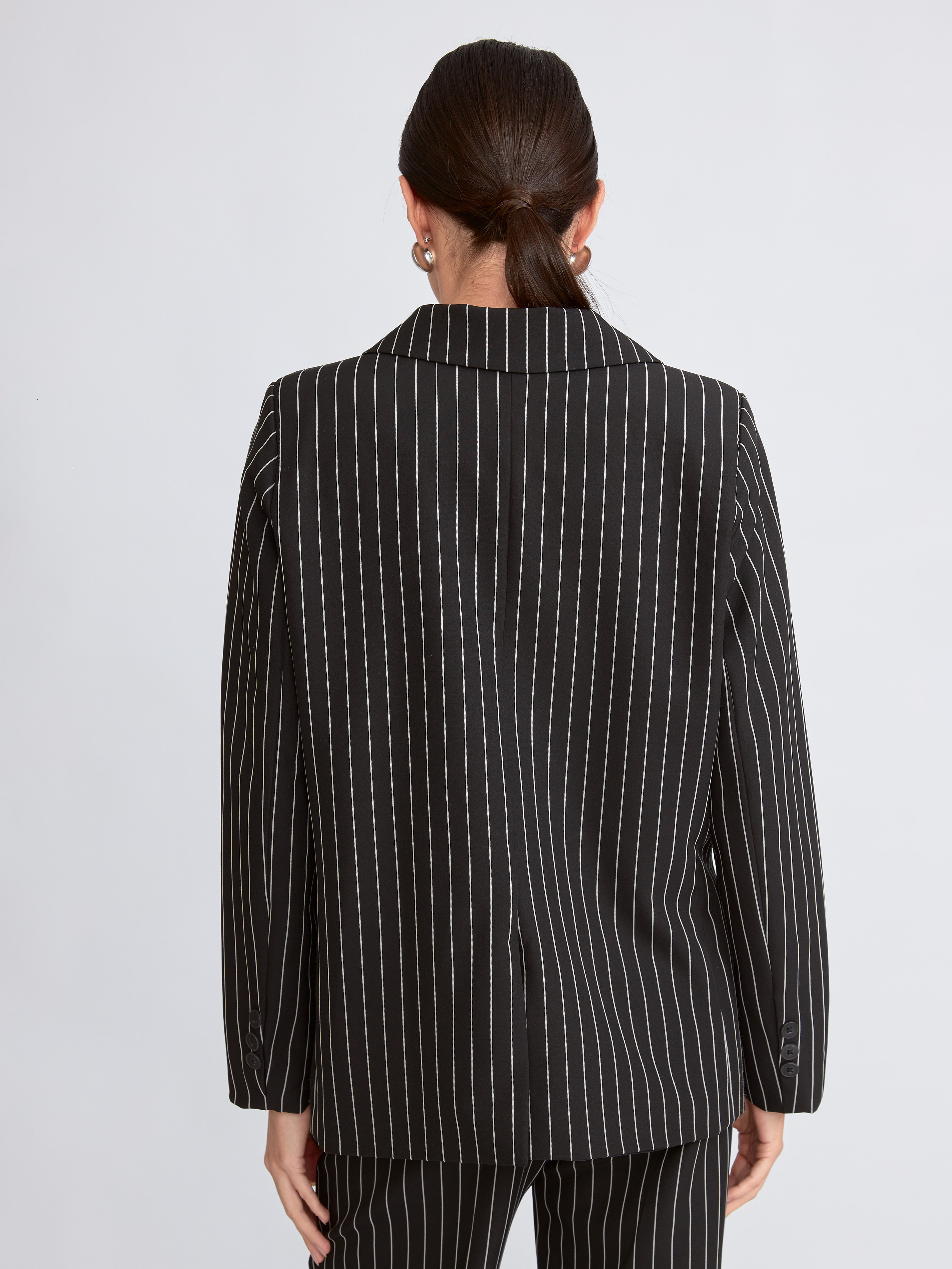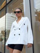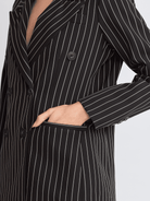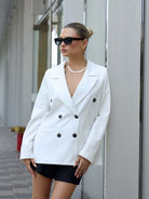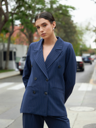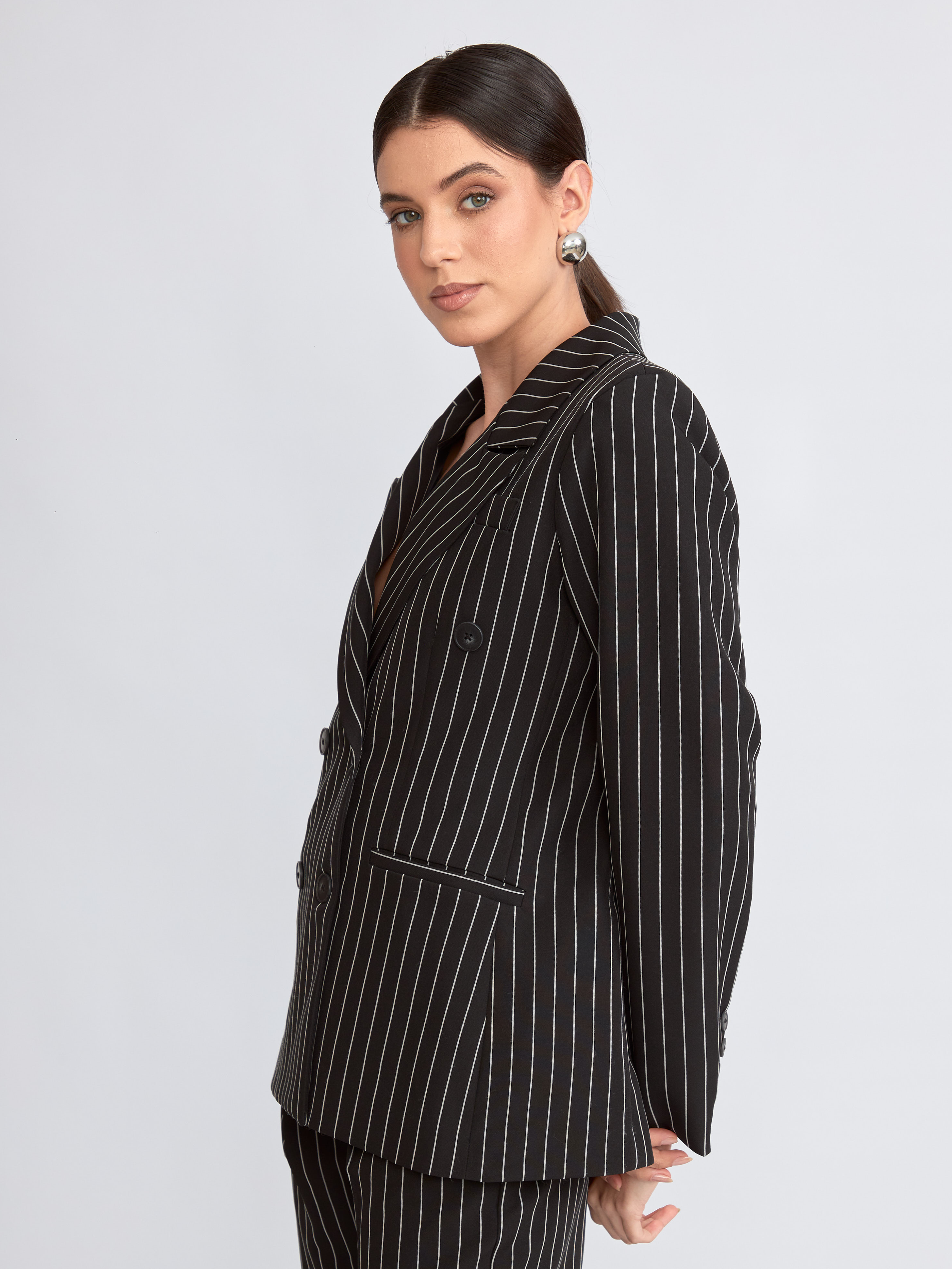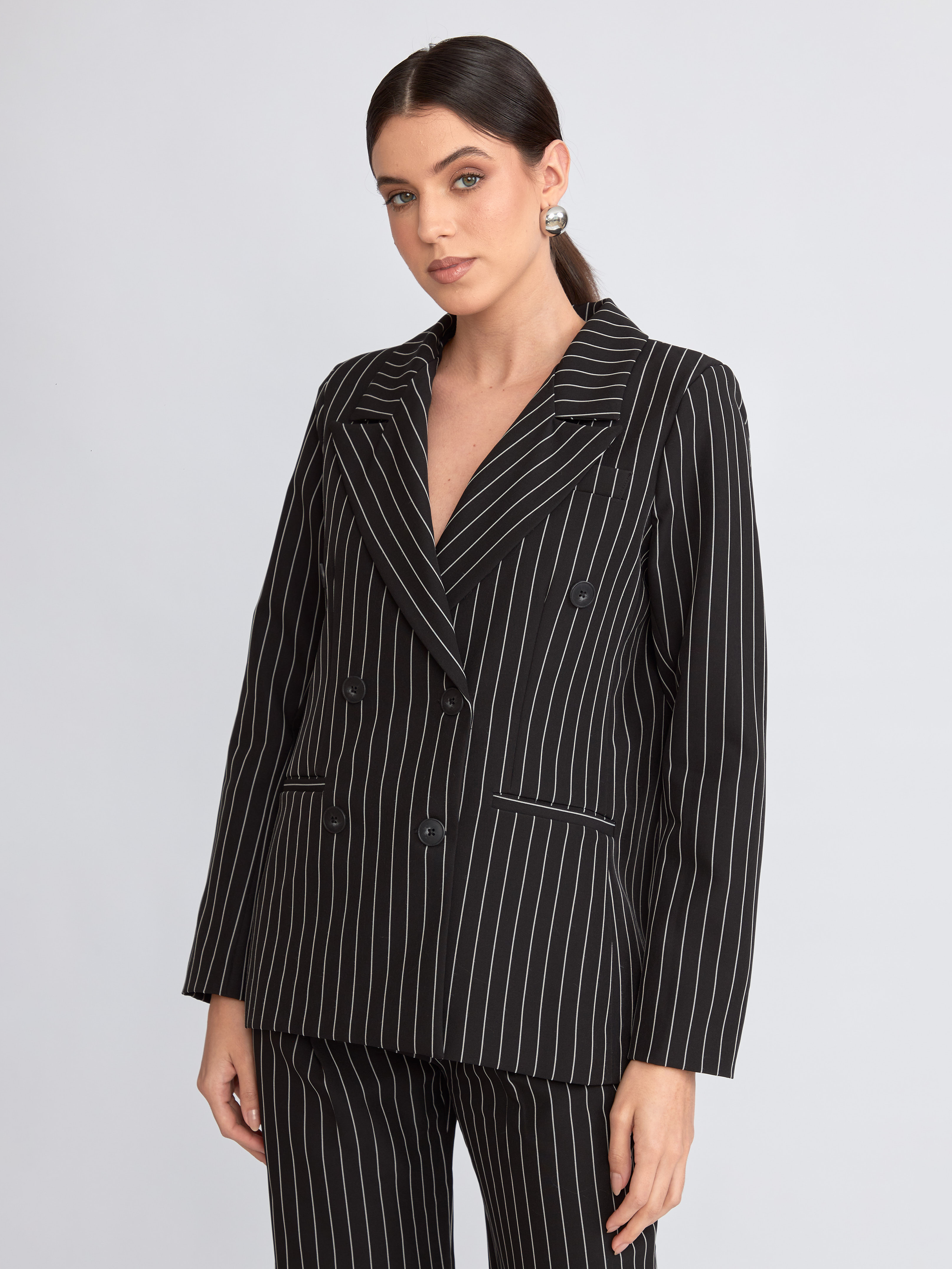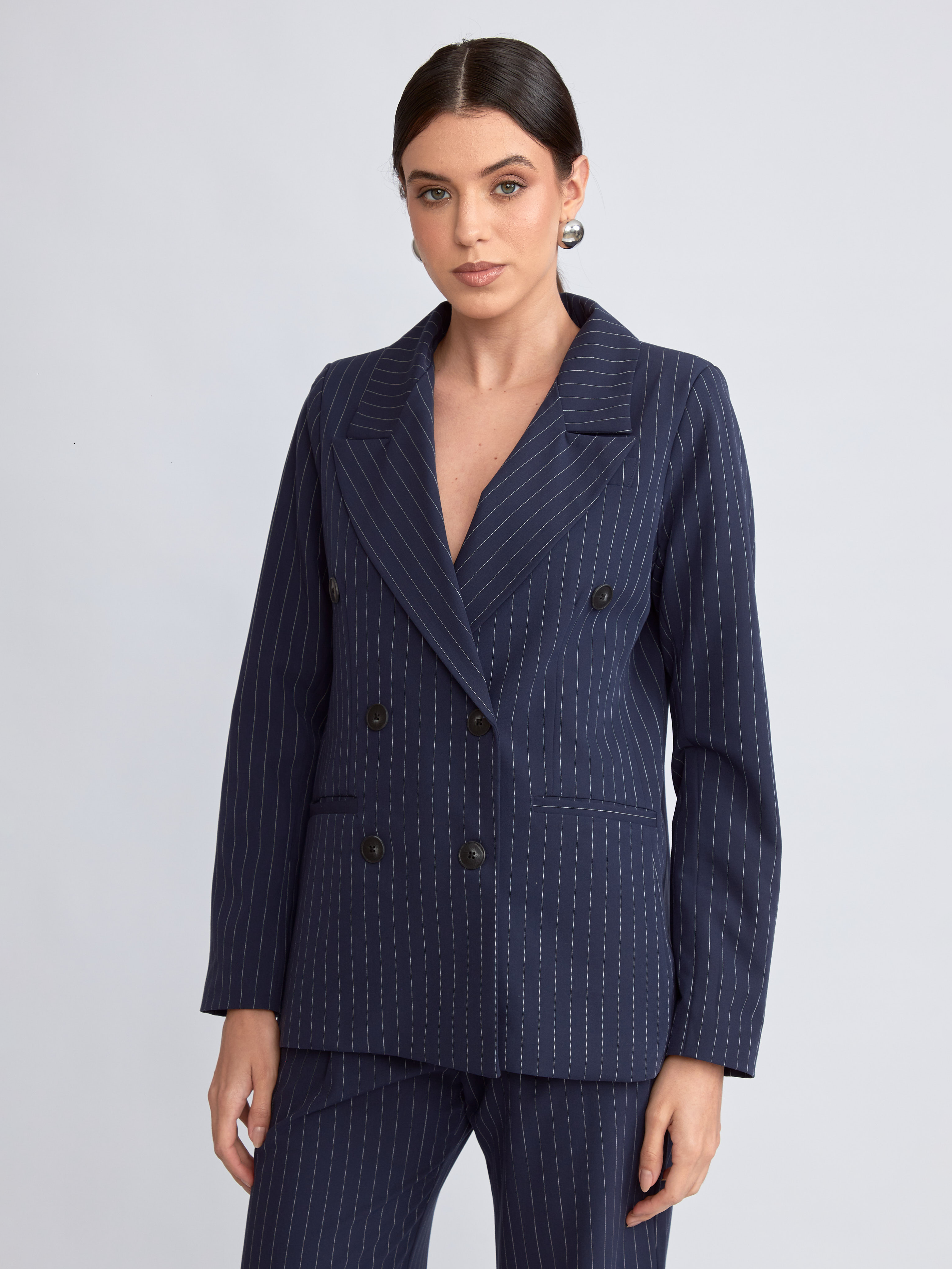 Blazer cruzado de doble botonadura, botones negros y bolsillos decorativos adelante. Corte ceñido. Con forro.
