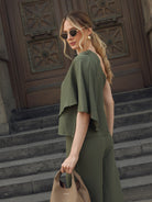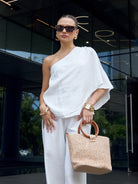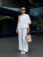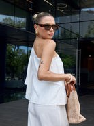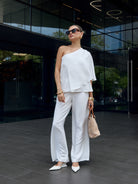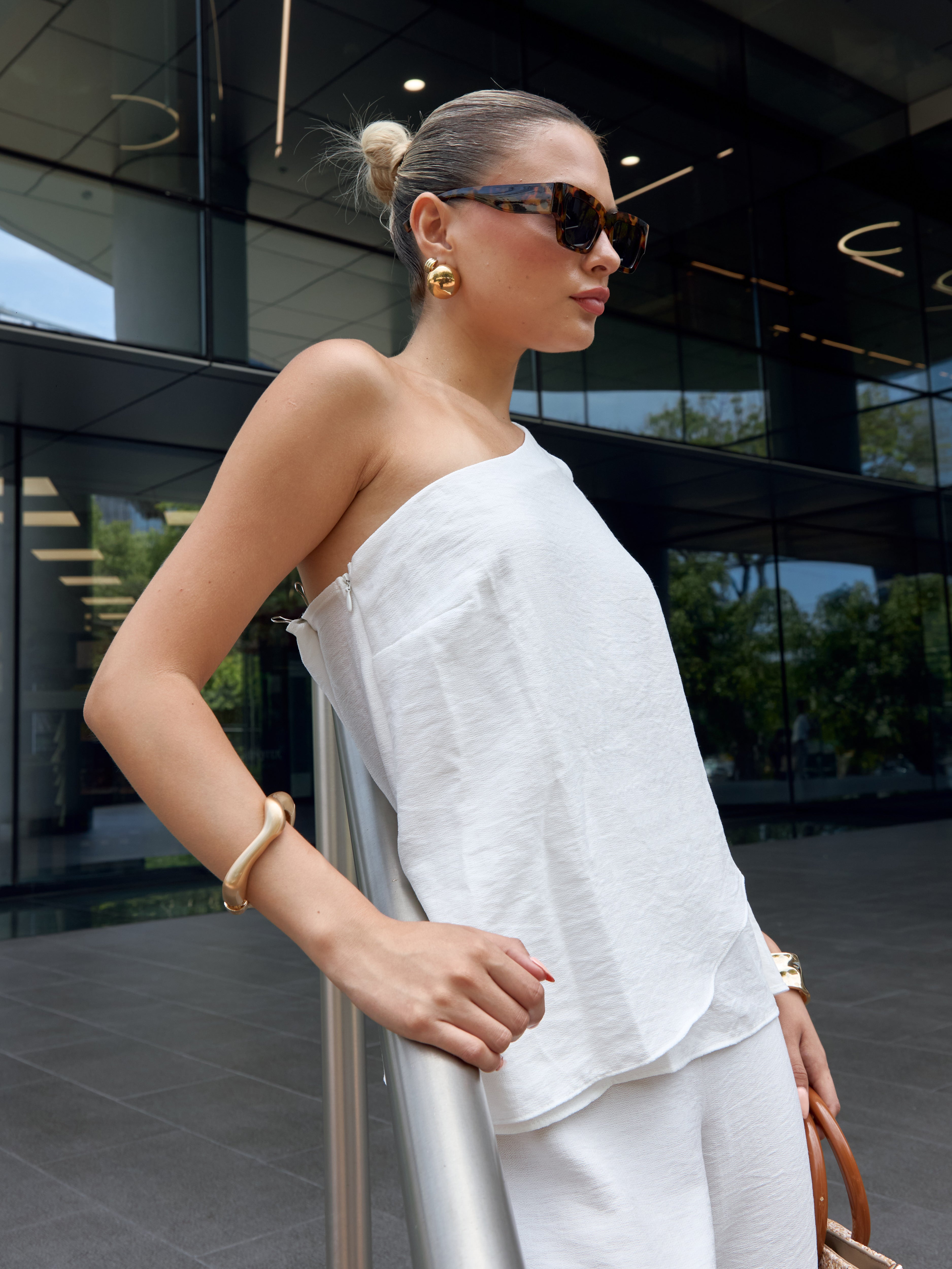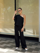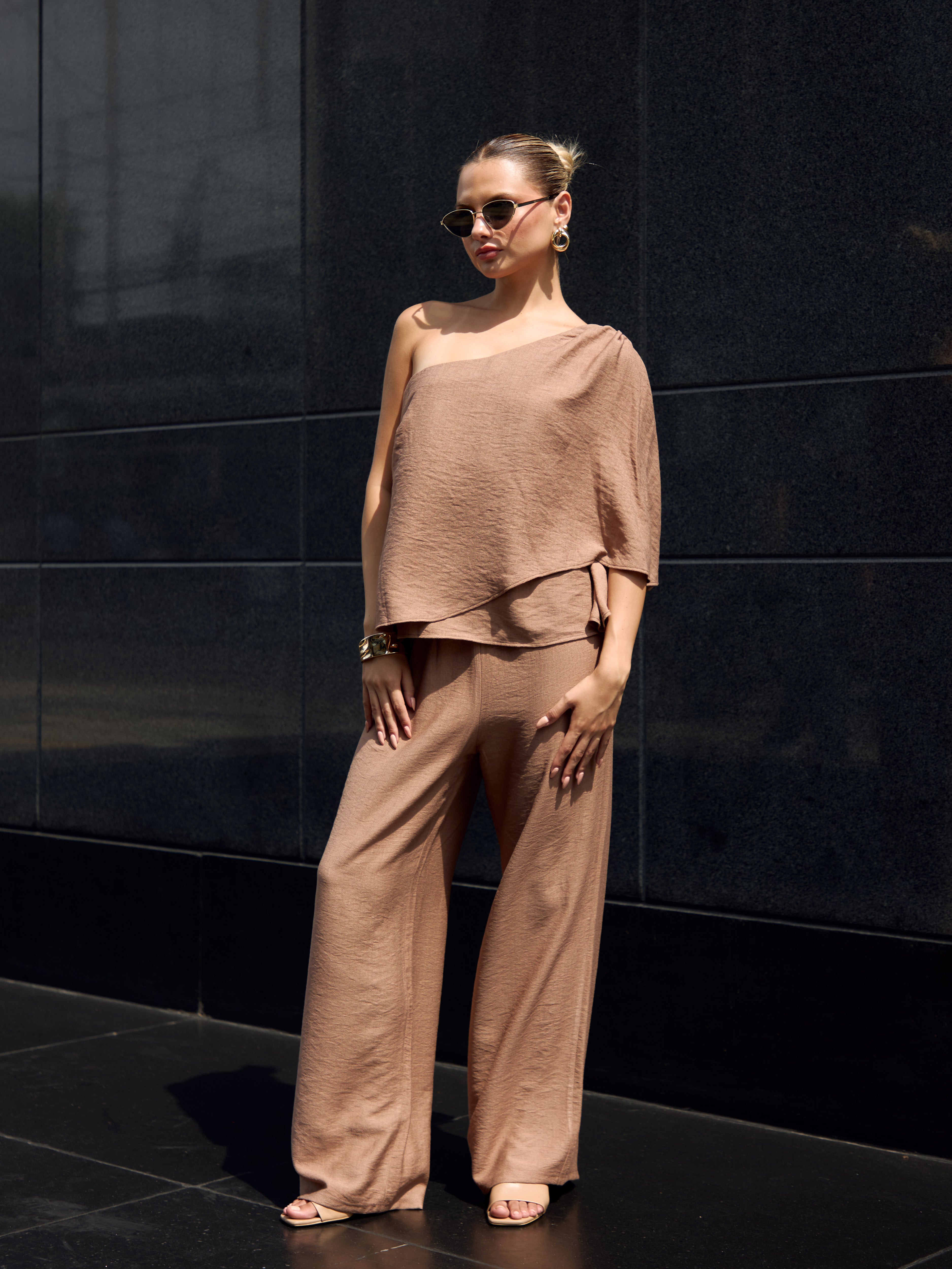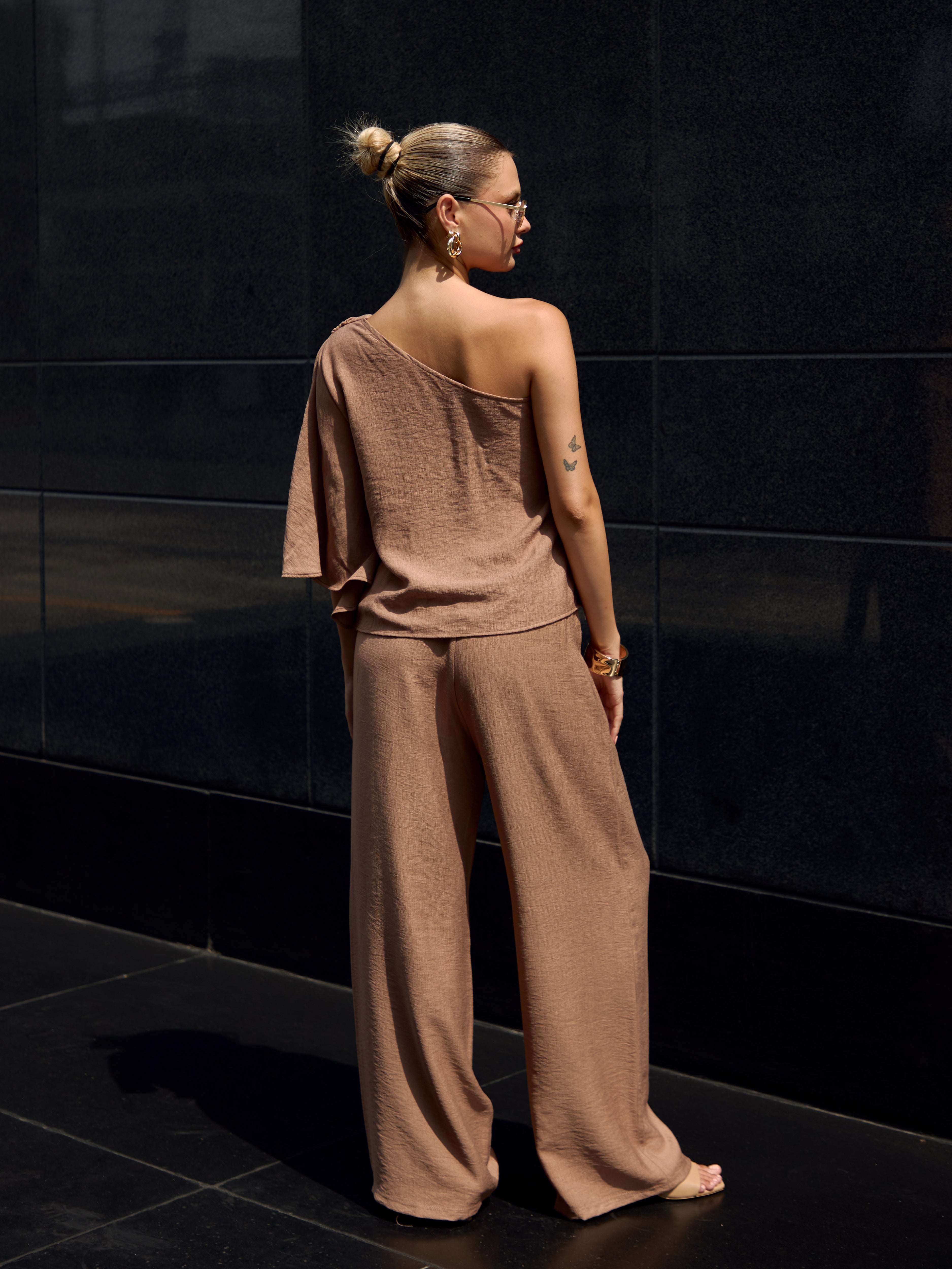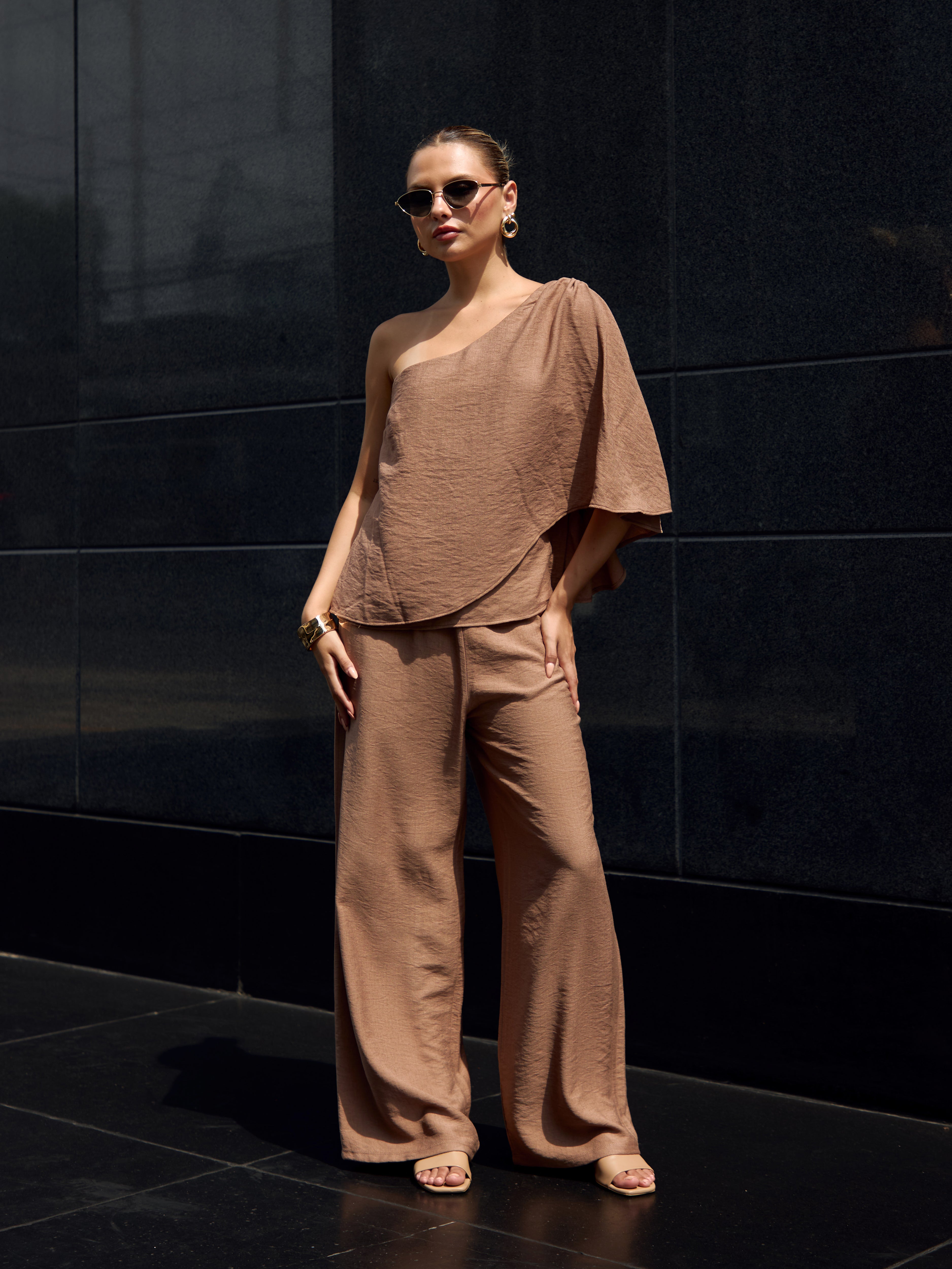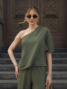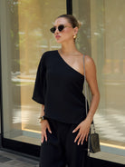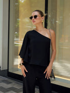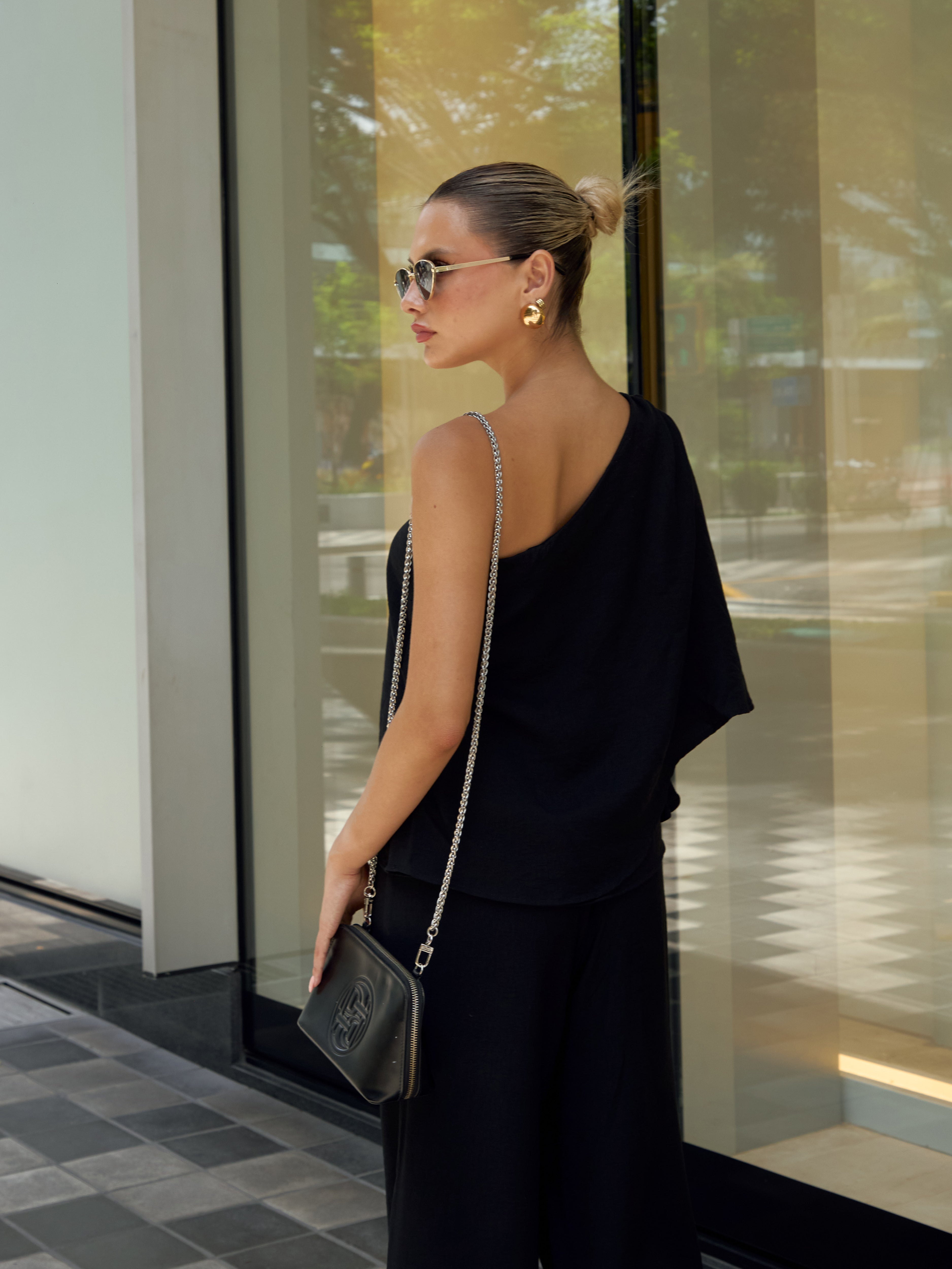 Blusa de un solo hombro con diseño sofisticado. Presenta una capa caída que aporta movimiento y elegancia, junto con una silueta asimétrica y cierre lateral que asegura un ajuste preciso.