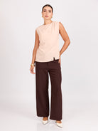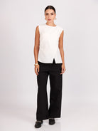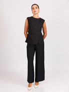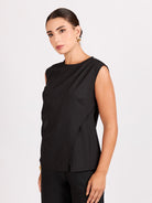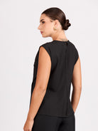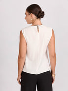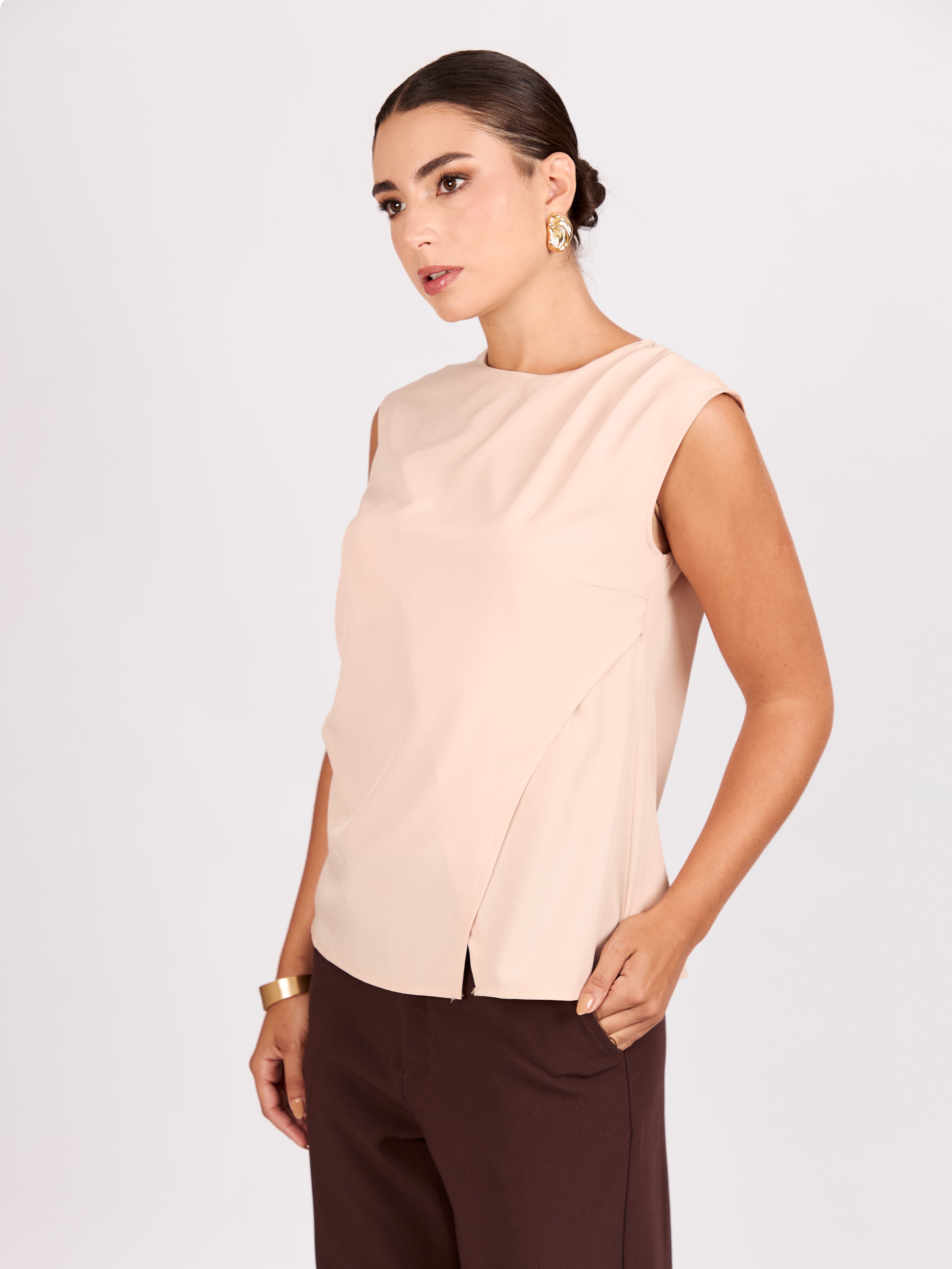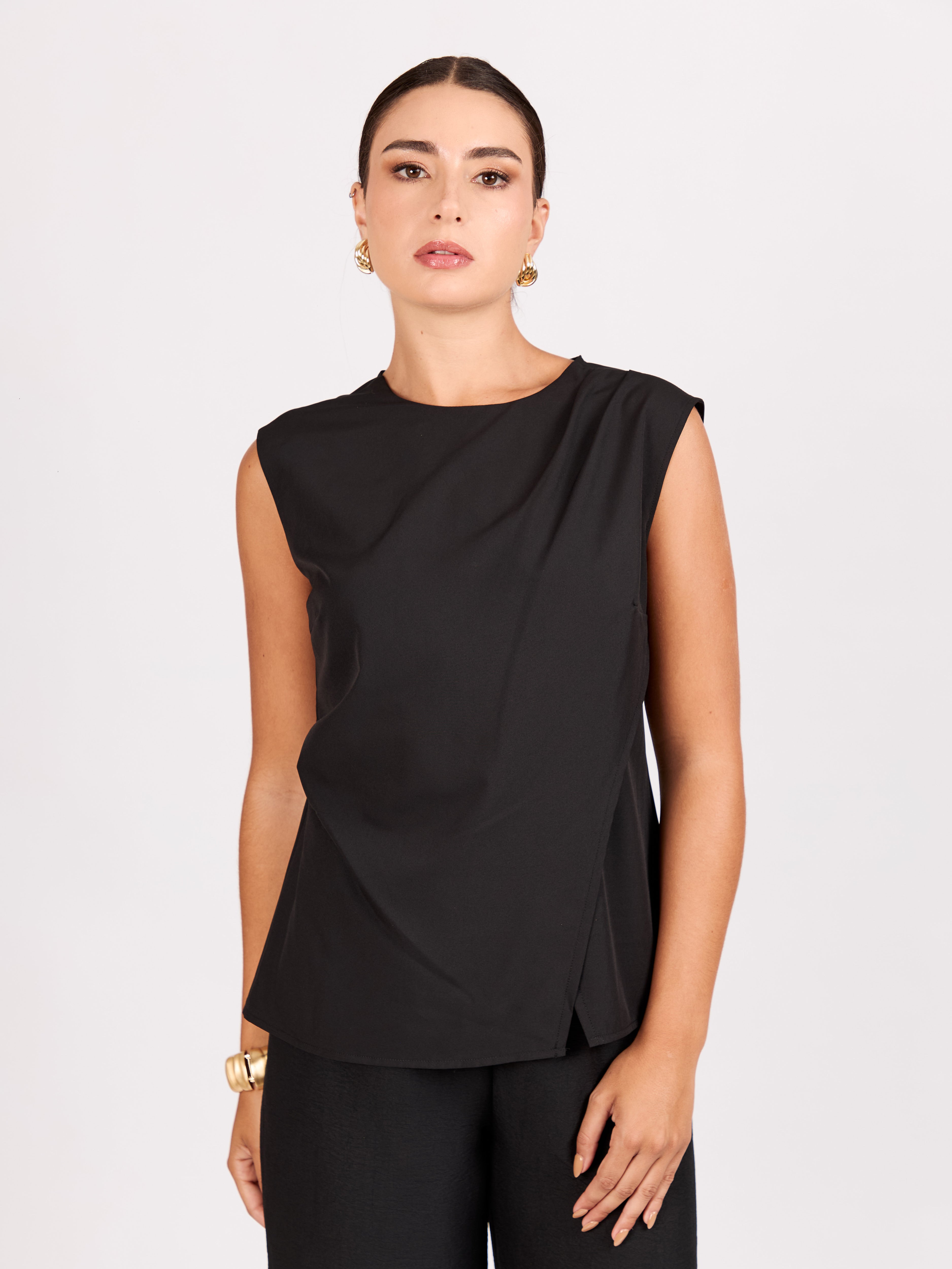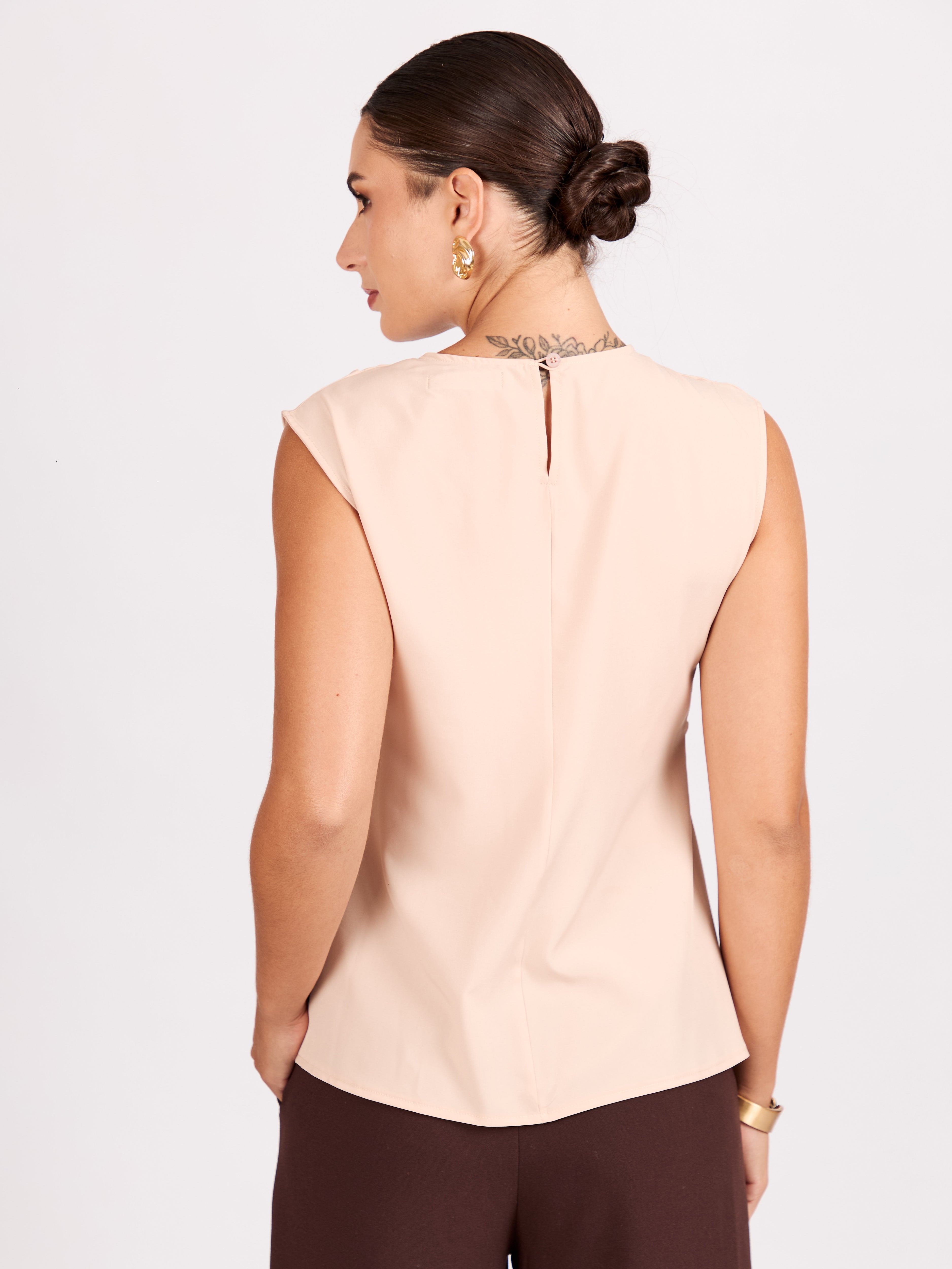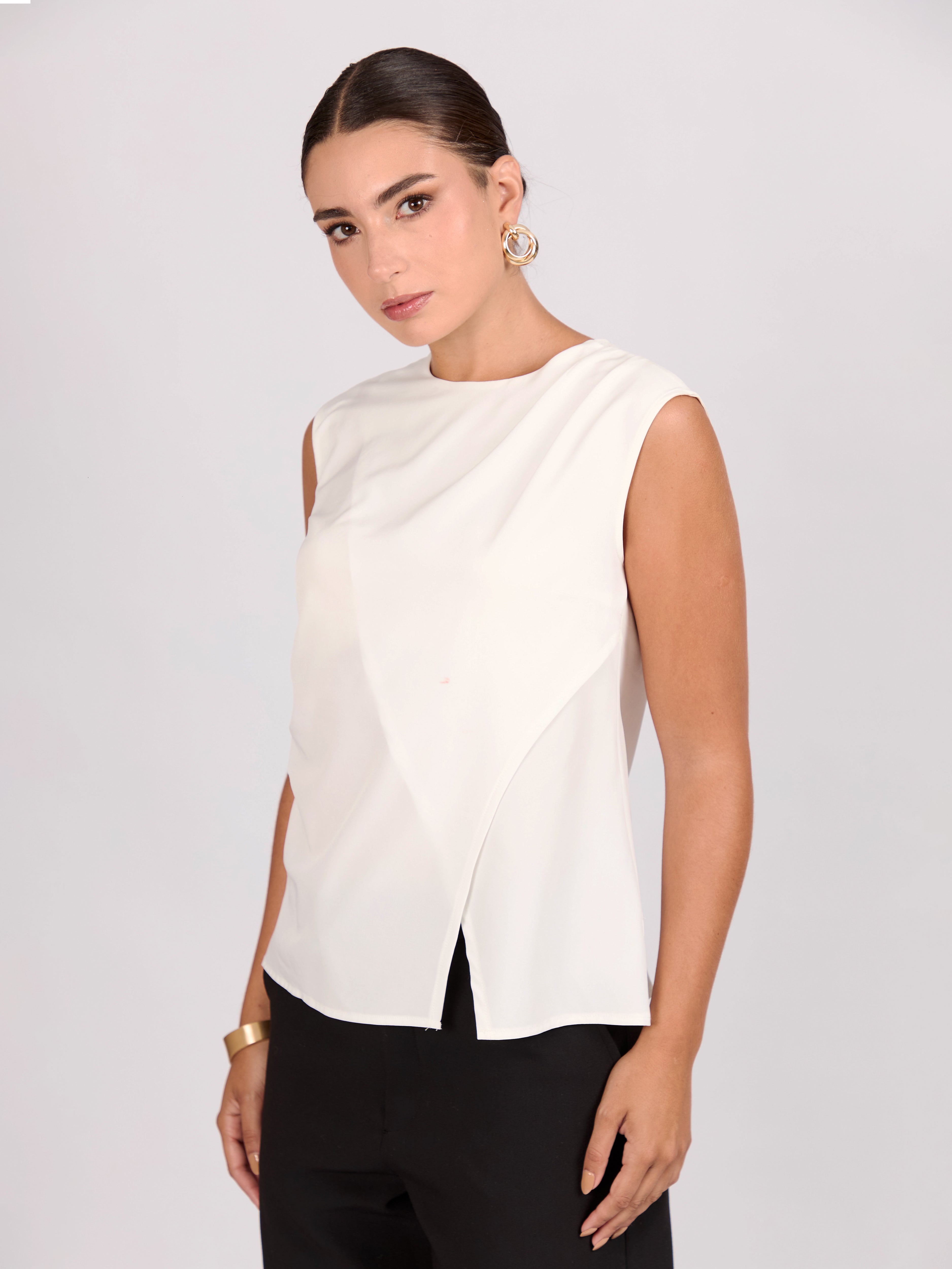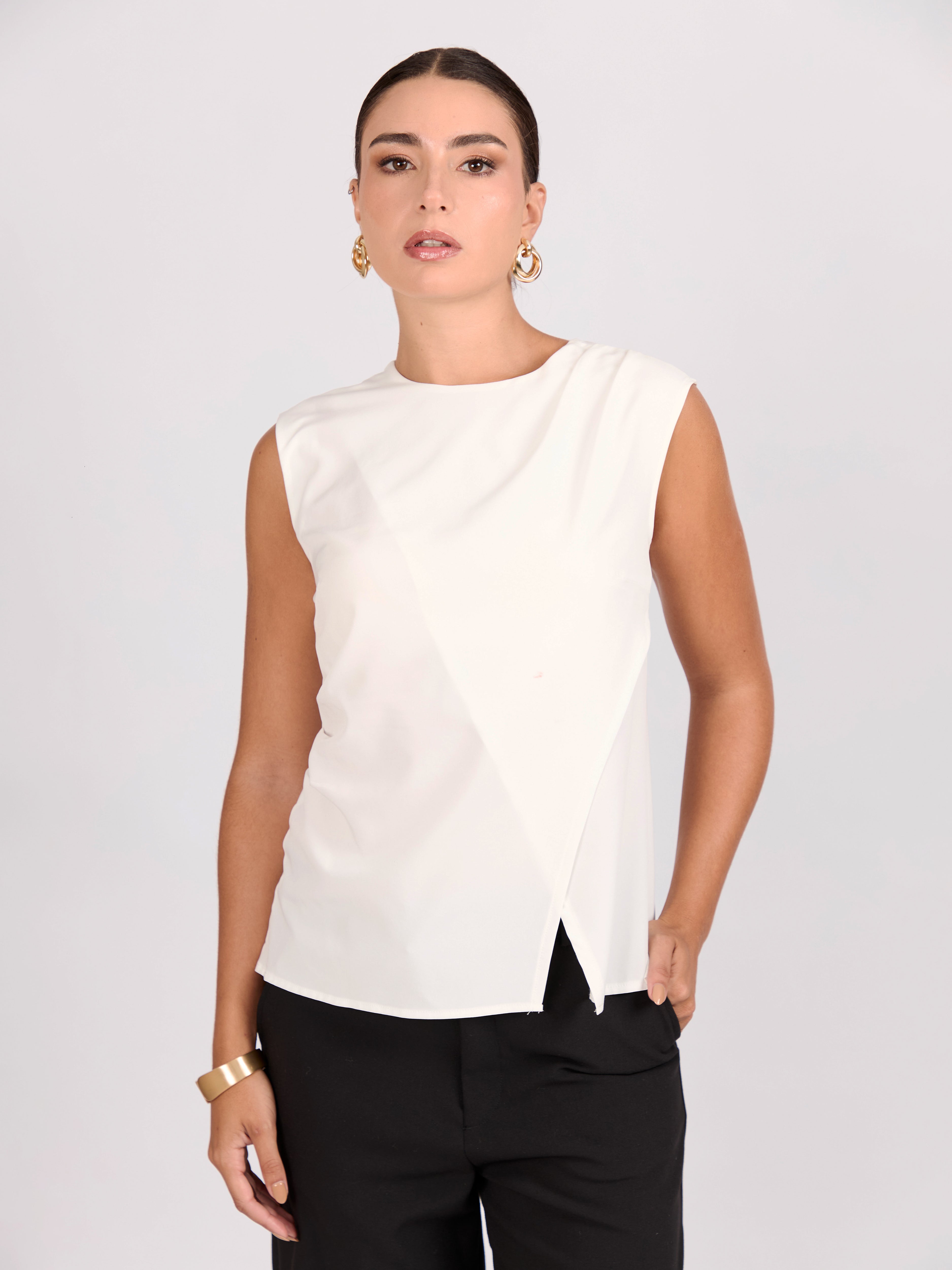 Blusa de manga cero con un diseño moderno y estructurado, con cuello redondo y detalle de cruce en el frente que estiliza la figura, creando un ajuste favorecedor. En la parte posterior, una apertura en forma de gota con cierre de botón.