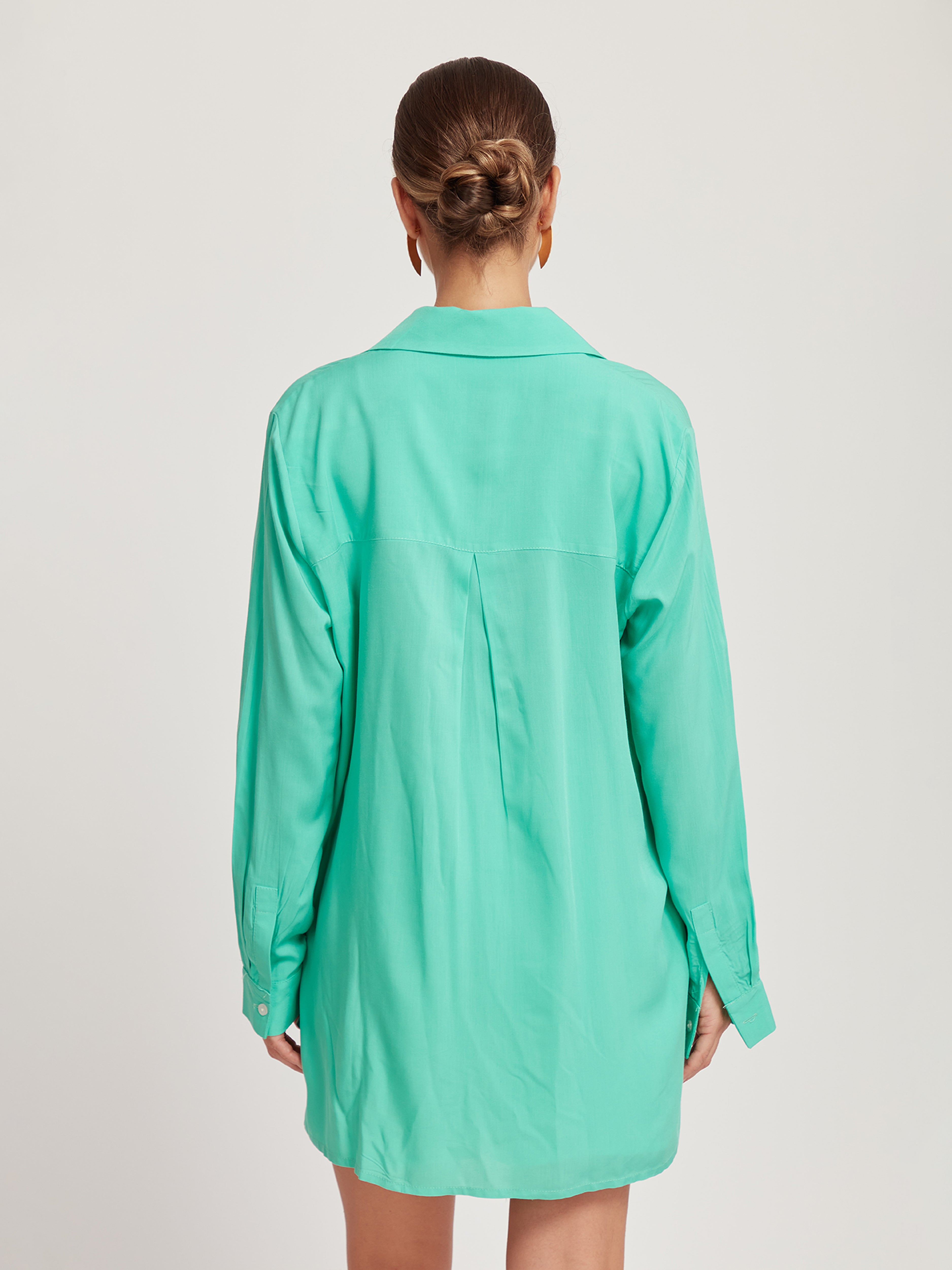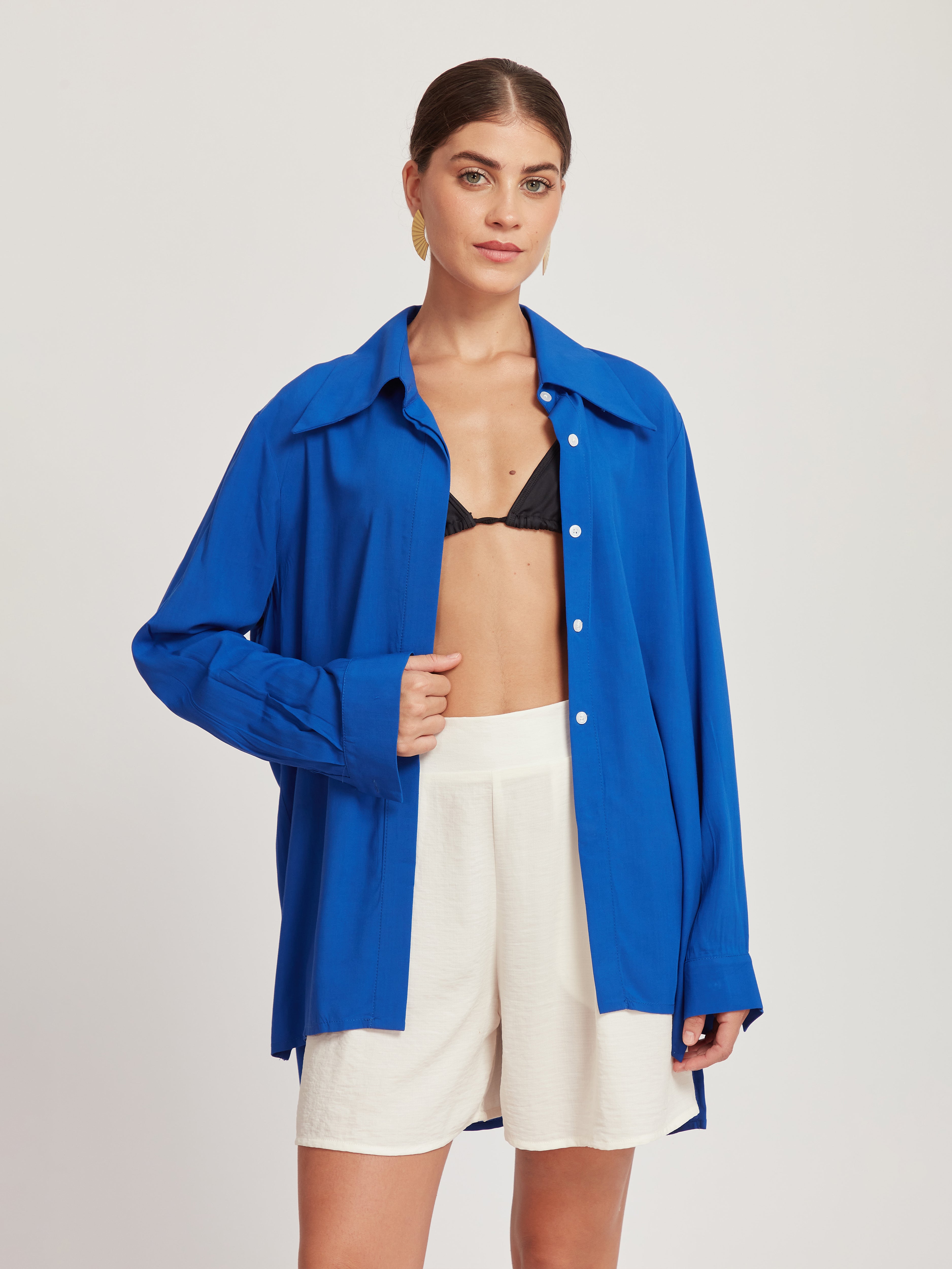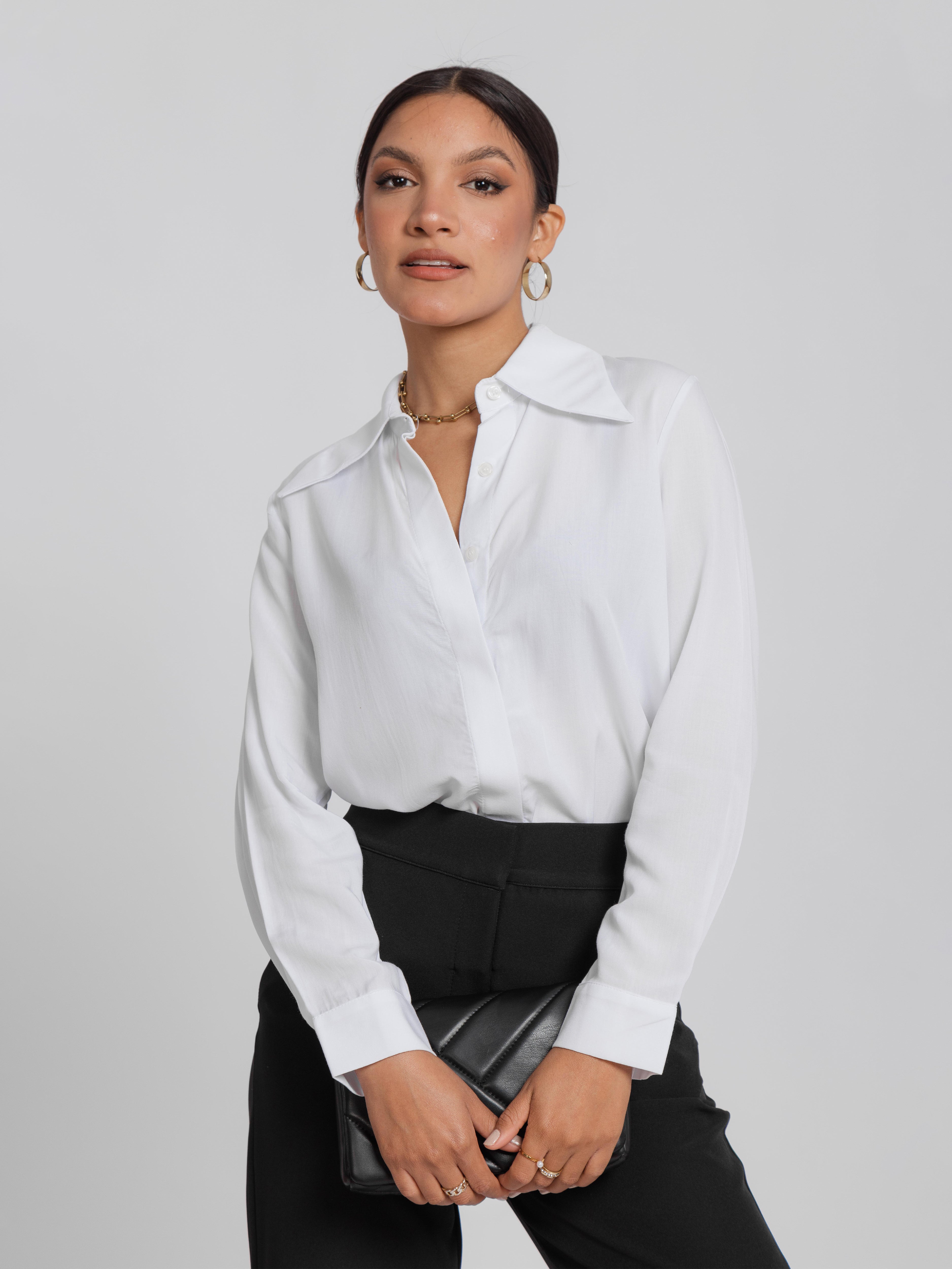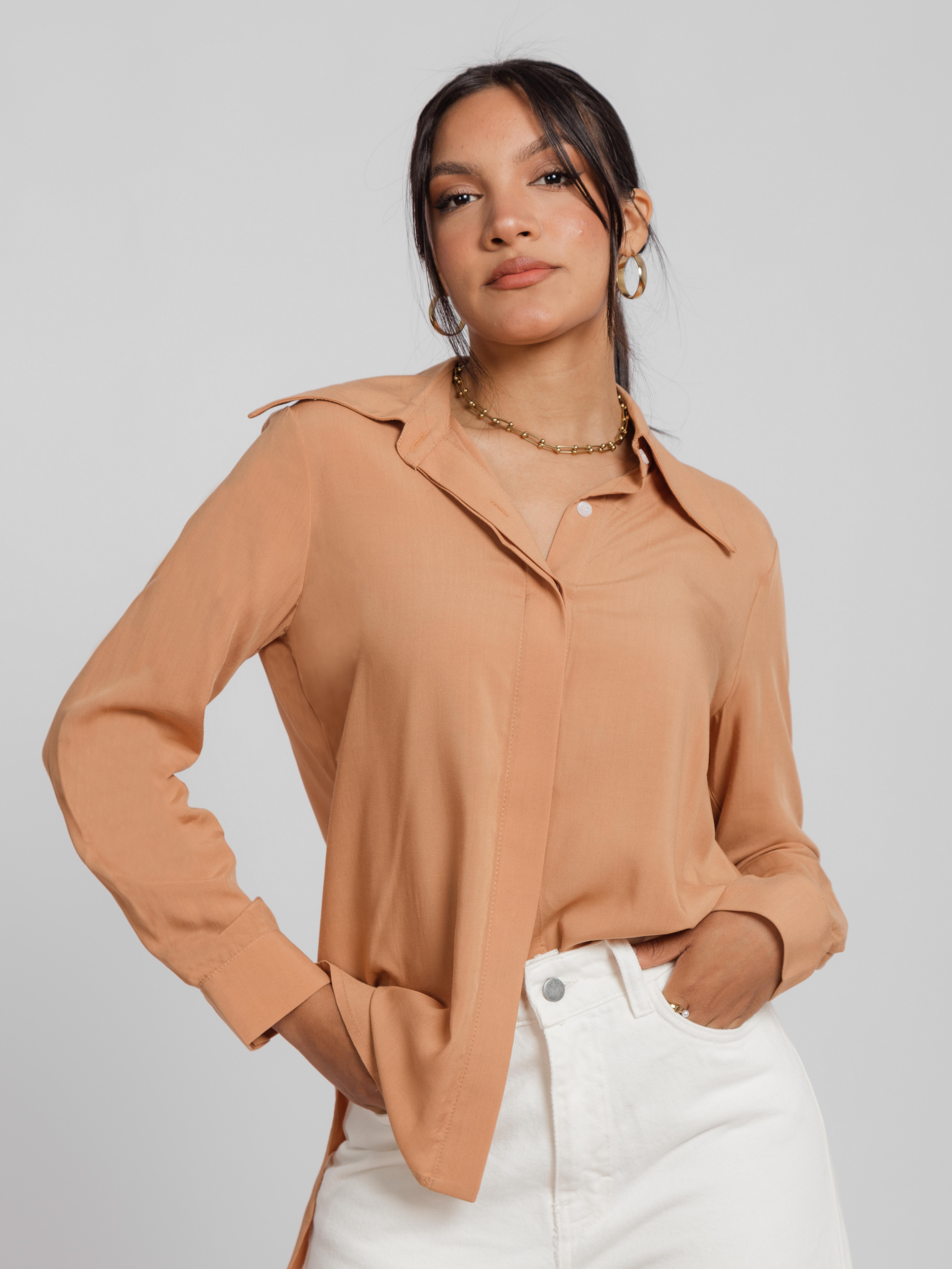 Camisa con botones ocultos y parte trasera más larga que la delantera.