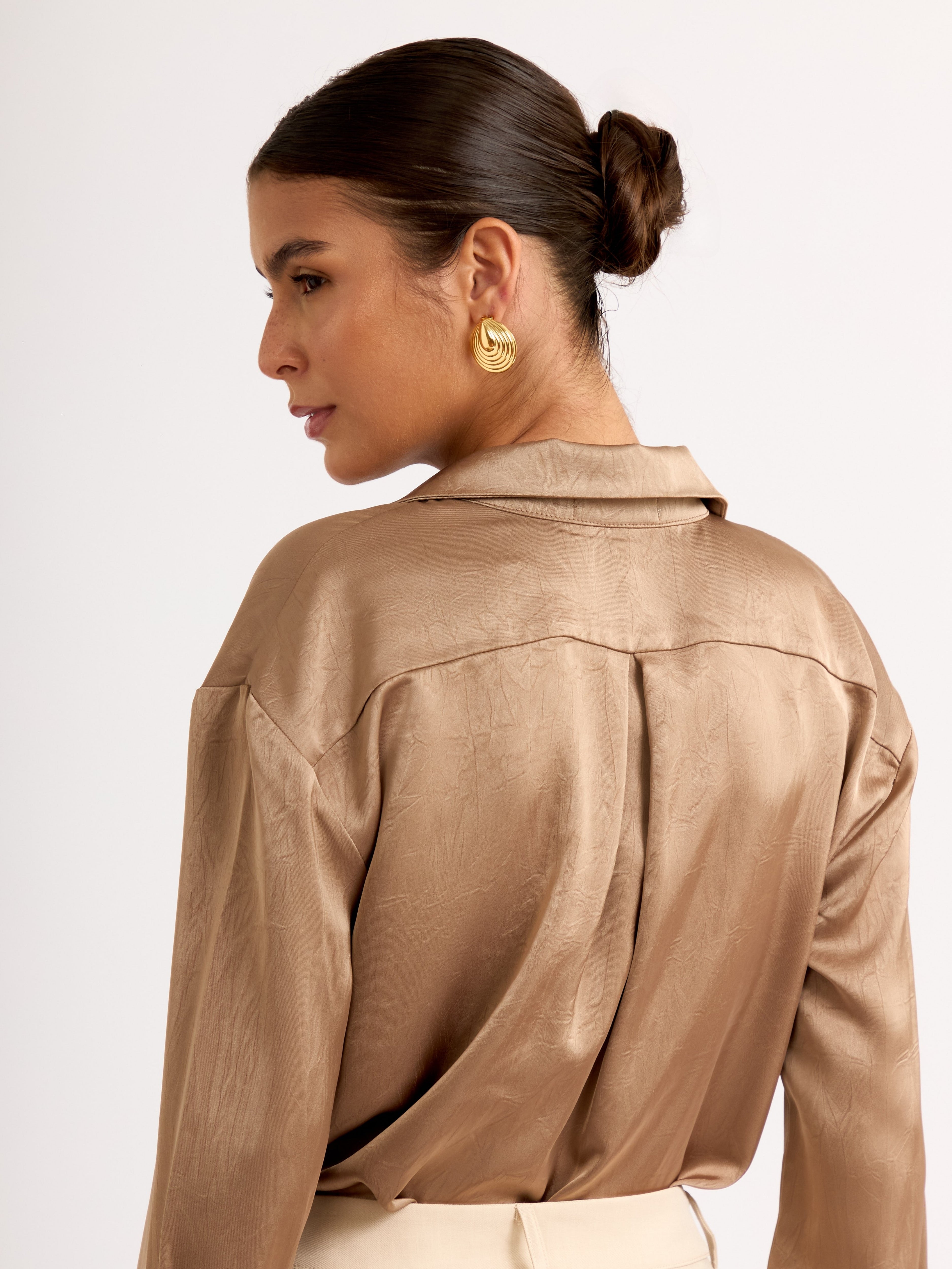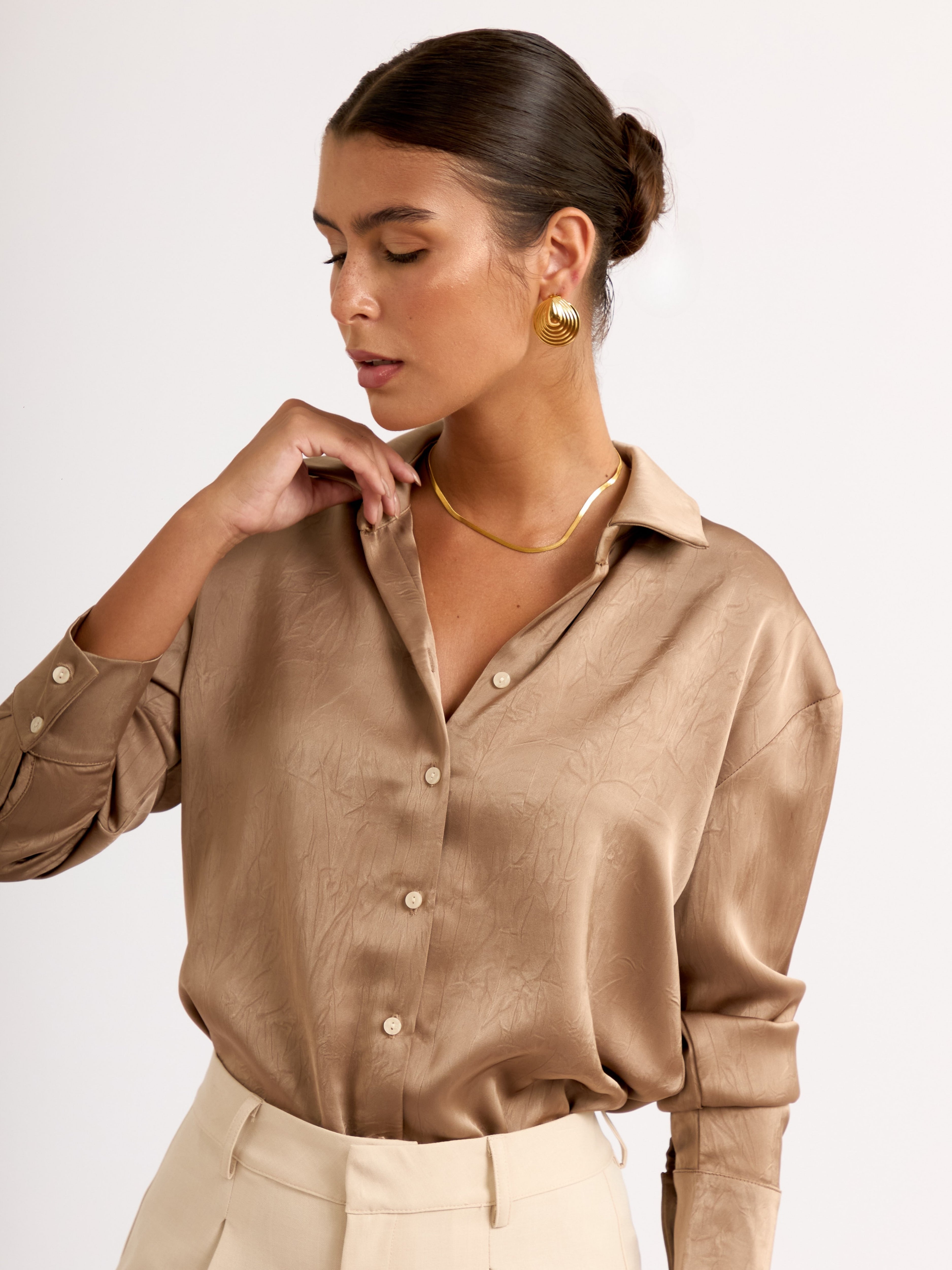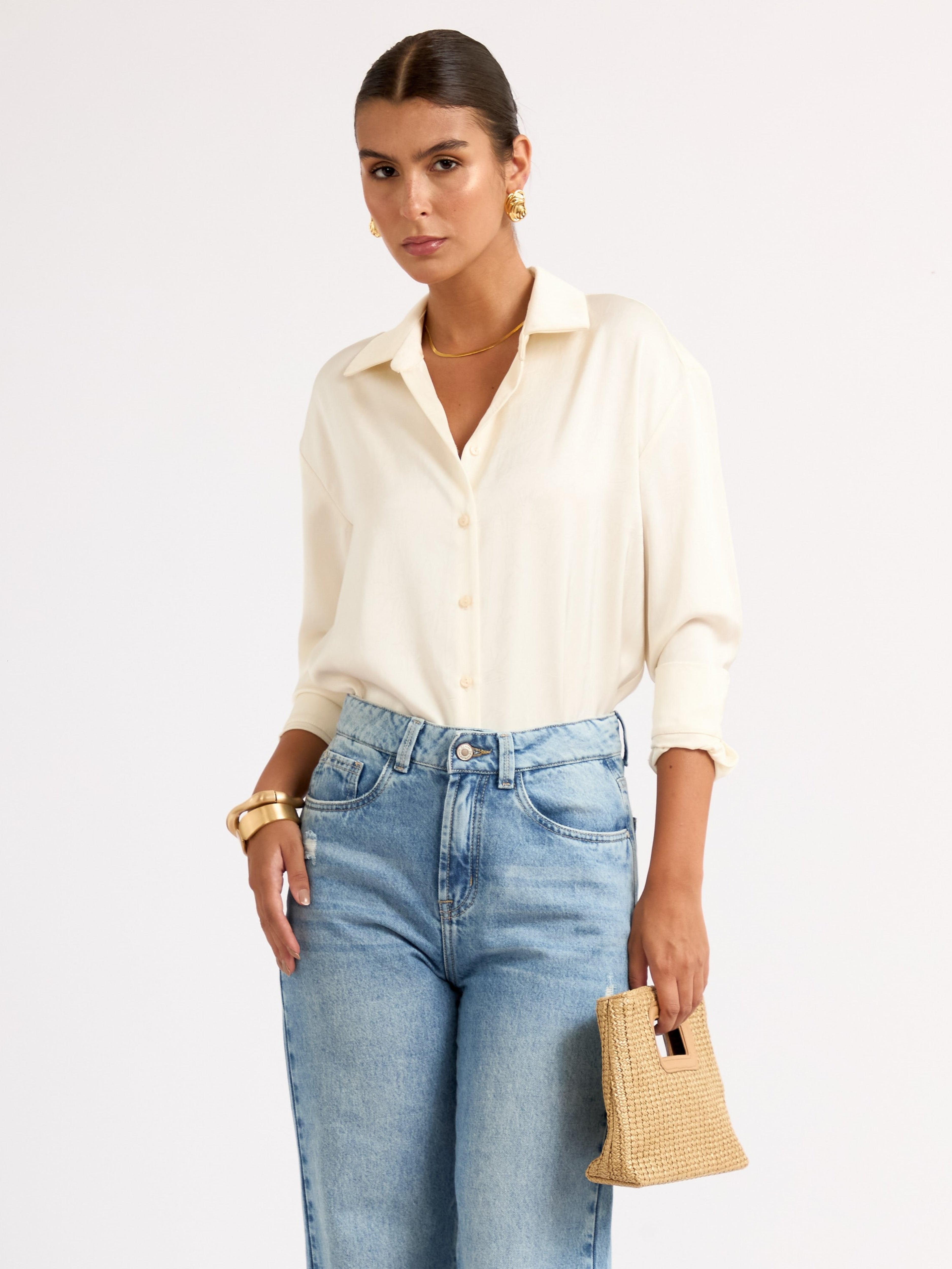 Camisa satinada manga larga con un diseño elegante y fluido. Cuello en V amplio y abierto; y botones de nácar de diseño minimalista. Perfecta para combinar en atuendos formales o semi-formales.