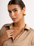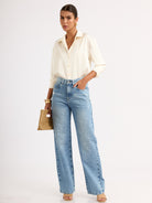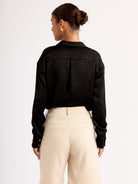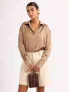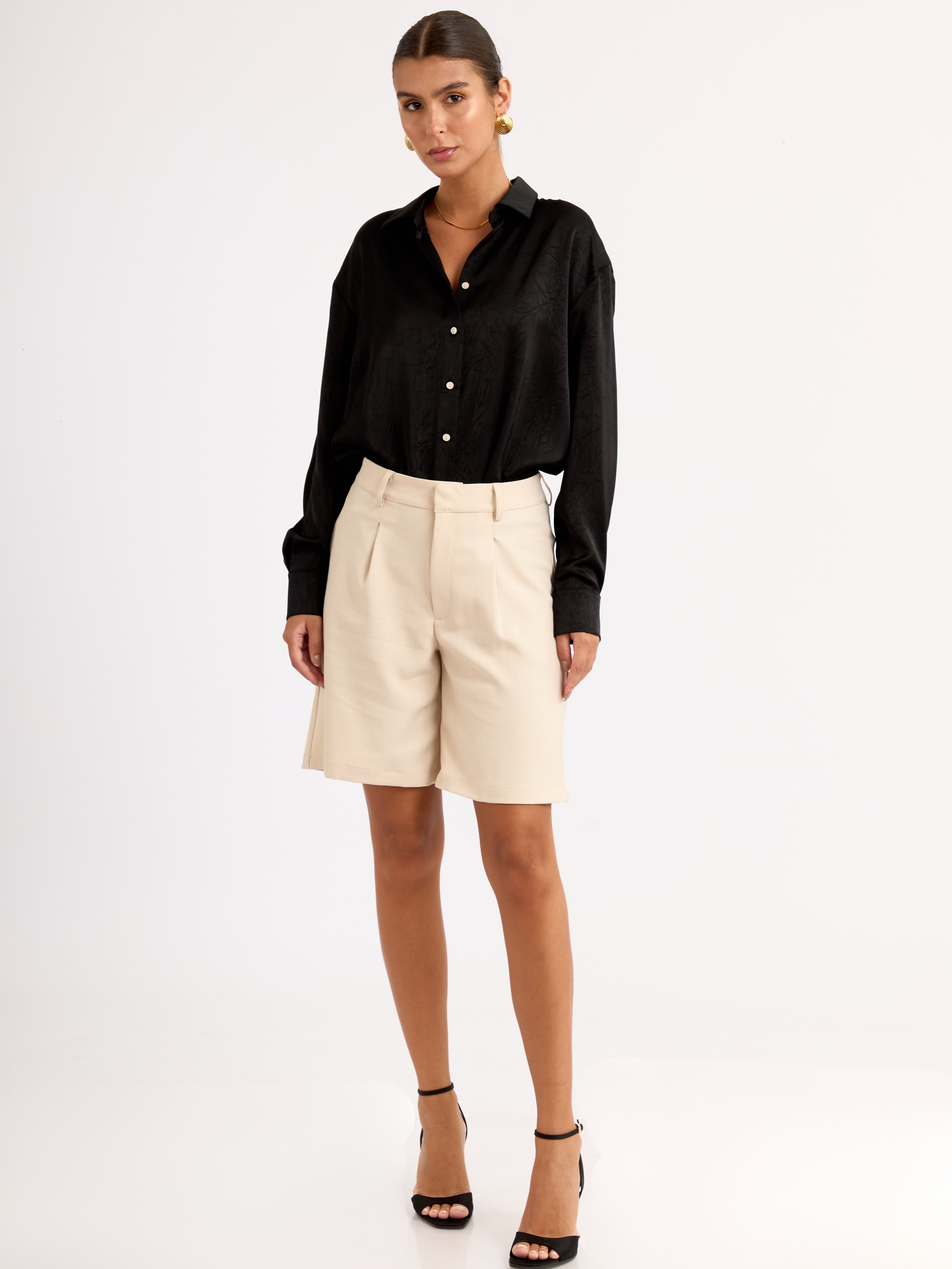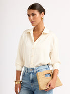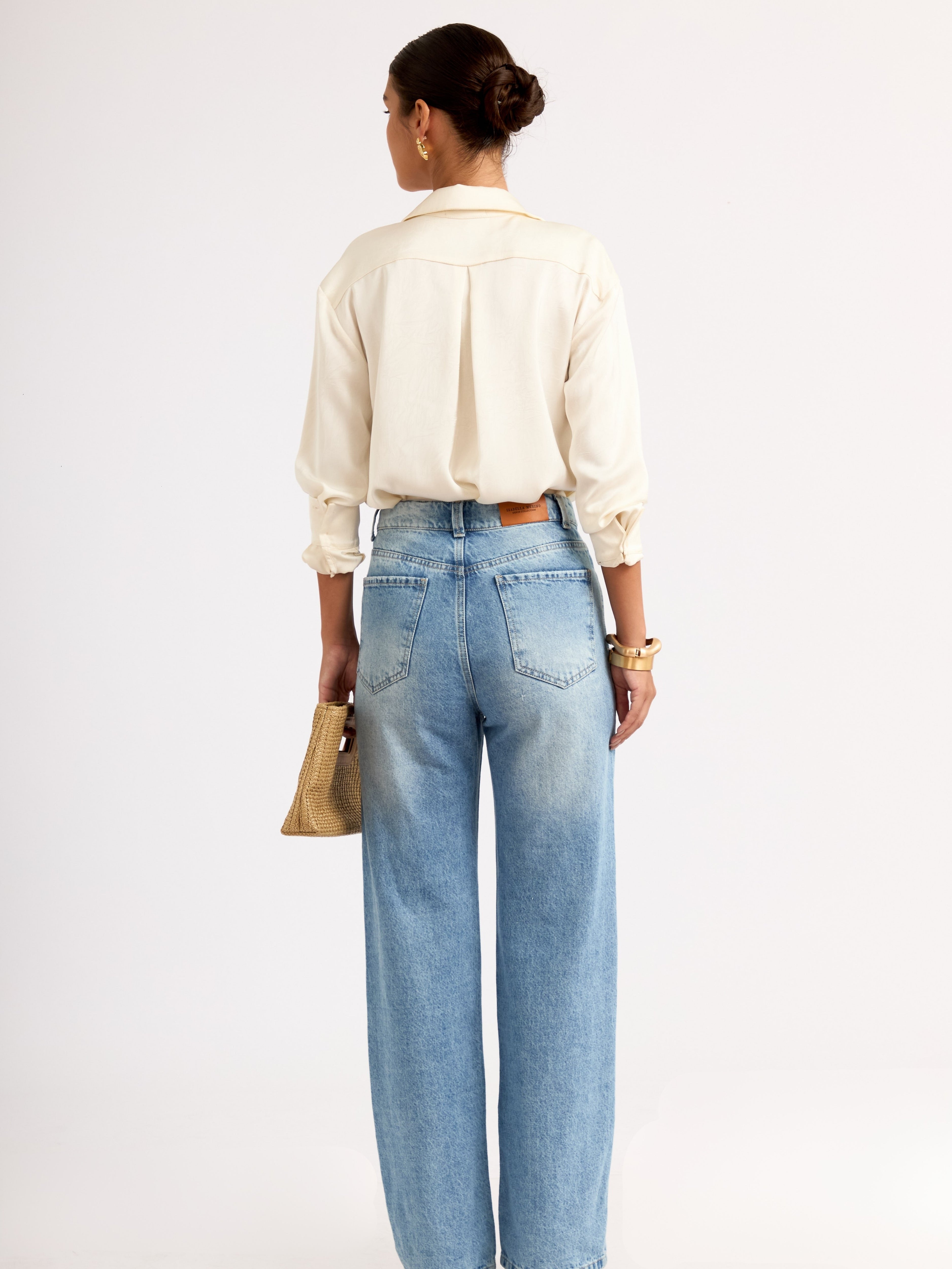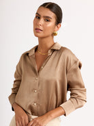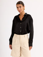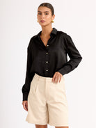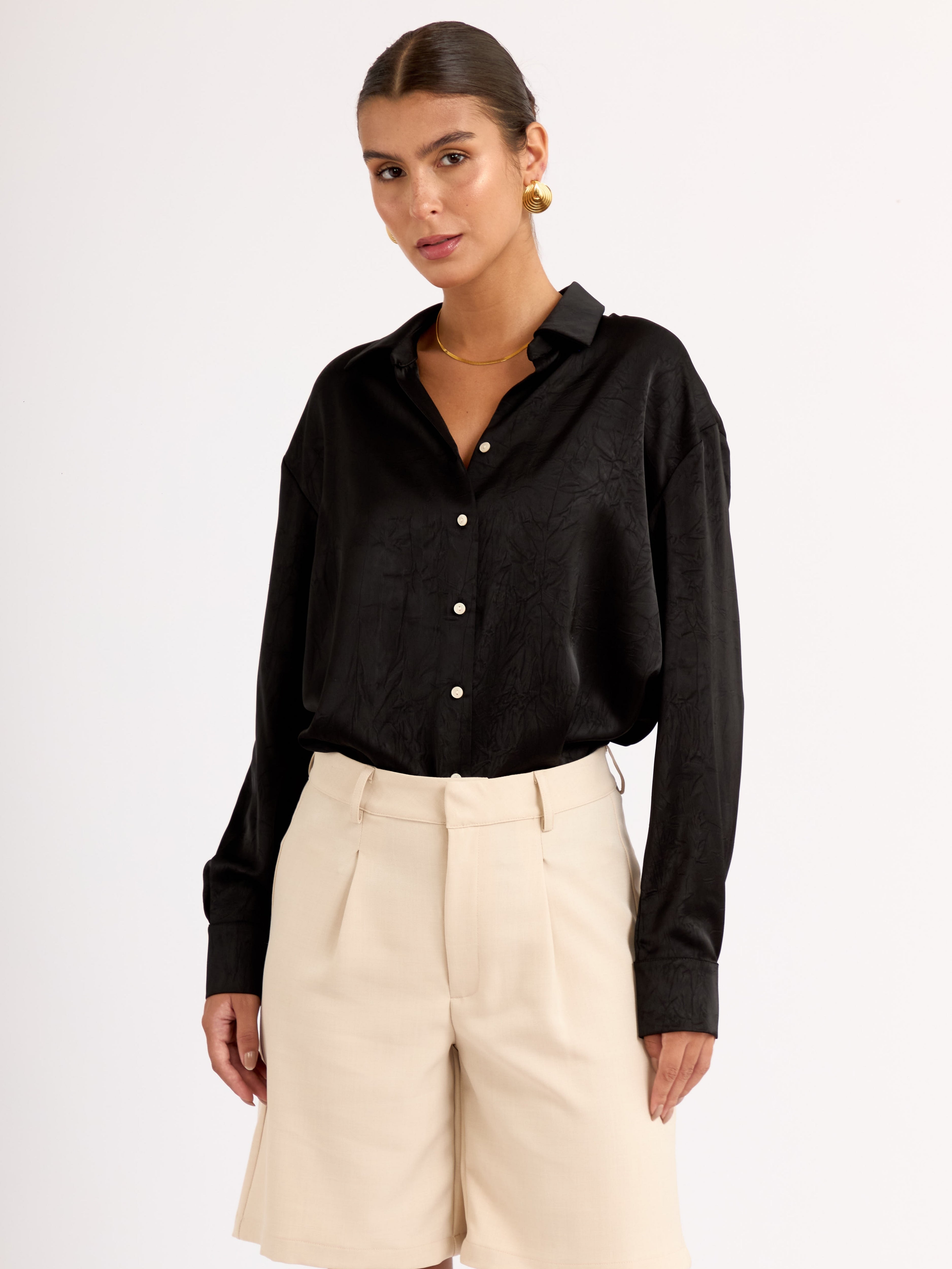 Camisa satinada manga larga con un diseño elegante y fluido. Cuello en V amplio y abierto; y botones de nácar de diseño minimalista. Perfecta para combinar en atuendos formales o semi-formales.