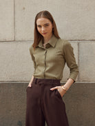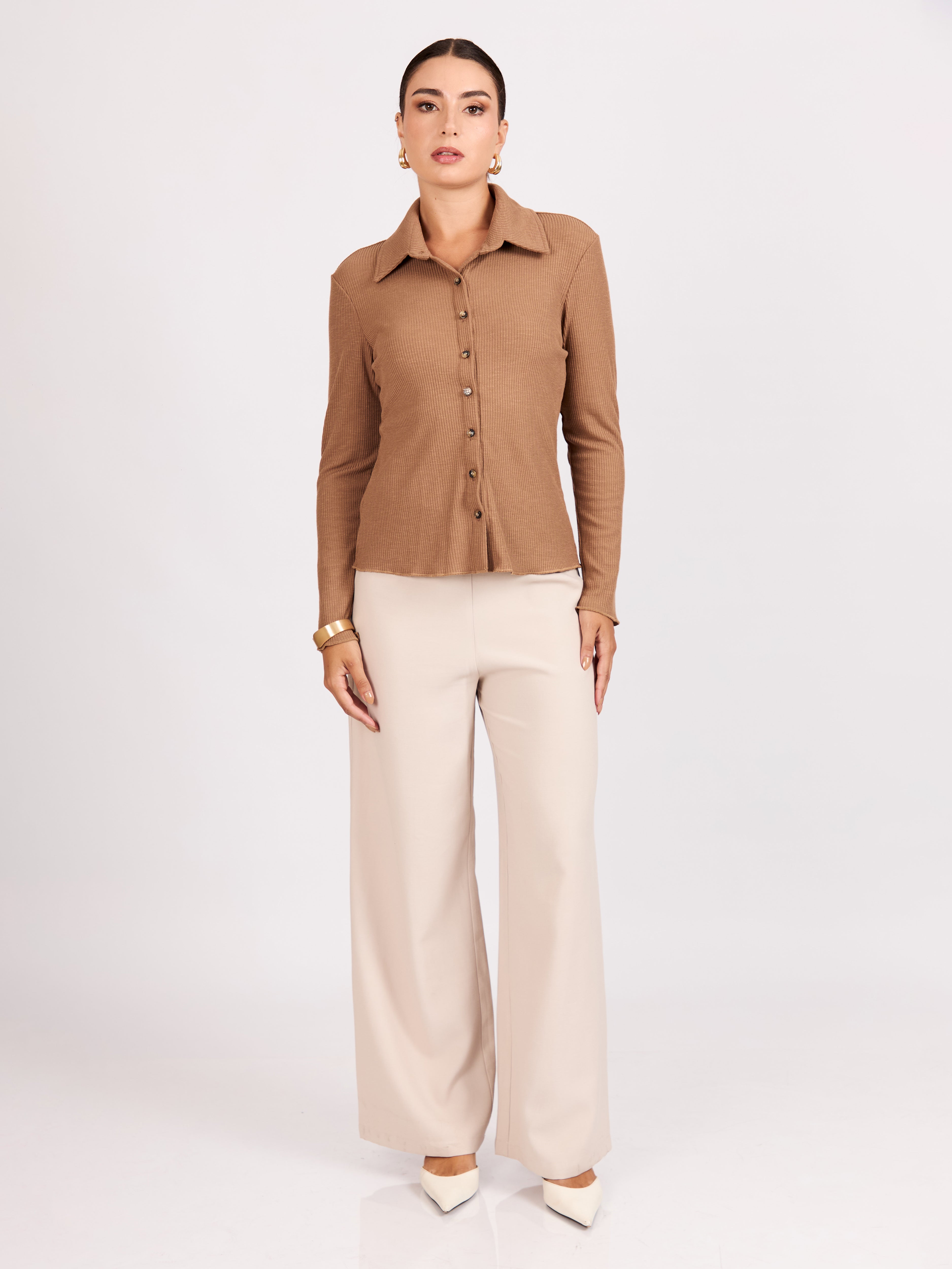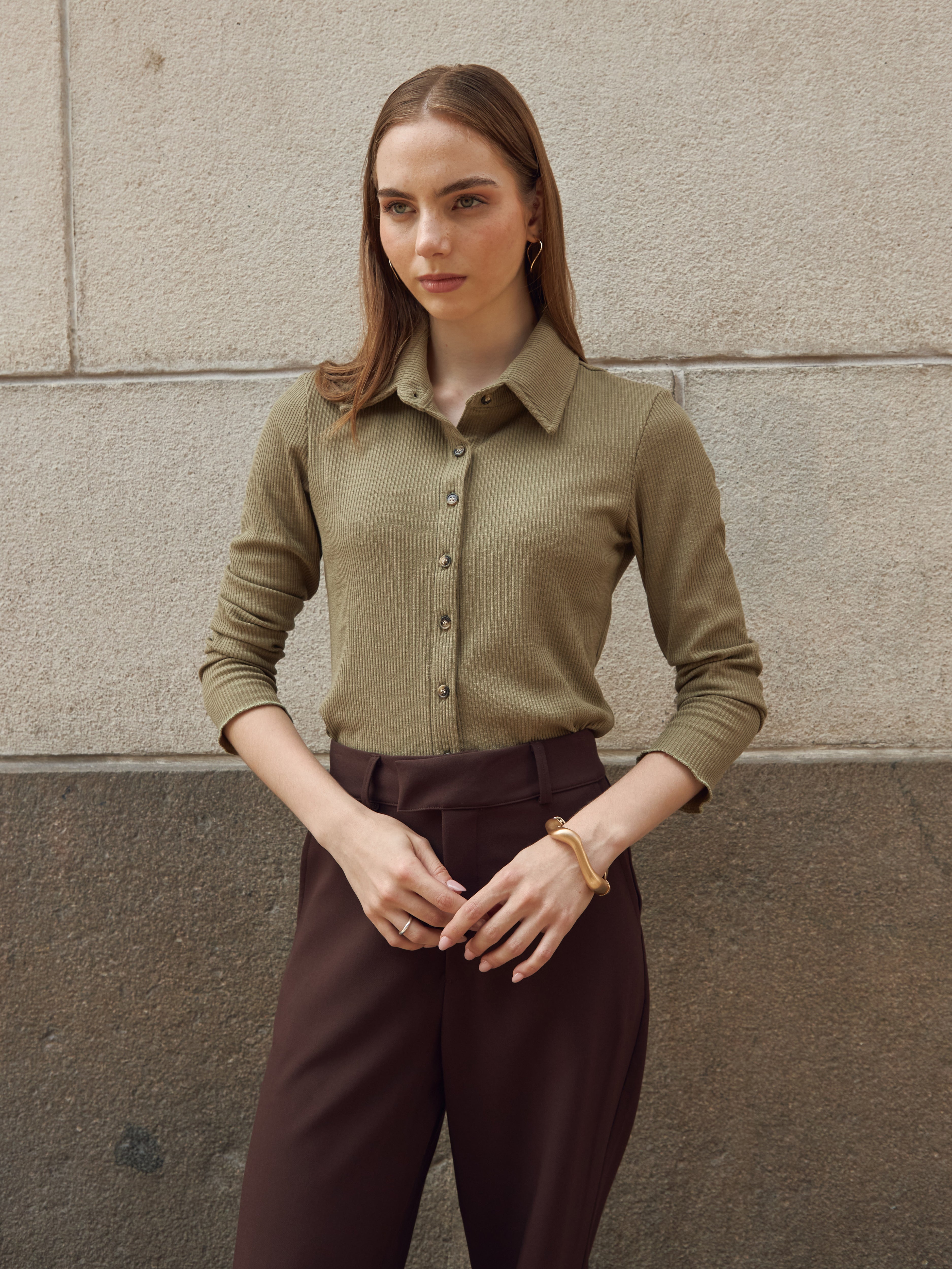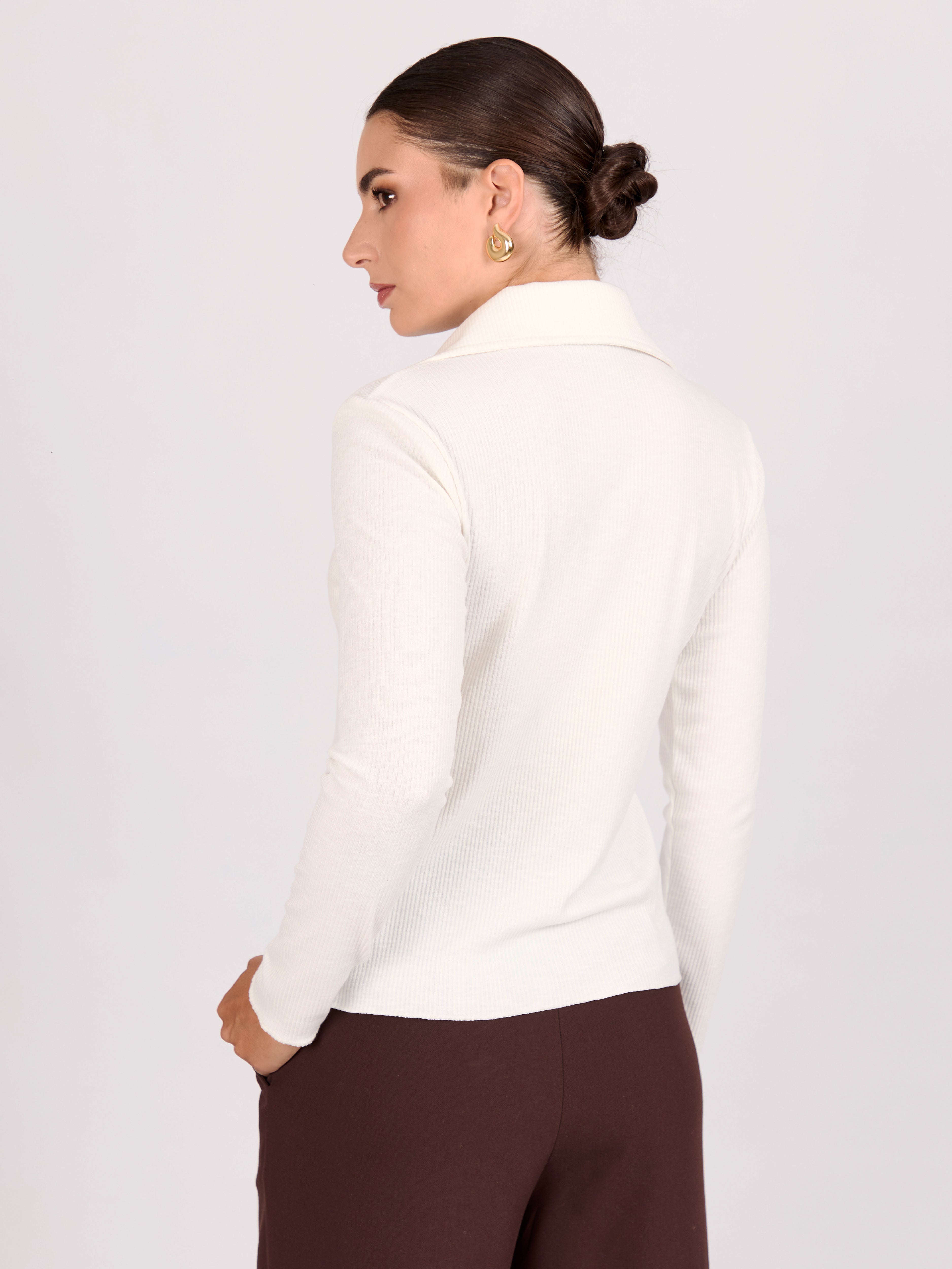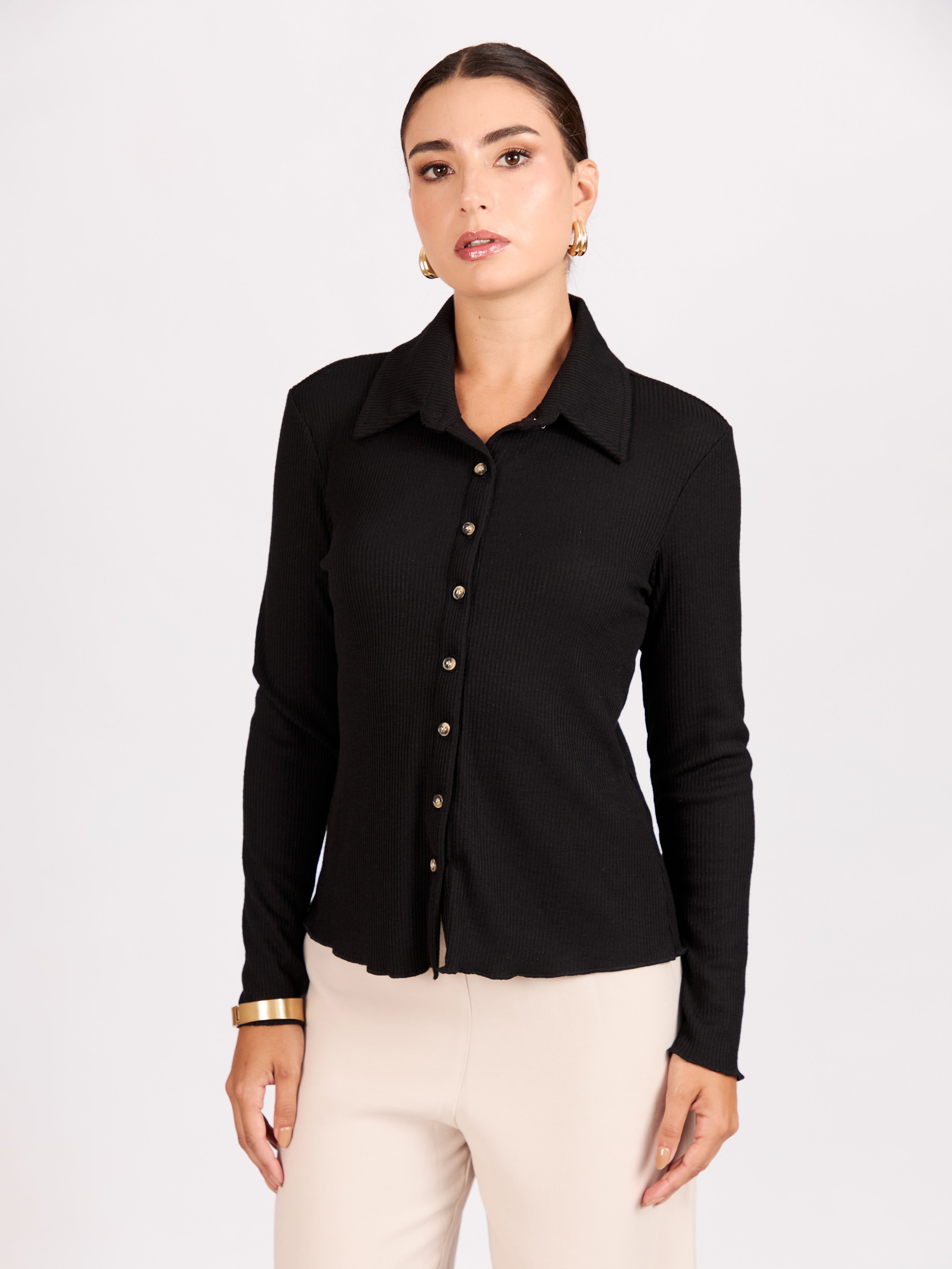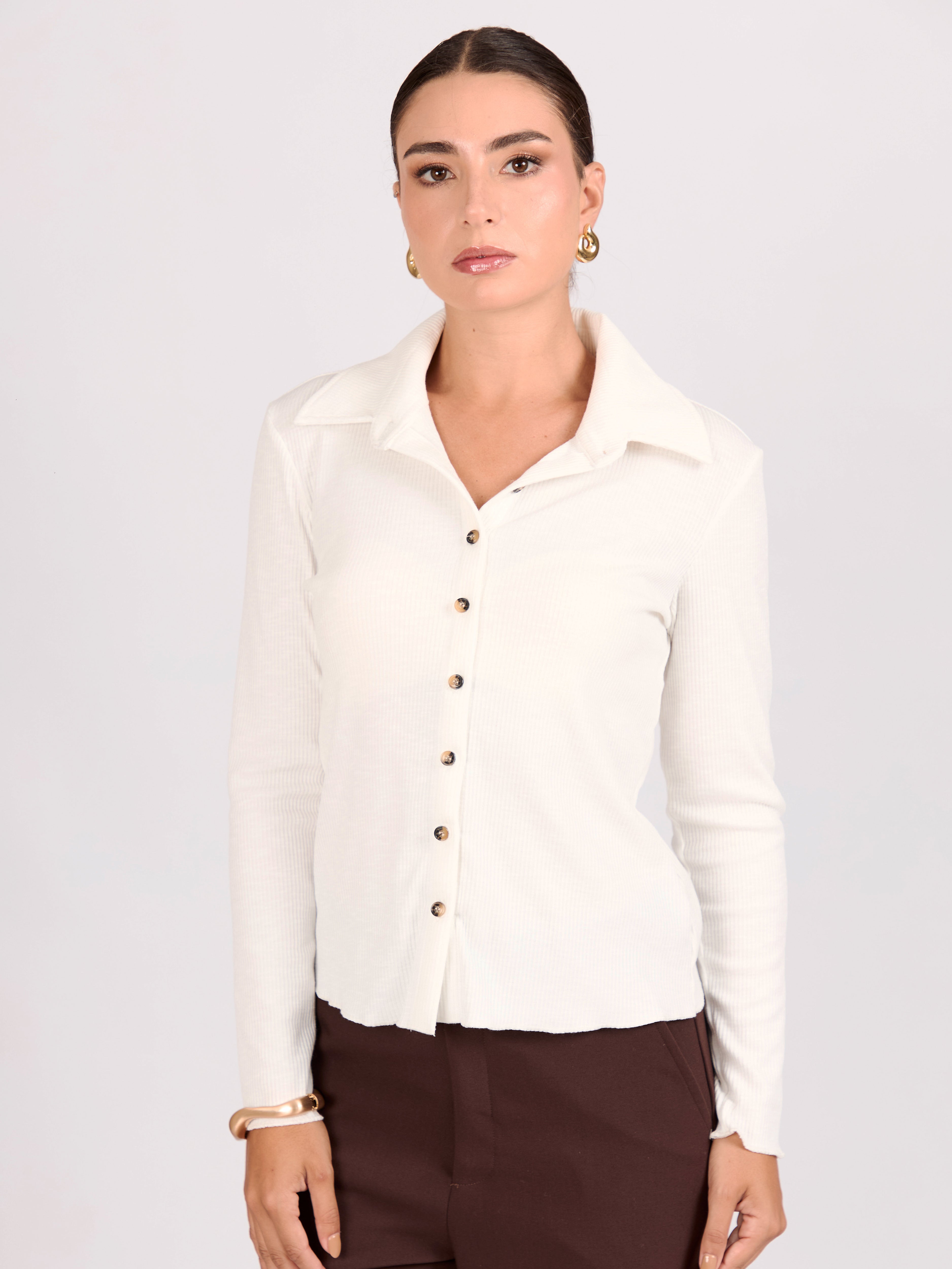 Blusa de manga larga con cuello camisero, apertura frontal con botones y puños con fruncido delicado, que aportan un acabado suave y sofisticado.