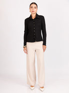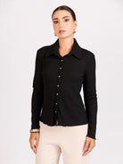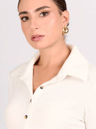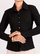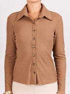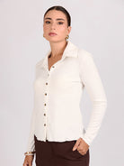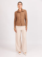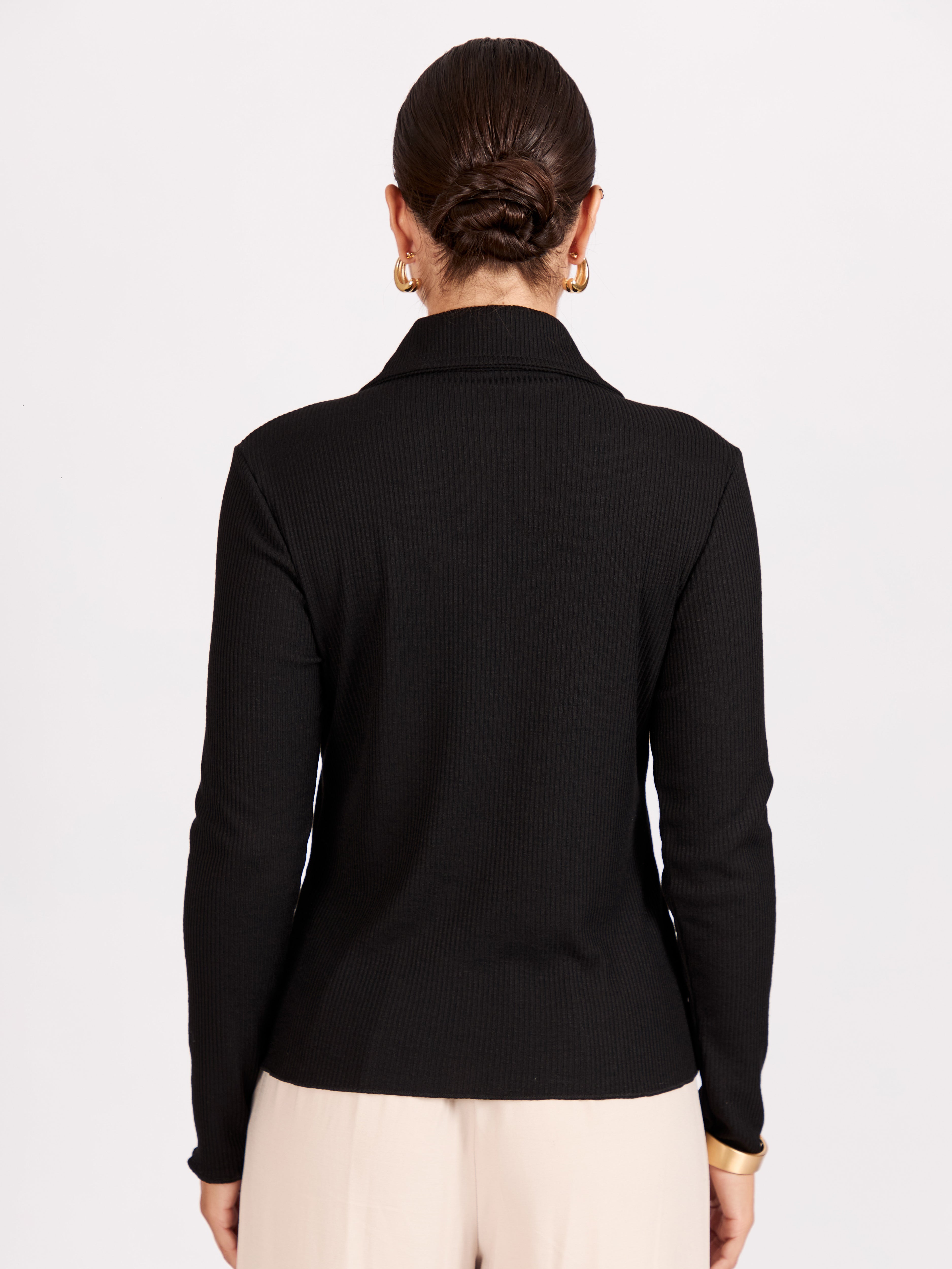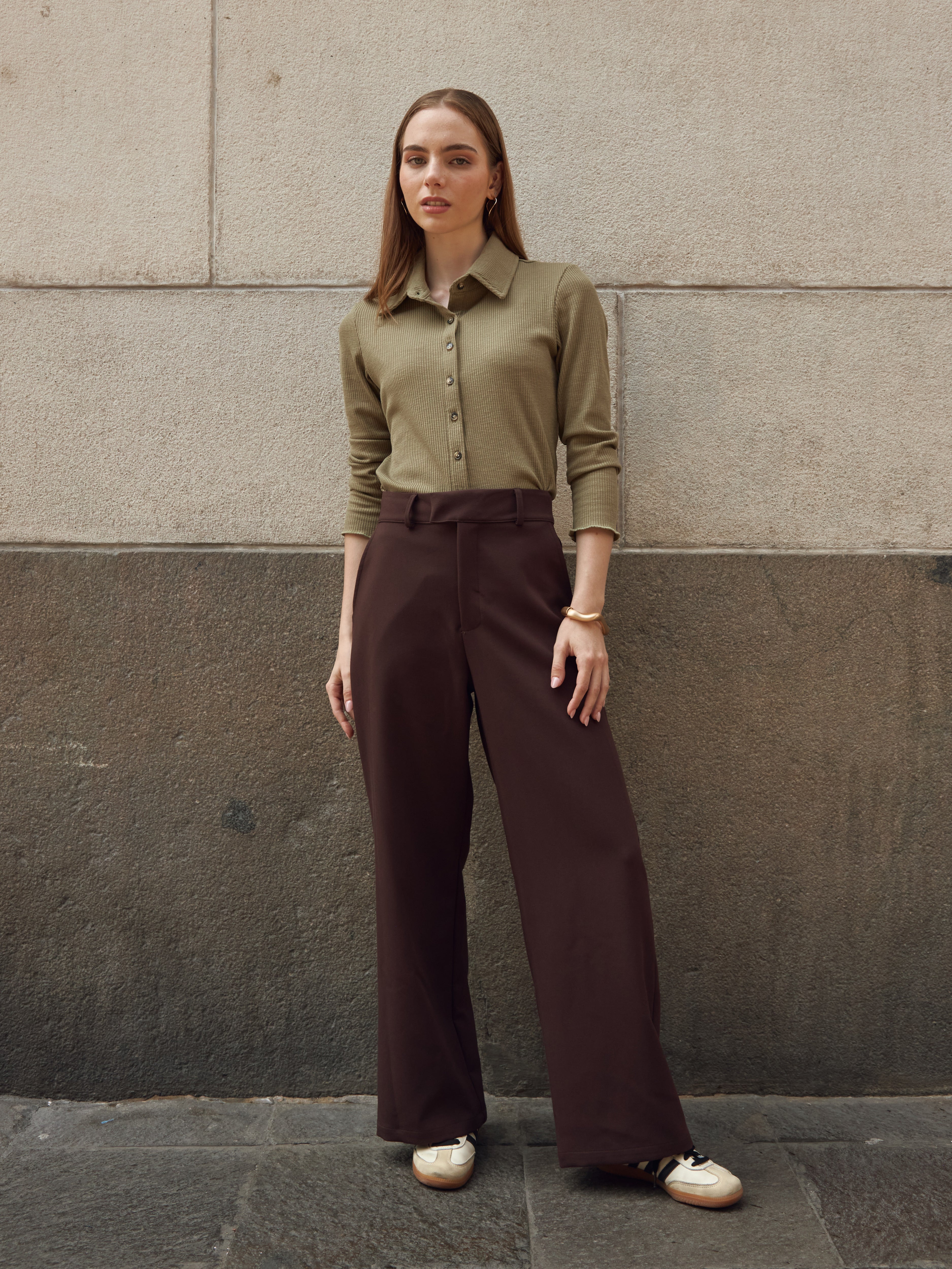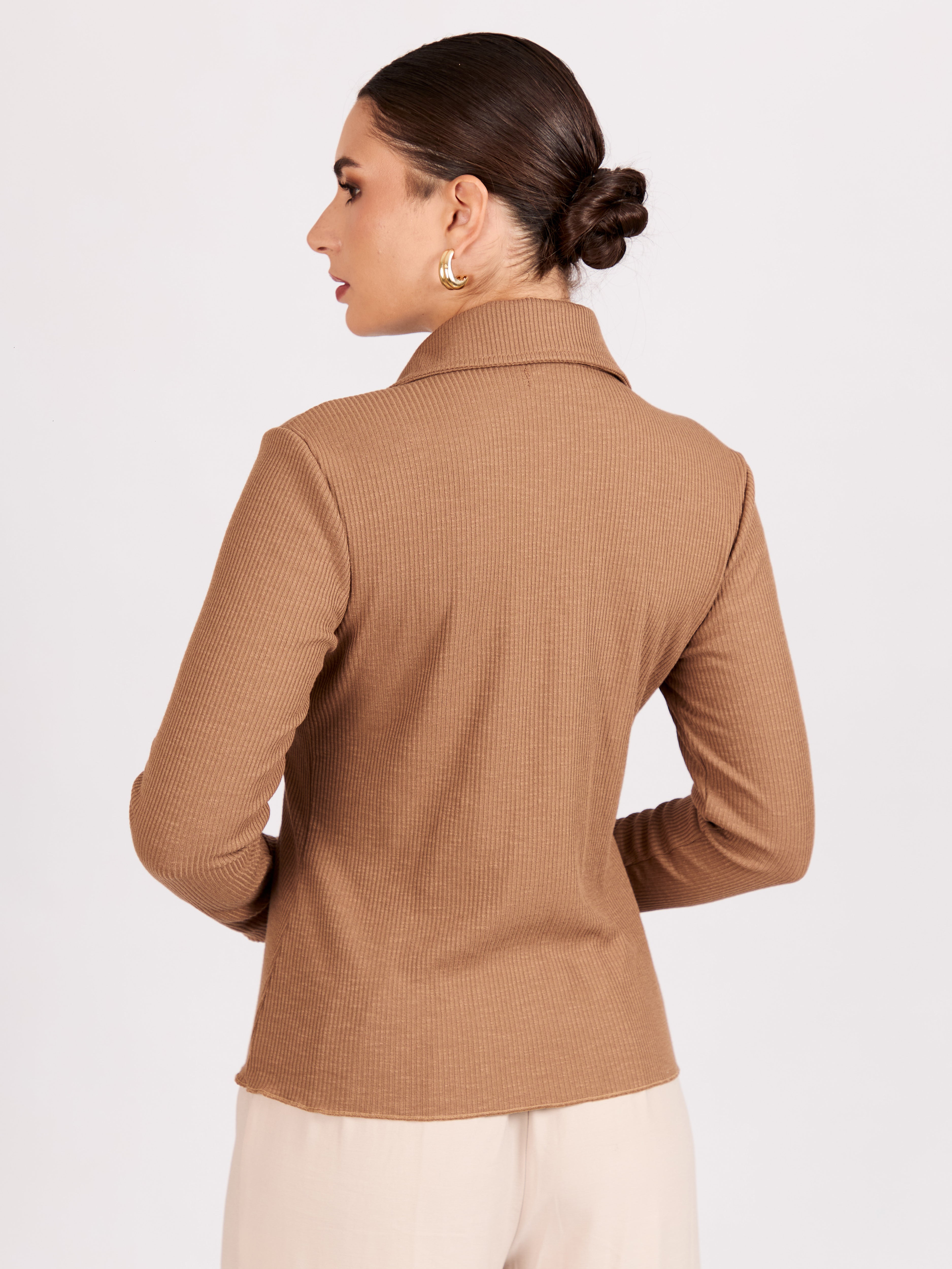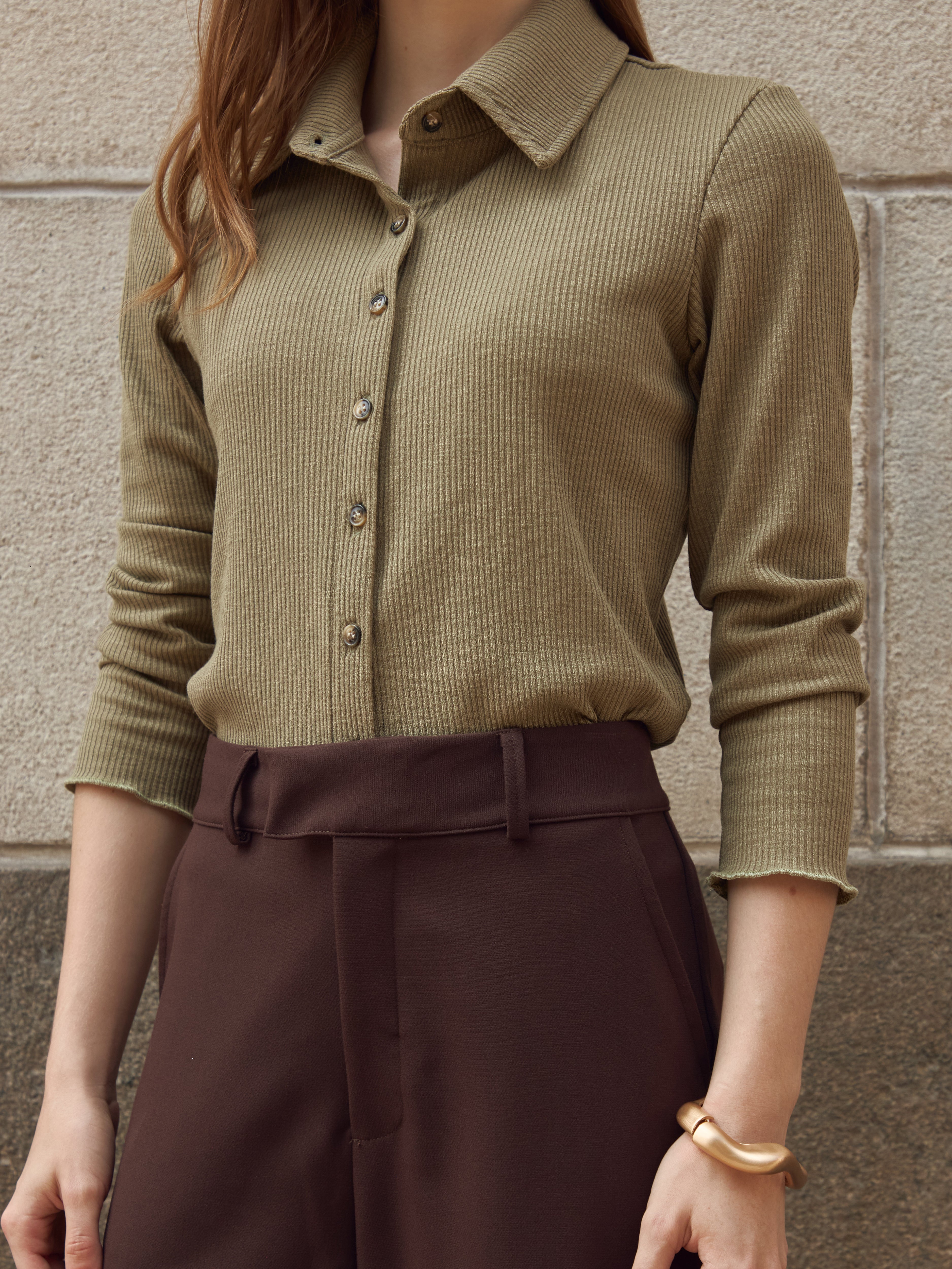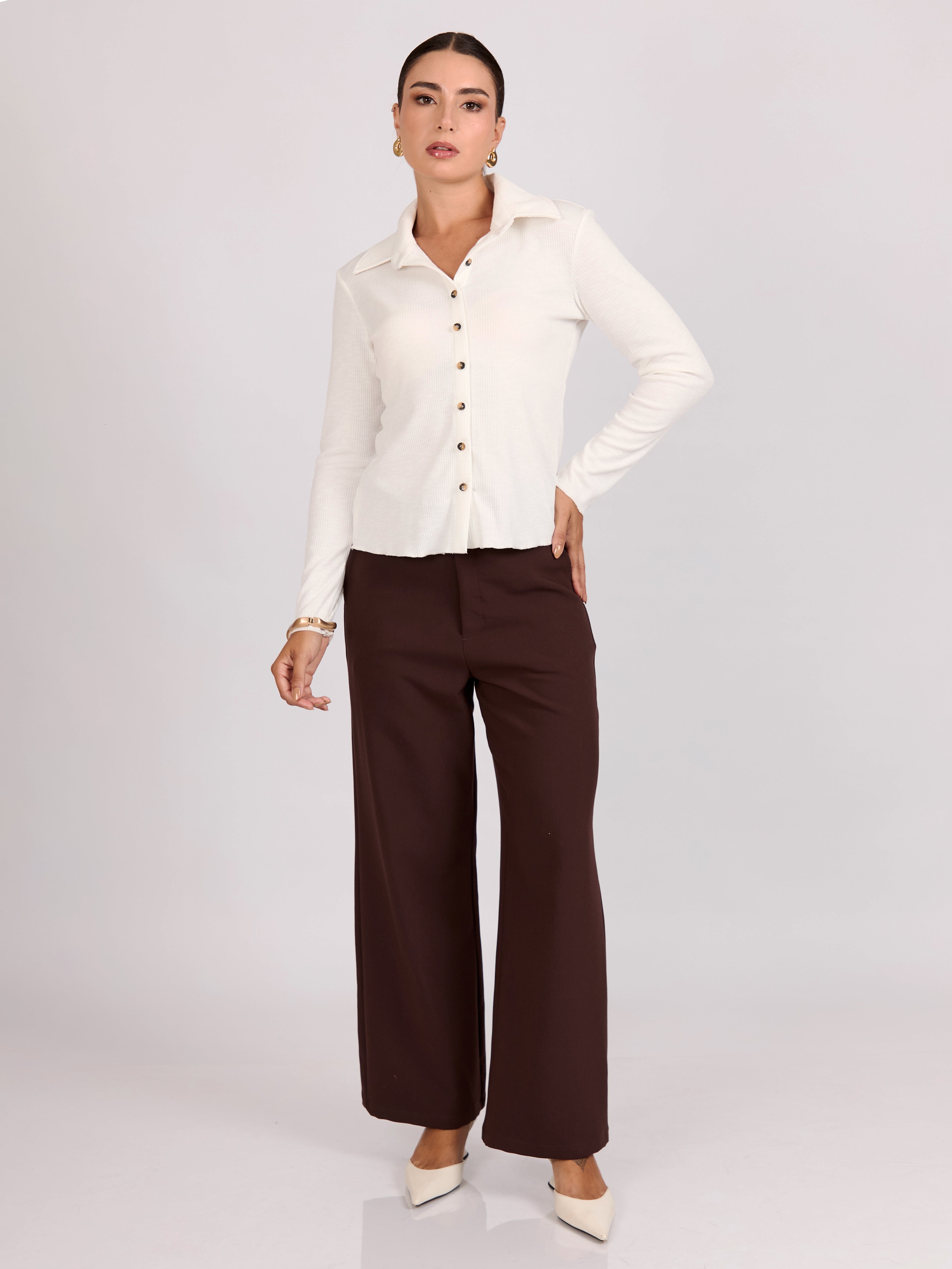 Blusa de manga larga con cuello camisero, apertura frontal con botones y puños con fruncido delicado, que aportan un acabado suave y sofisticado.