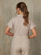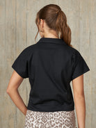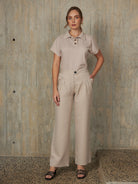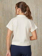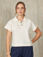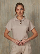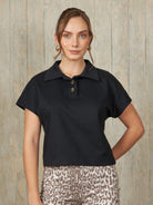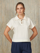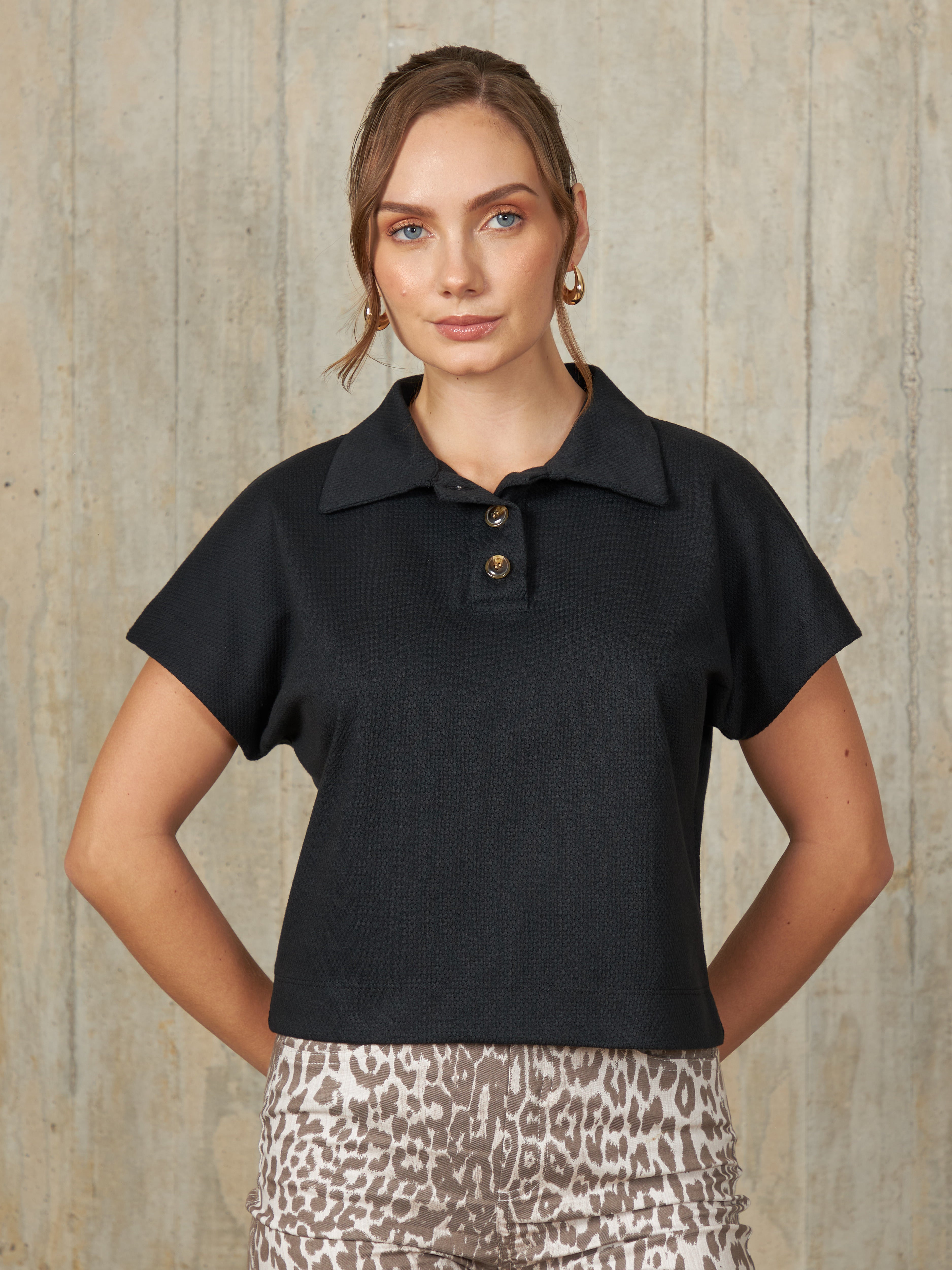 Polo camisero de diseño recto con mangas murciélago. Modelo de manga corta, con una abertura frontal de tres botones.