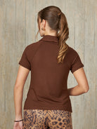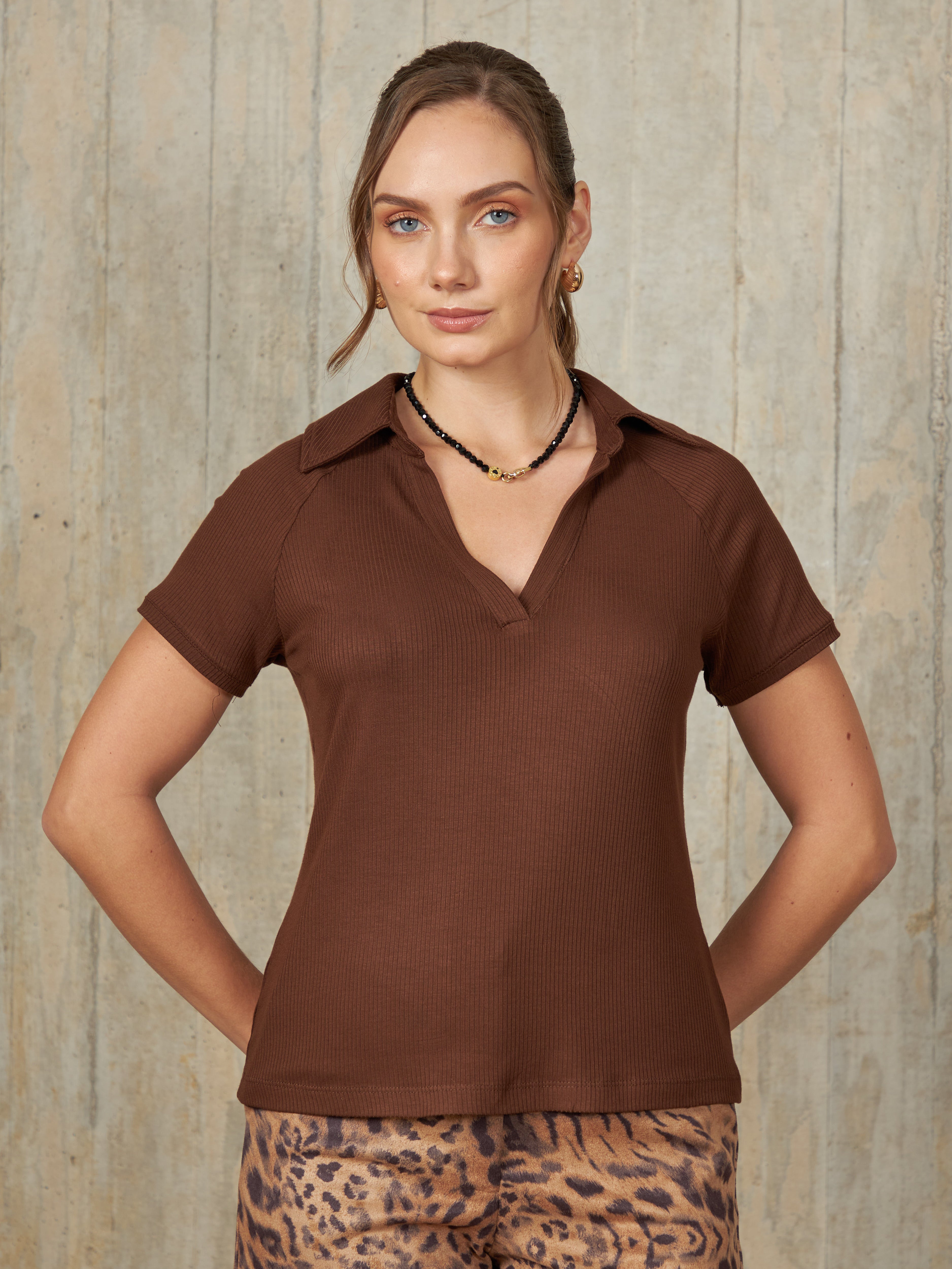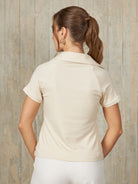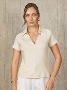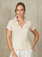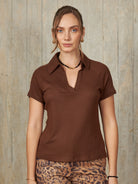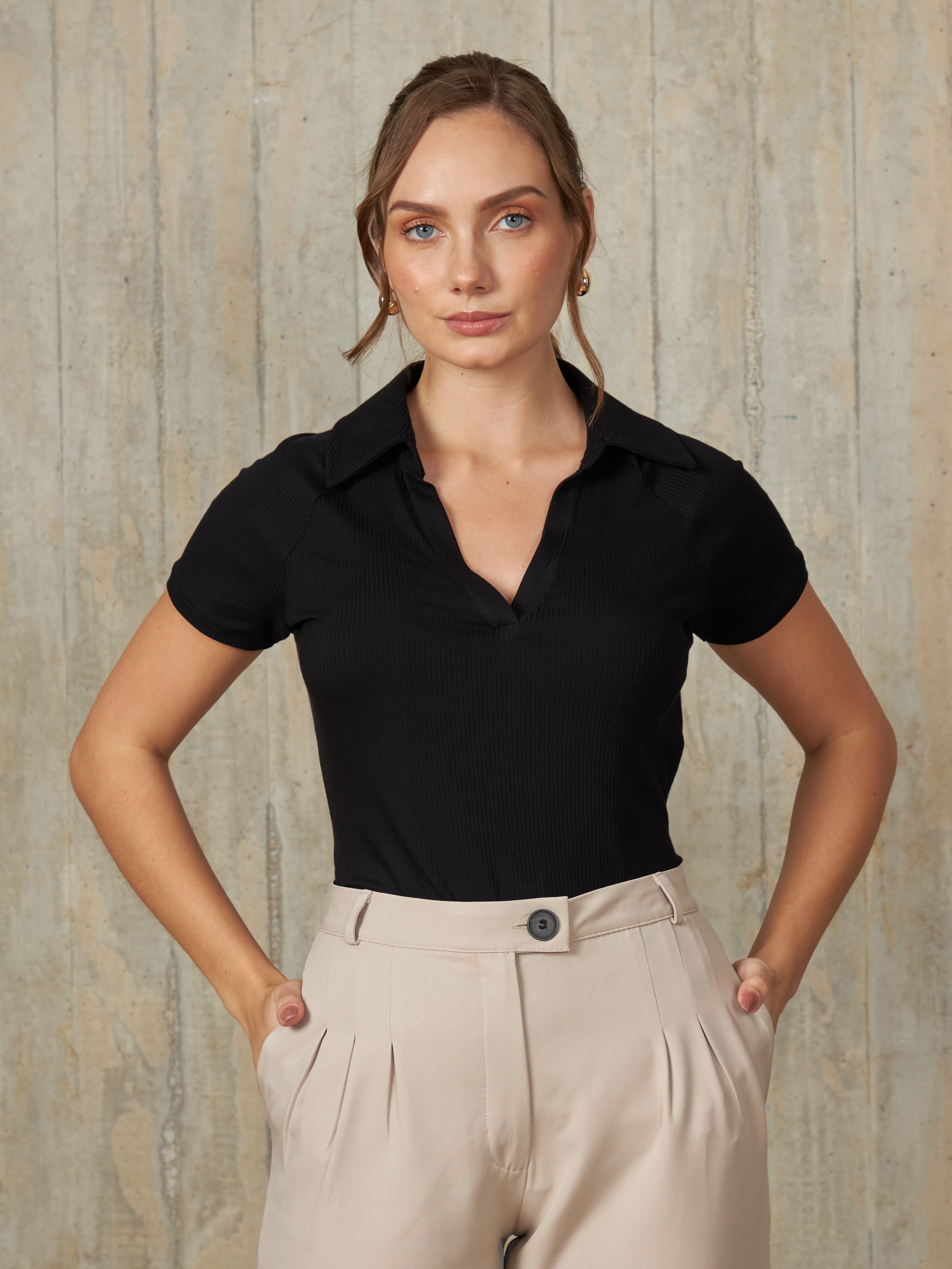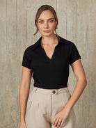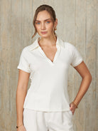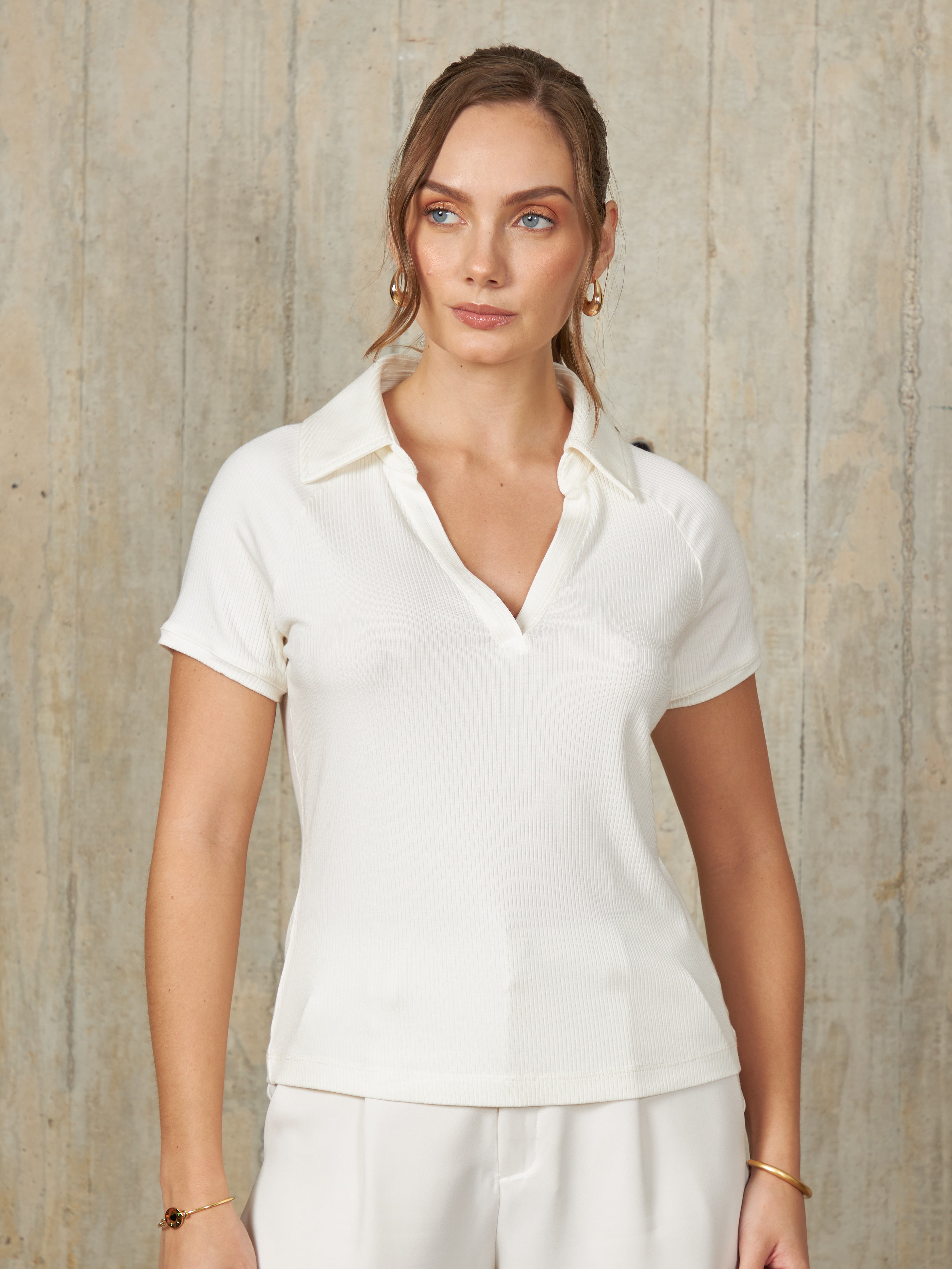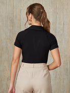 Polo de manga corta con escote en V y cuello camisero, diseñado para un ajuste ceñido al cuerpo que resalta la silueta de manera elegante.