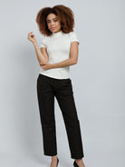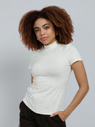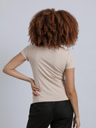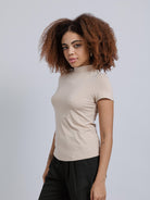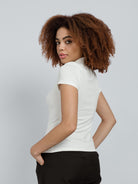 Camiseta manga corta, cuello levemente alto y con dos botones pequeños en la parte posterior.