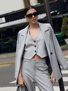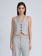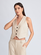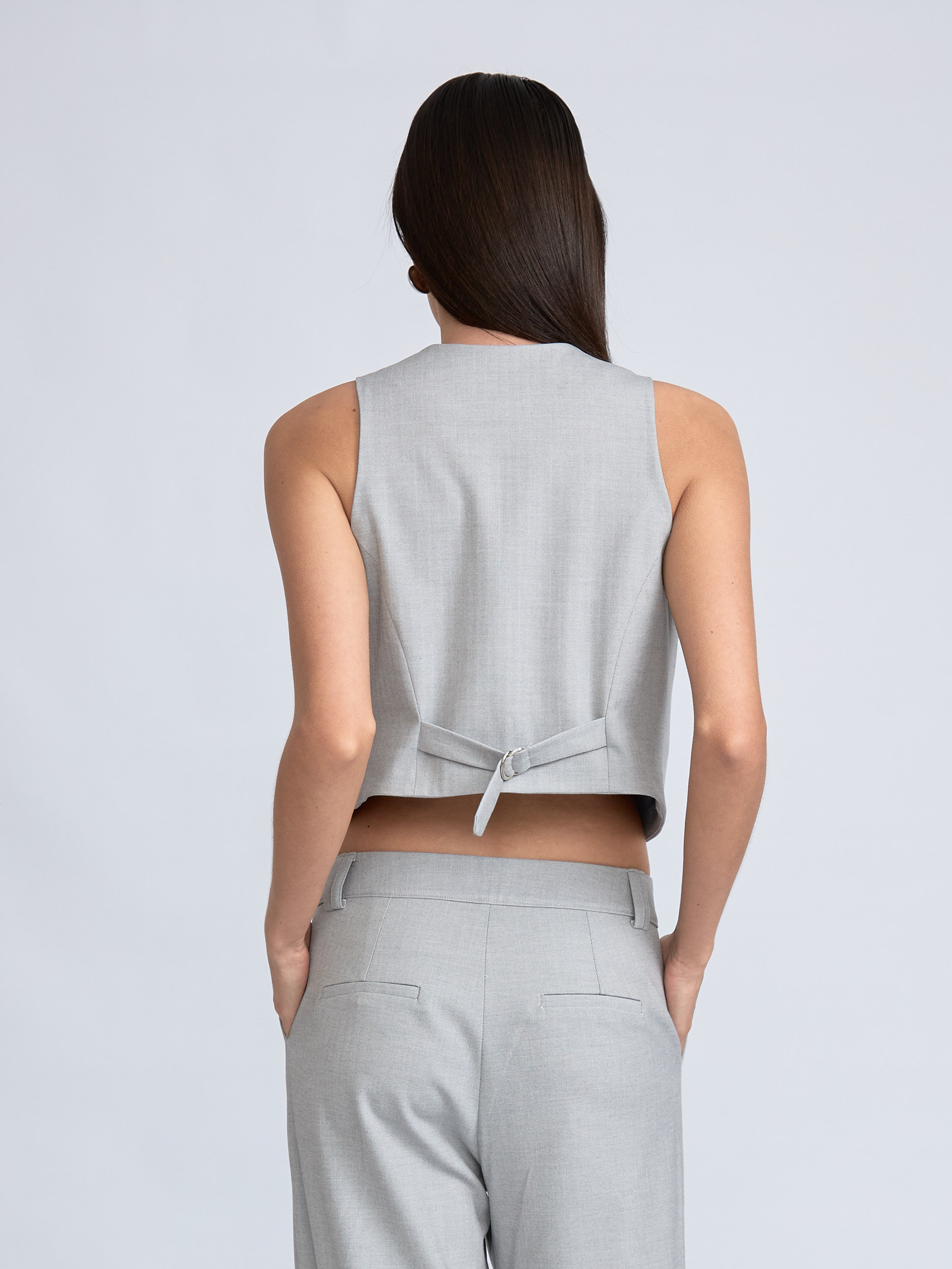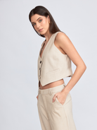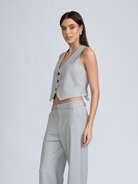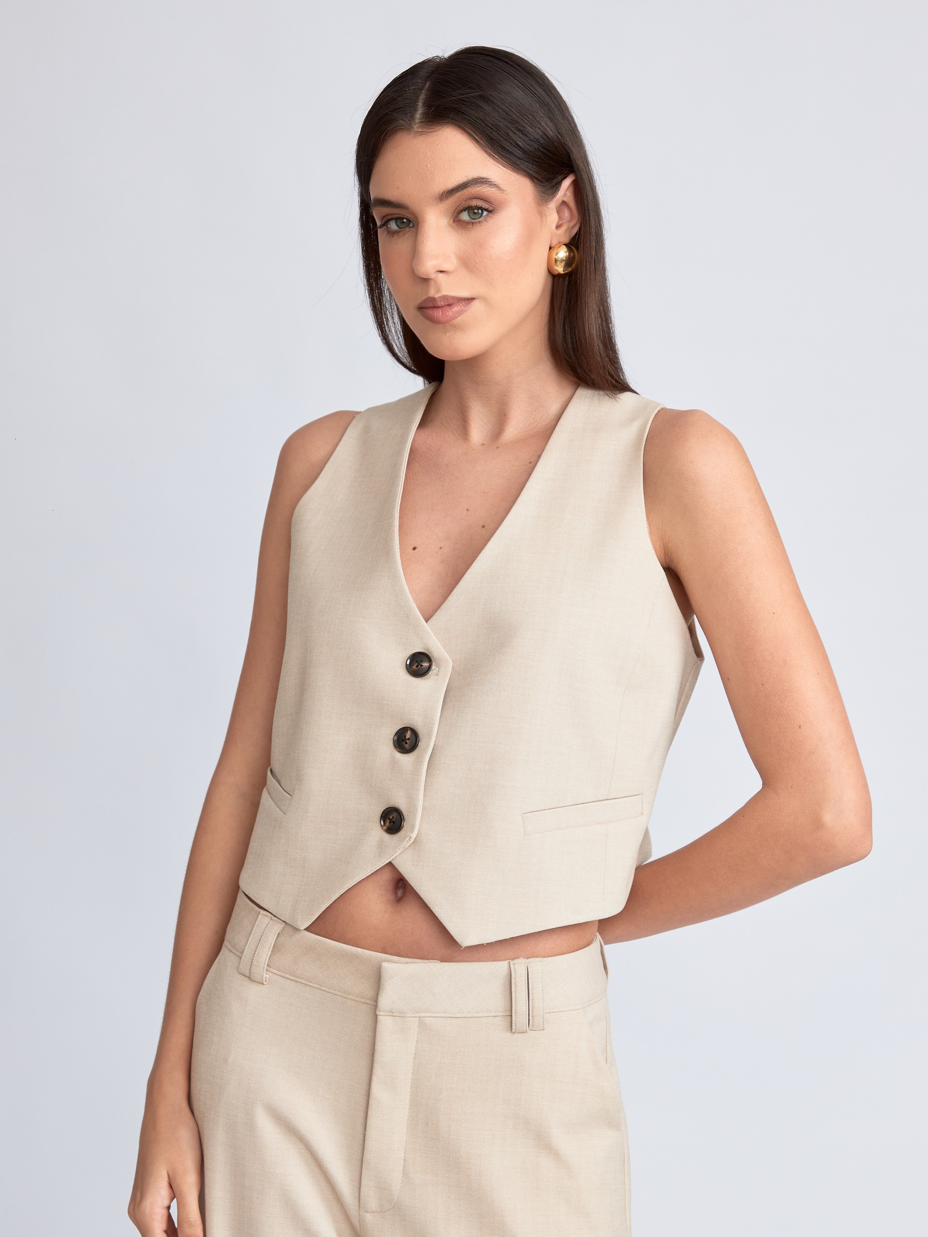 Chaleco sastre crop con escote V, botones adelante y bolsillos decorativos. Espalda en corte princesa y correa con regulador.