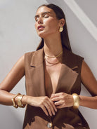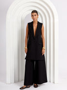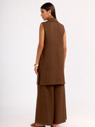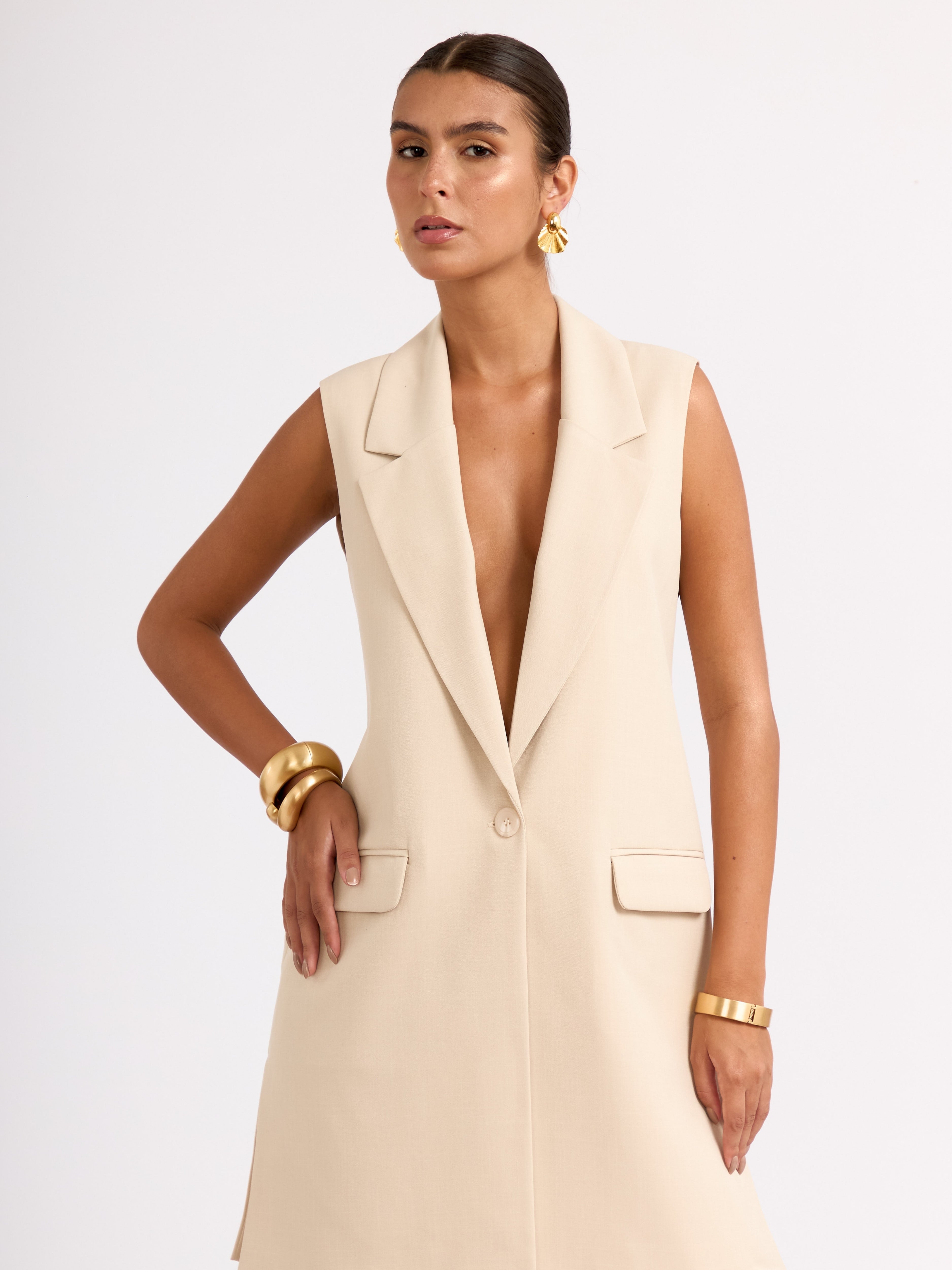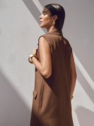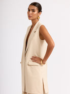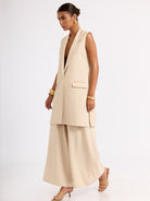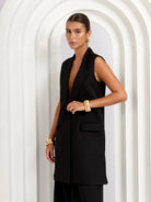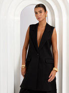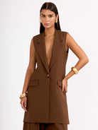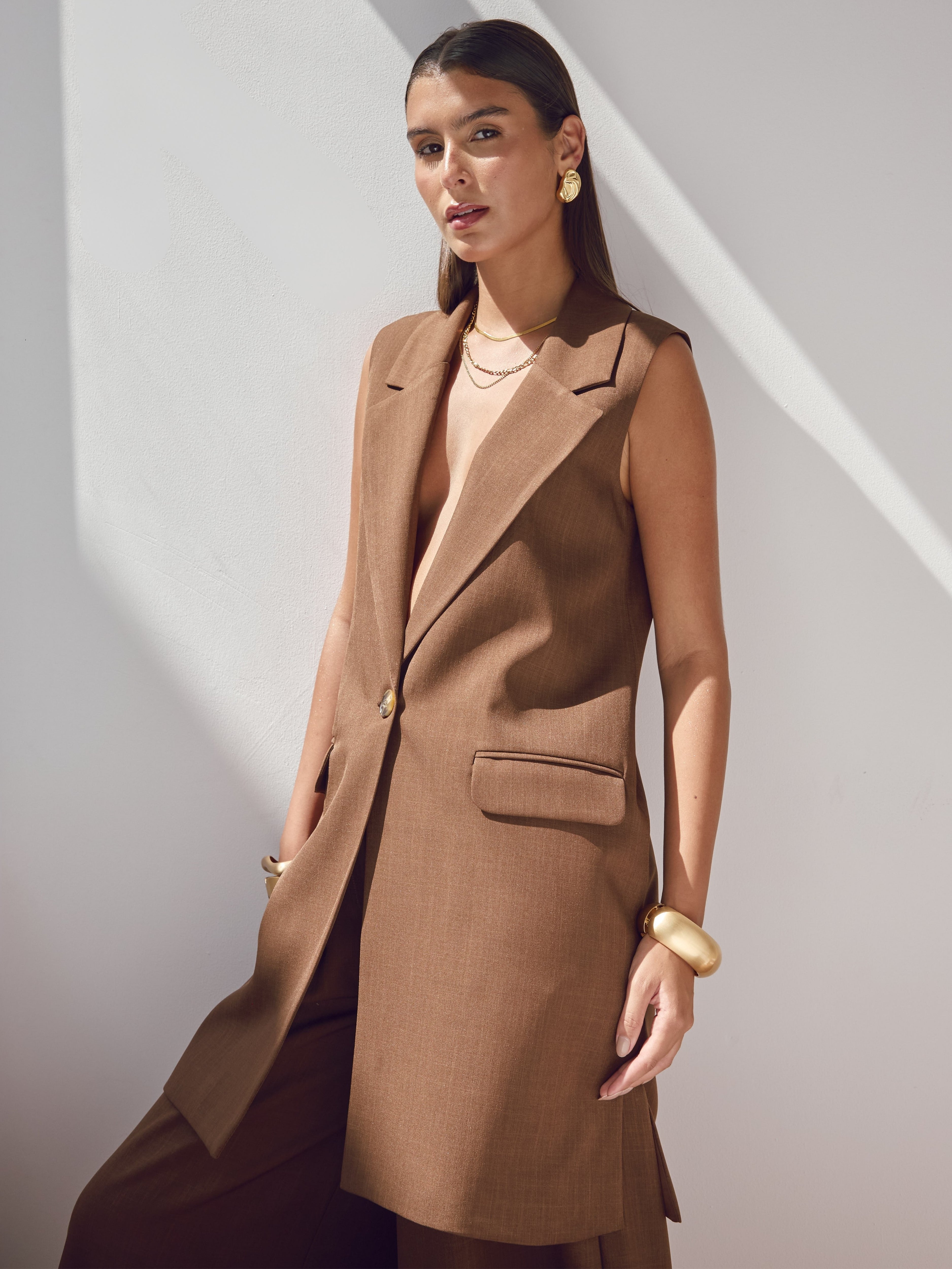 Chaleco largo con solapas bajas que aportan un toque de elegancia. Se ajusta al frente con un botón, mientras que sus bolsillos con tapa añaden funcionalidad y sofisticación al diseño. Ideal para completar looks modernos y sofisticados.