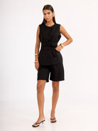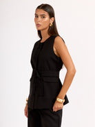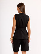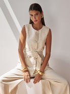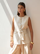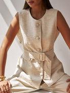 Chaleco con cuello redondo, incluye bolsillos con tapeta y botones forrados que añaden un toque refinado. Con cinturón ancho en la cintura que permite un ajuste personalizado.