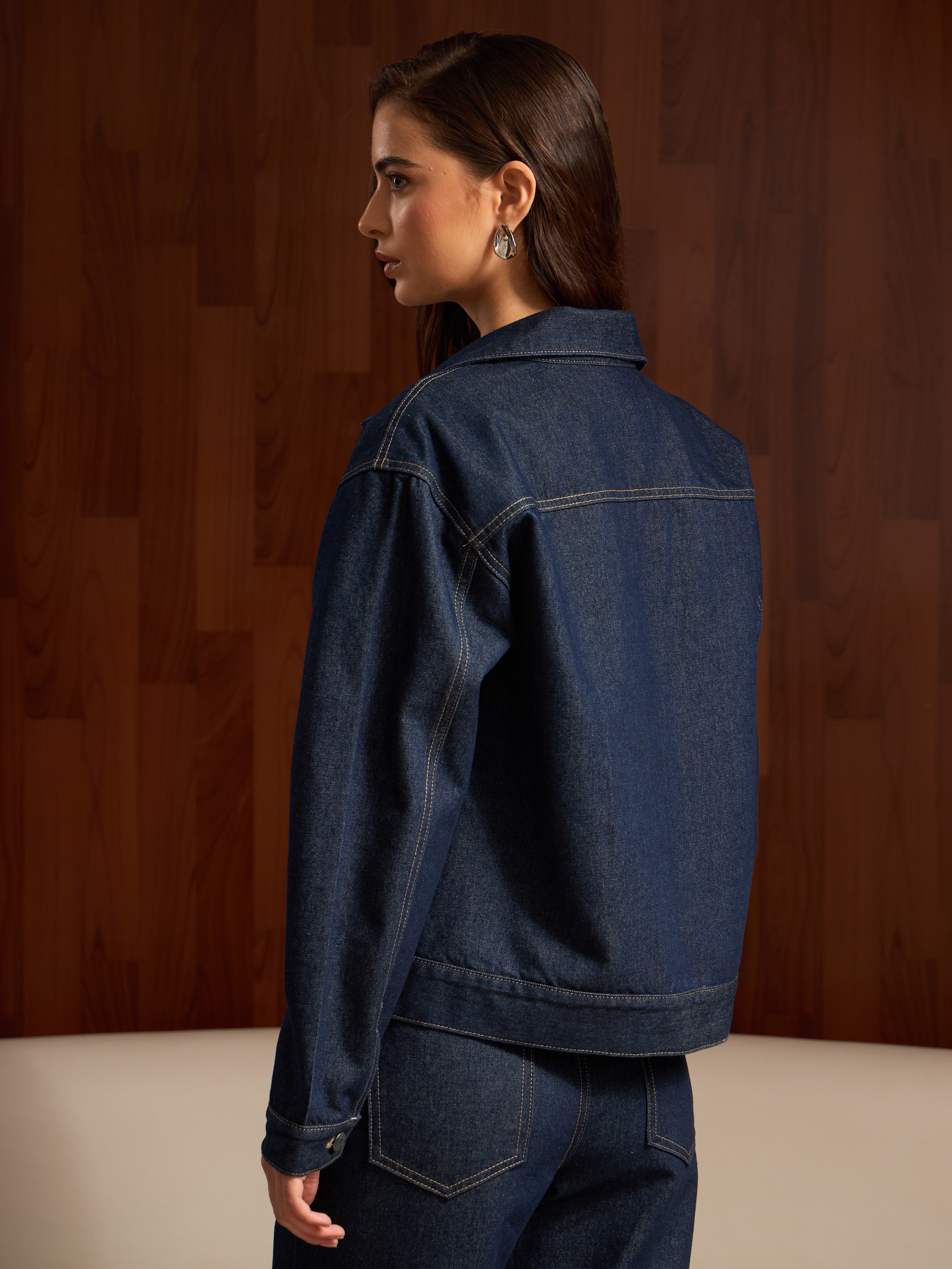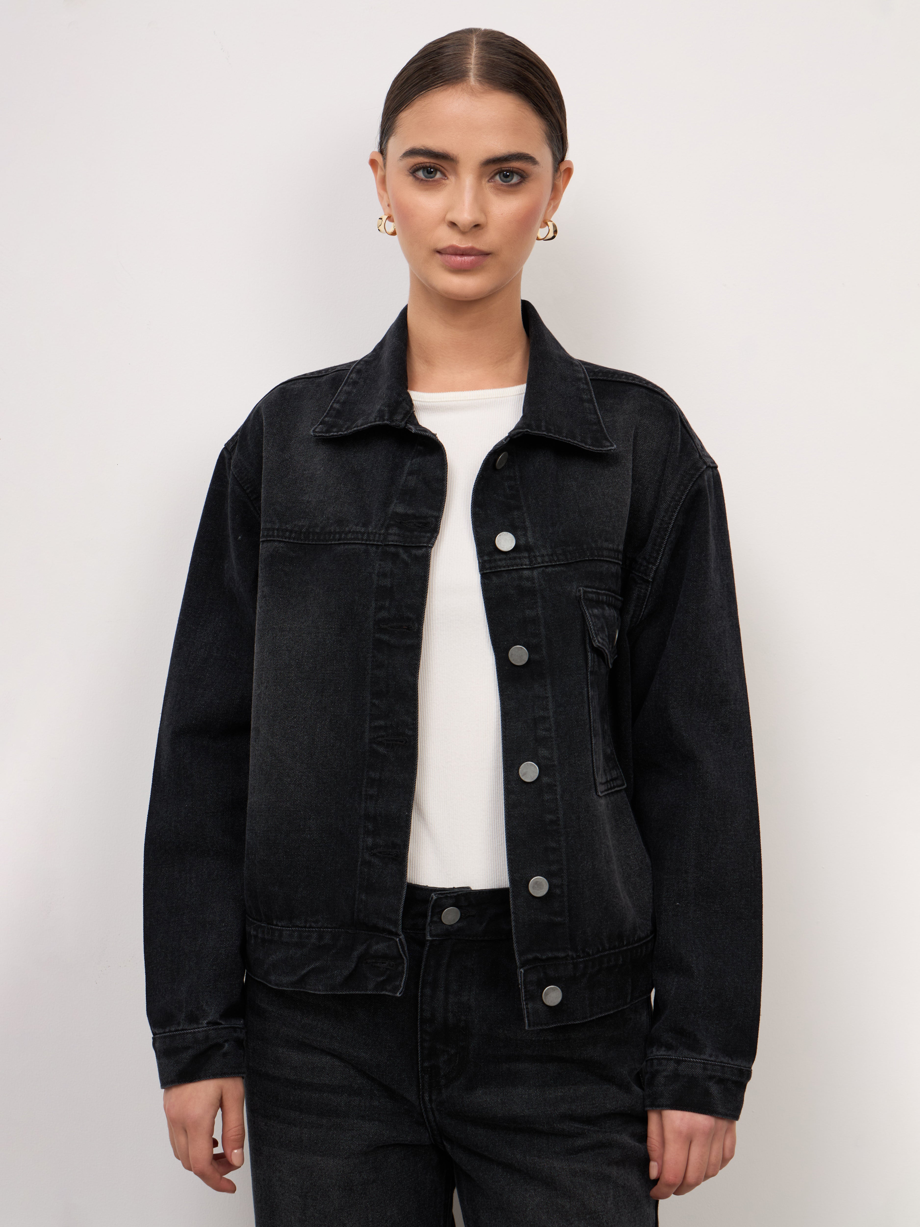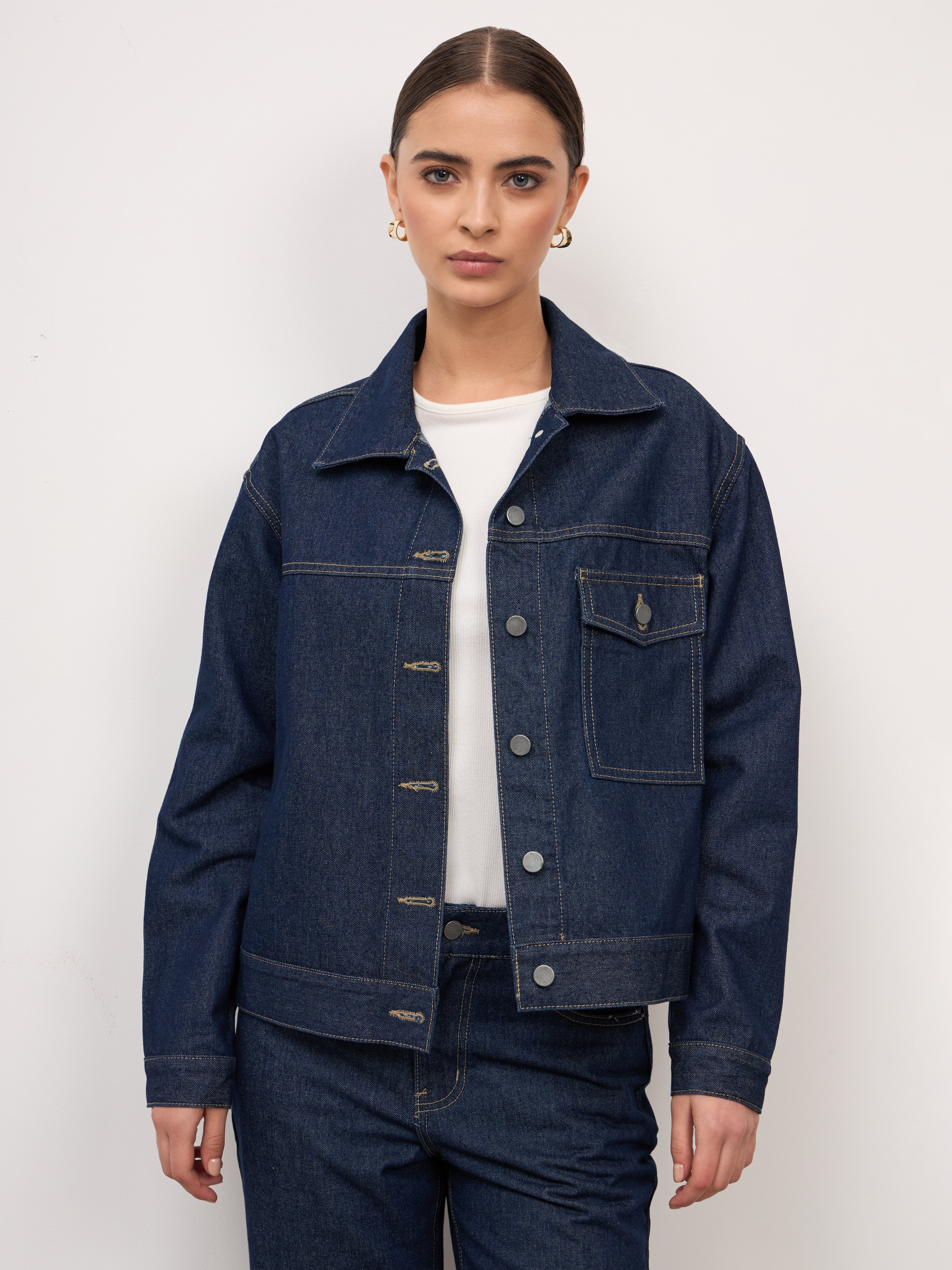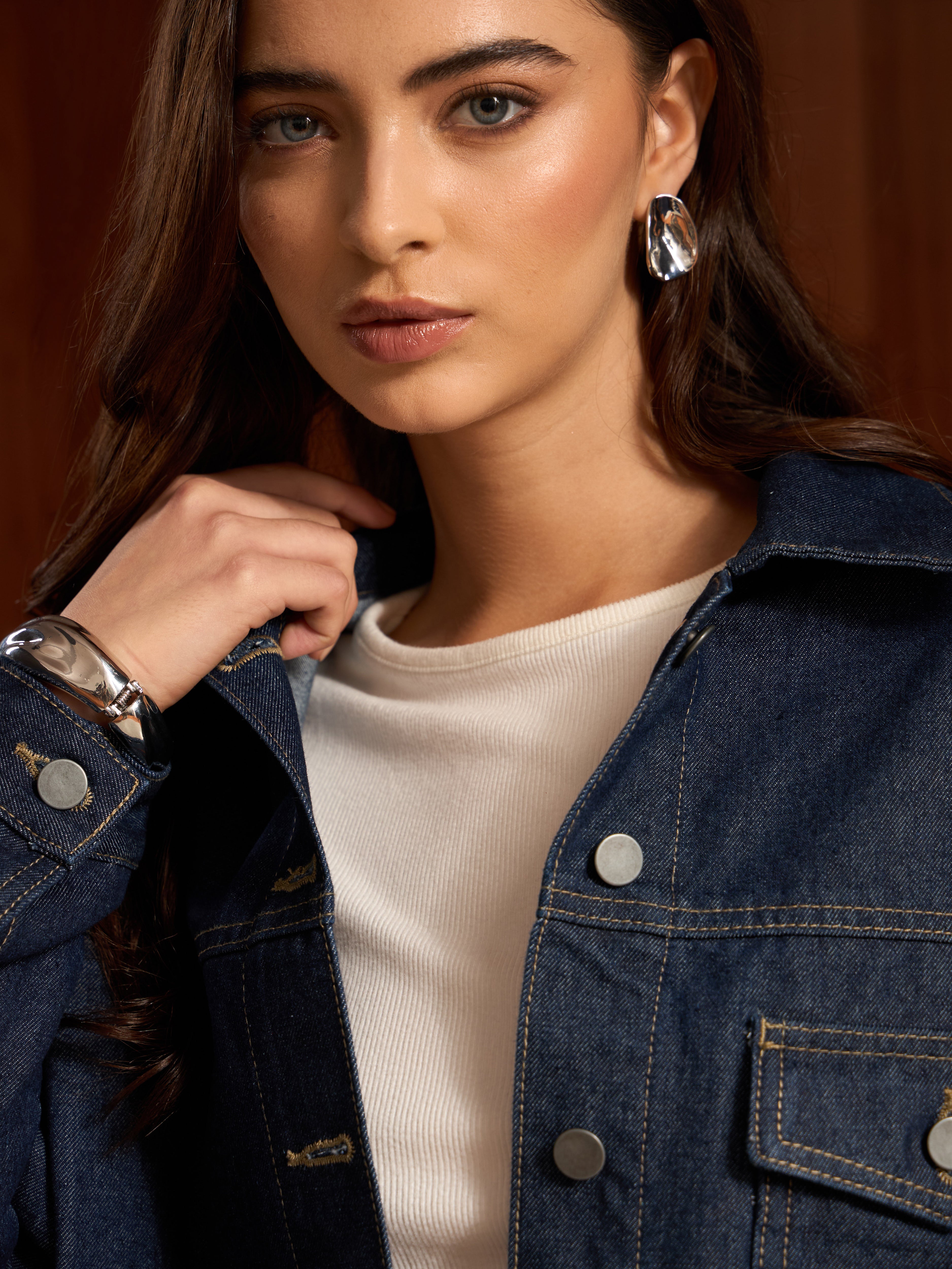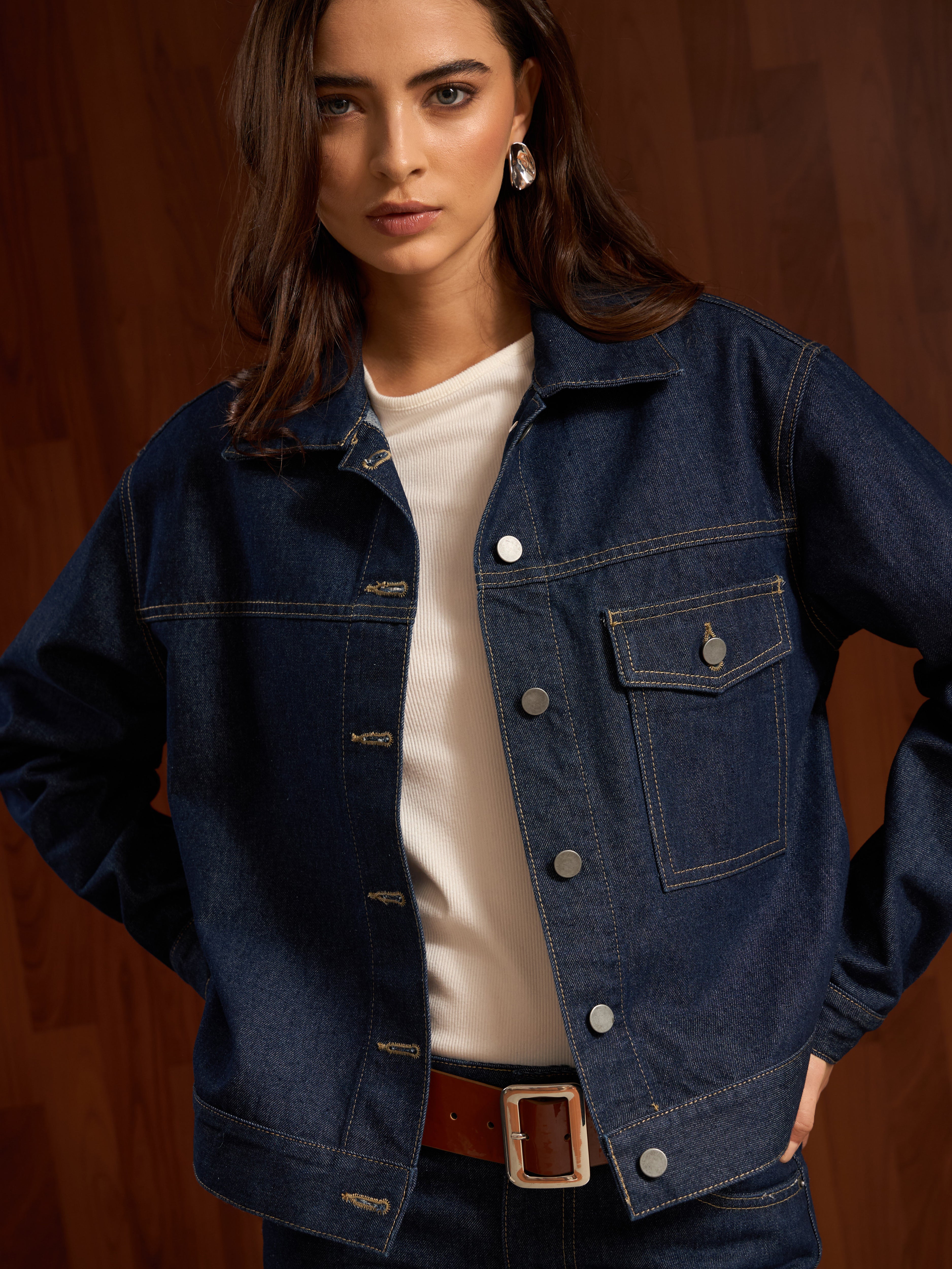 Chaqueta denim oversize diseñado con una estructura recta que brinda una silueta elegante. Cuenta con un bolsillo con tapa aportando un detalle funcional. Una pieza clásica y elegante, para looks semiformales y casuales.