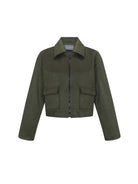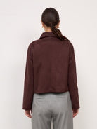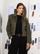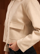 Chaqueta boxy de piel con corte estructurado. Presenta un cuello camisero con un cierre frontal y bolsillos con solapa a los lados, agregando funcionalidad y un acabado sofisticado. La prenda es versátil y atemporal, ideal para complementar looks formales o casuales con un toque refinado.
