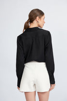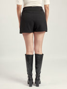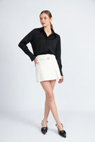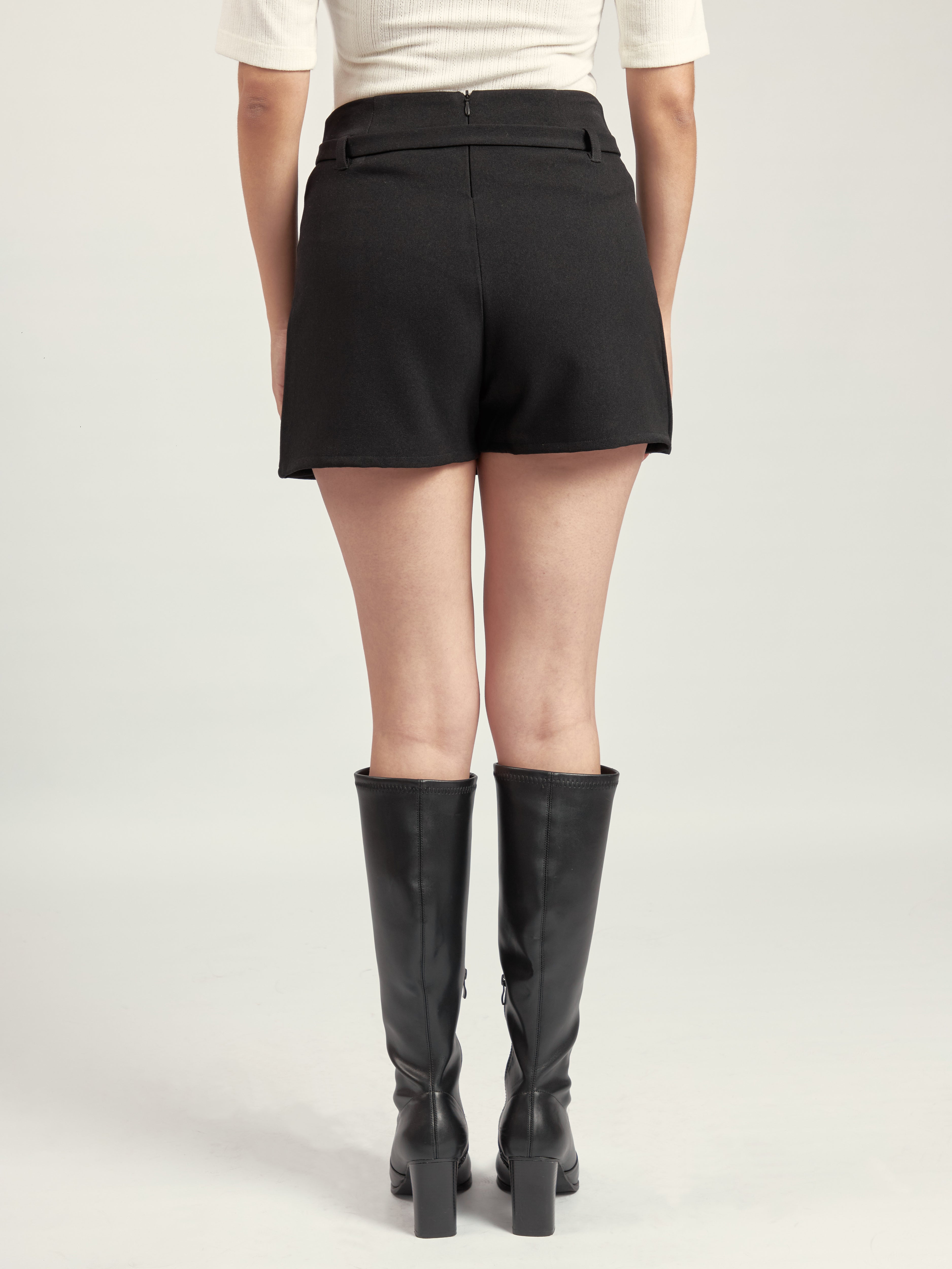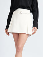 Falda short corta con pliegues, presilla en la cintura y cinturón. Cierre invisible al lado izquierdo.