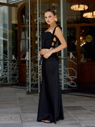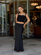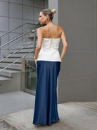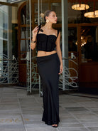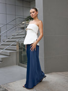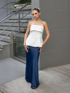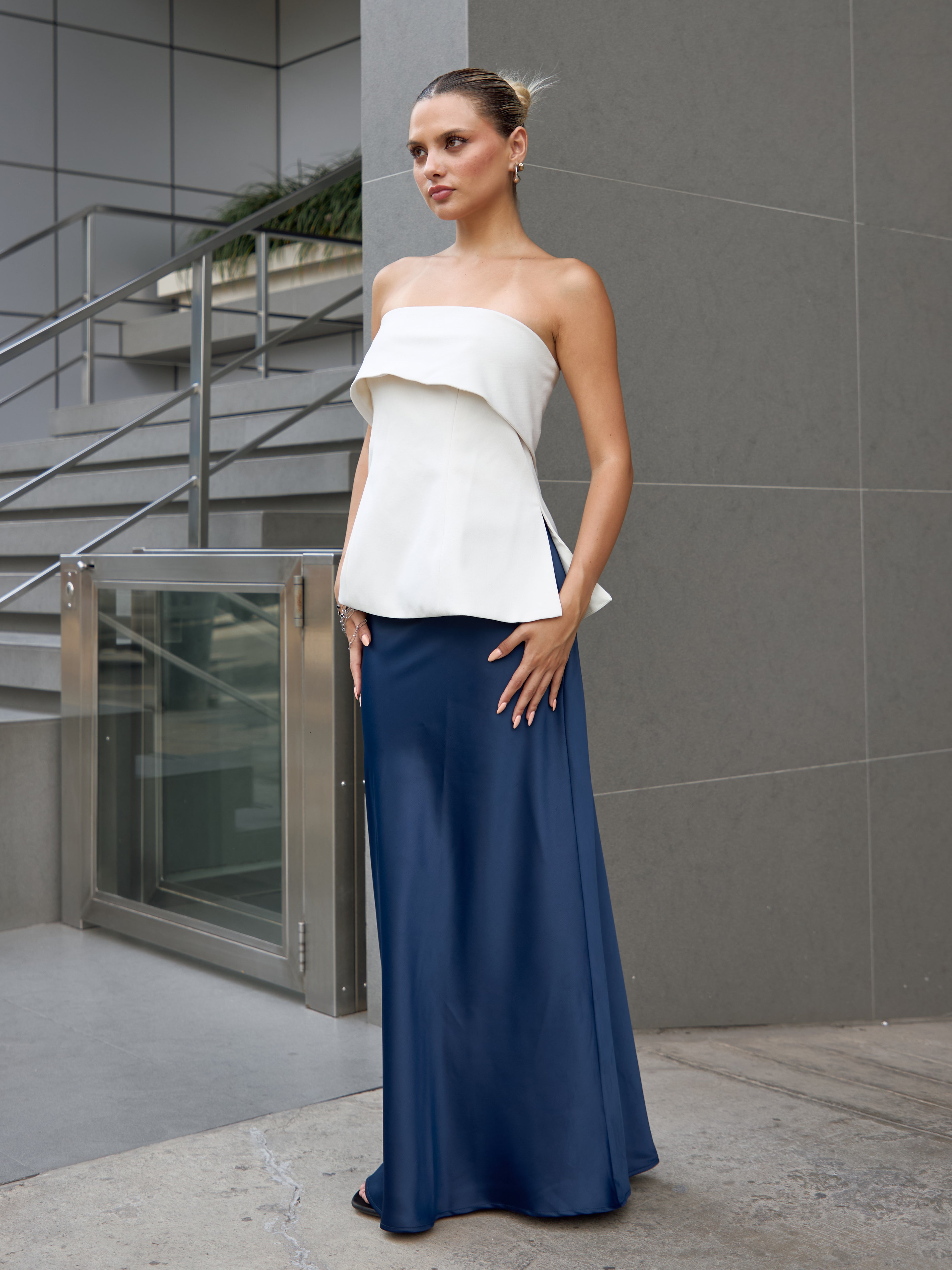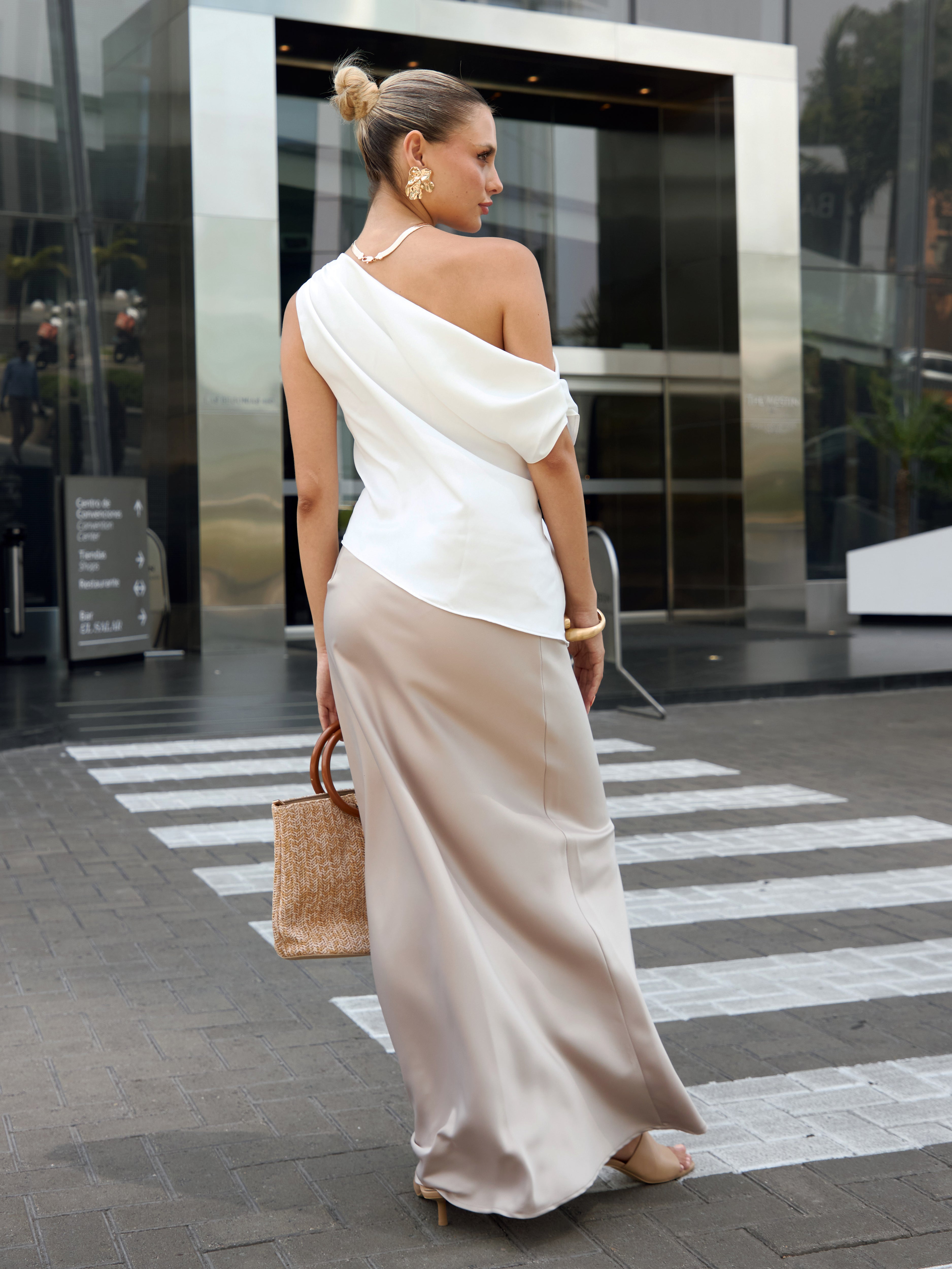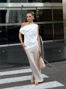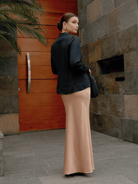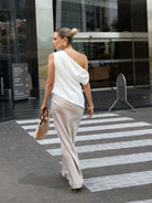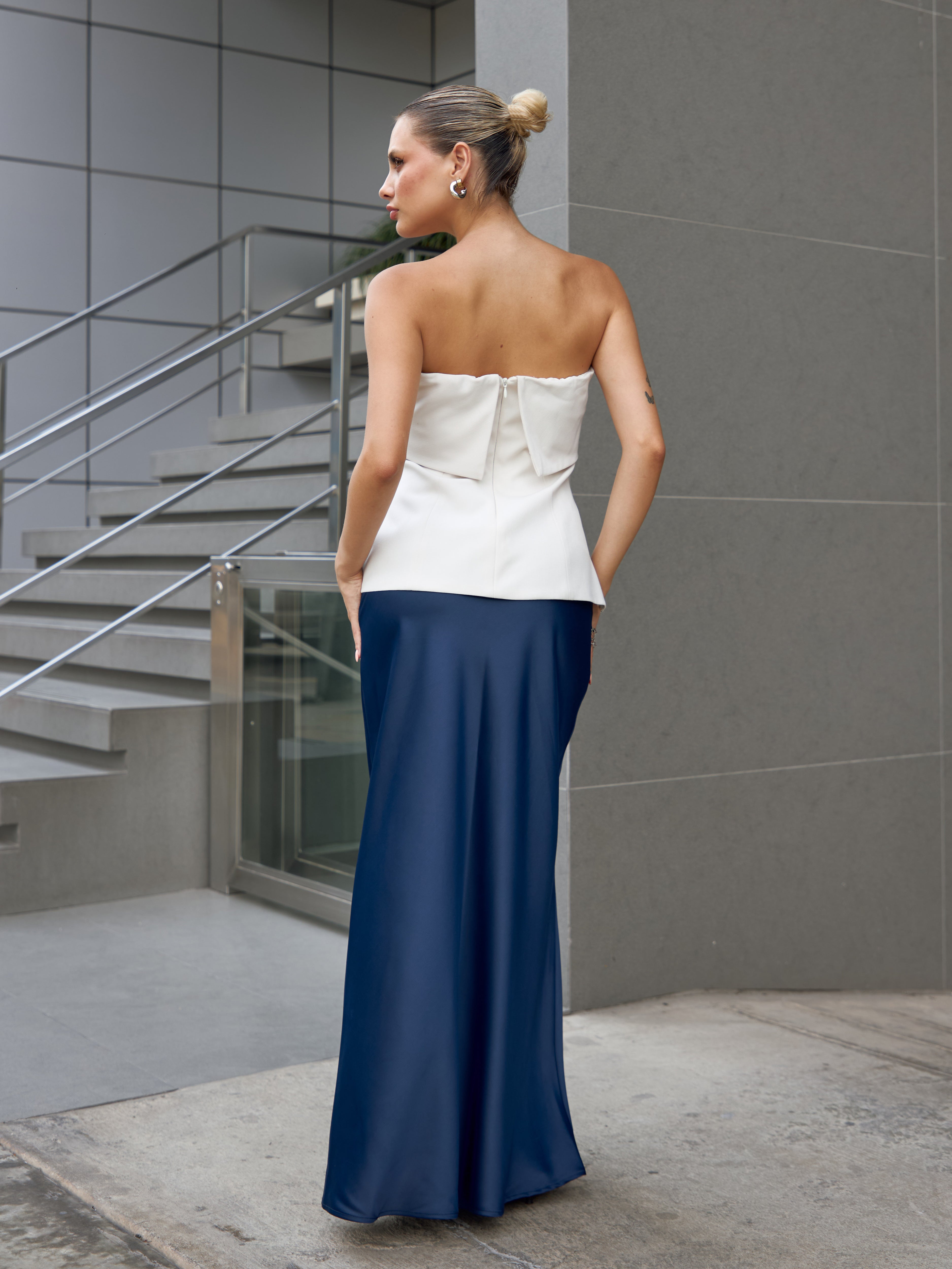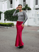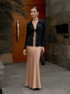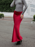 Falda larga con ligero brillo y suave caída. Modelo de talle alto, ligero vuelo en la parte baja y cierre invisible en la cintura.