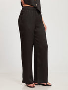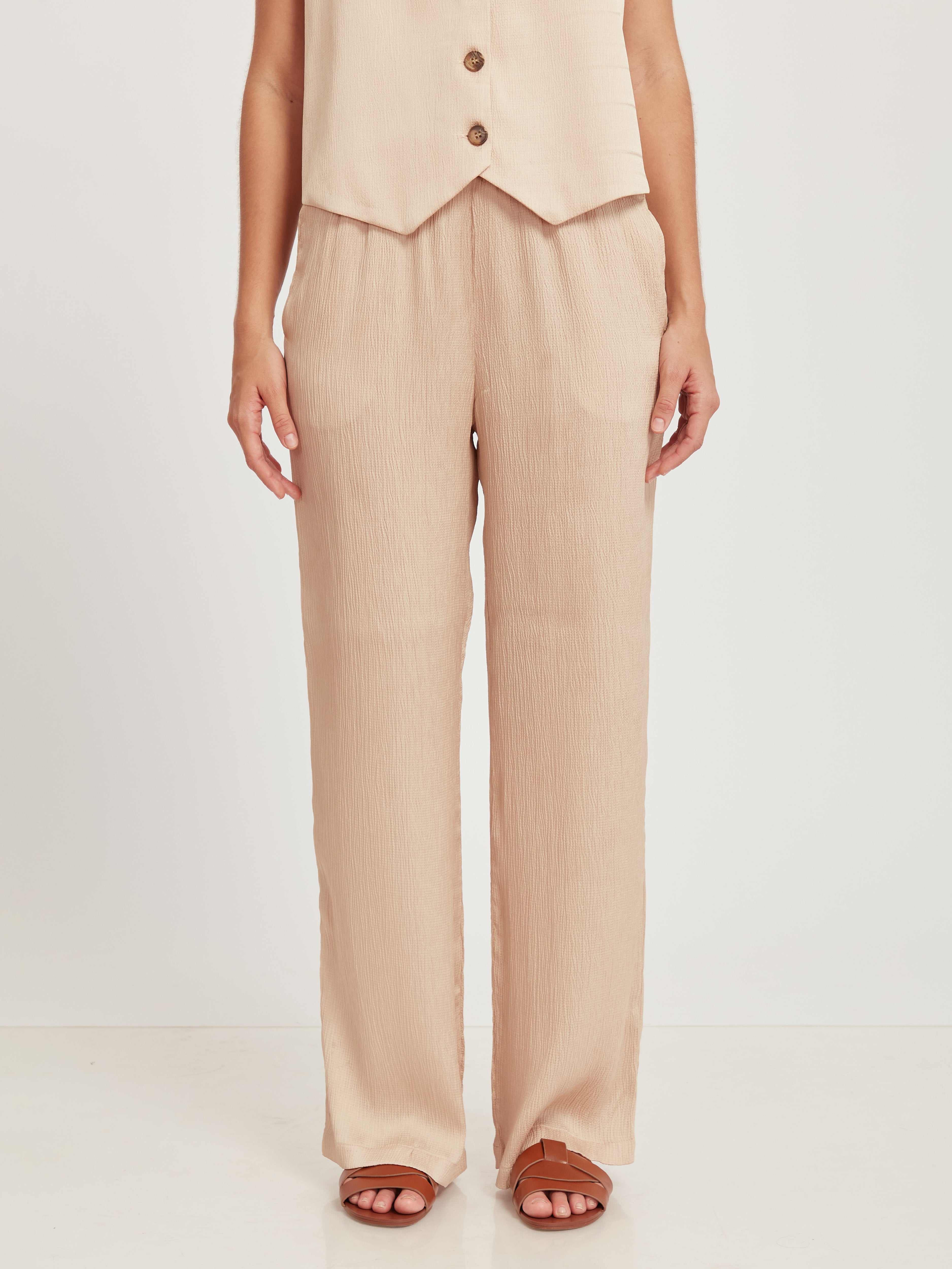Pantalón recto con dos pliegues, pretina elástica y tira.