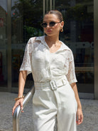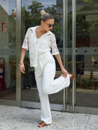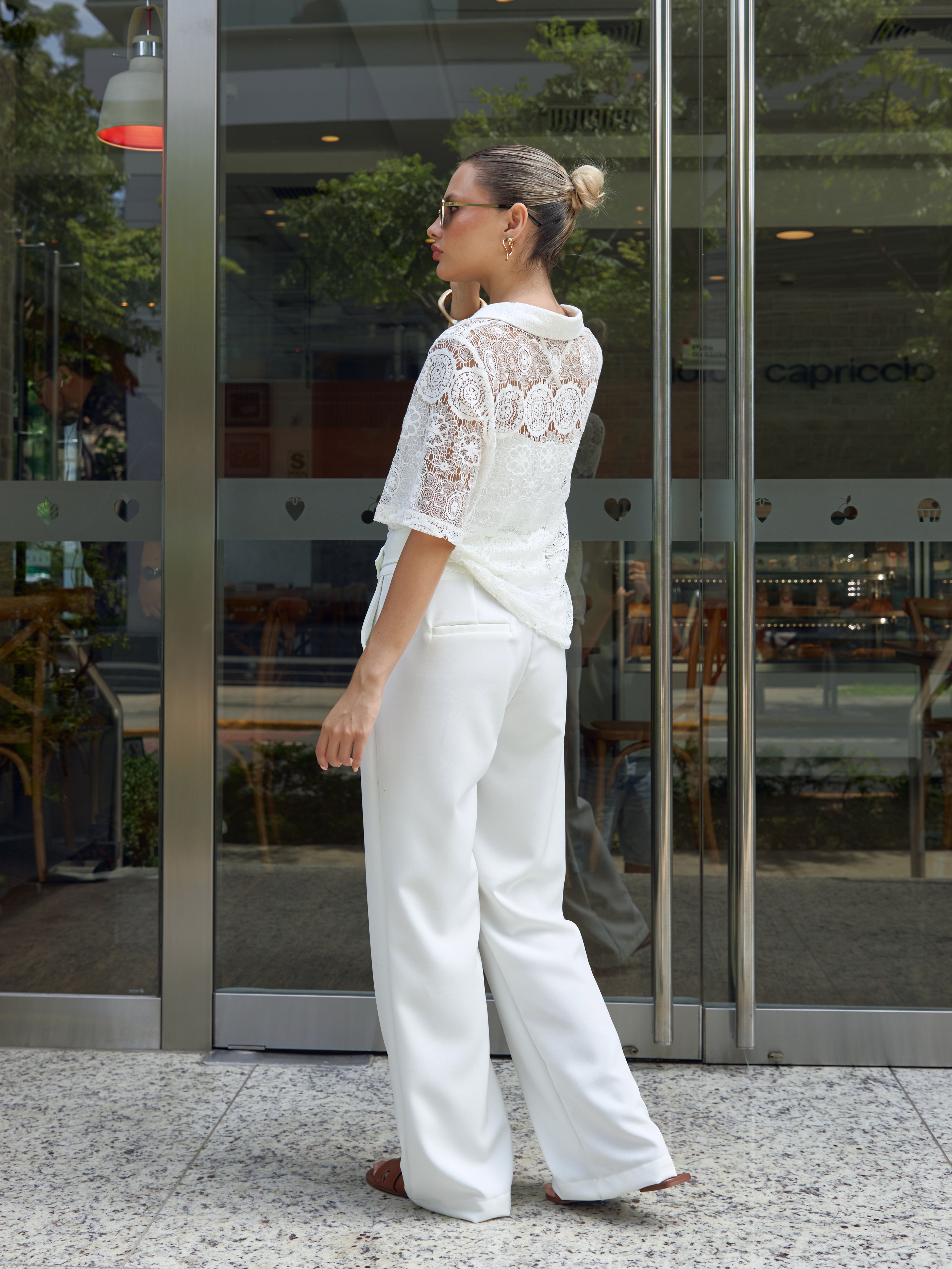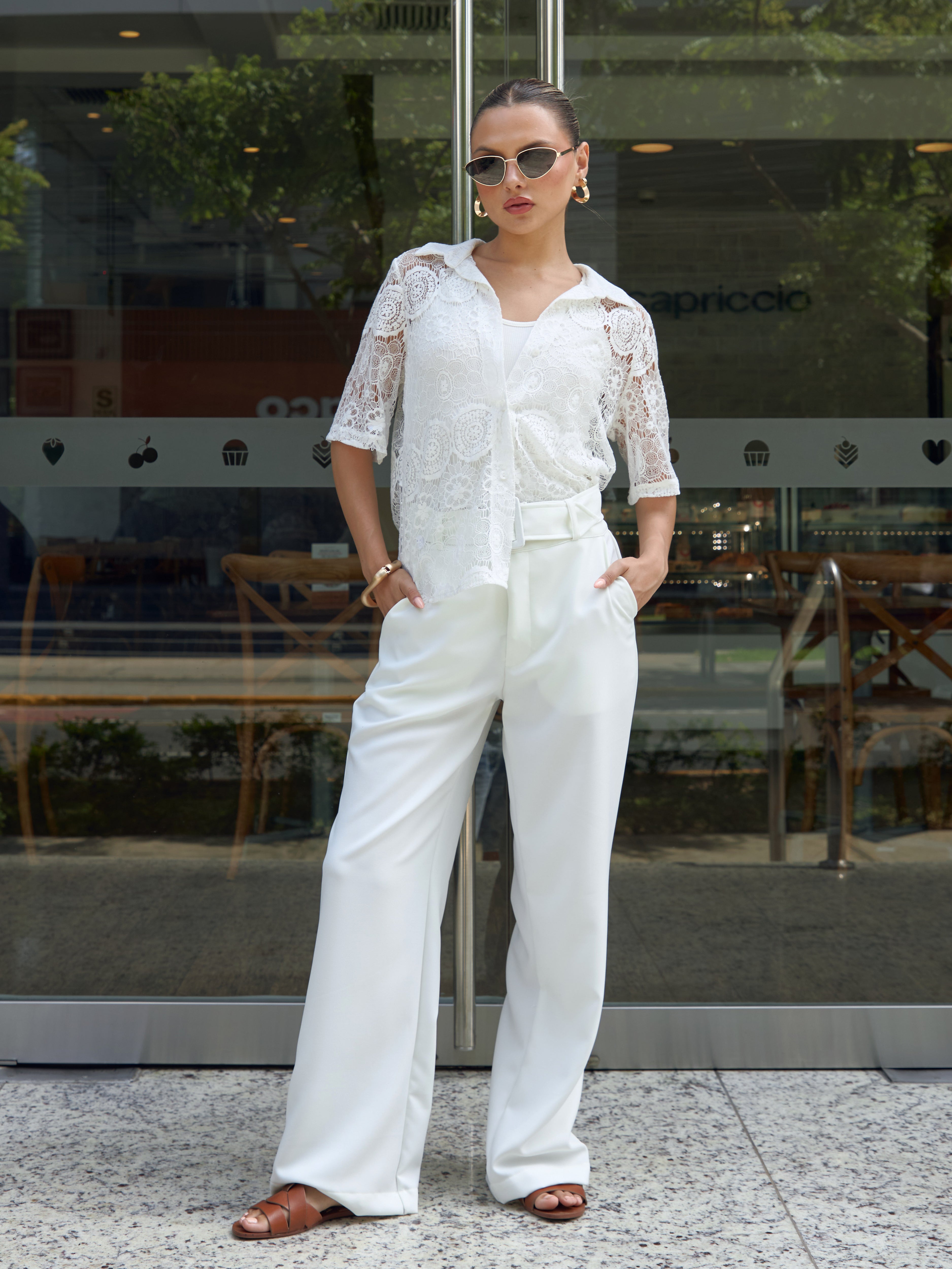 Pantalón recto de tiro alto con pretina ancha. Su cinturón a todo lo largo resalta el diseño y permite un ajuste perfecto a la cintura.