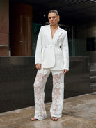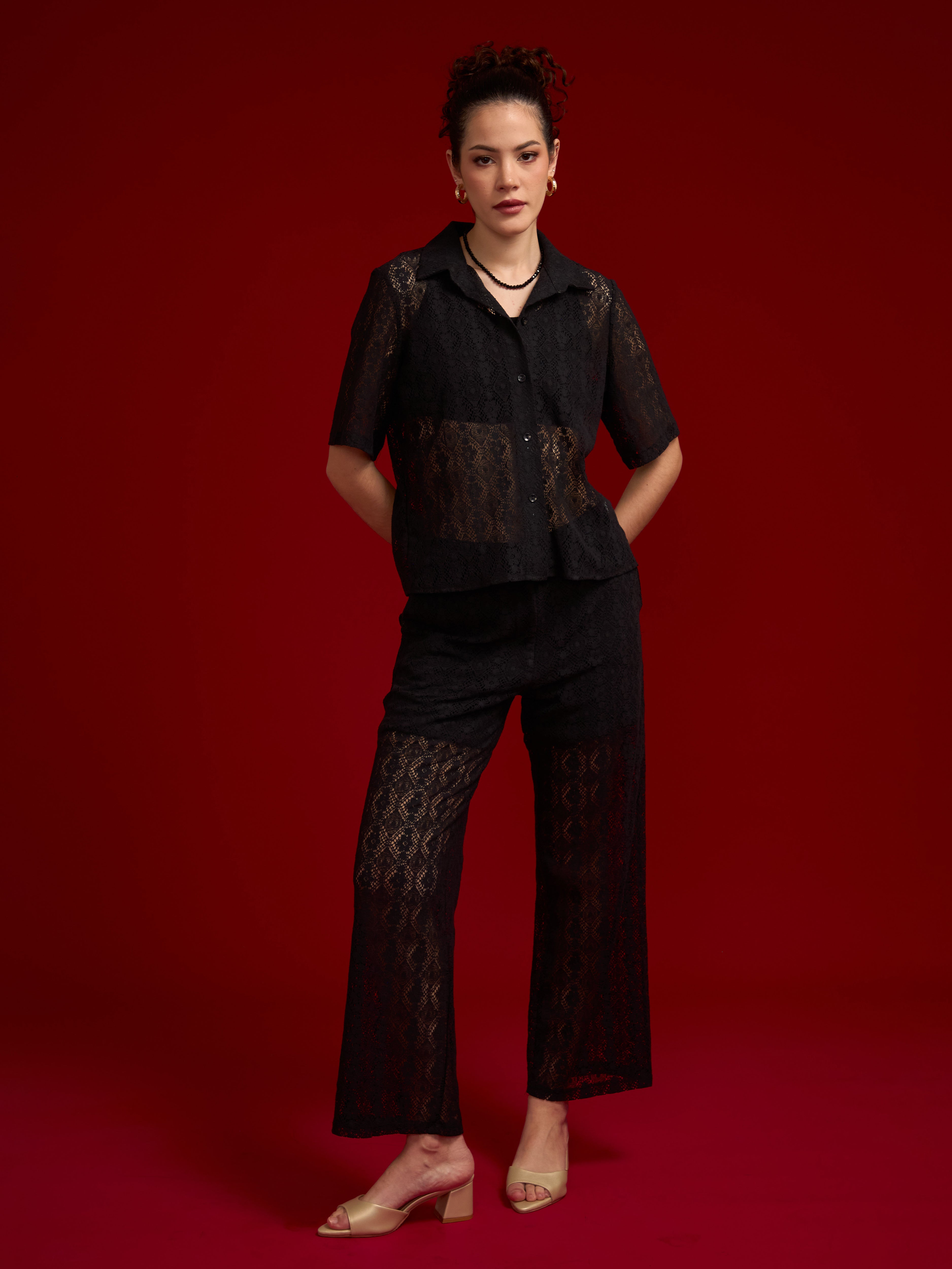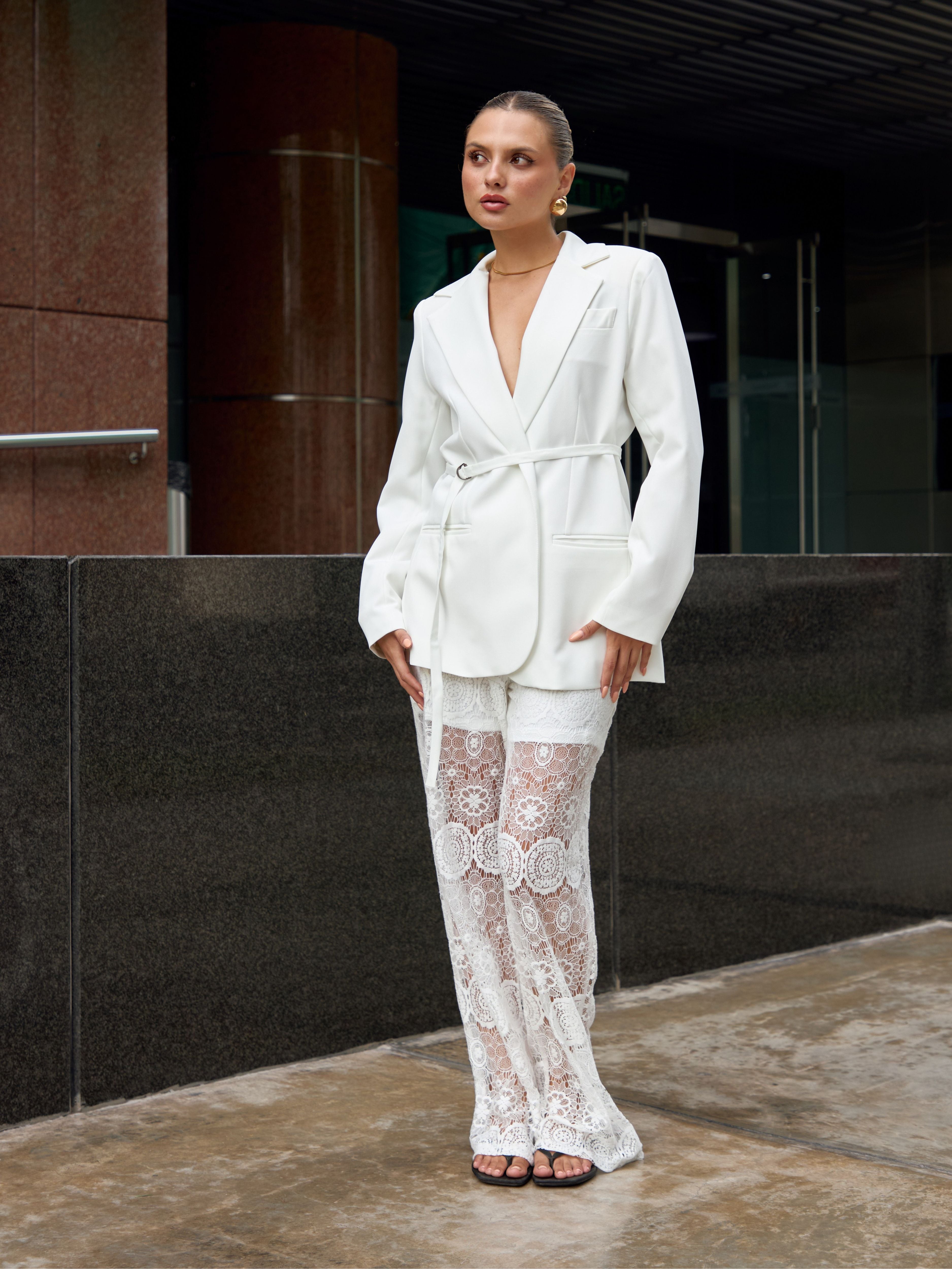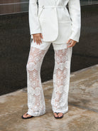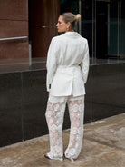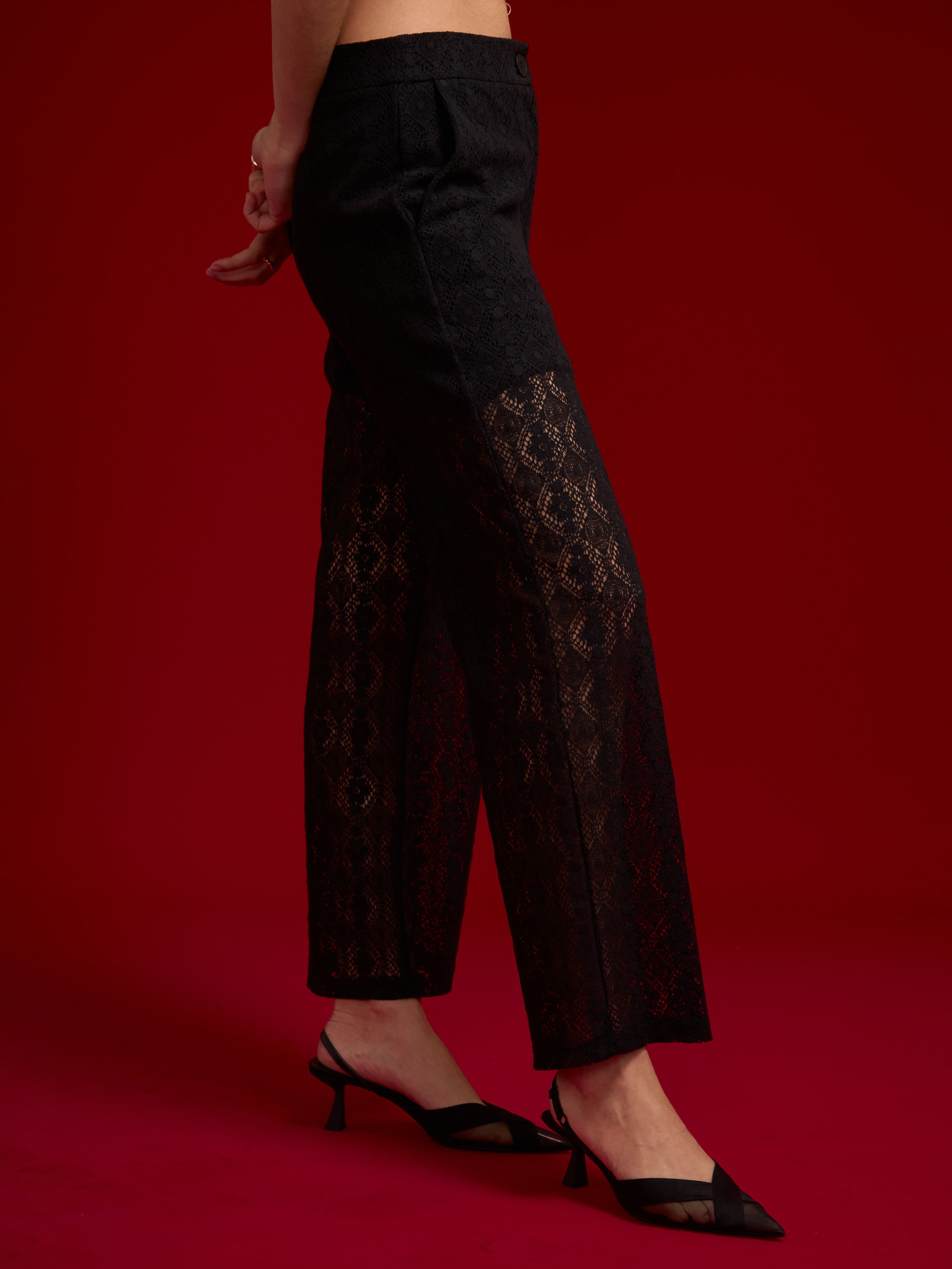 Pantalón de encaje de tiro alto con corte recto. Su diseño presenta un delicado encaje que aporta un toque sofisticado y femenino, mientras que el short de forro asegura mayor comodidad y cobertura.
