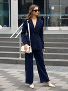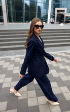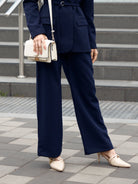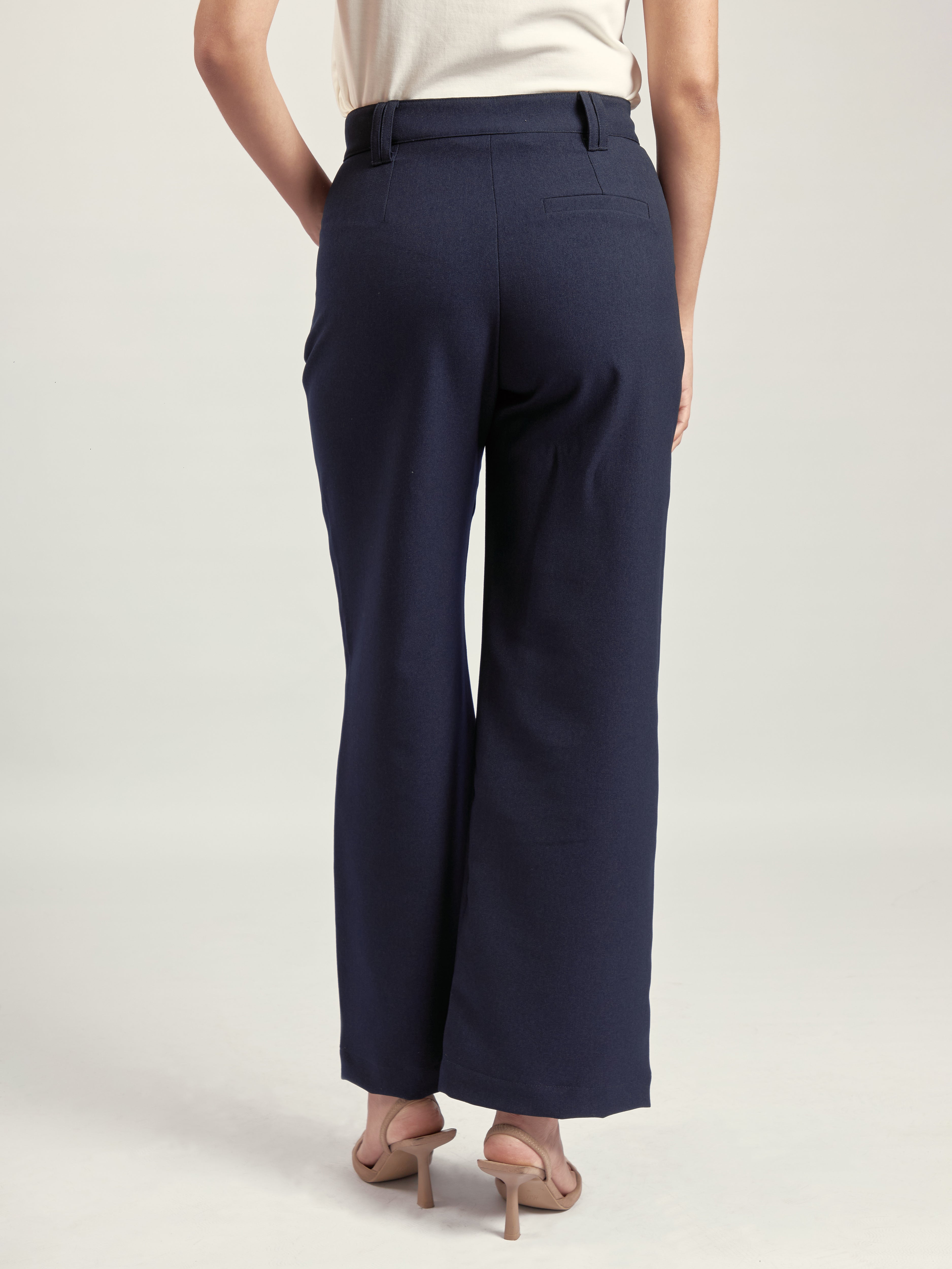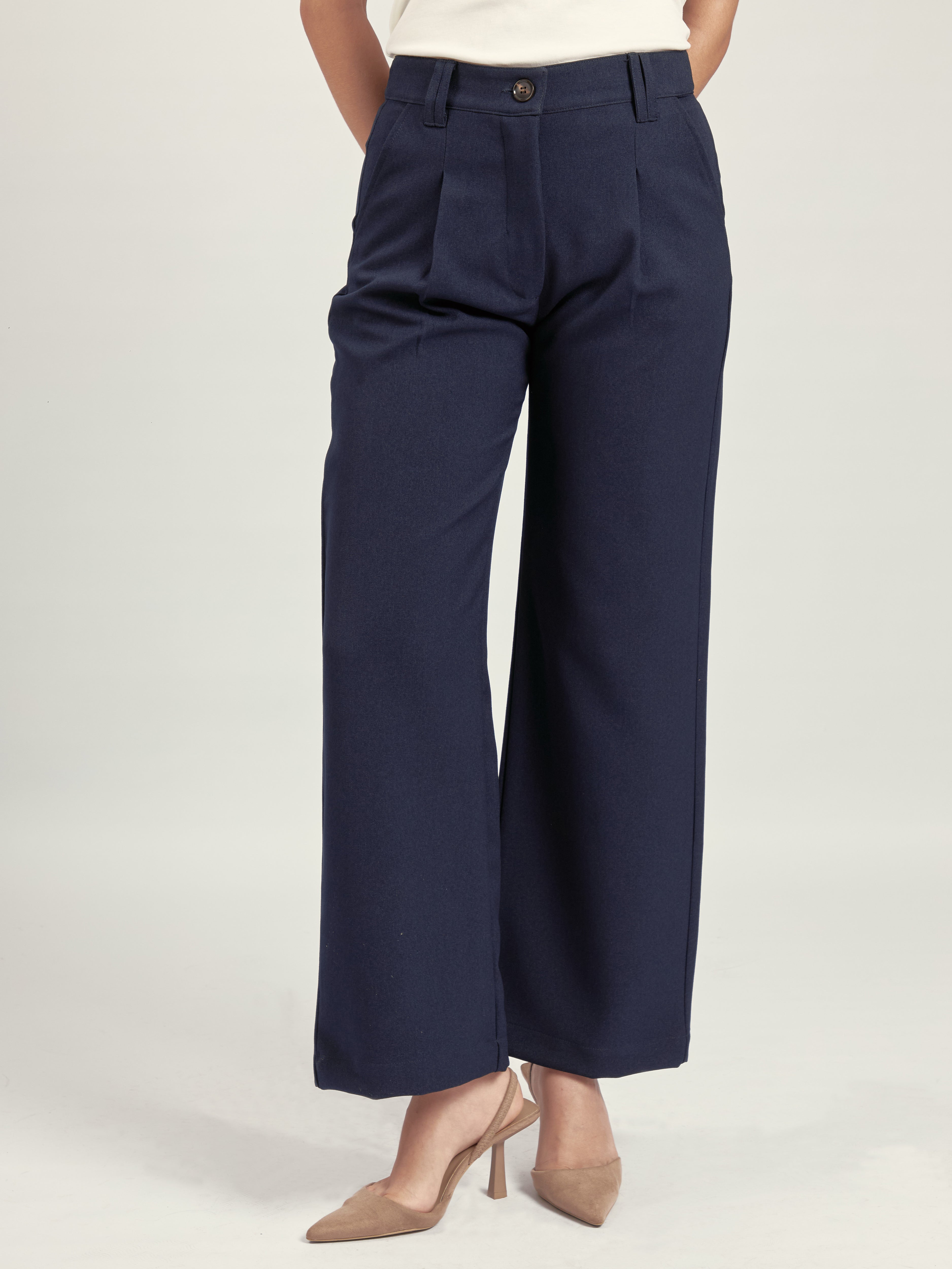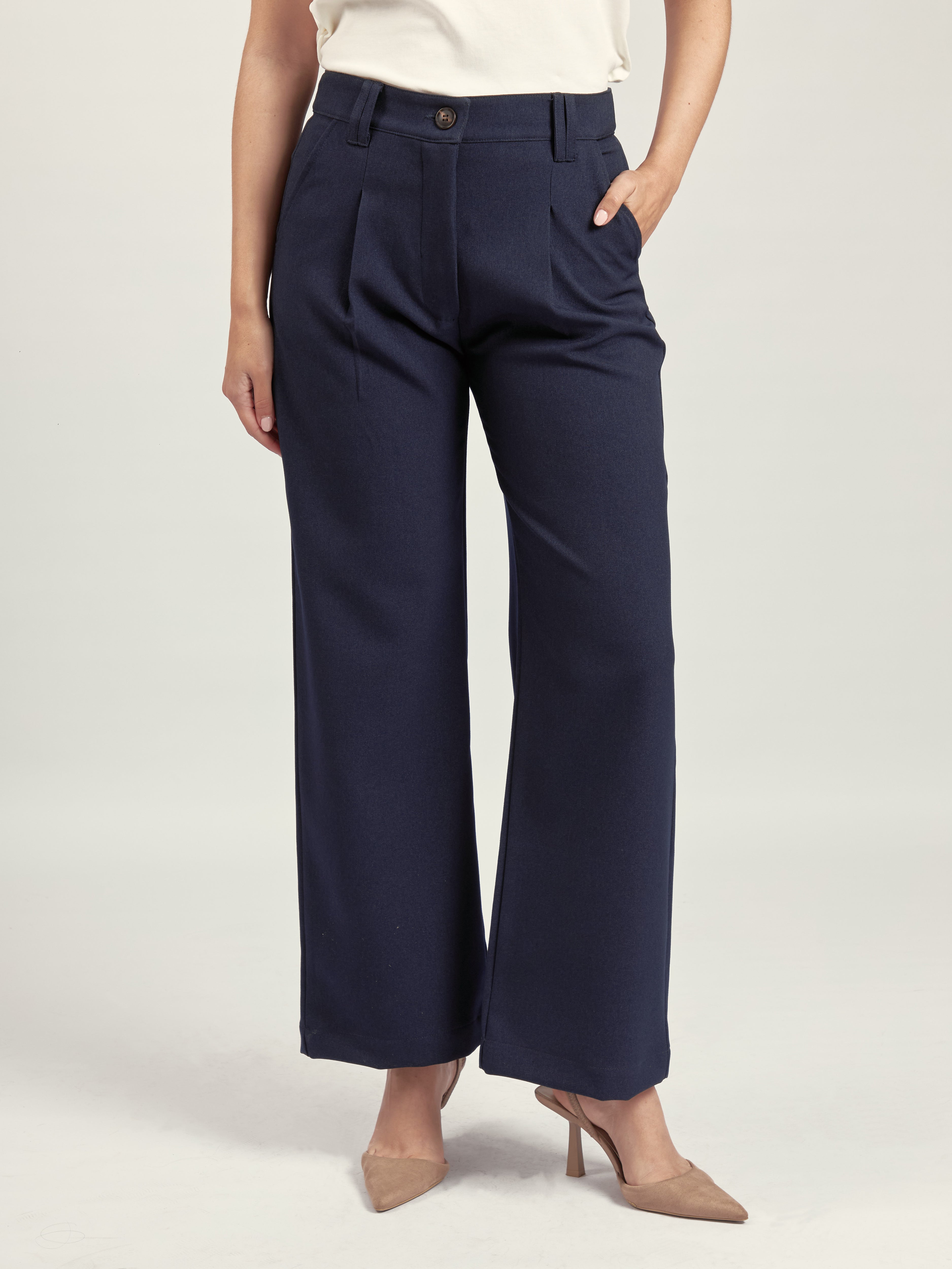 Pantalón de corte recto con pinzas y bolsillos delanteros. Con presillas en la cintura y bolsillo tipo vista pestaña en la parte posterior.