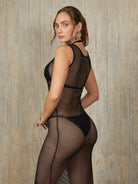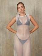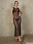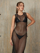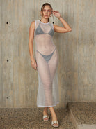 Salida de baño tipo vestido largo corte recto, elaborada en tejido tipo net. Cuello redondo y sin mangas. Opción ideal para lucir fresca y elegante en la playa o junto a la piscina.