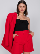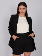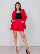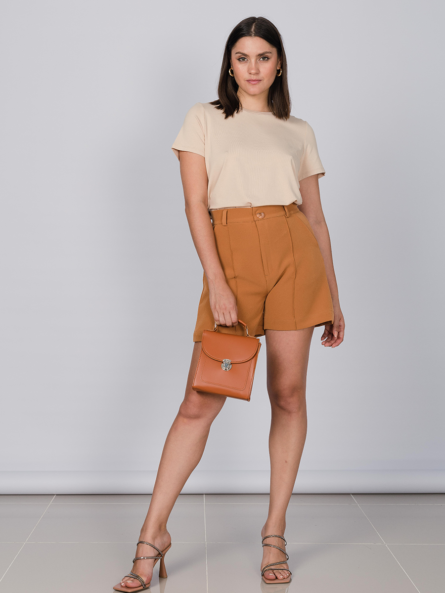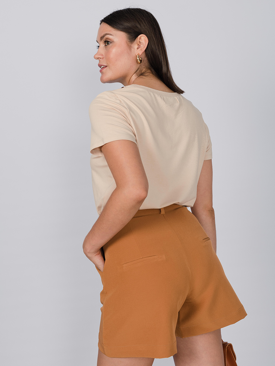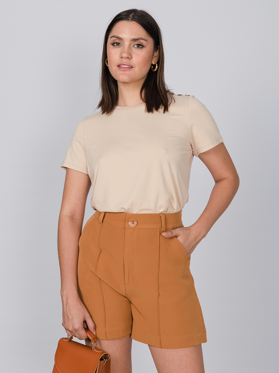 Short básico con pliegues y bolsillos delanteros. Cierre y botón frontal, dos pinzas en la parte posterior y dos bolsillos decorativos.