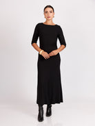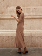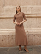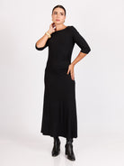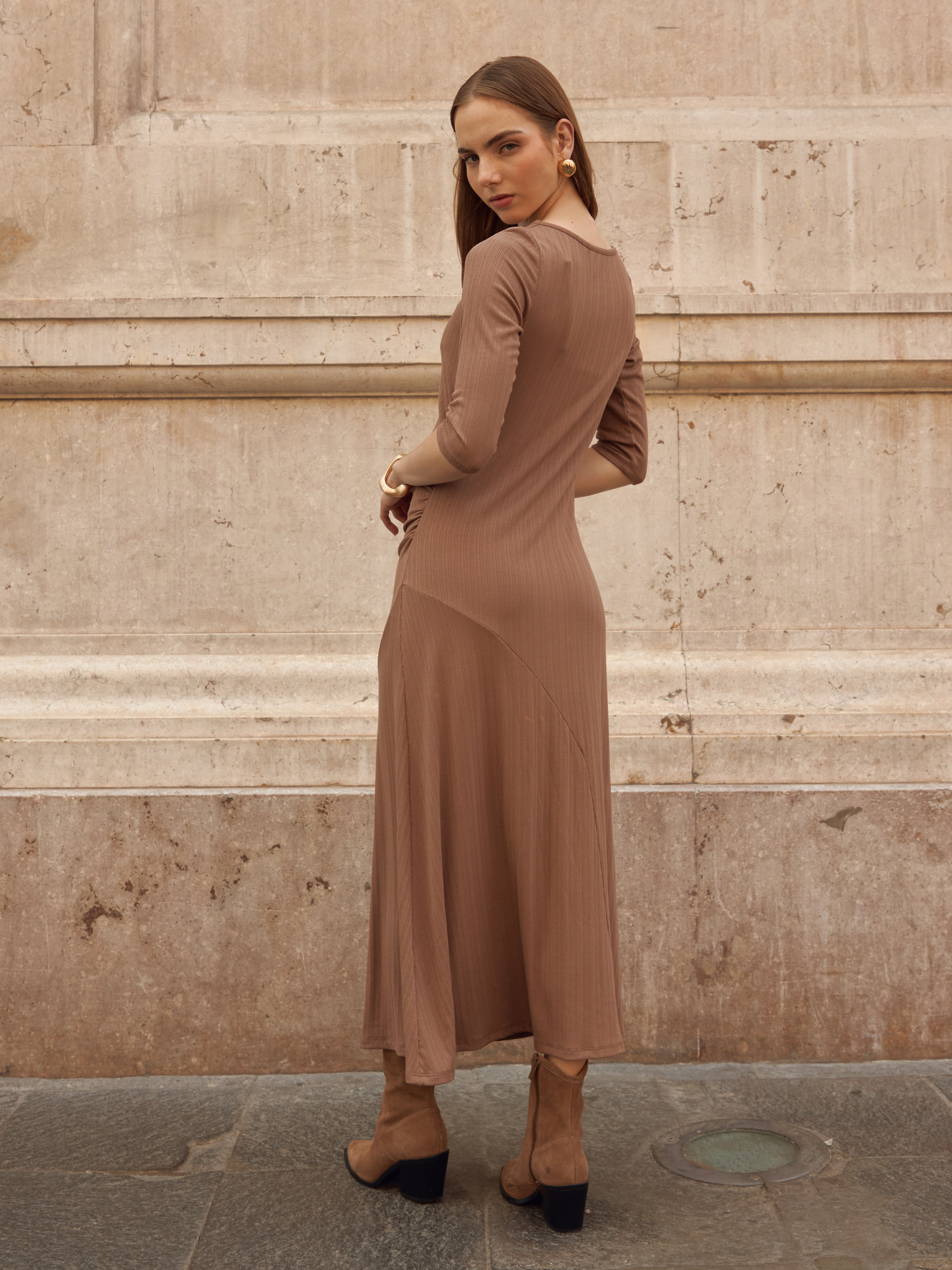Vestido con cuello bote, que enmarca delicadamente los hombros. Con mangas tres cuartos y cintura fruncida que define la silueta con suavidad, mientras que el faldón de corte asimétrico aporta movimiento y un toque moderno al diseño.