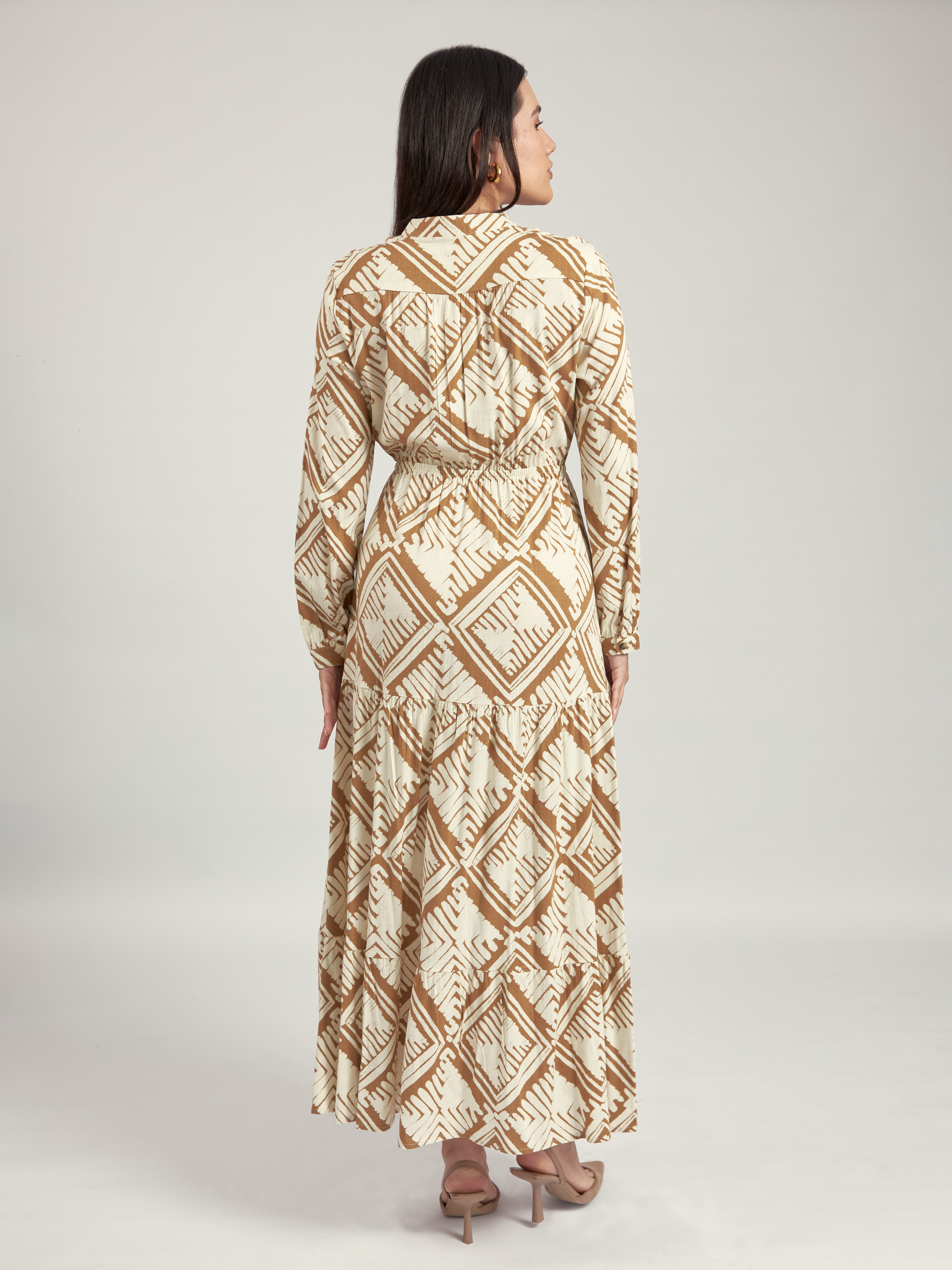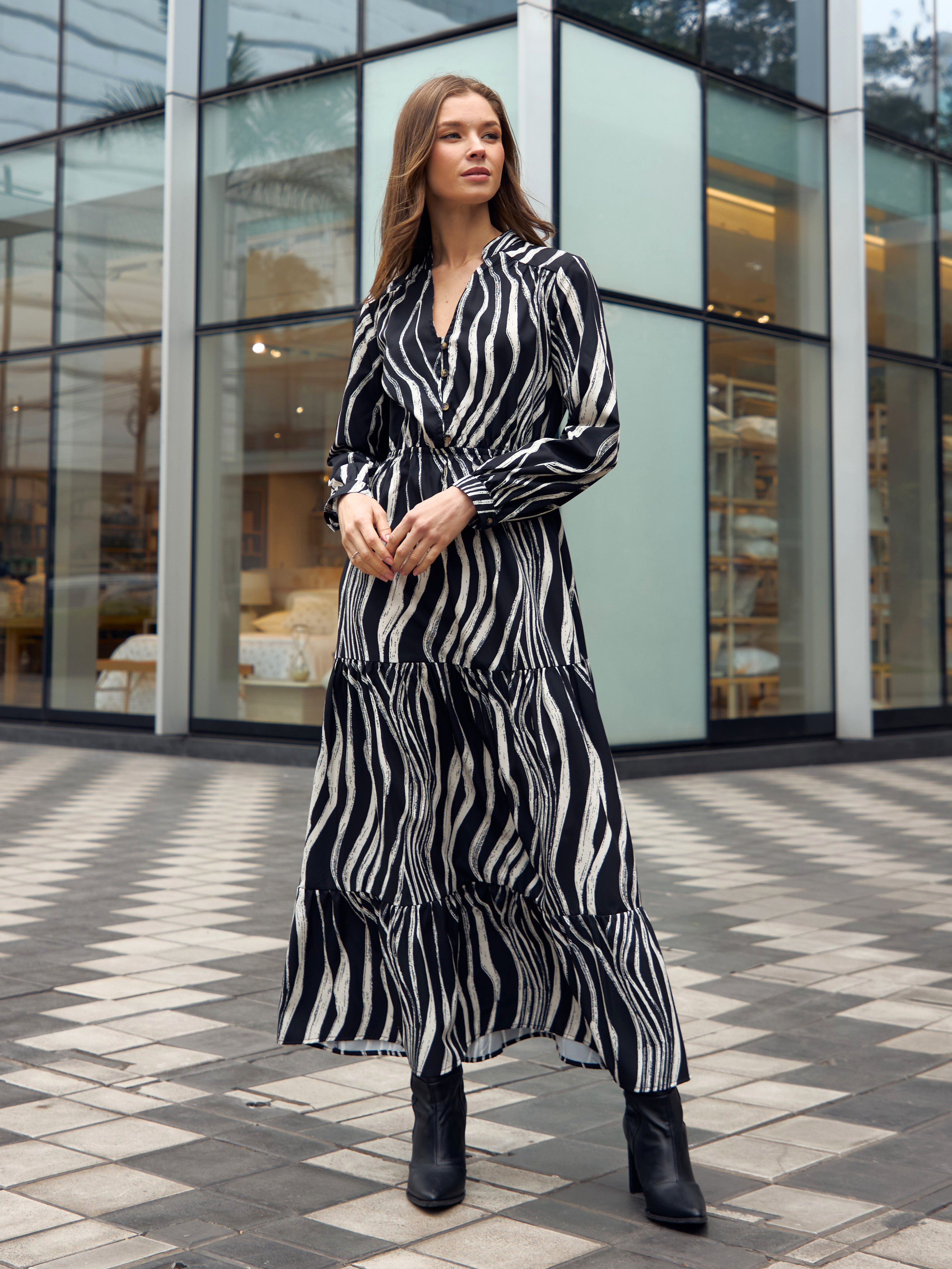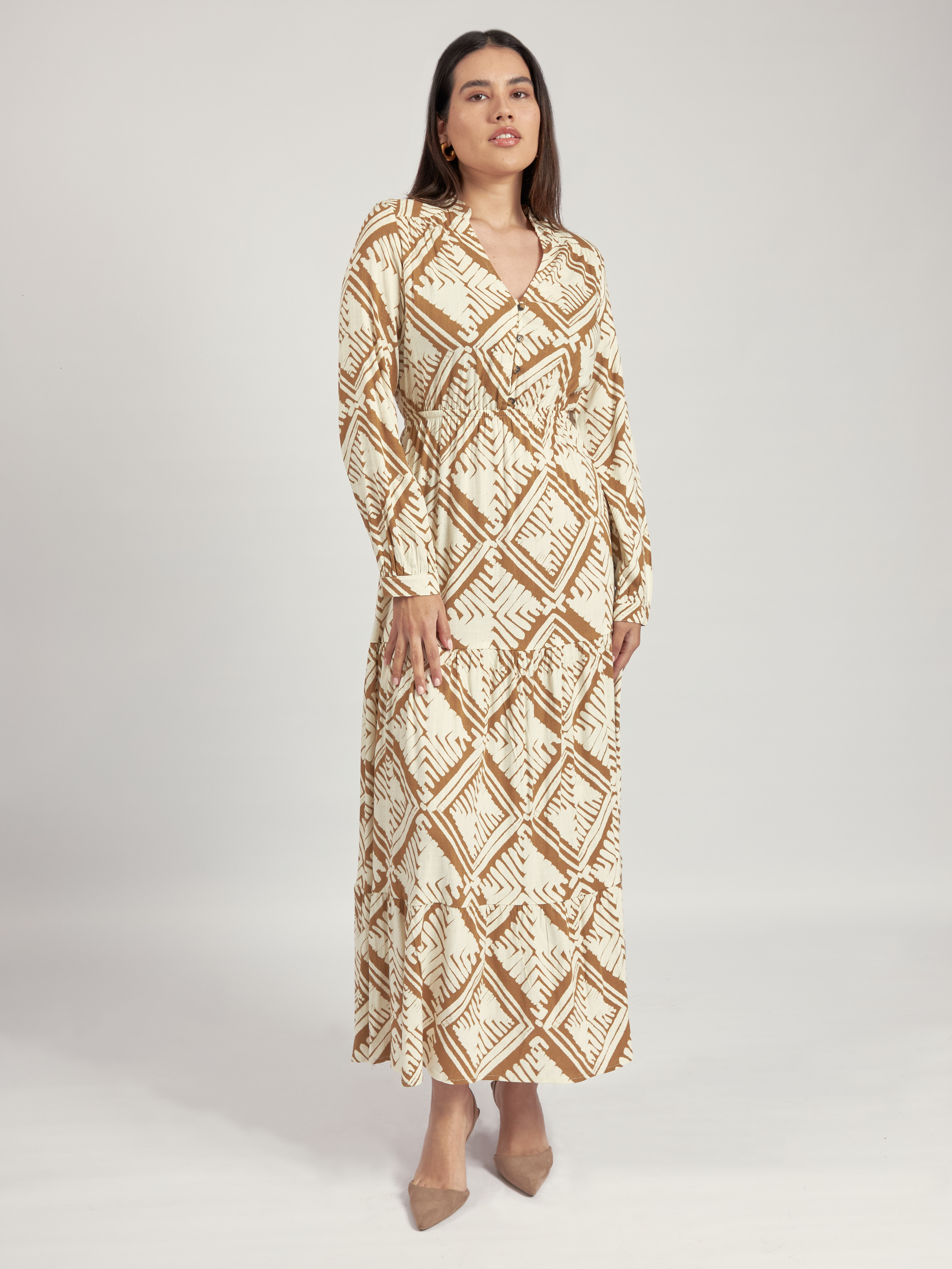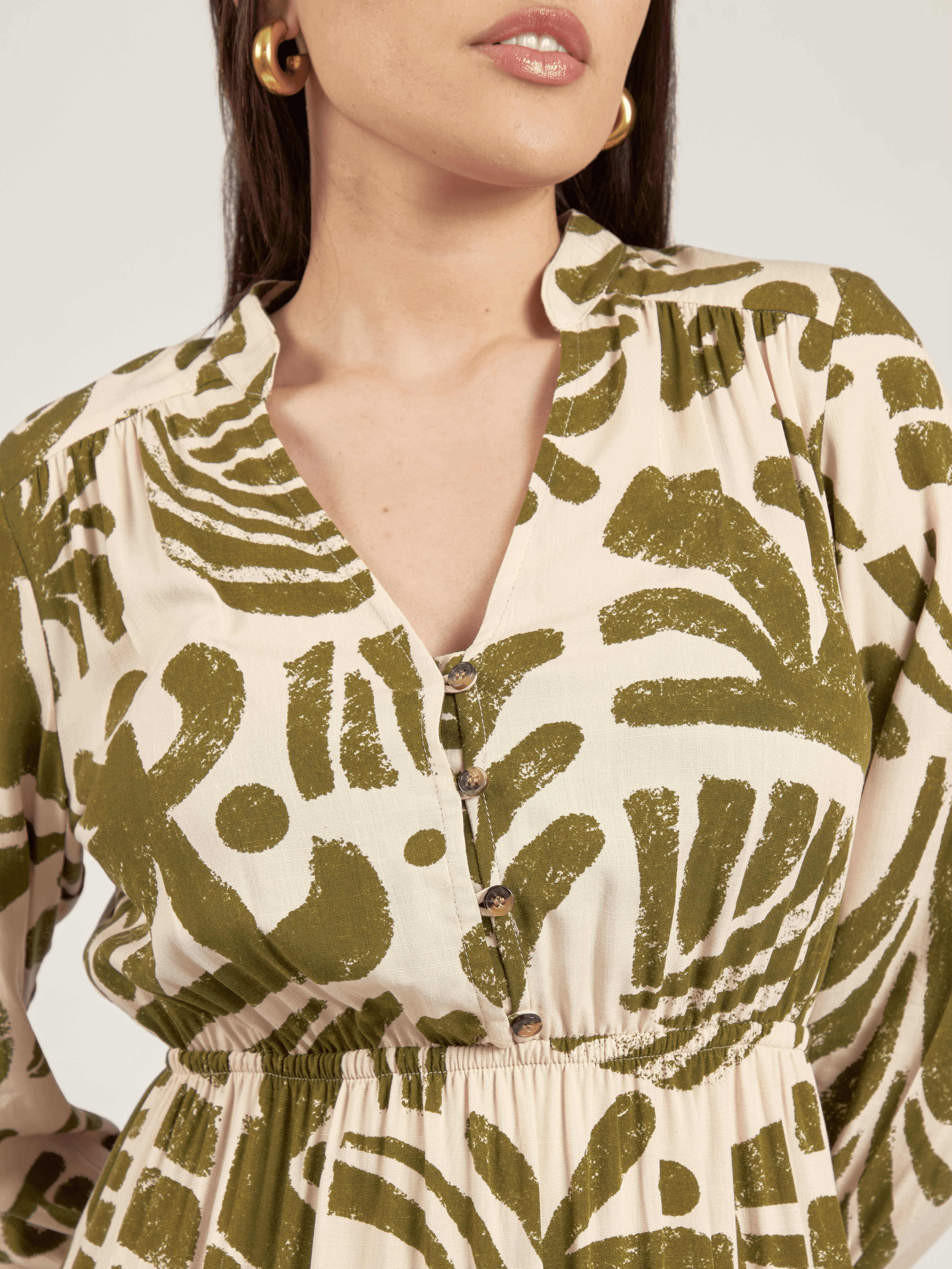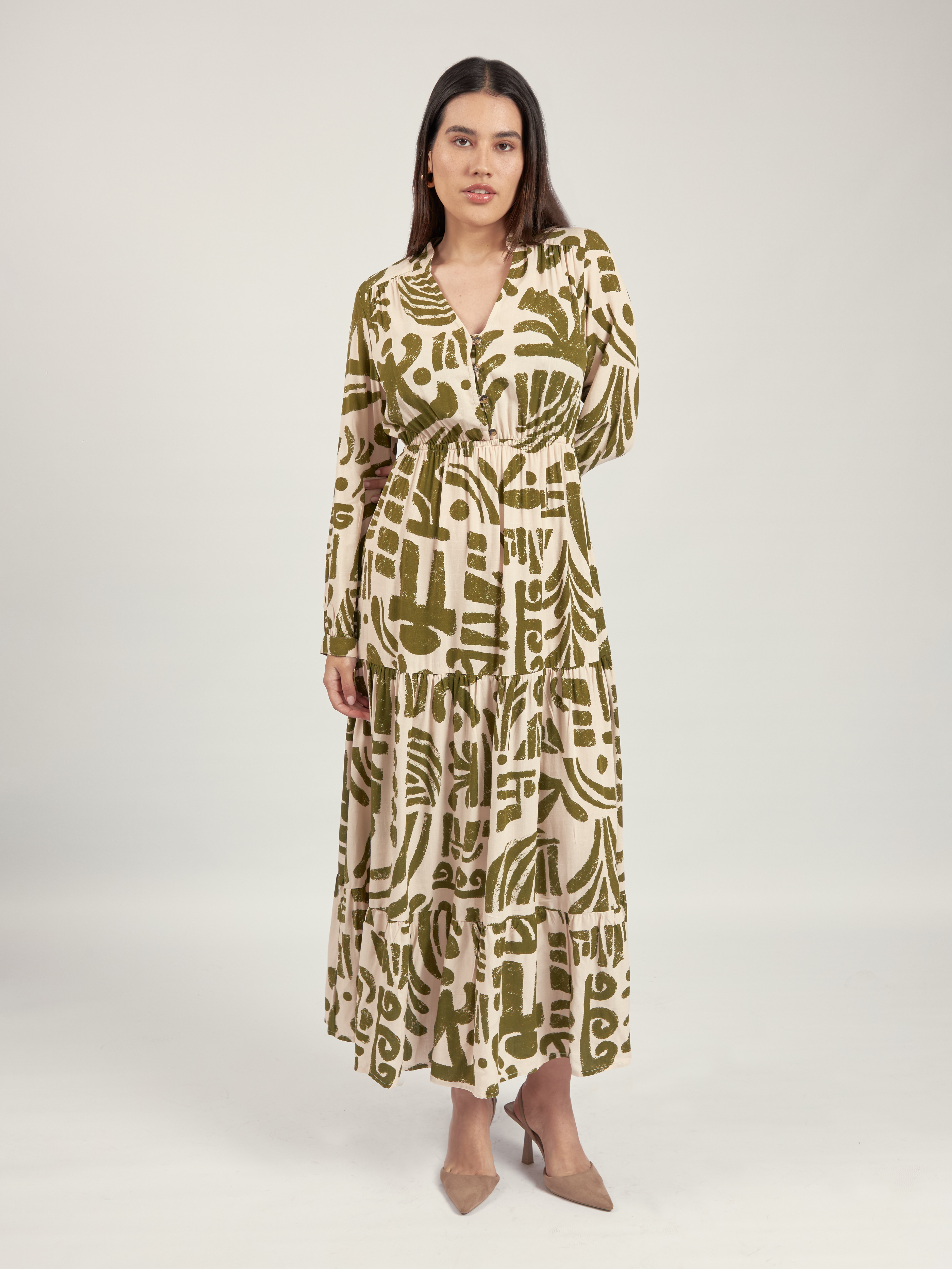 Vestido largo con escote V y cuatro botones delanteros. Puño en la manga, elástico en la cintura y recogido en la falda.