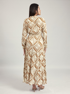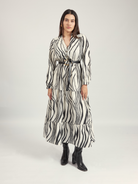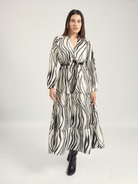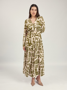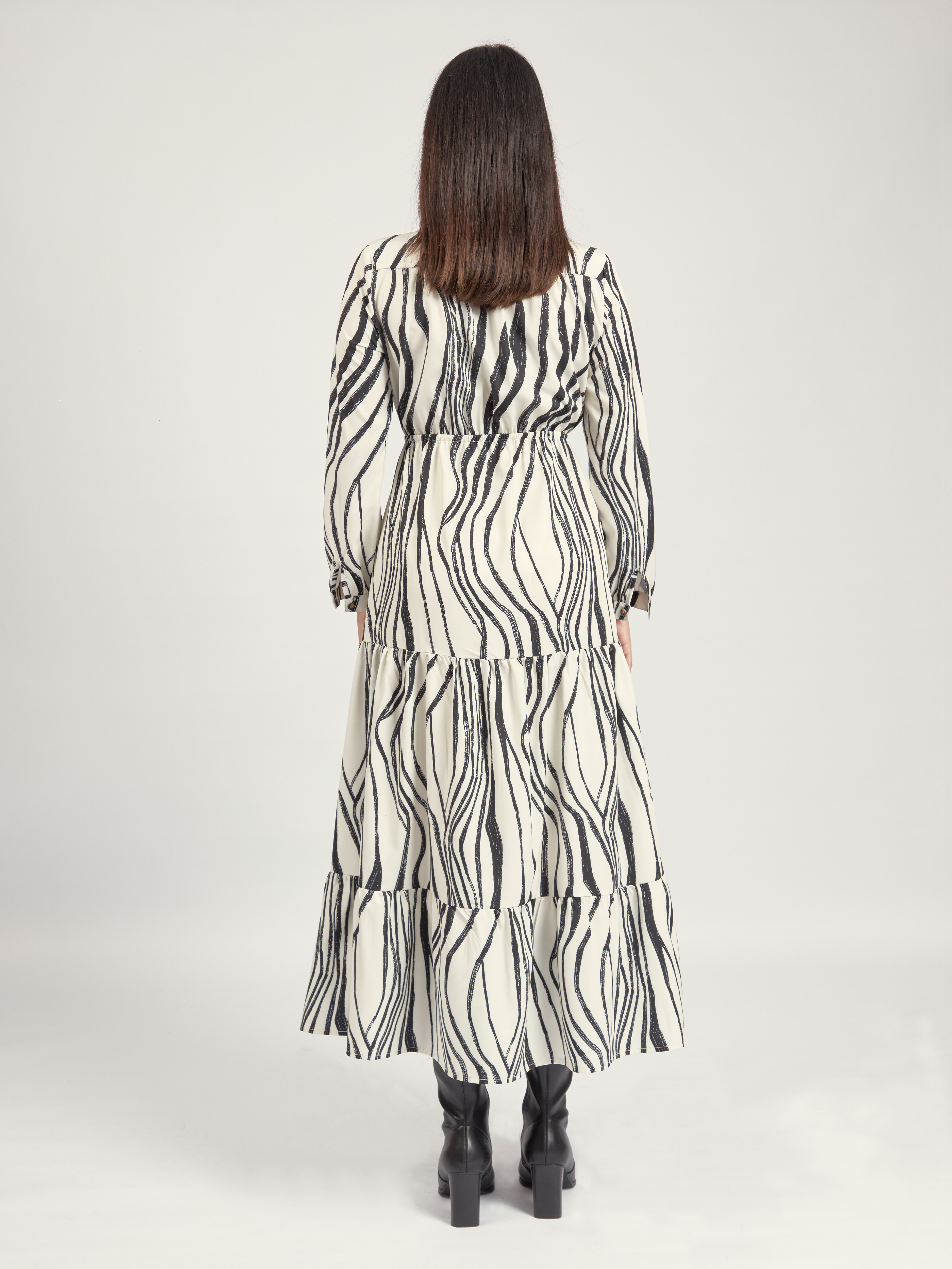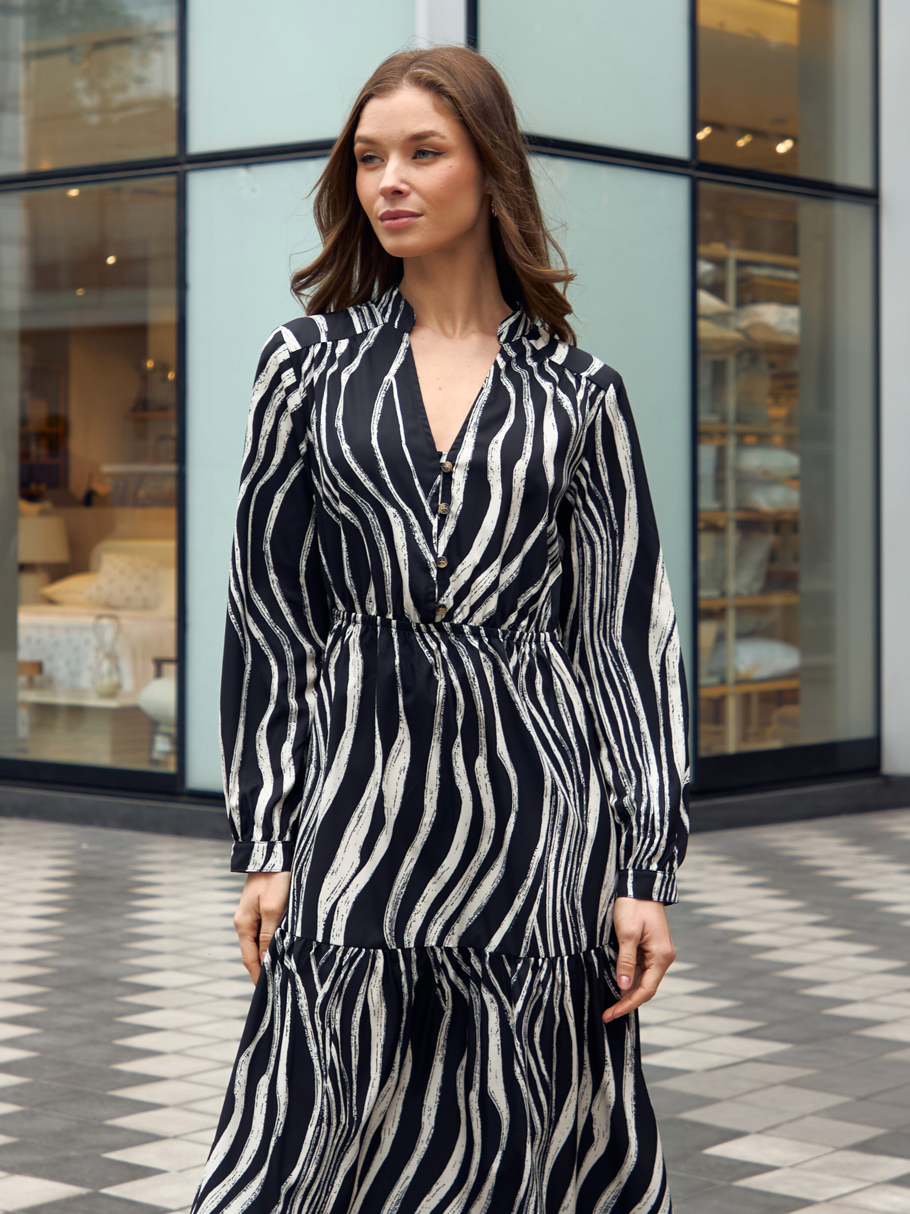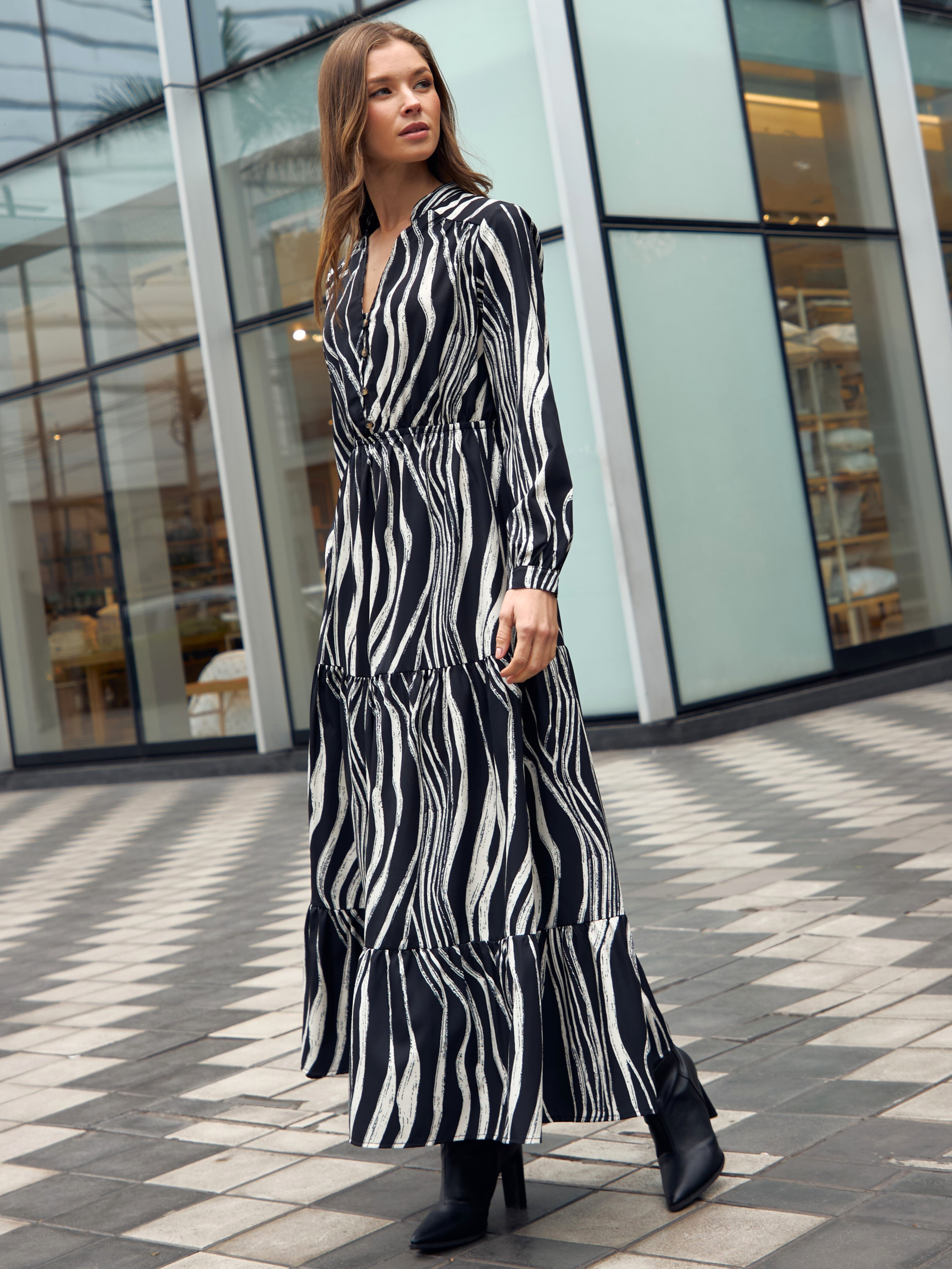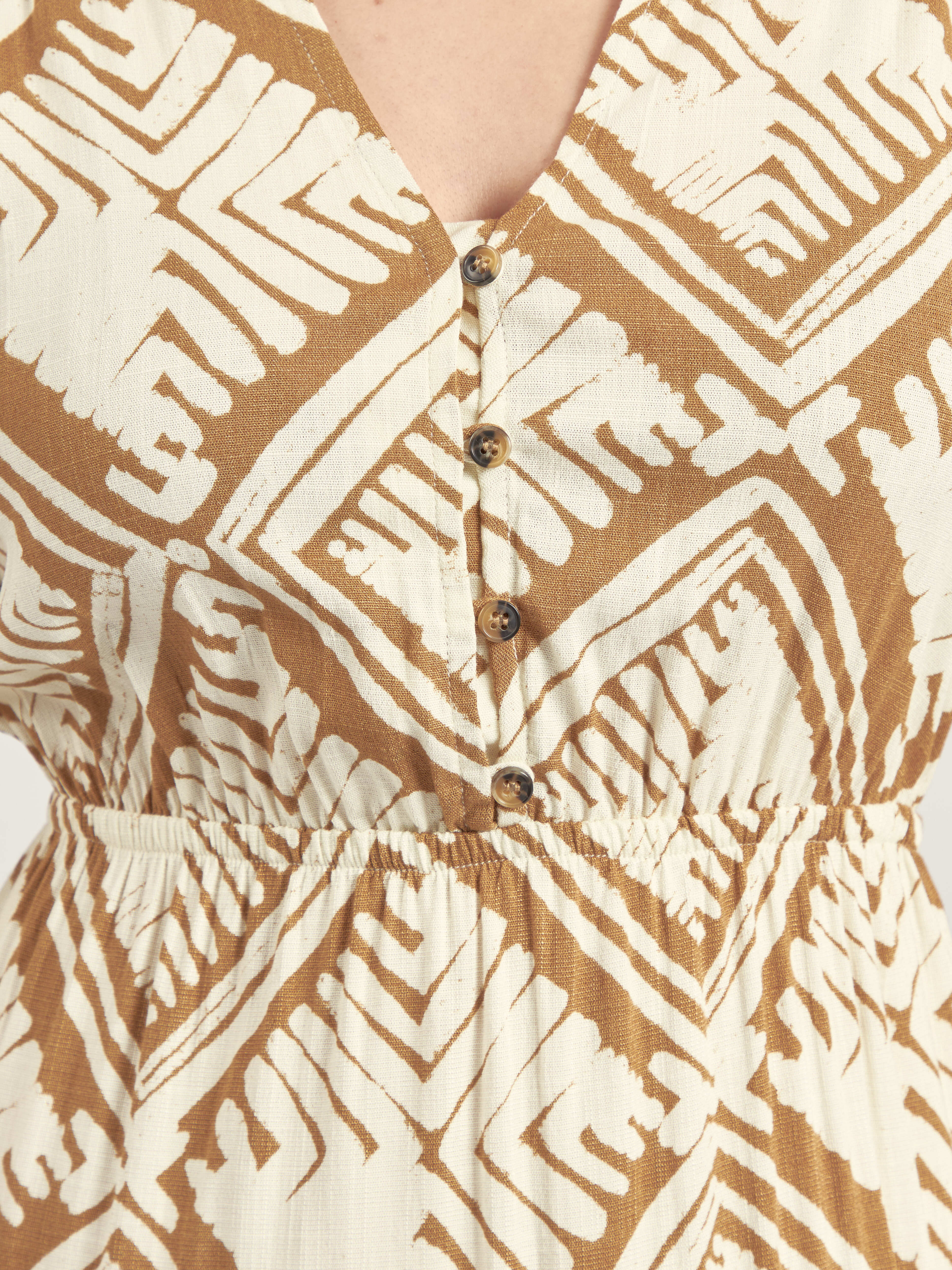Vestido largo con escote V y cuatro botones delanteros. Puño en la manga, elástico en la cintura y recogido en la falda.