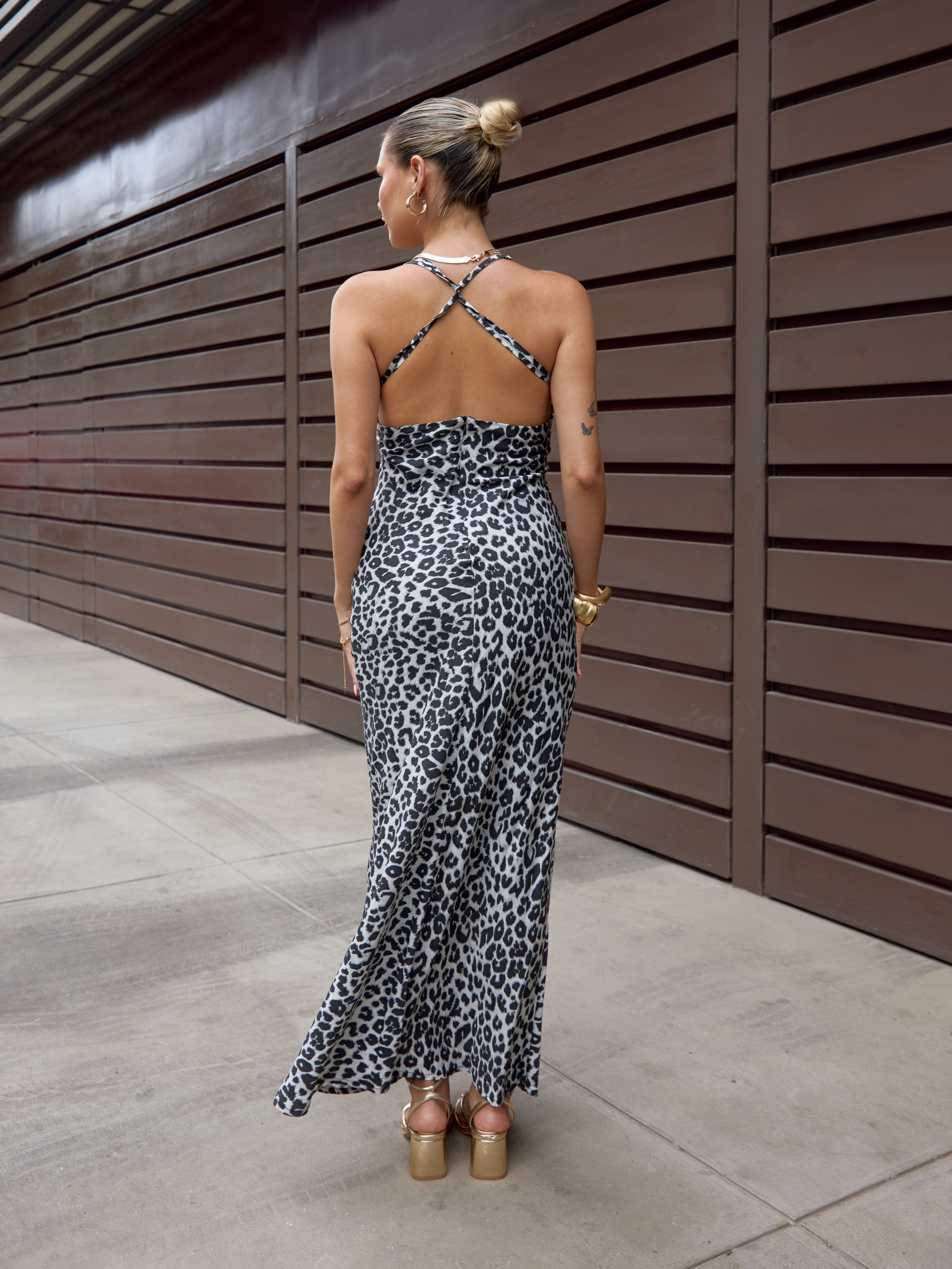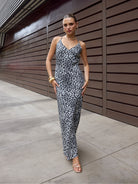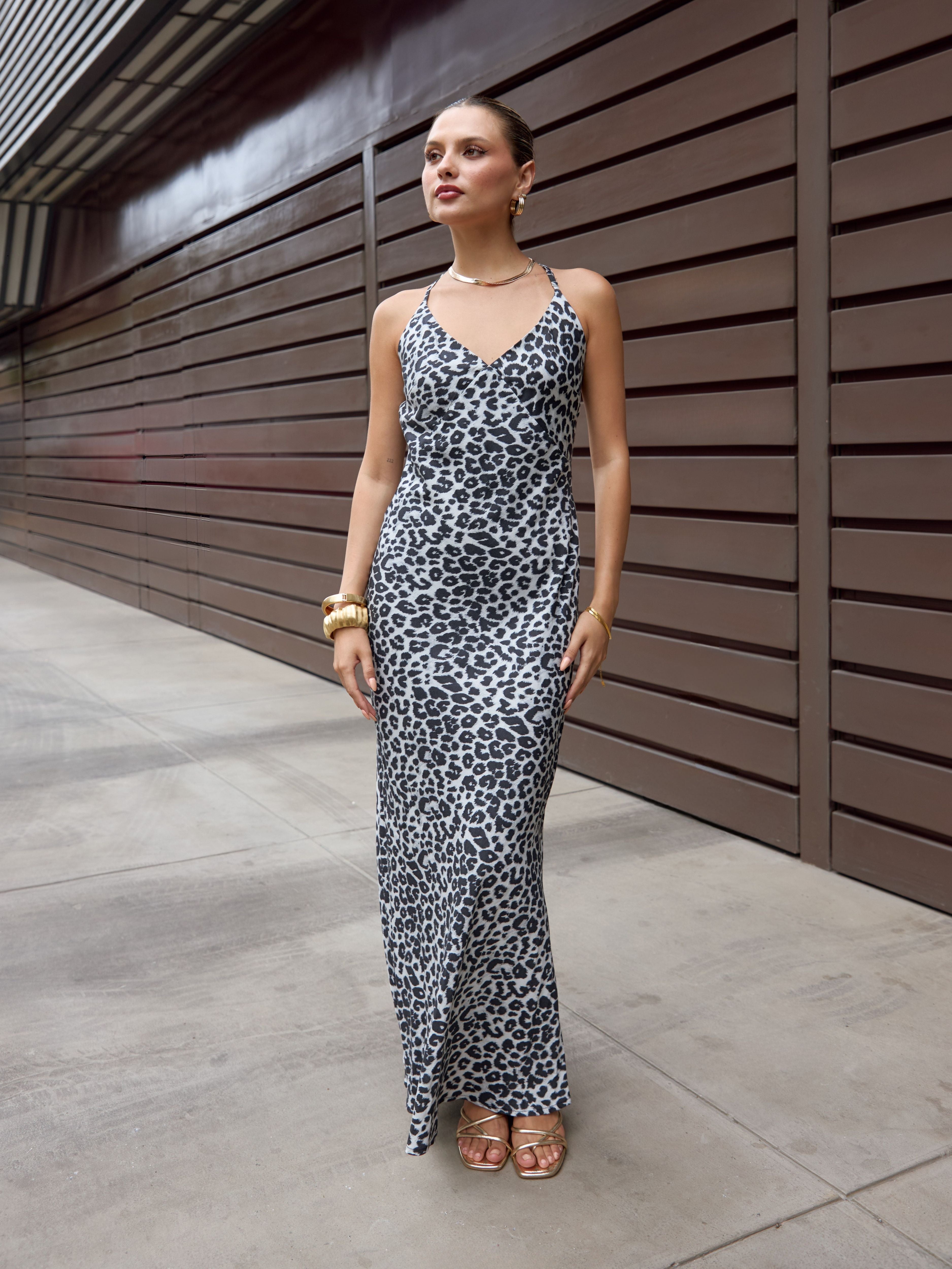 Vestido largo con escote en V, diseño de caída recta que estiliza la figura y tiras cruzadas en la espalda.