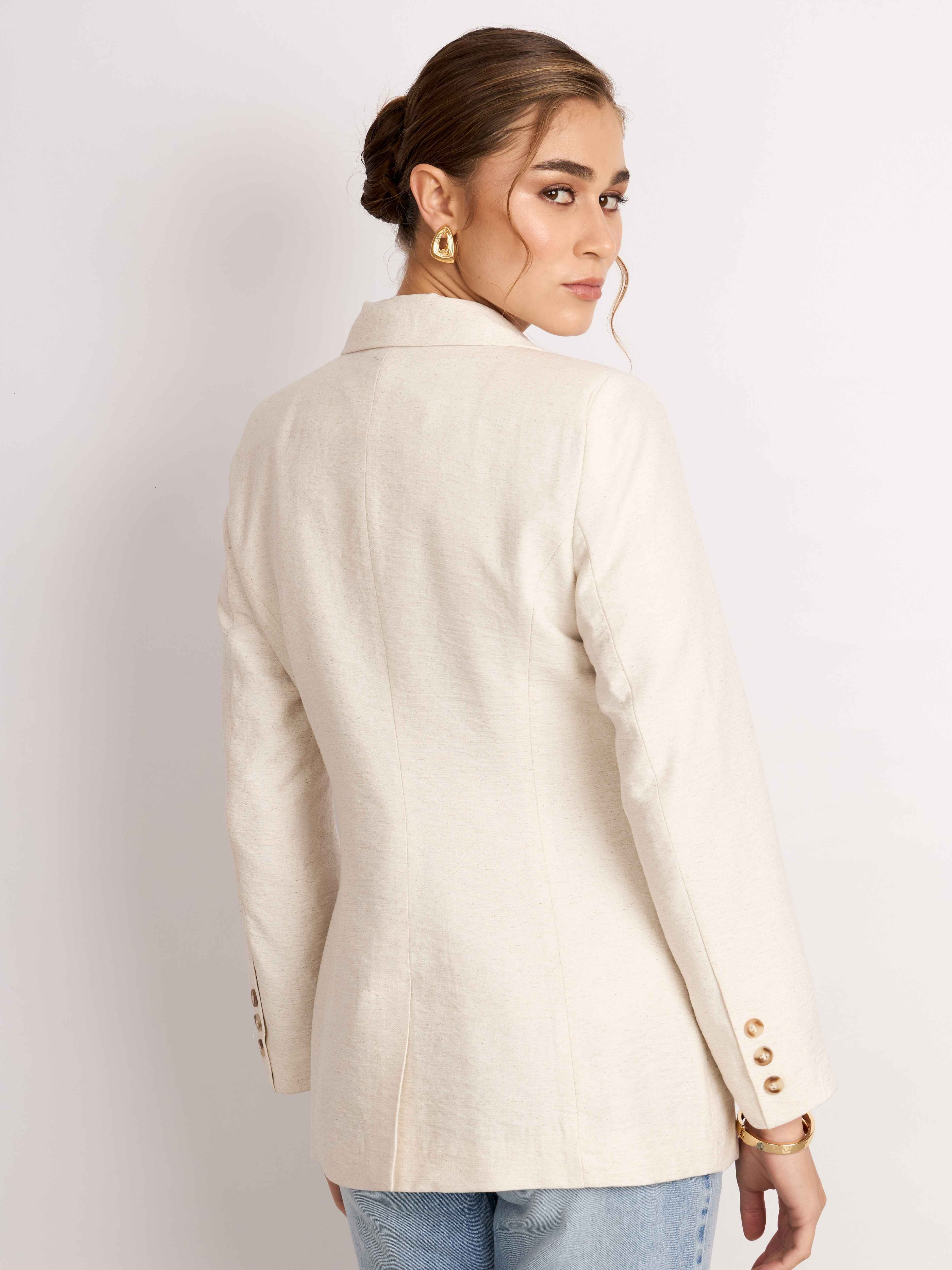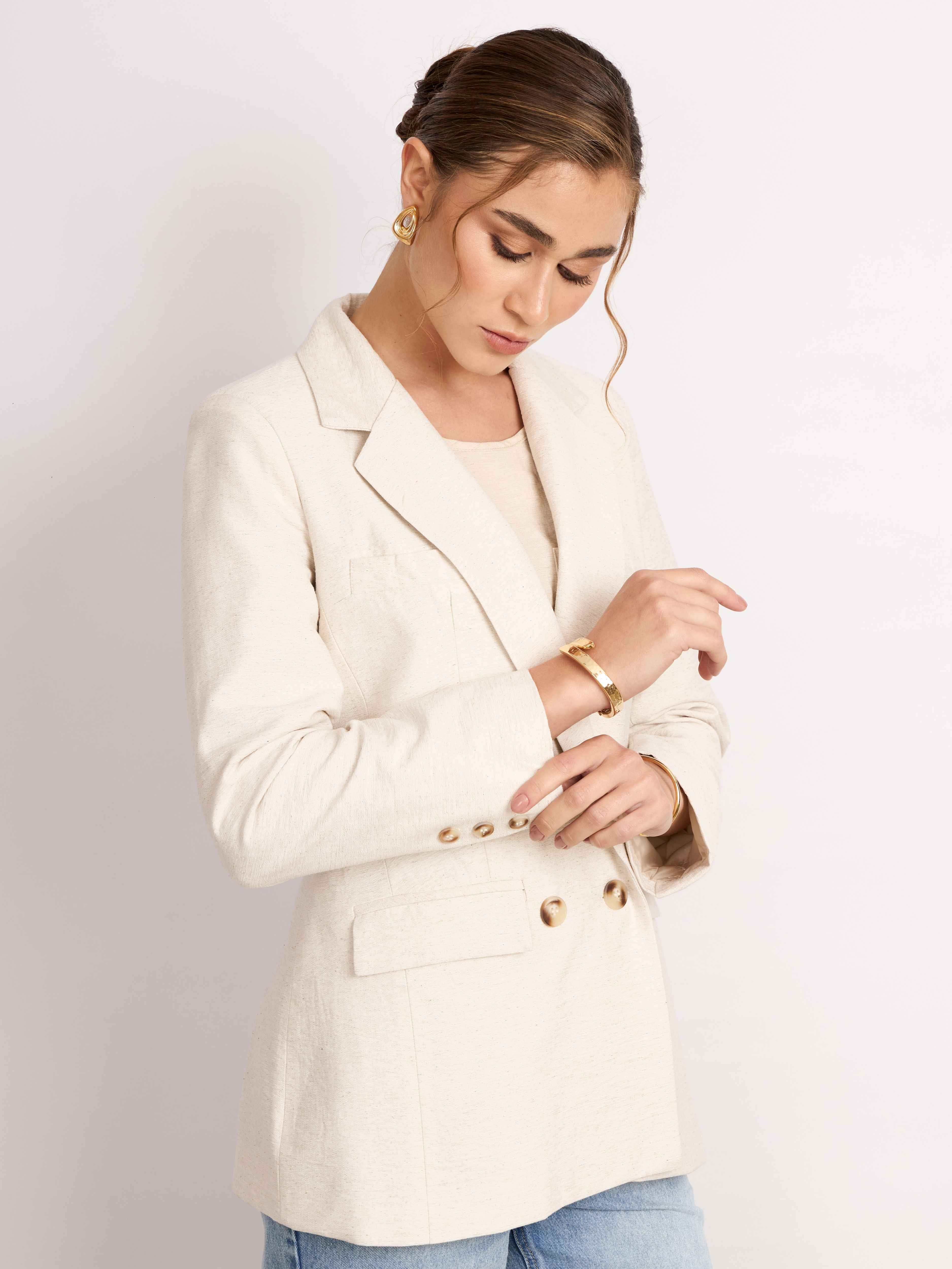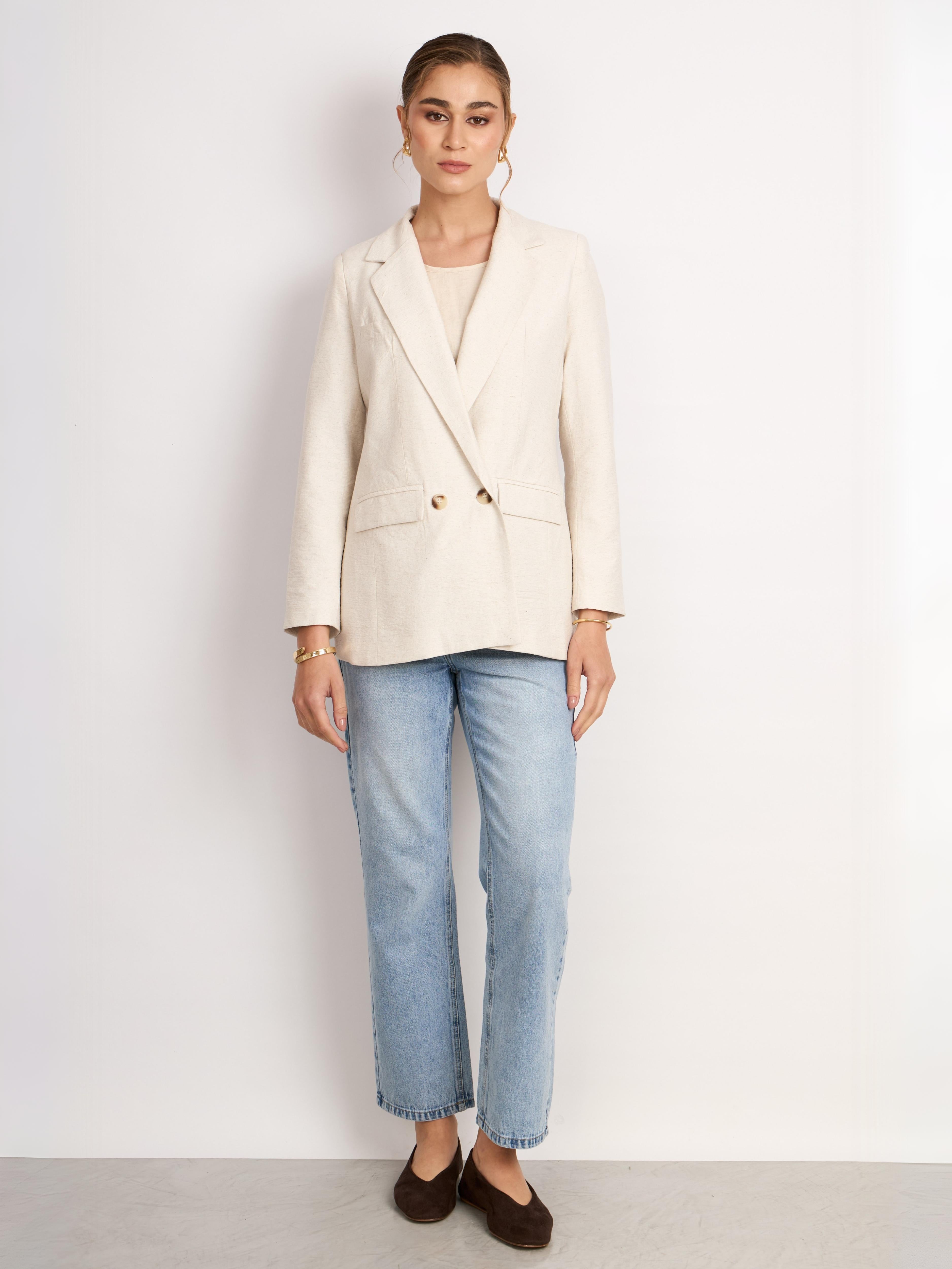 Blazer recto con cruce de botones en la parte delantera. Cuenta con cuello y solapa. Lleva dos bolsillos funcionales con tapas decorativas. Manga larga con puños abotonados. Cómodo y semiformal.