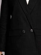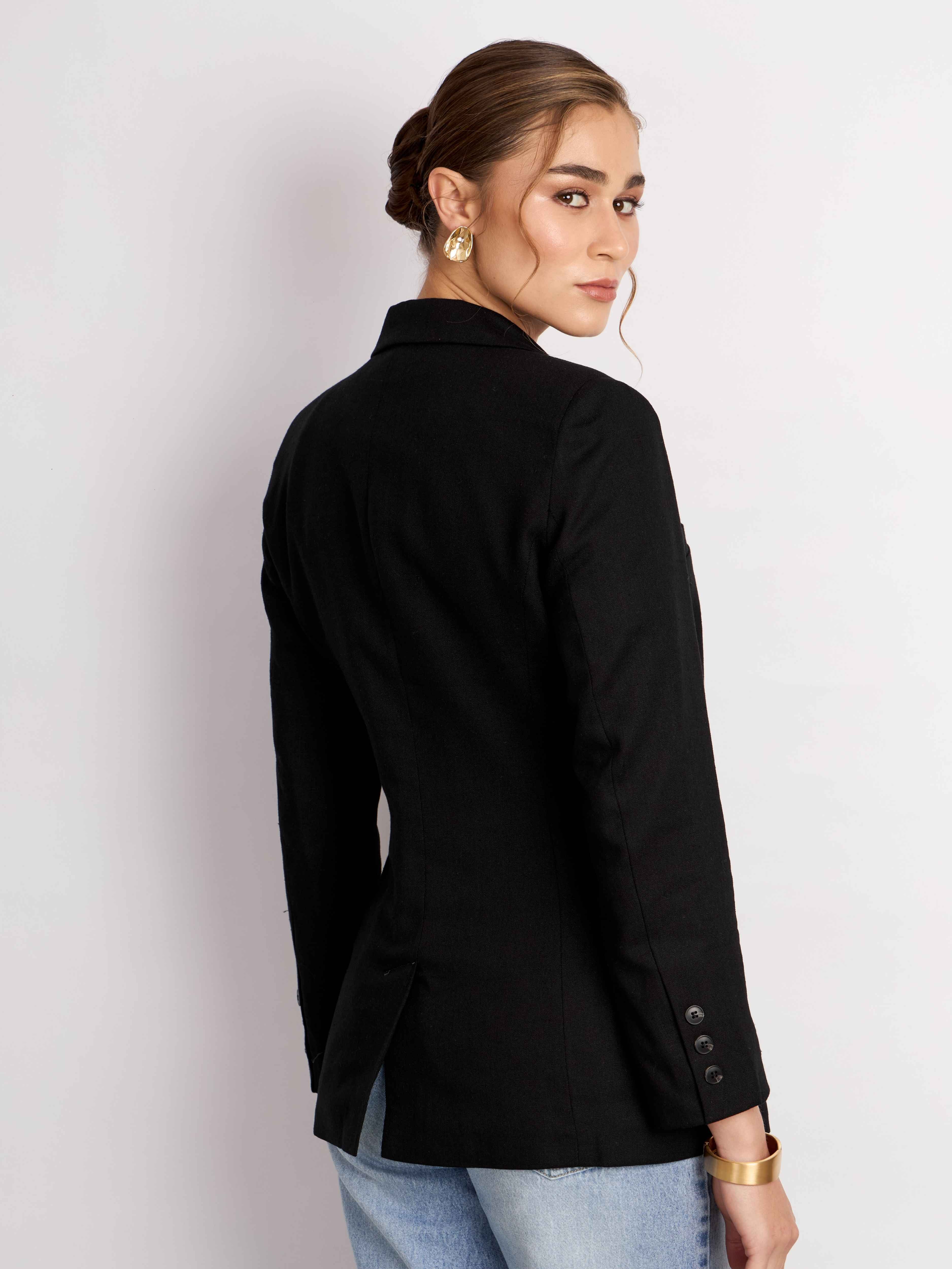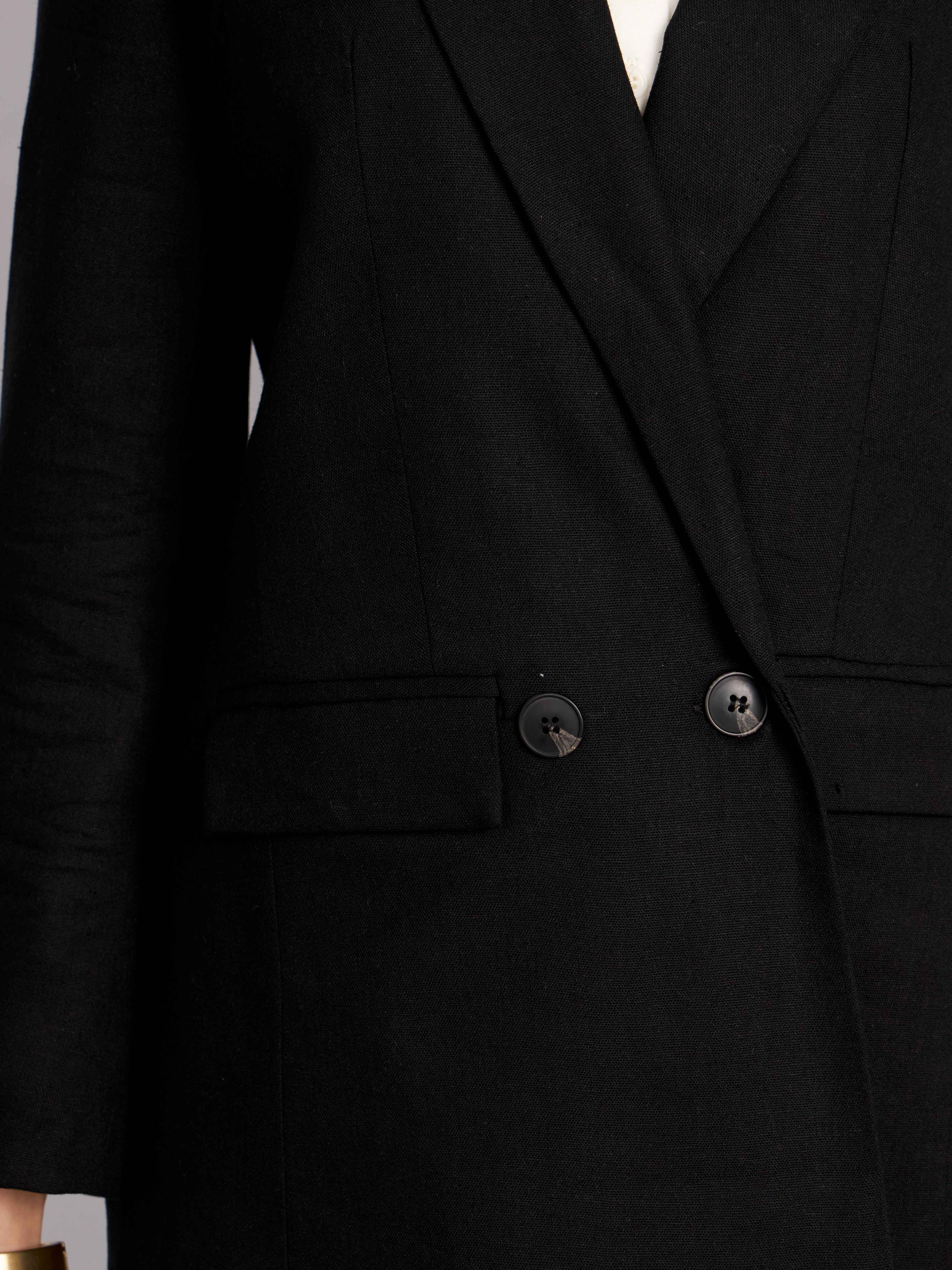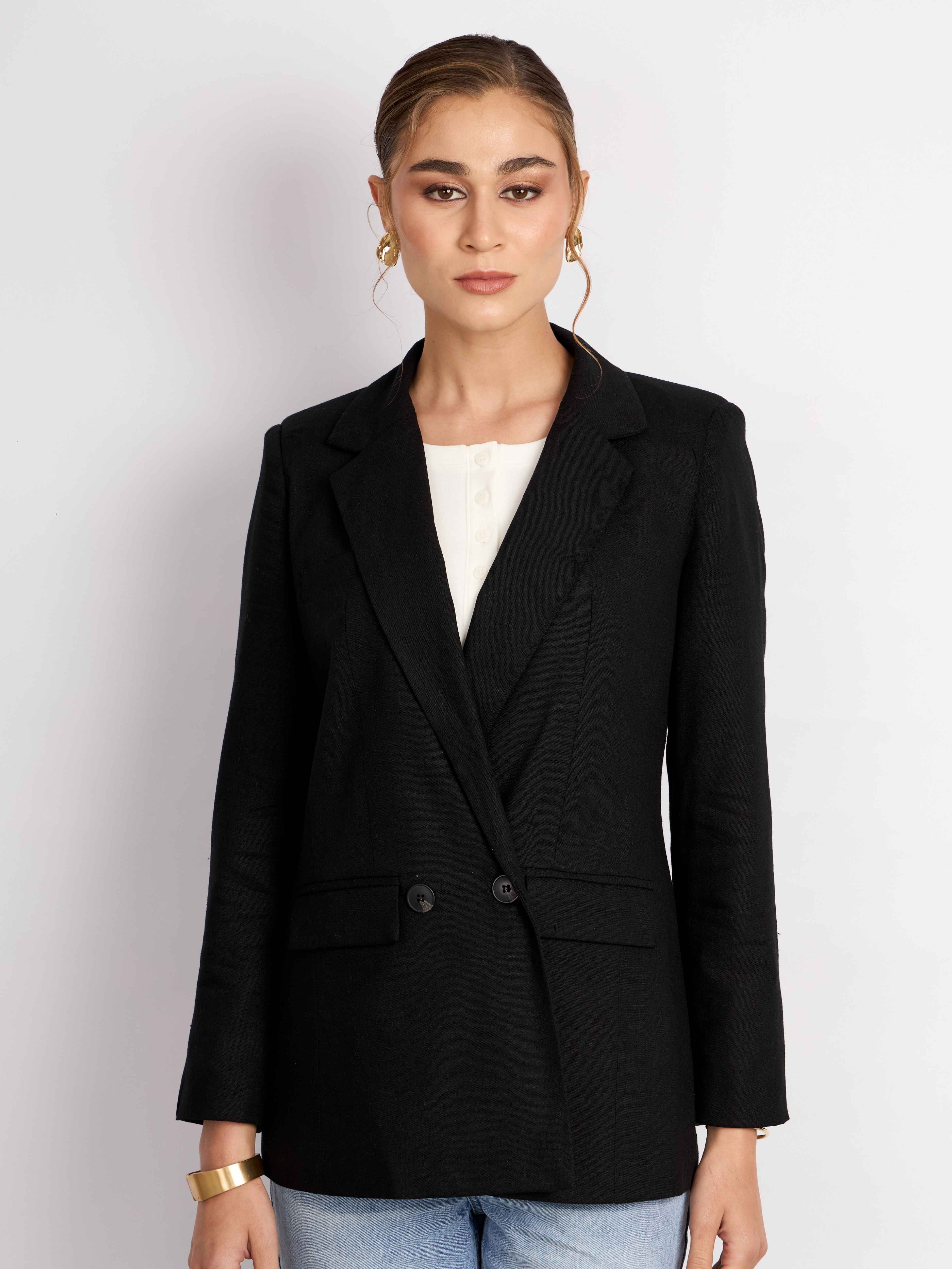 Blazer recto con cruce de botones en la parte delantera. Cuenta con cuello y solapa. Lleva dos bolsillos funcionales con tapas decorativas. Manga larga con puños abotonados. Cómodo y semiformal.