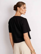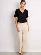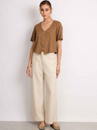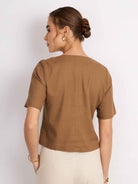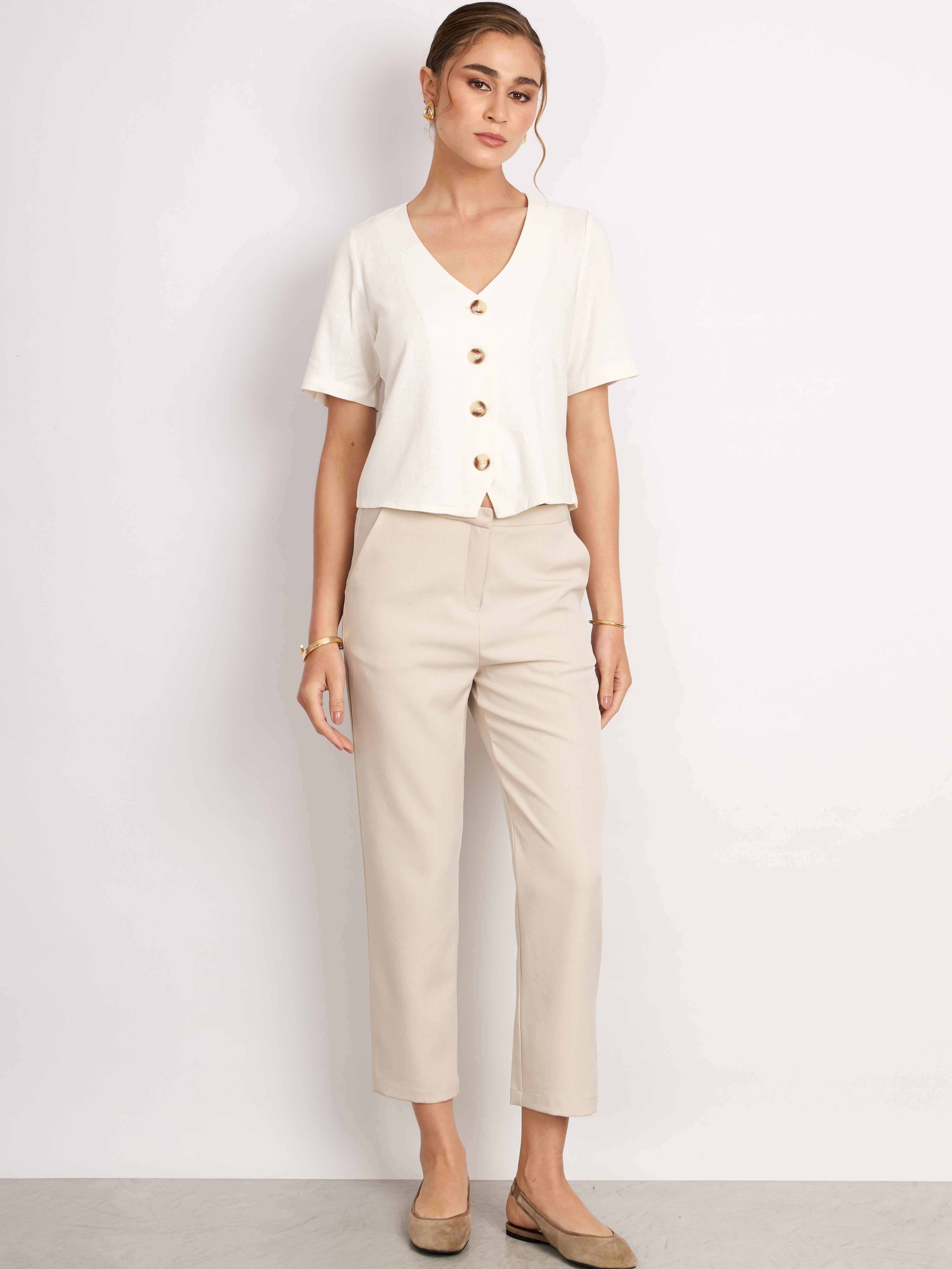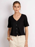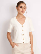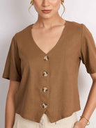 Top manga corta, con silueta holgada y cuello en V. Lleva pechera con botones. Versátil y cómodo para el día a día.